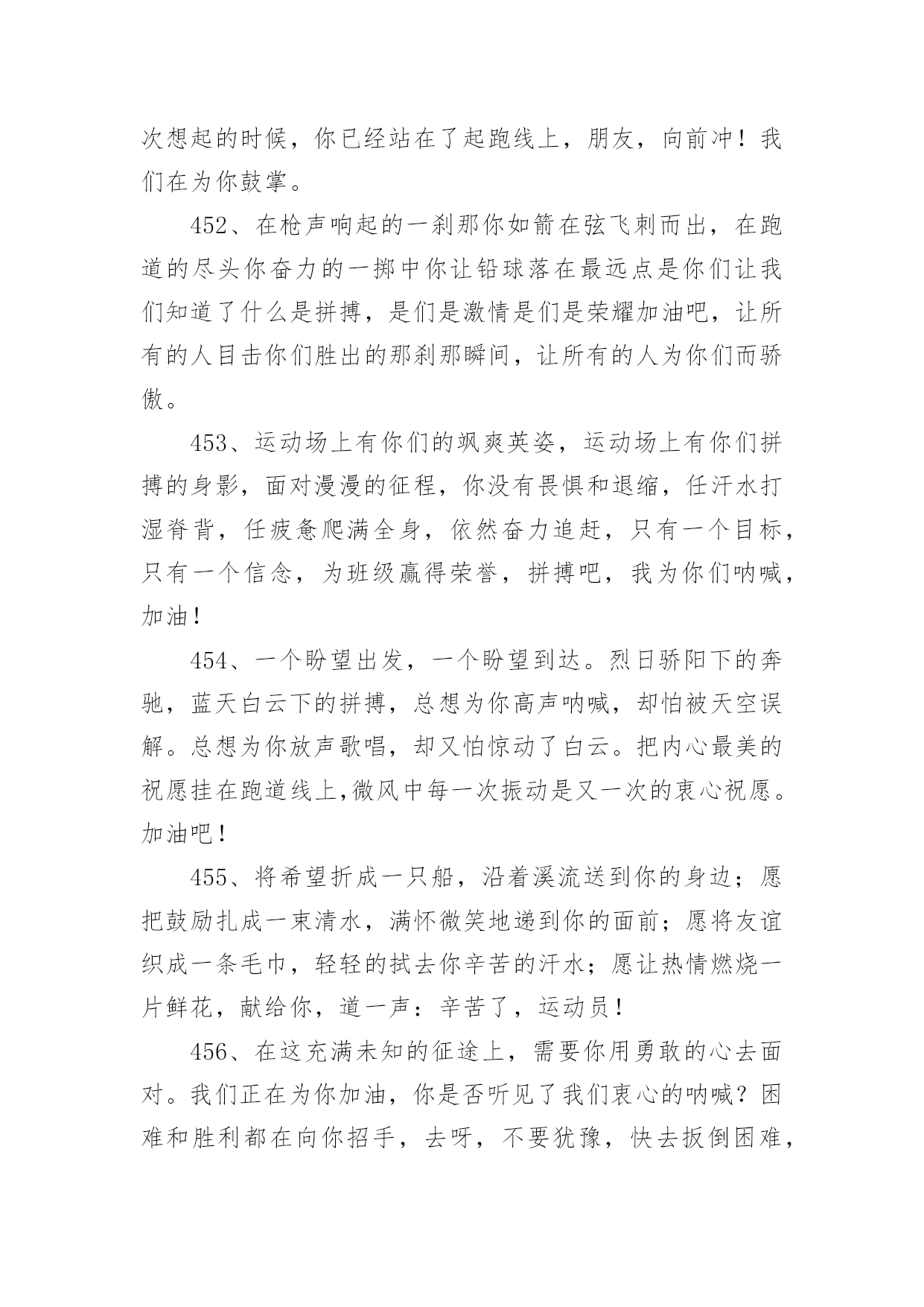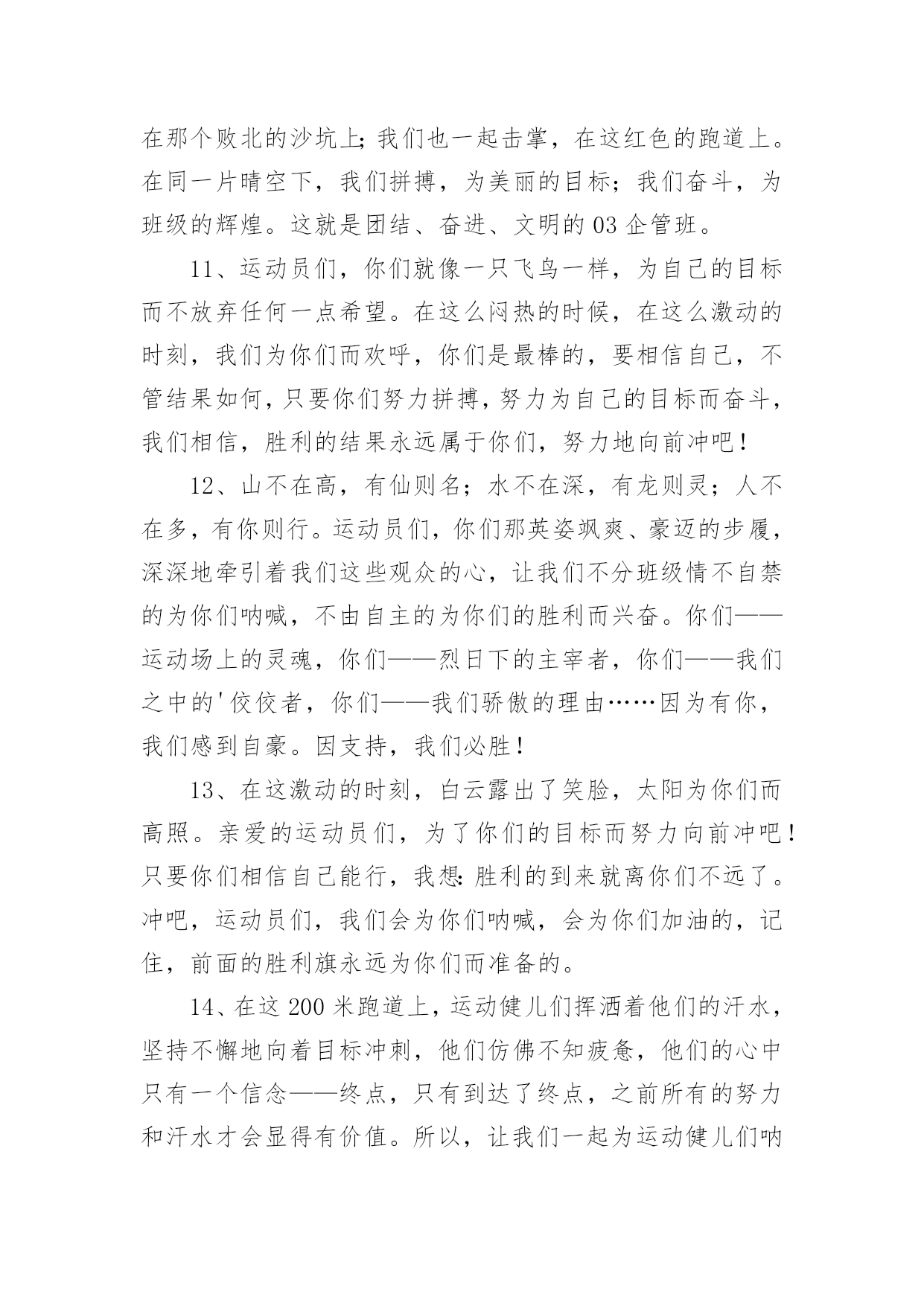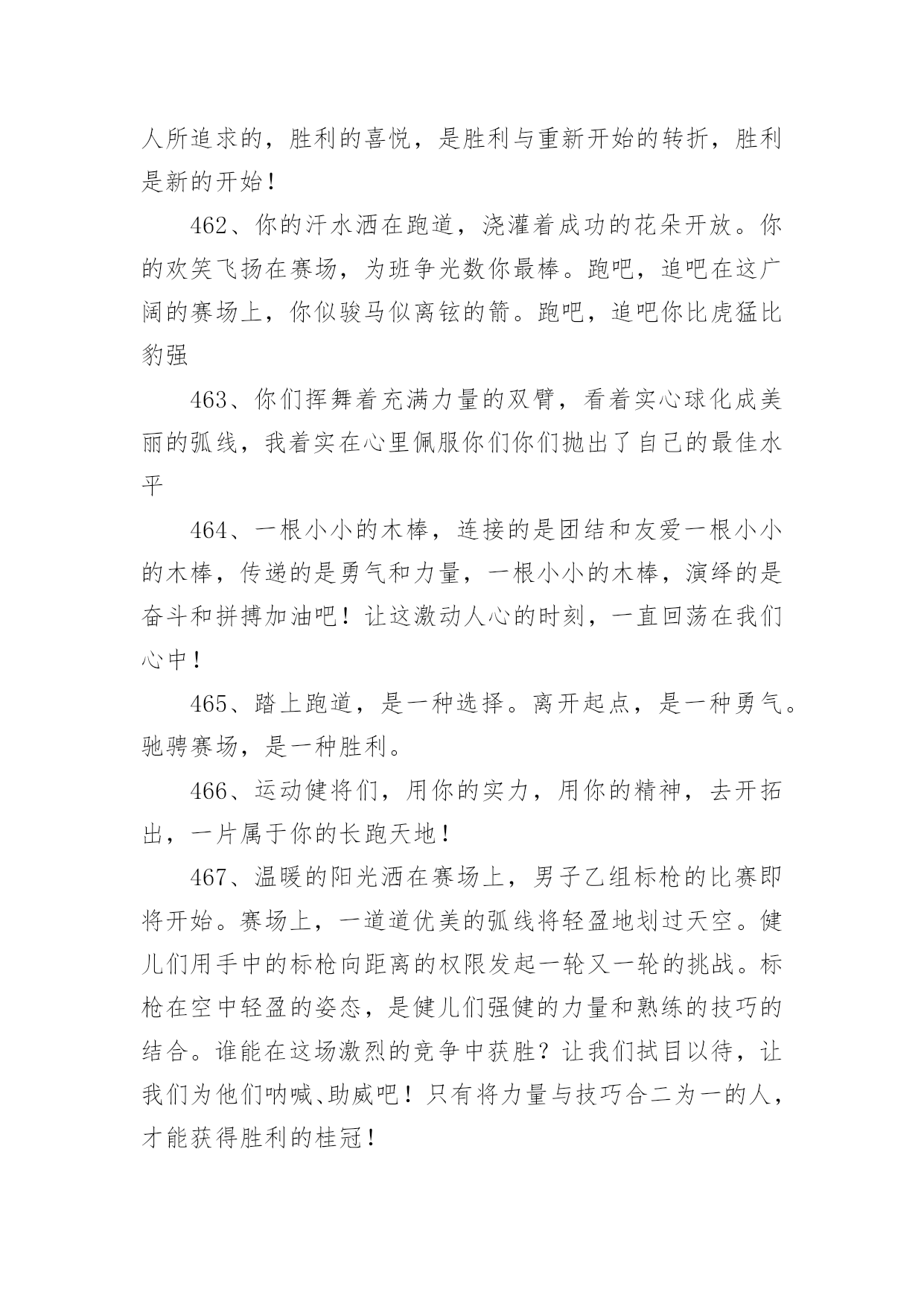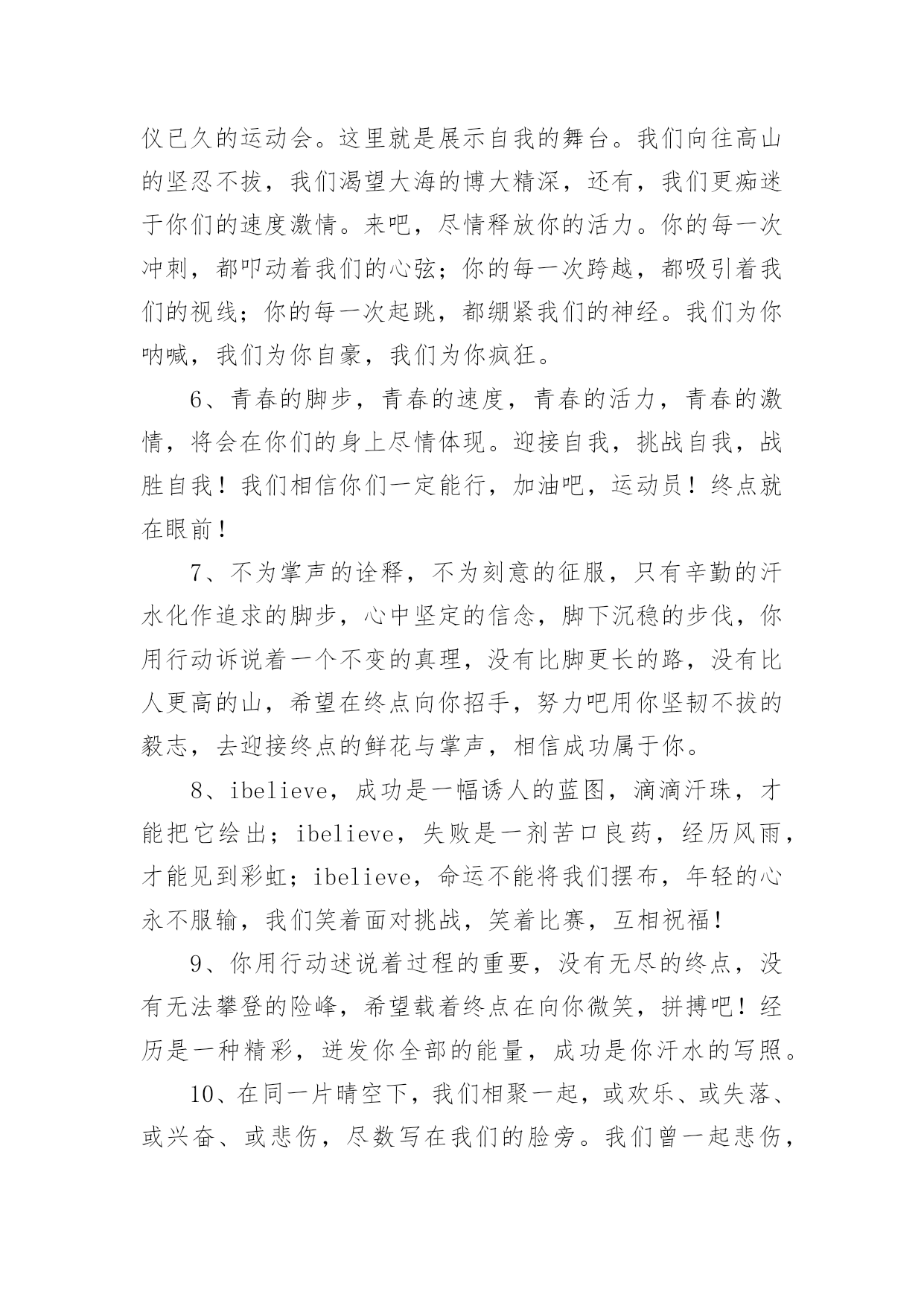 体育运动会加油稿体育运动会加油稿[集合]在现在的社会生活中,我们用到加油稿的地方越来越多,加油稿可以强化人们的自我认知,给予人正向的激励作用。大家知道加油稿怎么写才正确吗?以下是小编精心整理的体育运动会加油稿,仅供参考,大家一起来看看吧。体育运动会加油稿1在绿茵场上,我看到你的步伐越来越沉重。赛前你曾壮言满怀,但此刻却显得苍白无力。我只能默默祈祷和祝福你。明知五千米是你的极限,你为什么还要毫不犹豫地挑战呢?我想是因为终点是一个光辉的里程碑,上面镌刻着青春的`活力和挑战的精神——只有敢拼才能获胜。体育运动会加油稿2亲爱的数计同学们,你们真是太厉害了!你们像轻风一样敏锐地洞察人意,为我们送来了清爽、解困的感觉。你们在比赛场上的表现让人又痛苦又快乐。那种龙腾虎跃的心灵和切身体验,真是让人难以忘怀。你们不仅累得筋疲力尽,还被彼此的.竞争所感动。但你们仍然坚持下去,振奋精神。因为你们知道,被关注和期待的背后,是坚持和进步。胜败得失远不能与竞技的快感相提并论。在比赛中摔倒了,重新站起来,重新开始,这是对毅力和意志的考验。你们可能会感到无所适从,但竞技的遗憾也让你们认清了自己,激发了挑战的决心和热情。重要的是参与,享受这种直白的体验。通过这样的锻炼,你们可以提升自己,提高应对不愉快情绪的能力。每一段青春都需要经历风吹雨打,才会显得独特。每一份记忆只有心存感恩,才会让人感动。年华如水,只有充实自己,让生活变得精彩,努力实现目标,才不会白白流逝。你们就像雄鹰展翅一样,天空是你们的舞台。音符在你们手中跳动,青春因你们而变得悠扬婉转。你们真是太棒了!体育运动会加油稿31、美丽的鲜花后,有你辛勤的汗水,我们的喝彩中,有你的自豪与骄傲!2、体育健儿们,我们知道你们的辛勤,我们了解你们的辛苦。3、加油吧!不论你是成功还是失败,我们都是你们坚强的后盾。4、胜也爱你,败也爱你,我们永远支持你,你们永远是“最特别的存在”。5、踏着春天的气息,迈着轻盈的脚步,我们迎来了心仪已久的运动会。这里就是展示自我的舞台。我们向往高山的坚忍不拔,我们渴望大海的博大精深,还有,我们更痴迷于你们的速度激情。来吧,尽情释放你的活力。你的每一次冲刺,都叩动着我们的心弦;你的每一次跨越,都吸引着我们的视线;你的每一次起跳,都绷紧我们的神经。我们为你呐喊,我们为你自豪,我们为你疯狂。6、青春的脚步,青春的速度,青春的活力,青春的激情,将会在你们的身上尽情体现。迎接自我,挑战自我,战胜自我!我们相信你们一定能行,加油吧,运动员!终点就在眼前!7、不为掌声的诠释,不为刻意的征服,只有辛勤的汗水化作追求的脚步,心中坚定的信念,脚下沉稳的步伐,你用行动诉说着一个不变的真理,没有比脚更长的路,没有比人更高的山,希望在终点向你招手,努力吧用你坚韧不拔的毅志,去迎接终点的鲜花与掌声,相信成功属于你。8、ibelieve,成功是一幅诱人的蓝图,滴滴汗珠,才能把它绘出;ibelieve,失败是一剂苦口良药,经历风雨,才能见到彩虹;ibelieve,命运不能将我们摆布,年轻的心永不服输,我们笑着面对挑战,笑着比赛,互相祝福!9、你用行动述说着过程的重要,没有无尽的终点,没有无法攀登的险峰,希望载着终点在向你微笑,拼搏吧!经历是一种精彩,迸发你全部的能量,成功是你汗水的写照。10、在同一片晴空下,我们相聚一起,或欢乐、或失落、或兴奋、或悲伤,尽数写在我们的脸旁。我们曾一起悲伤,在那个败北的沙坑上;我们也一起击掌,在这红色的跑道上。在同一片晴空下,我们拼搏,为美丽的目标;我们奋斗,为班级的辉煌。这就是团结、奋进、文明的03企管班。11、运动员们,你们就像一只飞鸟一样,为自己的目标而不放弃任何一点希望。在这么闷热的时候,在这么激动的时刻,我们为你们而欢呼,你们是最棒的,要相信自己,不管结果如何,只要你们努力拼搏,努力为自己的目标而奋斗,我们相信,胜利的结果永远属于你们,努力地向前冲吧!12、山不在高,有仙则名;水不在深,有龙则灵;人不在多,有你则行。运动员们,你们那英姿飒爽、豪迈的步履,深深地牵引着我们这些观众的心,让我们不分班级情不自禁的为你们呐喊,不由自主的为你们的胜利而兴奋。你们——运动场上的灵魂,你们——烈日下的主宰者,你们——我们之中的'佼佼者,你们——我们骄傲的理由……因为有你,我们感到自豪。因支持,我们必胜!13、在这激动的时刻,白云露出了笑脸,太阳为你们而高照。亲爱的运动员们,为了你们的目标而努力向前冲吧!只要你们相信自己能行,我想:胜利的到来就离你们不远了。冲吧,运动员们,我们会为你们呐喊,会为你们加油的,记住,前面的胜利旗永远为你们而准备的。14、在这200米跑道上,运动健儿们挥洒着他们的汗水,坚持不懈地向着目标冲刺,他们仿佛不知疲惫,他们的心中只有一个信念——终点,只有到达了终点,之前