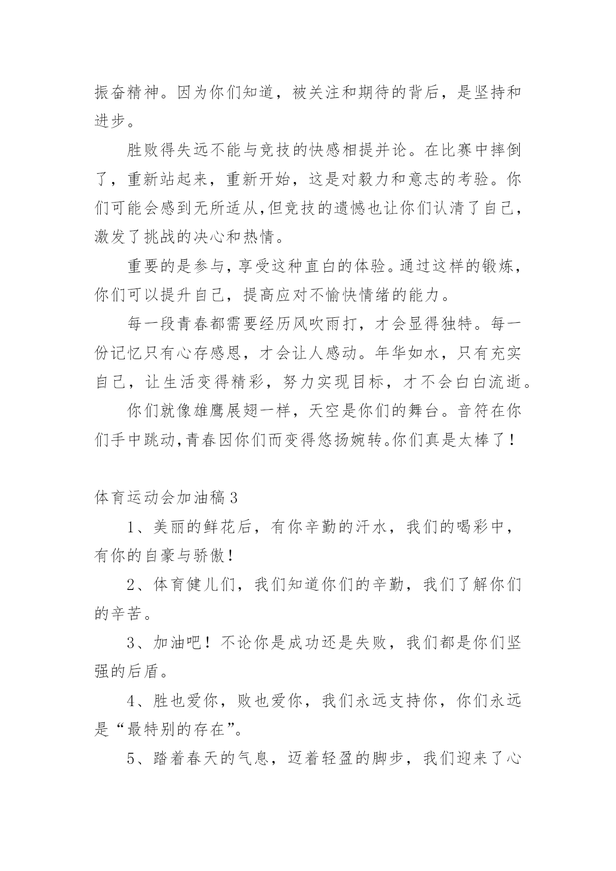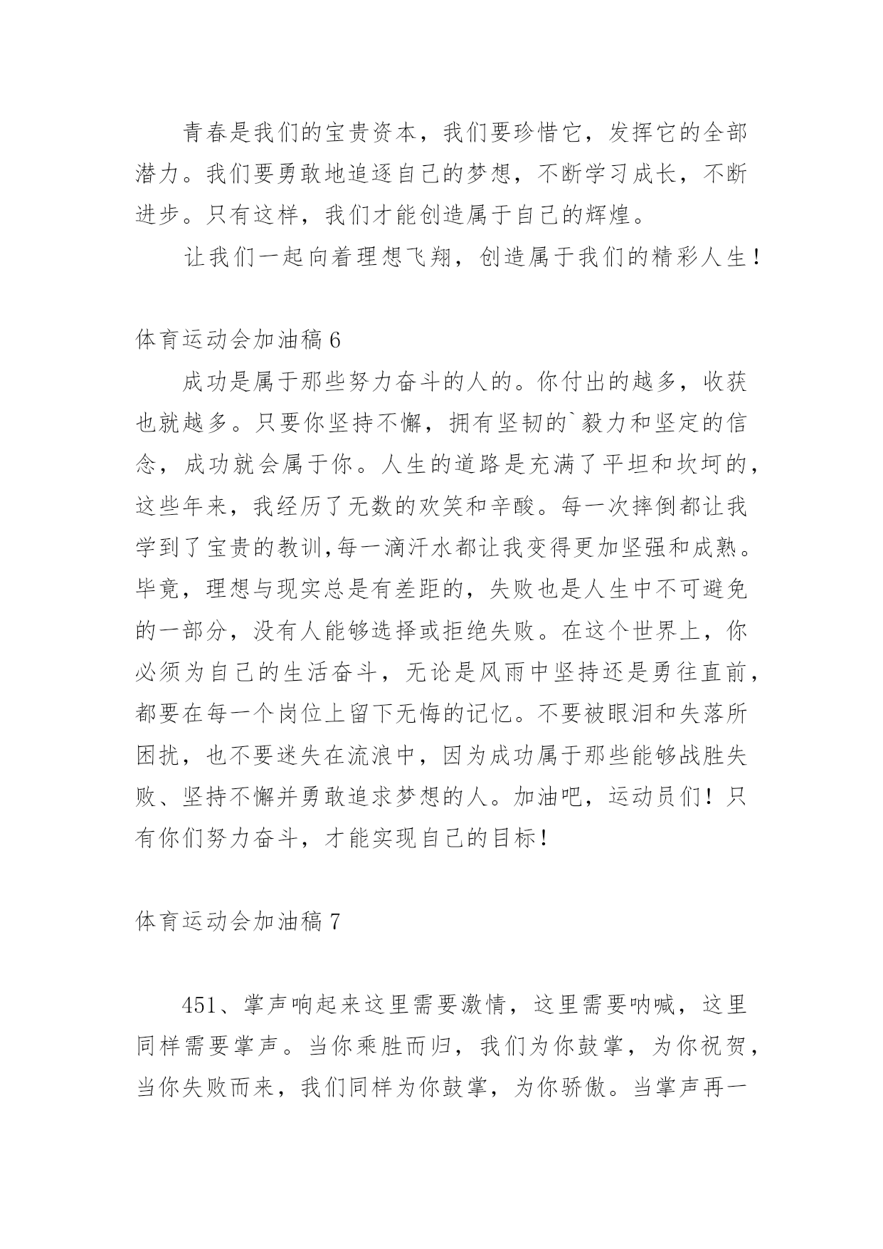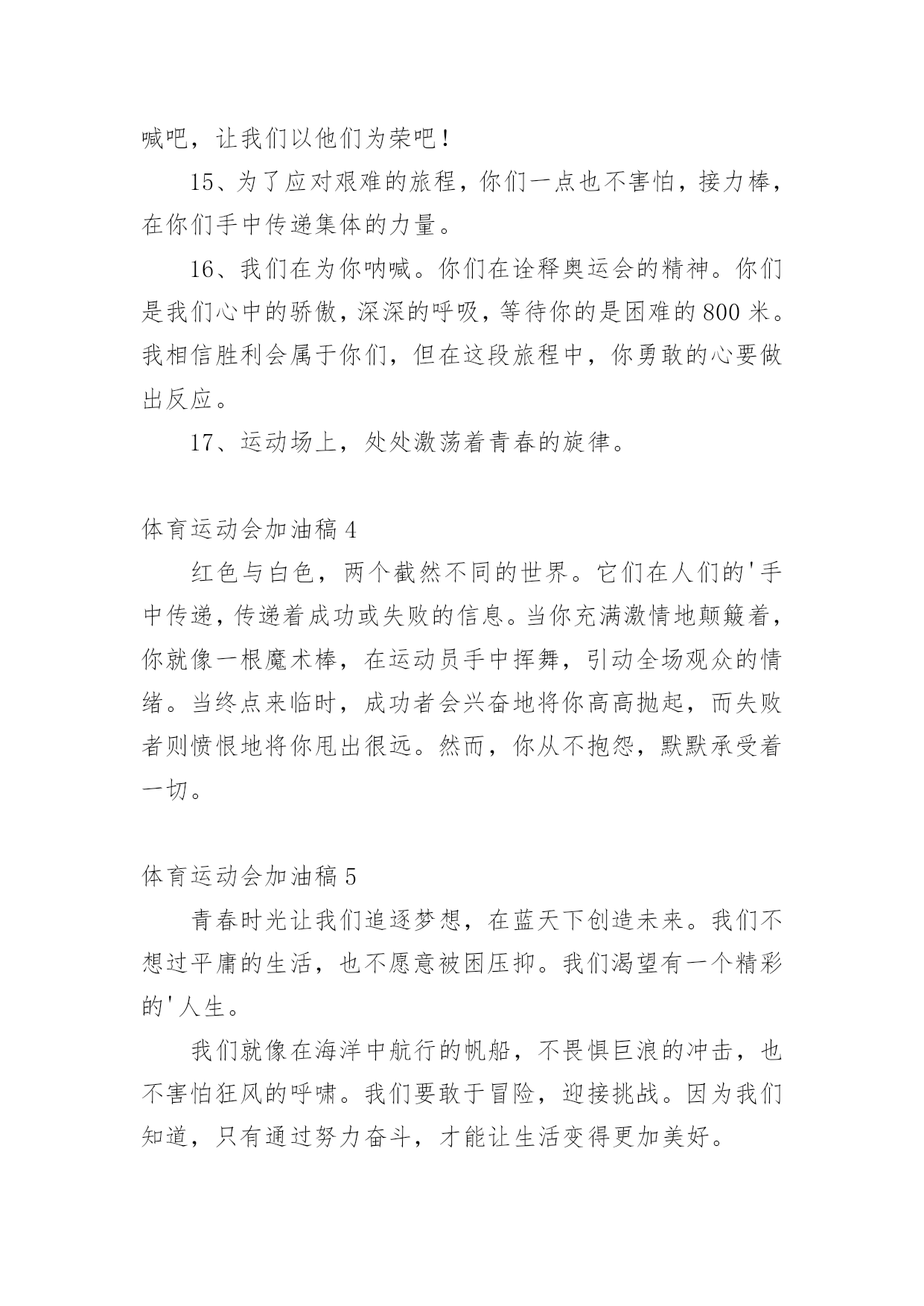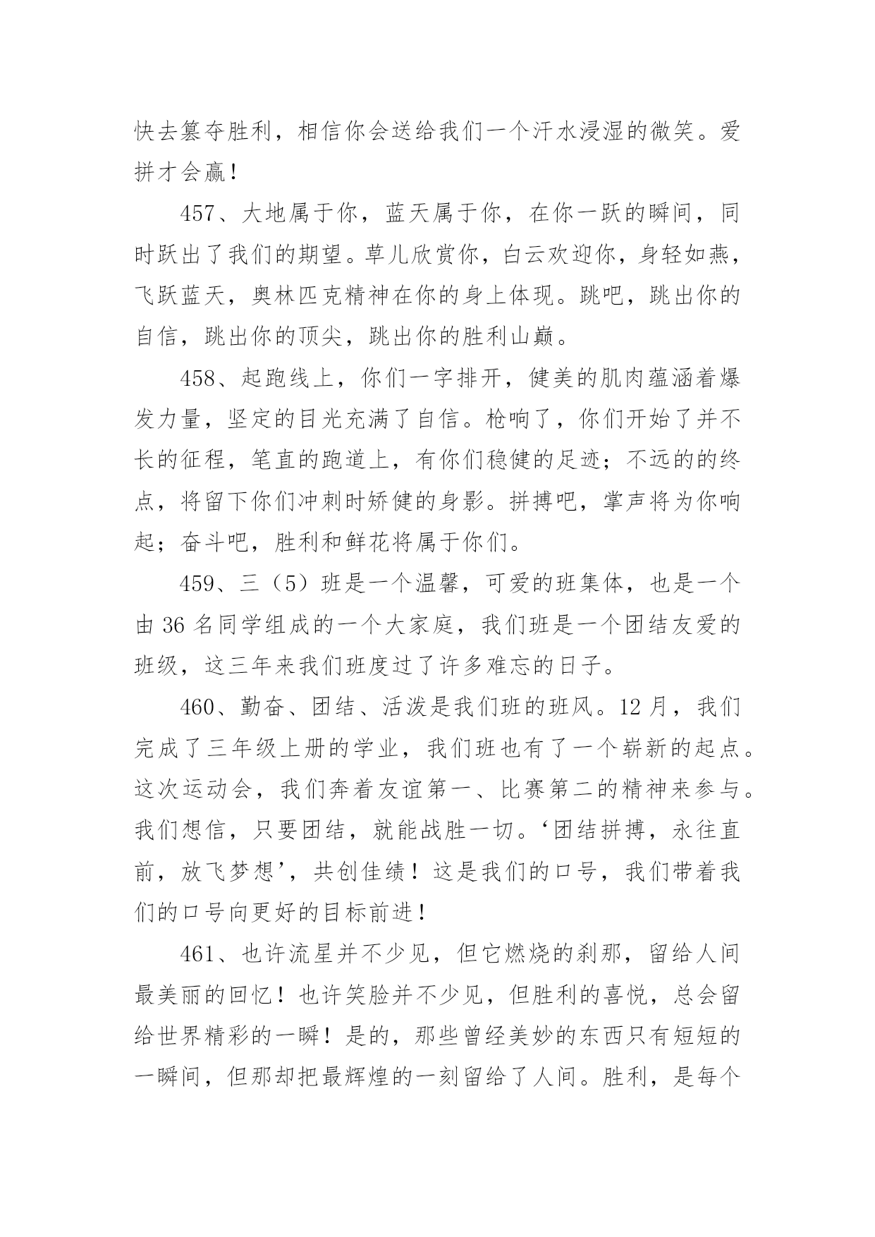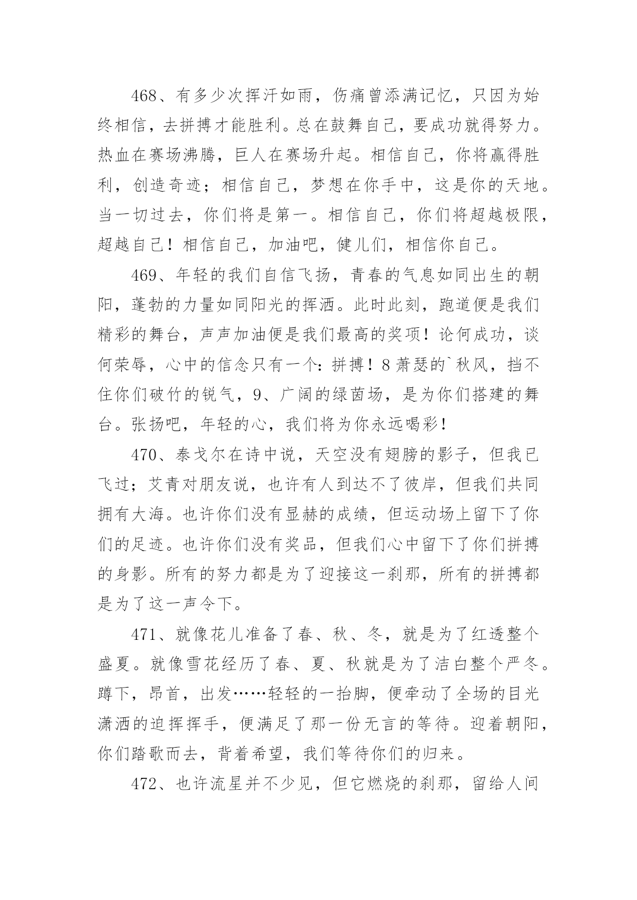 体育运动会加油稿体育运动会加油稿[集合]在现在的社会生活中,我们用到加油稿的地方越来越多,加油稿可以强化人们的自我认知,给予人正向的激励作用。大家知道加油稿怎么写才正确吗?以下是小编精心整理的体育运动会加油稿,仅供参考,大家一起来看看吧。体育运动会加油稿1在绿茵场上,我看到你的步伐越来越沉重。赛前你曾壮言满怀,但此刻却显得苍白无力。我只能默默祈祷和祝福你。明知五千米是你的极限,你为什么还要毫不犹豫地挑战呢?我想是因为终点是一个光辉的里程碑,上面镌刻着青春的`活力和挑战的精神——只有敢拼才能获胜。体育运动会加油稿2亲爱的数计同学们,你们真是太厉害了!你们像轻风一样敏锐地洞察人意,为我们送来了清爽、解困的感觉。你们在比赛场上的表现让人又痛苦又快乐。那种龙腾虎跃的心灵和切身体验,真是让人难以忘怀。你们不仅累得筋疲力尽,还被彼此的.竞争所感动。但你们仍然坚持下去,振奋精神。因为你们知道,被关注和期待的背后,是坚持和进步。胜败得失远不能与竞技的快感相提并论。在比赛中摔倒了,重新站起来,重新开始,这是对毅力和意志的考验。你们可能会感到无所适从,但竞技的遗憾也让你们认清了自己,激发了挑战的决心和热情。重要的是参与,享受这种直白的体验。通过这样的锻炼,你们可以提升自己,提高应对不愉快情绪的能力。每一段青春都需要经历风吹雨打,才会显得独特。每一份记忆只有心存感恩,才会让人感动。年华如水,只有充实自己,让生活变得精彩,努力实现目标,才不会白白流逝。你们就像雄鹰展翅一样,天空是你们的舞台。音符在你们手中跳动,青春因你们而变得悠扬婉转。你们真是太棒了!体育运动会加油稿31、美丽的鲜花后,有你辛勤的汗水,我们的喝彩中,有你的自豪与骄傲!2、体育健儿们,我们知道你们的辛勤,我们了解你们的辛苦。3、加油吧!不论你是成功还是失败,我们都是你们坚强的后盾。4、胜也爱你,败也爱你,我们永远支持你,你们永远是“最特别的存在”。5、踏着春天的气息,迈着轻盈的脚步,我们迎来了心仪已久的运动会。这里就是展示自我的舞台。我们向往高山的坚忍不拔,我们渴望大海的博大精深,还有,我们更痴迷于你们的速度激情。来吧,尽情释放你的活力。你的每一次冲刺,都叩动着我们的心弦;你的每一次跨越,都吸引着我们的视线;你的每一次起跳,都绷紧我们的神经。我们为你呐喊,我们为你自豪,我们为你疯狂。6、青春的脚步,青春的速度,青春的活力,青春的激情,将会在你们的身上尽情体现。迎接自我,挑战自我,战胜自我!我们相信你们一定能行,加油吧,运动员!终点就在眼前!7、不为掌声的诠释,不为刻意的征服,只有辛勤的汗水化作追求的脚步,心中坚定的信念,脚下沉稳的步伐,你用行动诉说着一个不变的真理,没有比脚更长的路,没有比人更高的山,希望在终点向你招手,努力吧用你坚韧不拔的毅志,去迎接终点的鲜花与掌声,相信成功属于你。8、ibelieve,成功是一幅诱人的蓝图,滴滴汗珠,才能把它绘出;ibelieve,失败是一剂苦口良药,经历风雨,才能见到彩虹;ibelieve,命运不能将我们摆布,年轻的心永不服输,我们笑着面对挑战,笑着比赛,互相祝福!9、你用行动述说着过程的重要,没有无尽的终点,没有无法攀登的险峰,希望载着终点在向你微笑,拼搏吧!经历是一种精彩,迸发你全部的能量,成功是你汗水的写照。10、在同一片晴空下,我们相聚一起,或欢乐、或失落、或兴奋、或悲伤,尽数写在我们的脸旁。我们曾一起悲伤,在那个败北的沙坑上;我们也一起击掌,在这红色的跑道上。在同一片晴空下,我们拼搏,为美丽的目标;我们奋斗,为班级的辉煌。这就是团结、奋进、文明的03企管班。11、运动员们,你们就像一只飞鸟一样,为自己的目标而不放弃任何一点希望。在这么闷热的时候,在这么激动的时刻,我们为你们而欢呼,你们是最棒的,要相信自己,不管结果如何,只要你们努力拼搏,努力为自己的目标而奋斗,我们相信,胜利的结果永远属于你们,努力地向前冲吧!12、山不在高,有仙则名;水不在深,有龙则灵;人不在多,有你则行。运动员们,你们那英姿飒爽、豪迈的步履,深深地牵引着我们这些观众的心,让我们不分班级情不自禁的为你们呐喊,不由自主的为你们的胜利而兴奋。你们——运动场上的灵魂,你们——烈日下的主宰者,你们——我们之中的'佼佼者,你们——我们骄傲的理由……因为有你,我们感到自豪。因支持,我们必胜!13、在这激动的时刻,白云露出了笑脸,太阳为你们而高照。亲爱的运动员们,为了你们的目标而努力向前冲吧!只要你们相信自己能行,我想:胜利的到来就离你们不远了。冲吧,运动员们,我们会为你们呐喊,会为你们加油的,记住,前面的胜利旗永远为你们而准备的。14、在这200米跑道上,运动健儿们挥洒着他们的汗水,坚持不懈地向着目标冲刺,他们仿佛不知疲惫,他们的心中只有一个信念——终点,只有到达了终点,之前