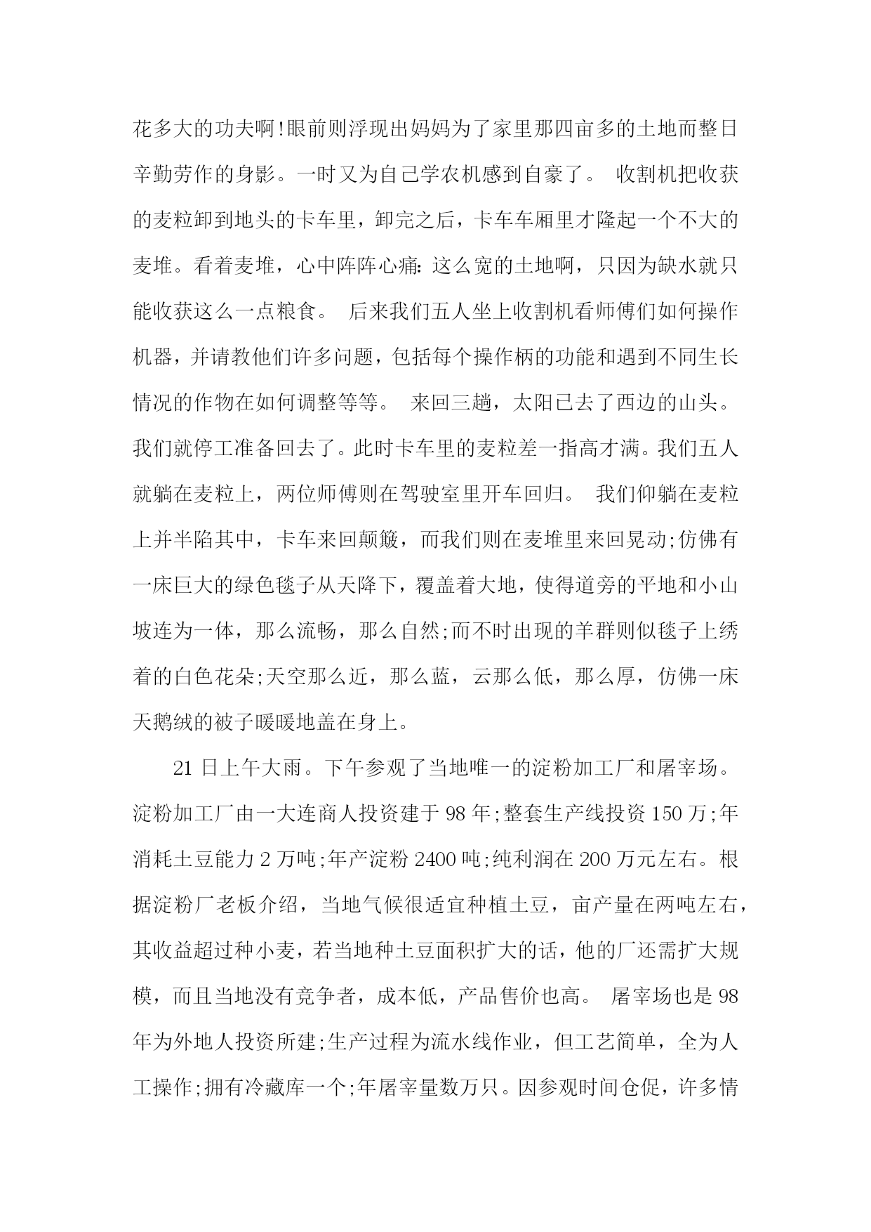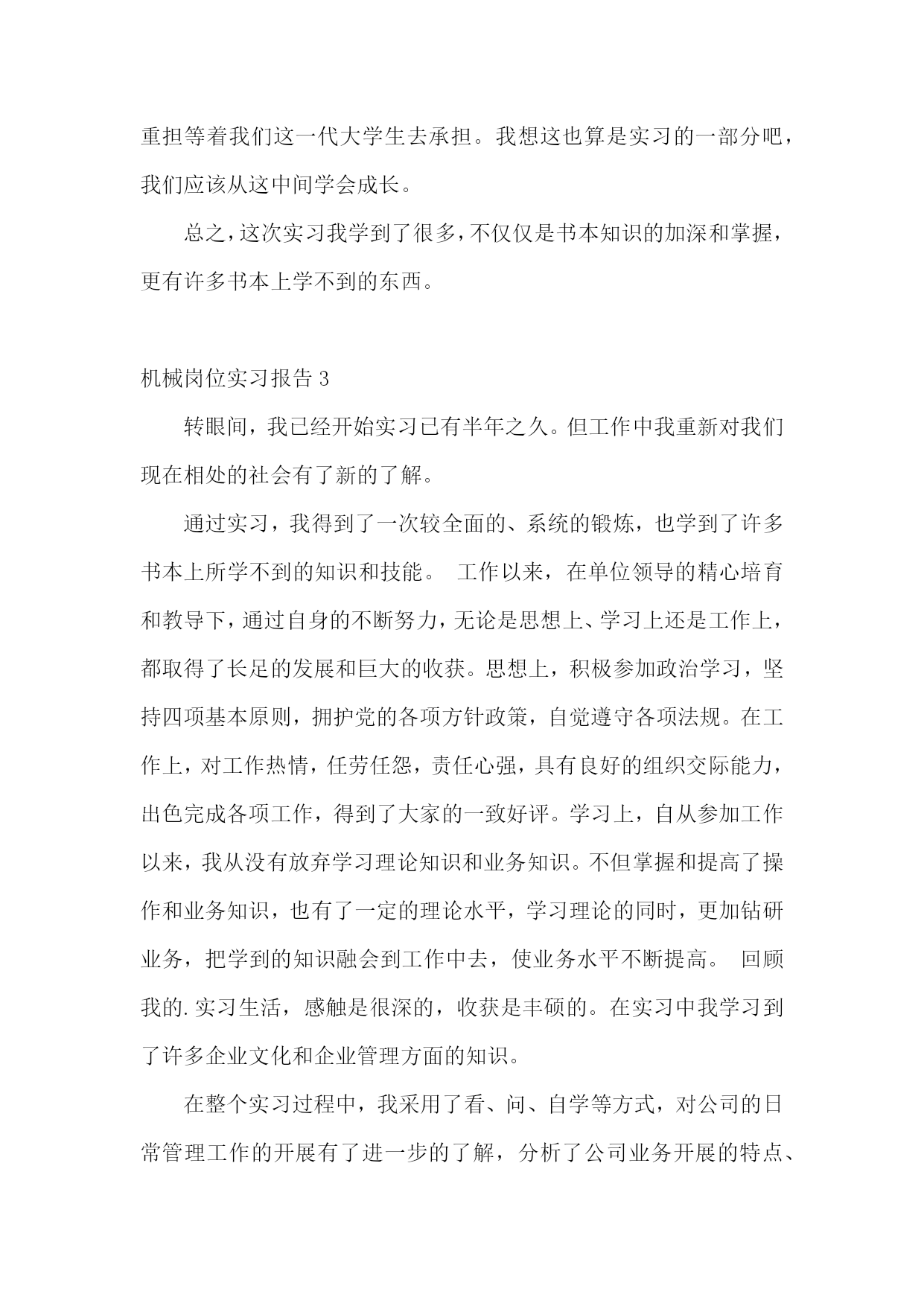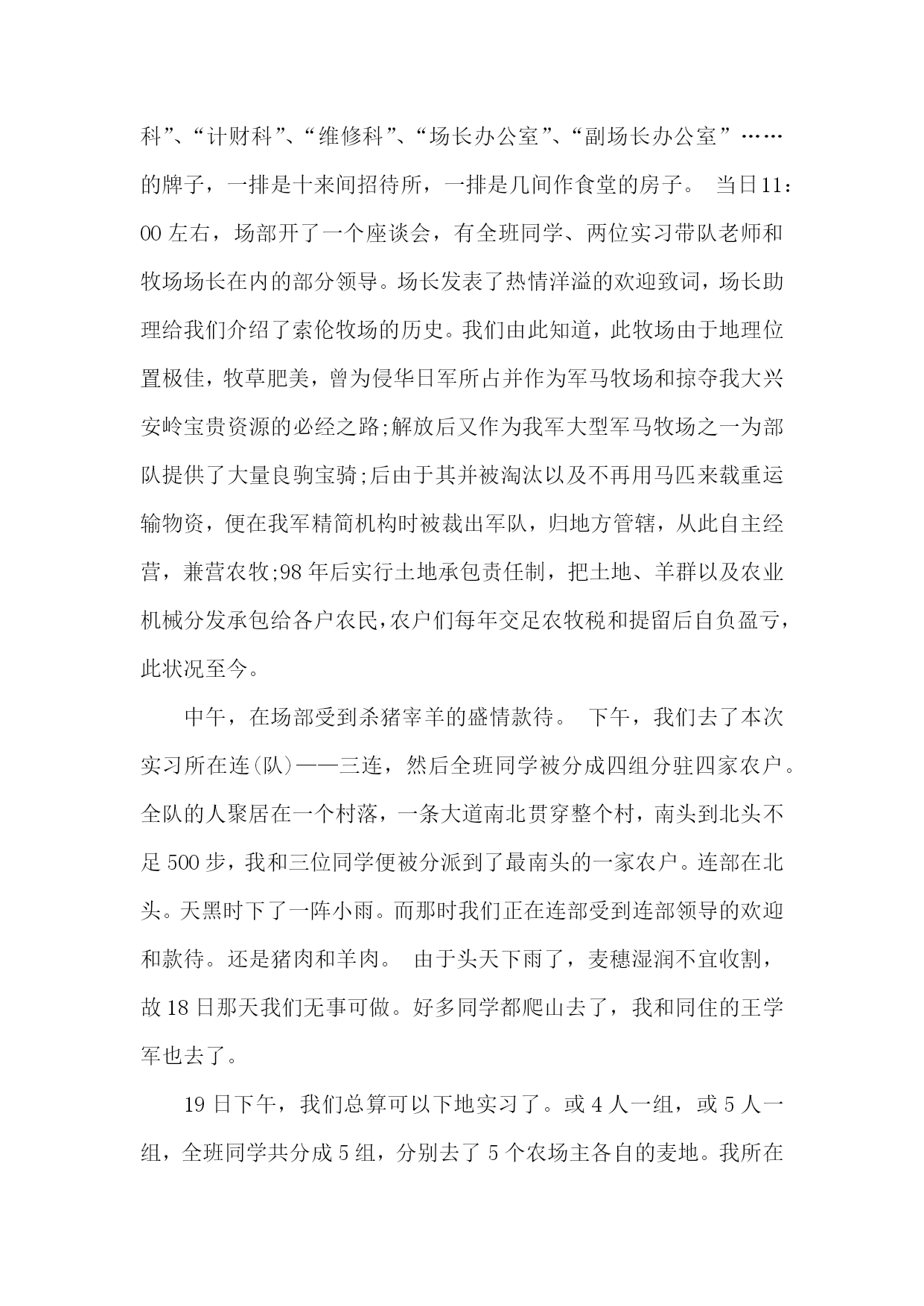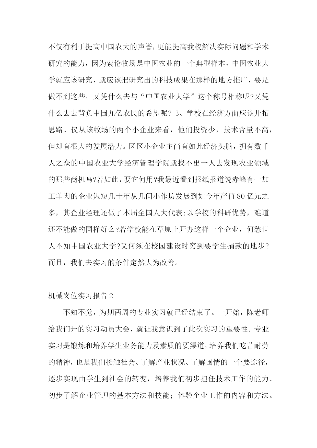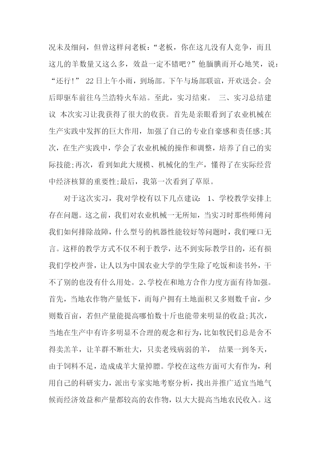 机械岗位实习报告机械岗位实习报告1一、实习地点本次实习所在地是内蒙古兴安盟索伦牧场。索伦牧场总土地面积107726.97公顷;地处大兴安岭南麓浅山地带,山川交错,地貌有山地、沟谷地、低洼地三种,山势大多平缓,低洼地坡度大部分小于10°,一部分谷底较为开阔。平均海拔800米左右,年降雨量450~560mm,年均气温2.1°C,无霜期110天,≥10°C年积温20xx~2200°C,光照时数2789.48,雨热同季,多集中在7~9月。土壤类型有黑土、黑钙土、草甸土、沼泽土、暗棕壤。植被类型有次生林、灌木林、疏林地、草甸草原、坡地草原。无风蚀沙化及水土流失。该牧场主要从事畜牧饲养业和农业种植业,农业生产以种植小麦、油菜为主,集约化、机械化程度高,机械配套率较高。全场总人口约为5千人;辖管7个生产队;农业机械总动力11668千瓦,实际机播面积约为4000公顷,化肥用量约1000吨。但农田水利建设严重滞后,基本上无水利灌溉设施,完全靠天吃饭。农业总产值1千多万,粮豆总产量120xx吨,单产3526公斤/公顷,牲畜头数30多万头(只)。1998年由外地人分别投资建造淀粉加工厂和屠宰场各一个,年利润均在200万元左右。二、实习过程8月17日早晨,全班同学24人到达索伦牧场总部。那是几排陈旧的瓦房围成的院子。其中两排房子各扇门前分别挂着写有“生产科”、“计财科”、“维修科”、“场长办公室”、“副场长办公室”……的牌子,一排是十来间招待所,一排是几间作食堂的房子。当日11:00左右,场部开了一个座谈会,有全班同学、两位实习带队老师和牧场场长在内的部分领导。场长发表了热情洋溢的欢迎致词,场长助理给我们介绍了索伦牧场的历史。我们由此知道,此牧场由于地理位置极佳,牧草肥美,曾为侵华日军所占并作为军马牧场和掠夺我大兴安岭宝贵资源的必经之路;解放后又作为我军大型军马牧场之一为部队提供了大量良驹宝骑;后由于其并被淘汰以及不再用马匹来载重运输物资,便在我军精简机构时被裁出军队,归地方管辖,从此自主经营,兼营农牧;98年后实行土地承包责任制,把土地、羊群以及农业机械分发承包给各户农民,农户们每年交足农牧税和提留后自负盈亏,此状况至今。中午,在场部受到杀猪宰羊的盛情款待。下午,我们去了本次实习所在连(队)——三连,然后全班同学被分成四组分驻四家农户。全队的人聚居在一个村落,一条大道南北贯穿整个村,南头到北头不足500步,我和三位同学便被分派到了最南头的一家农户。连部在北头。天黑时下了一阵小雨。而那时我们正在连部受到连部领导的欢迎和款待。还是猪肉和羊肉。由于头天下雨了,麦穗湿润不宜收割,故18日那天我们无事可做。好多同学都爬山去了,我和同住的王学军也去了。19日下午,我们总算可以下地实习了。或4人一组,或5人一组,全班同学共分成5组,分别去了5个农场主各自的麦地。我所在的组有5人,由于我原不是与其余4人分为一组的,后临时调整去了那组,他们欺我后去,除组长外其余三人分别自封了副组长、副副组长、副副组长秘书,说唯我一人是组员。看他们那样洋洋得意和陶醉,不忍破坏其心情,便配合他们自称组员,他们果然大为兴奋。农场主用吉普车化了50多分钟才把我们送到目的地。开收割机的两个师傅正好从地这一头开往另一头,我们就站在地头等他们下次回来。让我们惊诧的是地里麦子还不及膝盖的一半高,而且麦穗极小。农场主解释说好几年都这样了,因为天旱,没有水利设施进行灌溉,而且一块地就成百上千亩,也不方便灌溉,天气好的年头还成,一年还能有几十万块钱的盈余;天气不好,比如今年,每亩地只能收几十斤麦子,刚能把种子收回来,这么大面积土地的投入,像化肥、农药以及农业税和提留都没办法收回了。他说,你们是农业大学来的,水平高,你们说说该怎么办呢?我们沉默了,我们是农业大学来的,却学的是农业机械,而学校也从未开过与农业相关的课程,好多同学还不认识一些基本的作物,大有四体不勤、五谷不分的现象。我们能做什么呢?空负着中国农业大学学生的称号,在一片低矮的小麦面前束手无策。那时,心中内疚不已,想着回去一定多学一些农业方面的知识并努力学习,将来能真正为中国农业做点实事。后来,农场主又和我们谈了许多,关于农场经营方式,适合当地种植的作物,何种作物经济效益更好等等。一个多小时过去了,收割机才开过来,这时我不得不惊叹这儿土地之广阔了,并感叹:要是没有机器进行耕作、收获,全凭人力,得花多大的功夫啊!眼前则浮现出妈妈为了家里那四亩多的土地而整日辛勤劳作的身影。一时又为自己学农机感到自豪了。收割机把收获的麦粒卸到地头的卡车里,卸完之后,卡车车厢里才隆起一个不大的麦堆。看着麦堆,心中阵阵心痛:这么宽的土地啊,只因为缺水就只能收获这么一点粮食。后来我们五人坐上收割机看师傅们如何操作机器,并请教他们许多问题,包括每个操作柄的功能和遇到不同生长