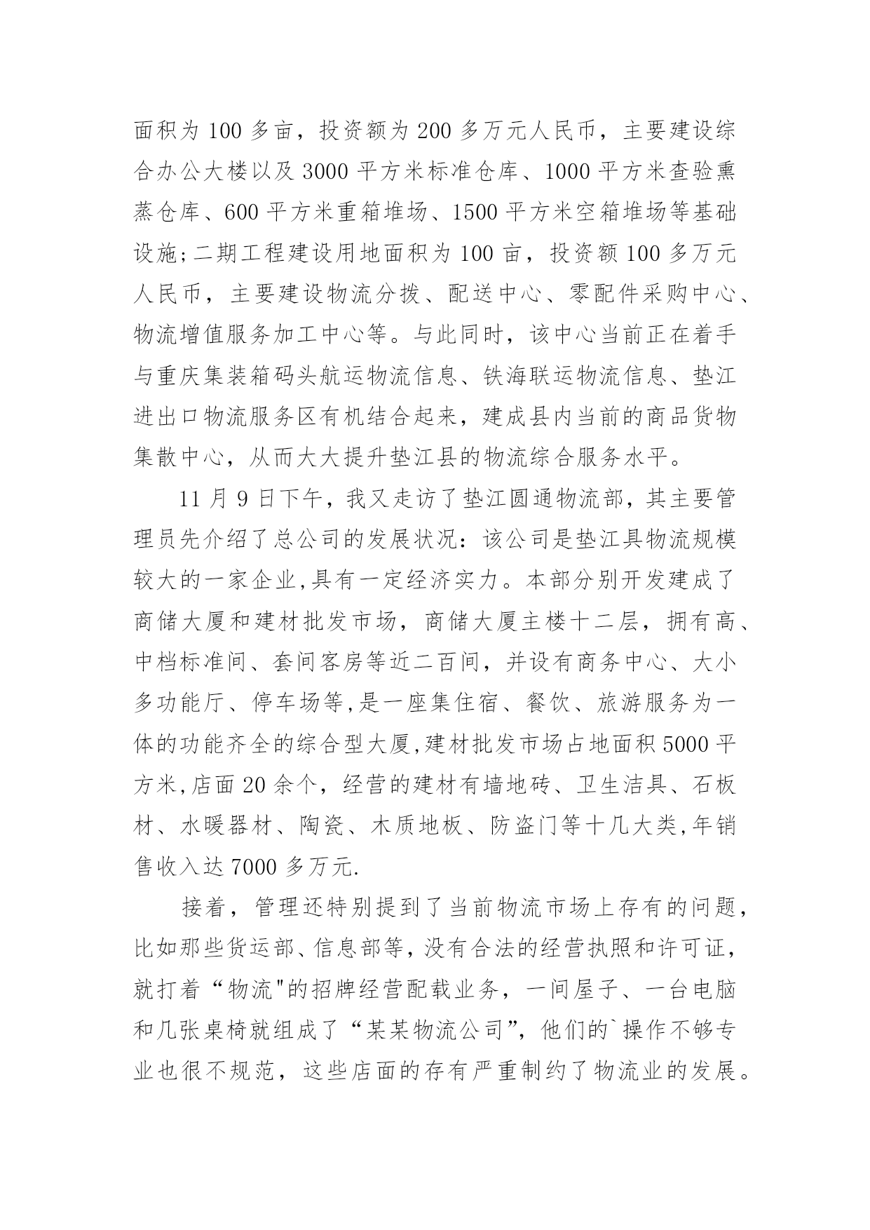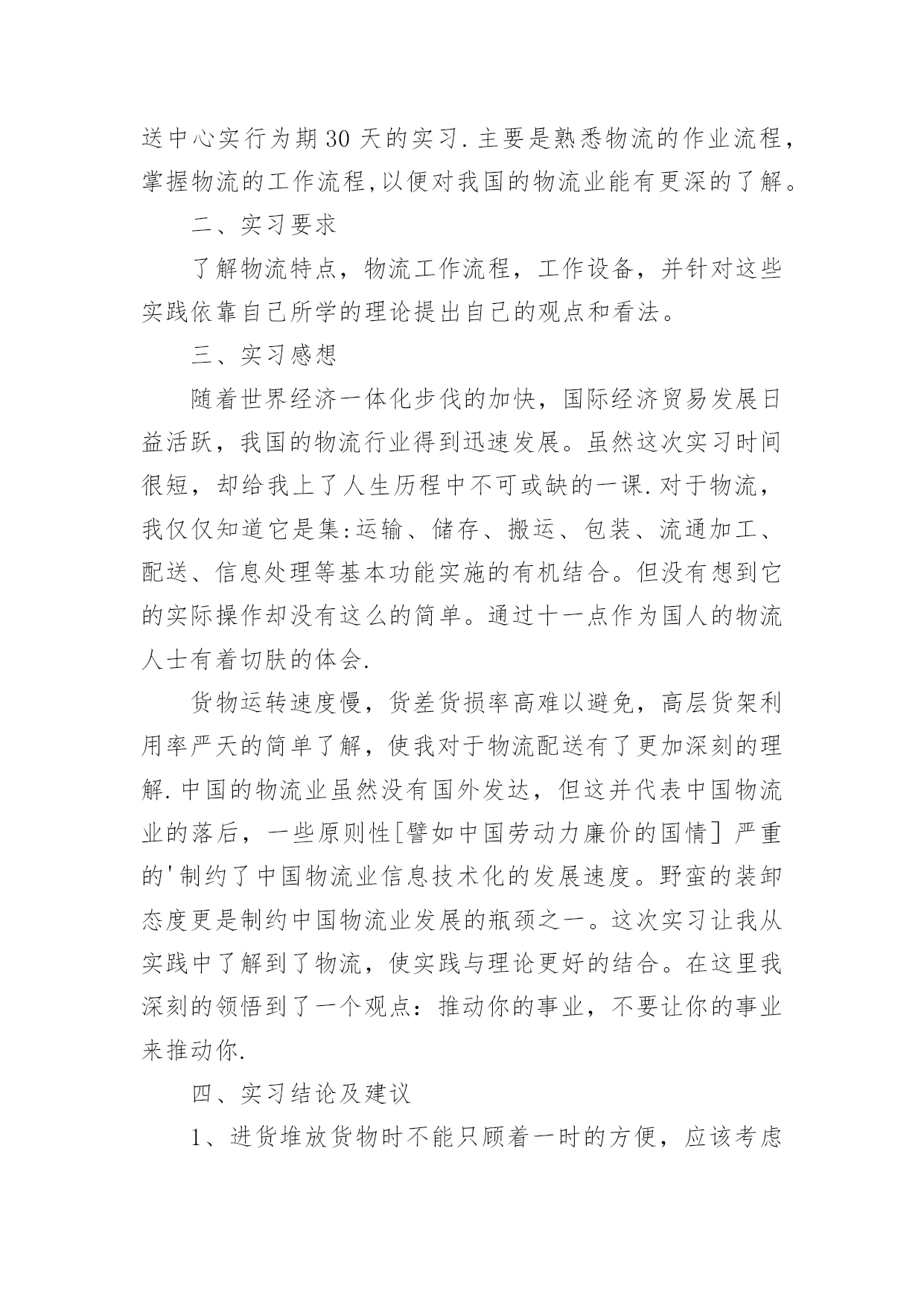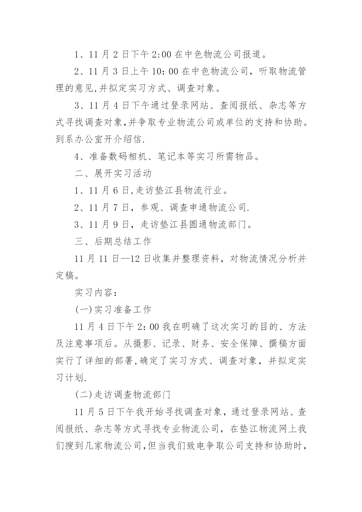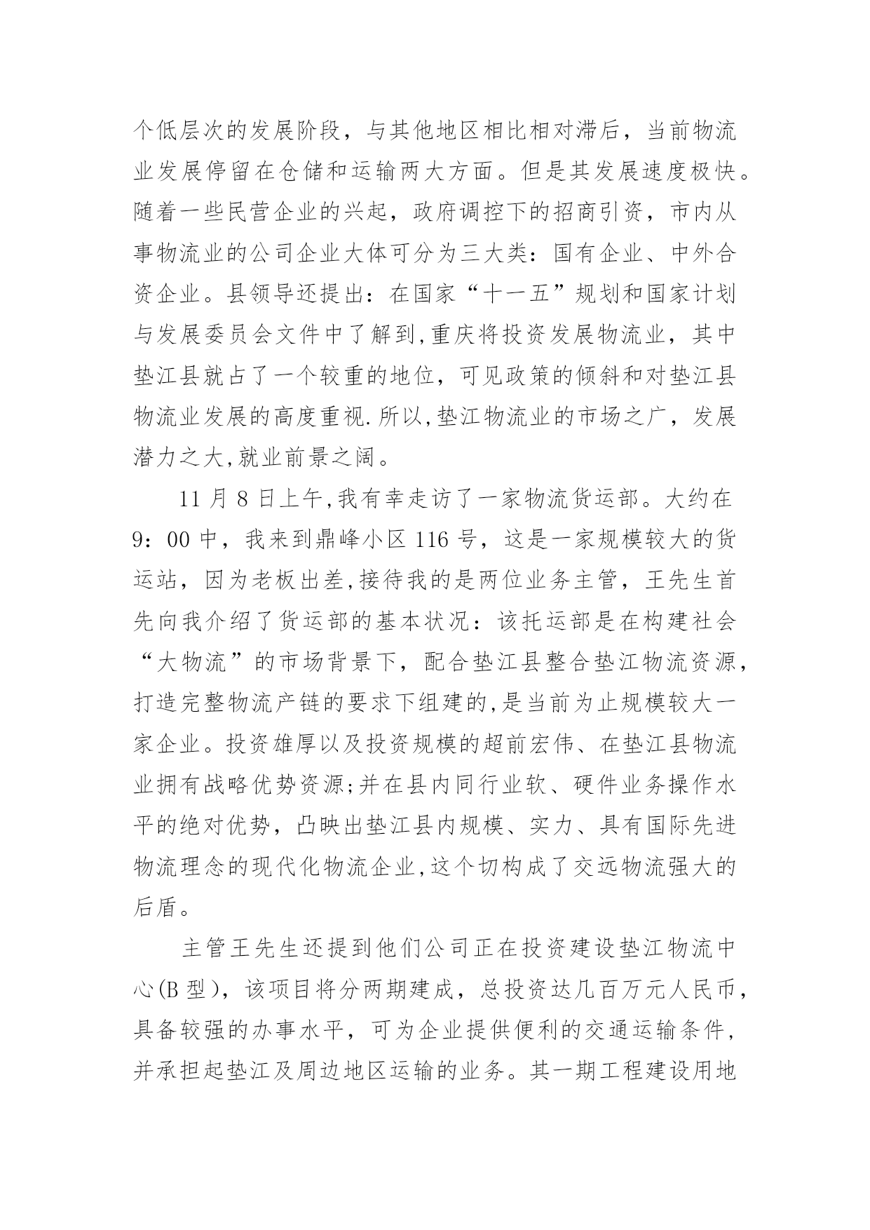 物流专业实习报告物流专业实习报告在学习、工作生活中,报告有着举足轻重的地位,我们在写报告的时候要注意涵盖报告的基本要素。那么你真正懂得怎么写好报告吗?以下是小编为大家收集的物流专业实习报告,仅供参考,大家一起来看看吧。物流专业实习报告1实习目的:选择身边的企业单位为对象,联系课上所学理论,采用实地考察跟踪其物流全过程的方法,对垫江物流业发体现状实行初步了解.培养实际调研水平,尝试检验所学知识,并从实际中进一步学习了解物流的内涵与外延.实习方式:采用实地调研的方式,具体采用了面对面的访谈了解、过程跟踪调查和侧面行为观察的方式。出动全组成员合理分工,每人负责不同侧面的内容,协同合作,调查后集体讨论分析,并总结出实习报告.实习时间:实习地点:重庆市垫江县实习步骤:一、前期准备工作1、11月2日下午2:00在中色物流公司报道。2、11月3日上午10:00在中色物流公司,听取物流管理的意见,并拟定实习方式、调查对象。3、11月4日下午通过登录网站、查阅报纸、杂志等方式寻找调查对象,并争取专业物流公司或单位的支持和协助。到系办公室开介绍信.4、准备数码相机、笔记本等实习所需物品。二、展开实习活动1、11月6日,走访垫江县物流行业。2、11月7日,参观、调查申通物流公司.3、11月9日,走访垫江县圆通物流部门。三、后期总结工作11月11日—12日收集并整理资料,对物流情况分析并定稿。实习内容:(一)实习准备工作11月4日下午2:00我在明确了这次实习的目的、方法及注意事项后。从摄影、记录、财务、安全保障、撰稿方面实行了详细的部署,确定了实习方式、调查对象,并拟定实习计划.(二)走访调查物流部门11月5日下午我开始寻找调查对象,通过登录网站、查阅报纸、杂志等方式寻找专业物流公司,在垫江物流网上我们搜到几家物流公司,但当我们致电争取公司支持和协助时,却一次次遭到拒绝和打击.其中有的公司很干脆:没时间接待;有的单位老总出差,没人能够做主接待我们;有的要申请总经理的同意,不过就没了答复;还有的是我千辛万苦找到一家老总的手机号码,不过总也打不进去.总之,他们有充足的理由将我们拒之门外。功夫不负有心人,经过持续地询问,我们与重庆垫江物流行业的管理员取得了联系,并顺利争取到走访该物流的机会.(三)实地调查情况11月6日上午8:45分,我来到了垫江申通物流部门,这是我本次实习的第一站。当我讲明了这次走访的目的后,便开始了这次人物访谈。首先该站管理员向我讲述了其物流管理的历程.随着市场经济的迅速发展、社会化大生产特别是工业化初步实现。使得产品极大的丰富,产品的大量交换、运输与仓储成为必然.各种各样物资的流动与日俱增,越来越受到人们的注重。垫江县政府理解到作为新的经济增长点的现代物流业必然成为垫江经济发展的基础产业。要充分发挥其区位优势。潜在无限的商机,县内外商贾云集,纷纷把目光注视在垫江这片红土地上。县政府果断提出自己的发展思路和战略构想。并投入大量资金建设好县内、外1小时经济圈。栽好梧桐树、引来金凤凰。短短几年时间垫江经济发生了翻天覆地的变化.垫江物流业也正是在这样的环境下应运而生.政府对物流业发展的高度重视,对该协会成立给予了大力支持,同时实行了分析,他指出垫江县的物流业还处在一个低层次的发展阶段,与其他地区相比相对滞后,当前物流业发展停留在仓储和运输两大方面。但是其发展速度极快。随着一些民营企业的兴起,政府调控下的招商引资,市内从事物流业的公司企业大体可分为三大类:国有企业、中外合资企业。县领导还提出:在国家“十一五”规划和国家计划与发展委员会文件中了解到,重庆将投资发展物流业,其中垫江县就占了一个较重的地位,可见政策的倾斜和对垫江县物流业发展的高度重视.所以,垫江物流业的市场之广,发展潜力之大,就业前景之阔。11月8日上午,我有幸走访了一家物流货运部。大约在9:00中,我来到鼎峰小区116号,这是一家规模较大的货运站,因为老板出差,接待我的是两位业务主管,王先生首先向我介绍了货运部的基本状况:该托运部是在构建社会“大物流”的市场背景下,配合垫江县整合垫江物流资源,打造完整物流产链的要求下组建的,是当前为止规模较大一家企业。投资雄厚以及投资规模的超前宏伟、在垫江县物流业拥有战略优势资源;并在县内同行业软、硬件业务操作水平的绝对优势,凸映出垫江县内规模、实力、具有国际先进物流理念的现代化物流企业,这个切构成了交远物流强大的后盾。主管王先生还提到他们公司正在投资建设垫江物流中心(B型),该项目将分两期建成,总投资达几百万元人民币,具备较强的办事水平,可为企业提供便利的交通运输条件,并承担起垫江及周边地区运输的业务。其一期工程建设用地面积为100多亩,投资额为200多万元人民币,主要建设综合办公大楼以及3000平方米标准仓库、1000平方米查验熏蒸仓库、