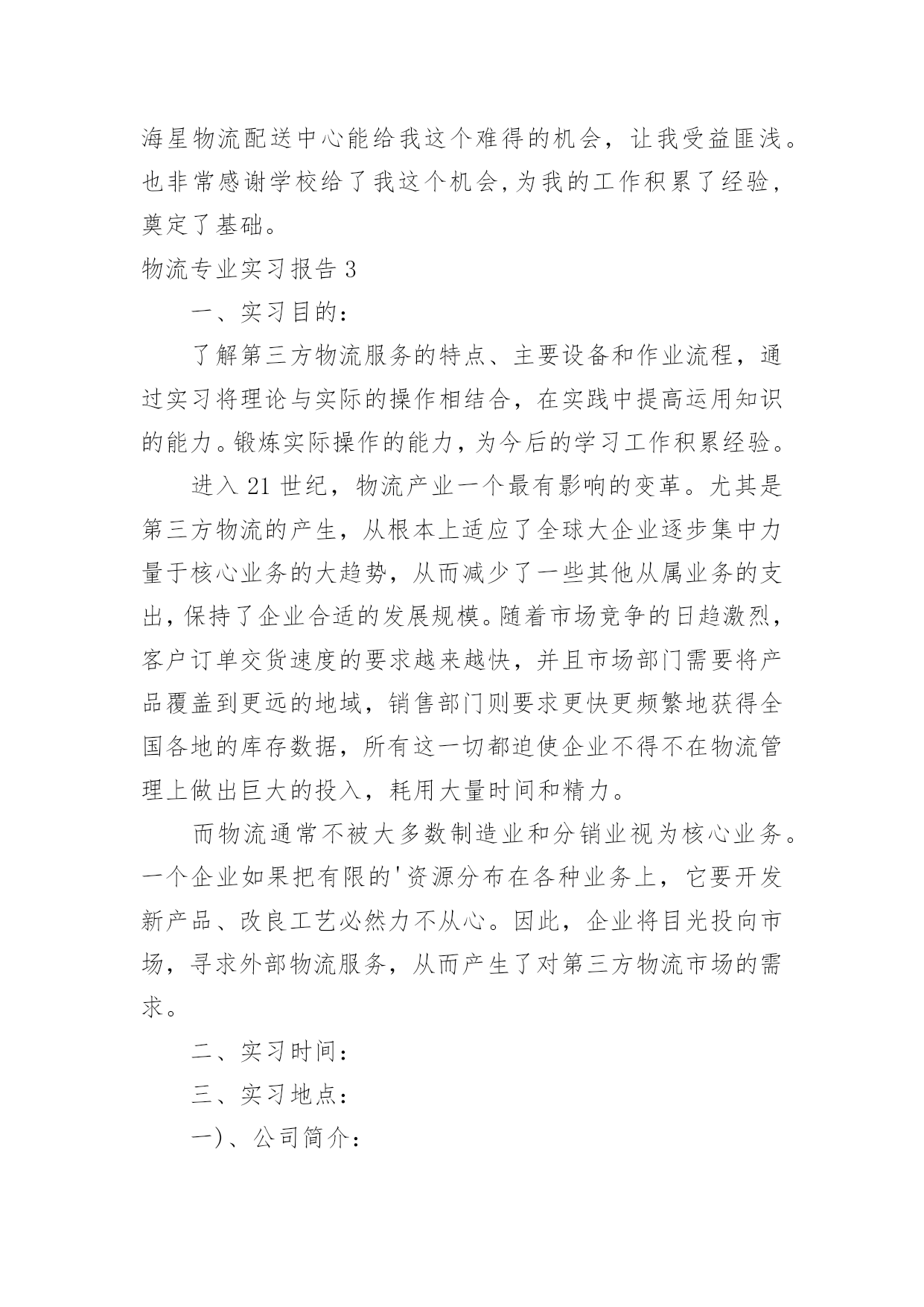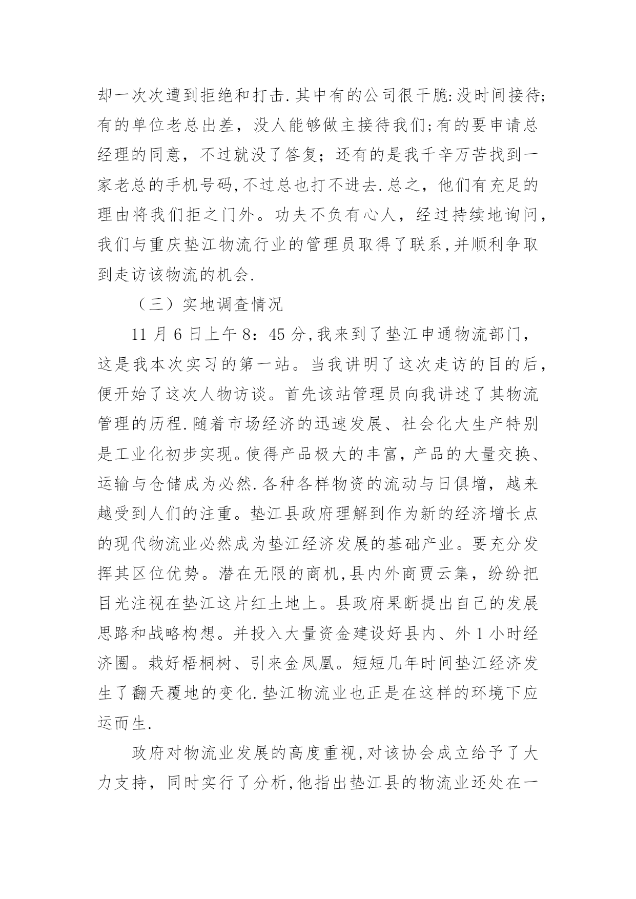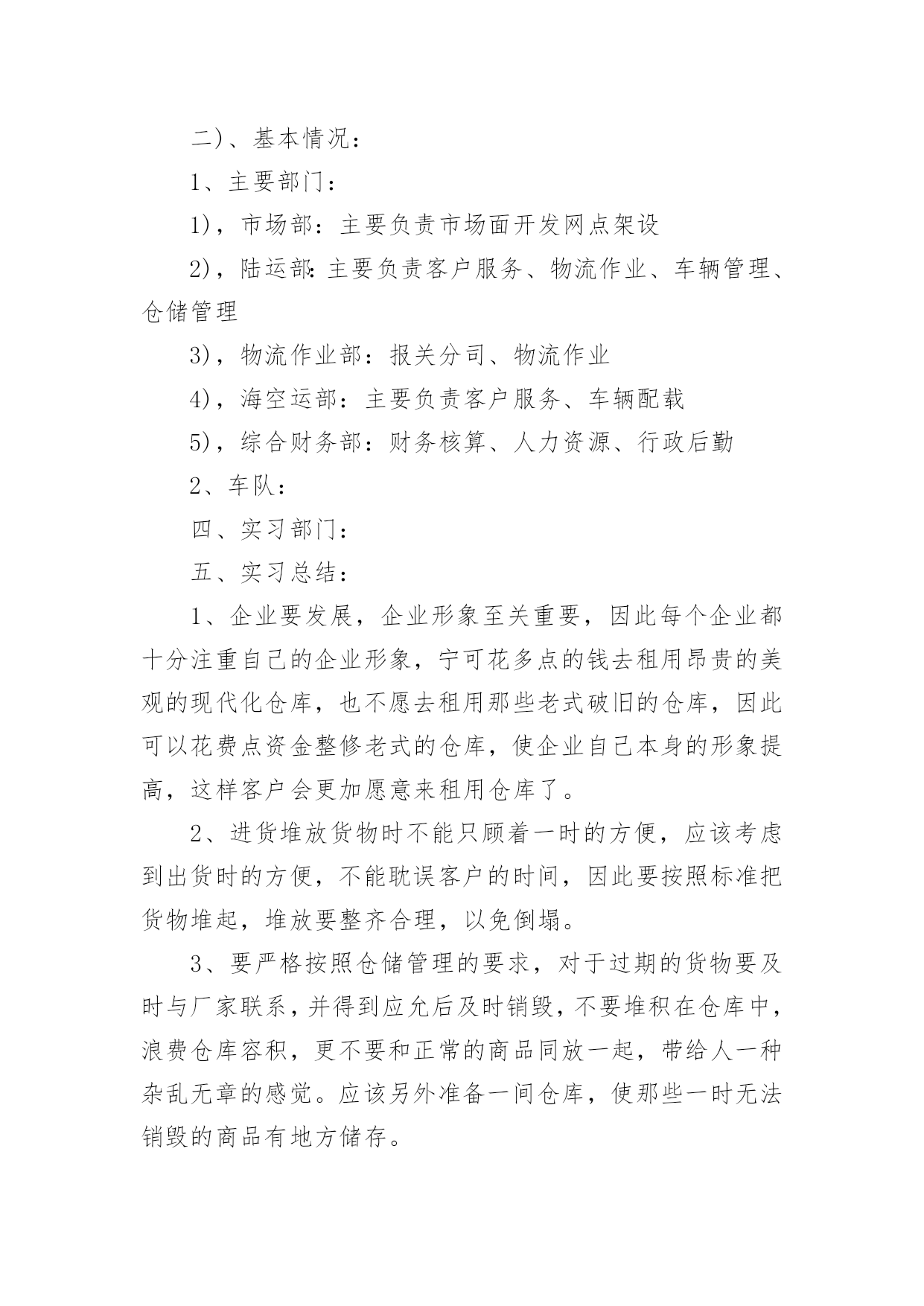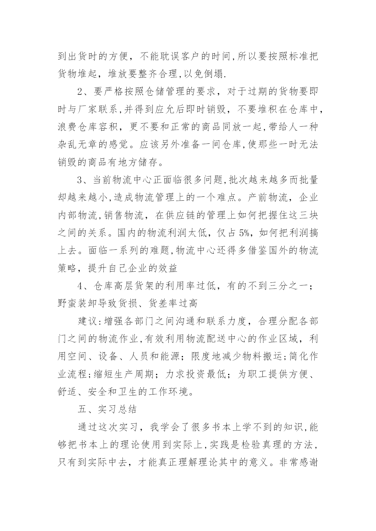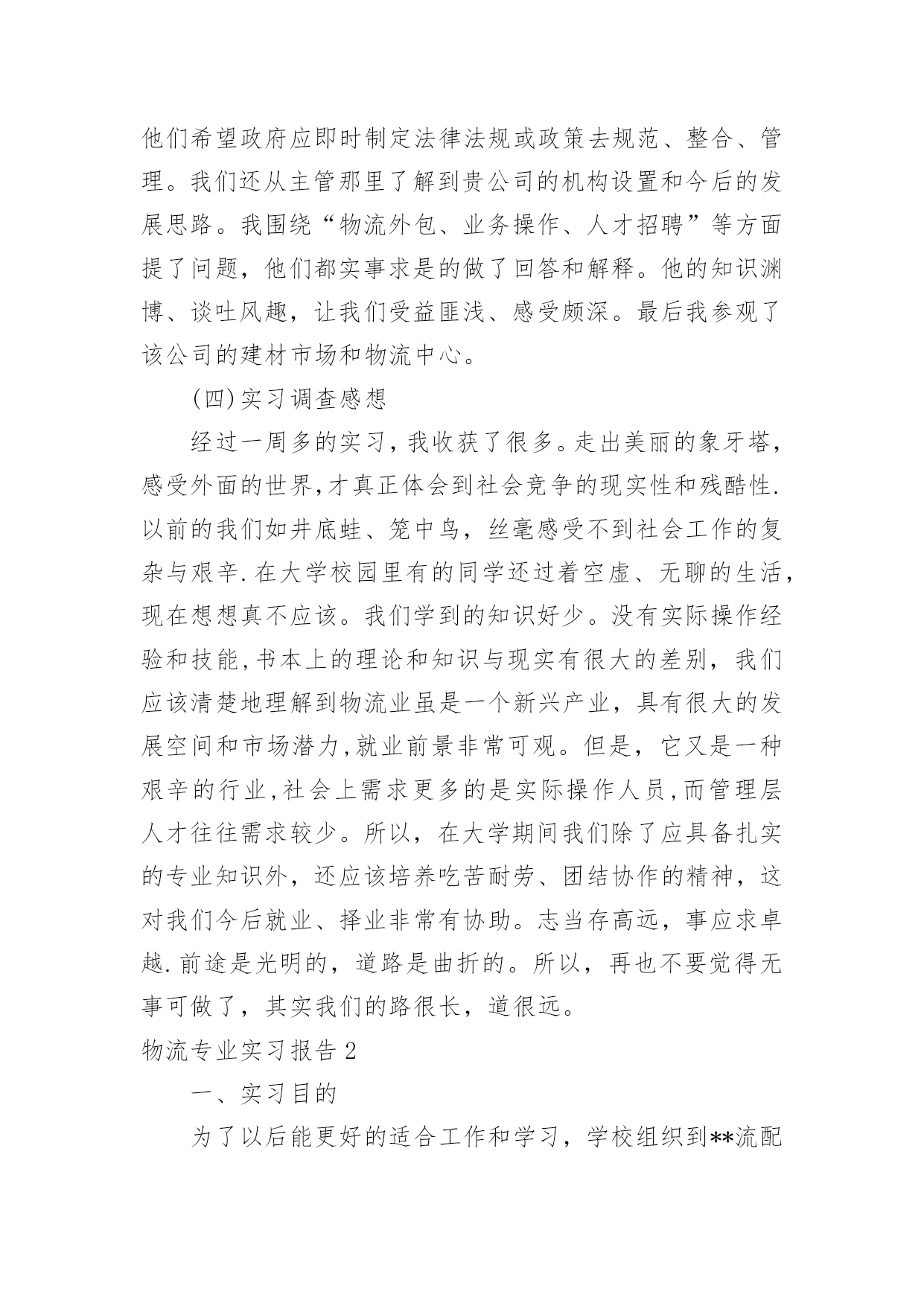 物流专业实习报告物流专业实习报告在学习、工作生活中,报告有着举足轻重的地位,我们在写报告的时候要注意涵盖报告的基本要素。那么你真正懂得怎么写好报告吗?以下是小编为大家收集的物流专业实习报告,仅供参考,大家一起来看看吧。物流专业实习报告1实习目的:选择身边的企业单位为对象,联系课上所学理论,采用实地考察跟踪其物流全过程的方法,对垫江物流业发体现状实行初步了解.培养实际调研水平,尝试检验所学知识,并从实际中进一步学习了解物流的内涵与外延.实习方式:采用实地调研的方式,具体采用了面对面的访谈了解、过程跟踪调查和侧面行为观察的方式。出动全组成员合理分工,每人负责不同侧面的内容,协同合作,调查后集体讨论分析,并总结出实习报告.实习时间:实习地点:重庆市垫江县实习步骤:一、前期准备工作1、11月2日下午2:00在中色物流公司报道。2、11月3日上午10:00在中色物流公司,听取物流管理的意见,并拟定实习方式、调查对象。3、11月4日下午通过登录网站、查阅报纸、杂志等方式寻找调查对象,并争取专业物流公司或单位的支持和协助。到系办公室开介绍信.4、准备数码相机、笔记本等实习所需物品。二、展开实习活动1、11月6日,走访垫江县物流行业。2、11月7日,参观、调查申通物流公司.3、11月9日,走访垫江县圆通物流部门。三、后期总结工作11月11日—12日收集并整理资料,对物流情况分析并定稿。实习内容:(一)实习准备工作11月4日下午2:00我在明确了这次实习的目的、方法及注意事项后。从摄影、记录、财务、安全保障、撰稿方面实行了详细的部署,确定了实习方式、调查对象,并拟定实习计划.(二)走访调查物流部门11月5日下午我开始寻找调查对象,通过登录网站、查阅报纸、杂志等方式寻找专业物流公司,在垫江物流网上我们搜到几家物流公司,但当我们致电争取公司支持和协助时,却一次次遭到拒绝和打击.其中有的公司很干脆:没时间接待;有的单位老总出差,没人能够做主接待我们;有的要申请总经理的同意,不过就没了答复;还有的是我千辛万苦找到一家老总的手机号码,不过总也打不进去.总之,他们有充足的理由将我们拒之门外。功夫不负有心人,经过持续地询问,我们与重庆垫江物流行业的管理员取得了联系,并顺利争取到走访该物流的机会.(三)实地调查情况11月6日上午8:45分,我来到了垫江申通物流部门,这是我本次实习的第一站。当我讲明了这次走访的目的后,便开始了这次人物访谈。首先该站管理员向我讲述了其物流管理的历程.随着市场经济的迅速发展、社会化大生产特别是工业化初步实现。使得产品极大的丰富,产品的大量交换、运输与仓储成为必然.各种各样物资的流动与日俱增,越来越受到人们的注重。垫江县政府理解到作为新的经济增长点的现代物流业必然成为垫江经济发展的基础产业。要充分发挥其区位优势。潜在无限的商机,县内外商贾云集,纷纷把目光注视在垫江这片红土地上。县政府果断提出自己的发展思路和战略构想。并投入大量资金建设好县内、外1小时经济圈。栽好梧桐树、引来金凤凰。短短几年时间垫江经济发生了翻天覆地的变化.垫江物流业也正是在这样的环境下应运而生.政府对物流业发展的高度重视,对该协会成立给予了大力支持,同时实行了分析,他指出垫江县的物流业还处在一个低层次的发展阶段,与其他地区相比相对滞后,当前物流业发展停留在仓储和运输两大方面。但是其发展速度极快。随着一些民营企业的兴起,政府调控下的招商引资,市内从事物流业的公司企业大体可分为三大类:国有企业、中外合资企业。县领导还提出:在国家“十一五”规划和国家计划与发展委员会文件中了解到,重庆将投资发展物流业,其中垫江县就占了一个较重的地位,可见政策的倾斜和对垫江县物流业发展的高度重视.所以,垫江物流业的市场之广,发展潜力之大,就业前景之阔。11月8日上午,我有幸走访了一家物流货运部。大约在9:00中,我来到鼎峰小区116号,这是一家规模较大的货运站,因为老板出差,接待我的是两位业务主管,王先生首先向我介绍了货运部的基本状况:该托运部是在构建社会“大物流”的市场背景下,配合垫江县整合垫江物流资源,打造完整物流产链的要求下组建的,是当前为止规模较大一家企业。投资雄厚以及投资规模的超前宏伟、在垫江县物流业拥有战略优势资源;并在县内同行业软、硬件业务操作水平的绝对优势,凸映出垫江县内规模、实力、具有国际先进物流理念的现代化物流企业,这个切构成了交远物流强大的后盾。主管王先生还提到他们公司正在投资建设垫江物流中心(B型),该项目将分两期建成,总投资达几百万元人民币,具备较强的办事水平,可为企业提供便利的交通运输条件,并承担起垫江及周边地区运输的业务。其一期工程建设用地面积为100多亩,投资额为200多万元人民币,主要建设综合办公大楼以及3000平方米标准仓库、1000平方米查验熏蒸仓库、