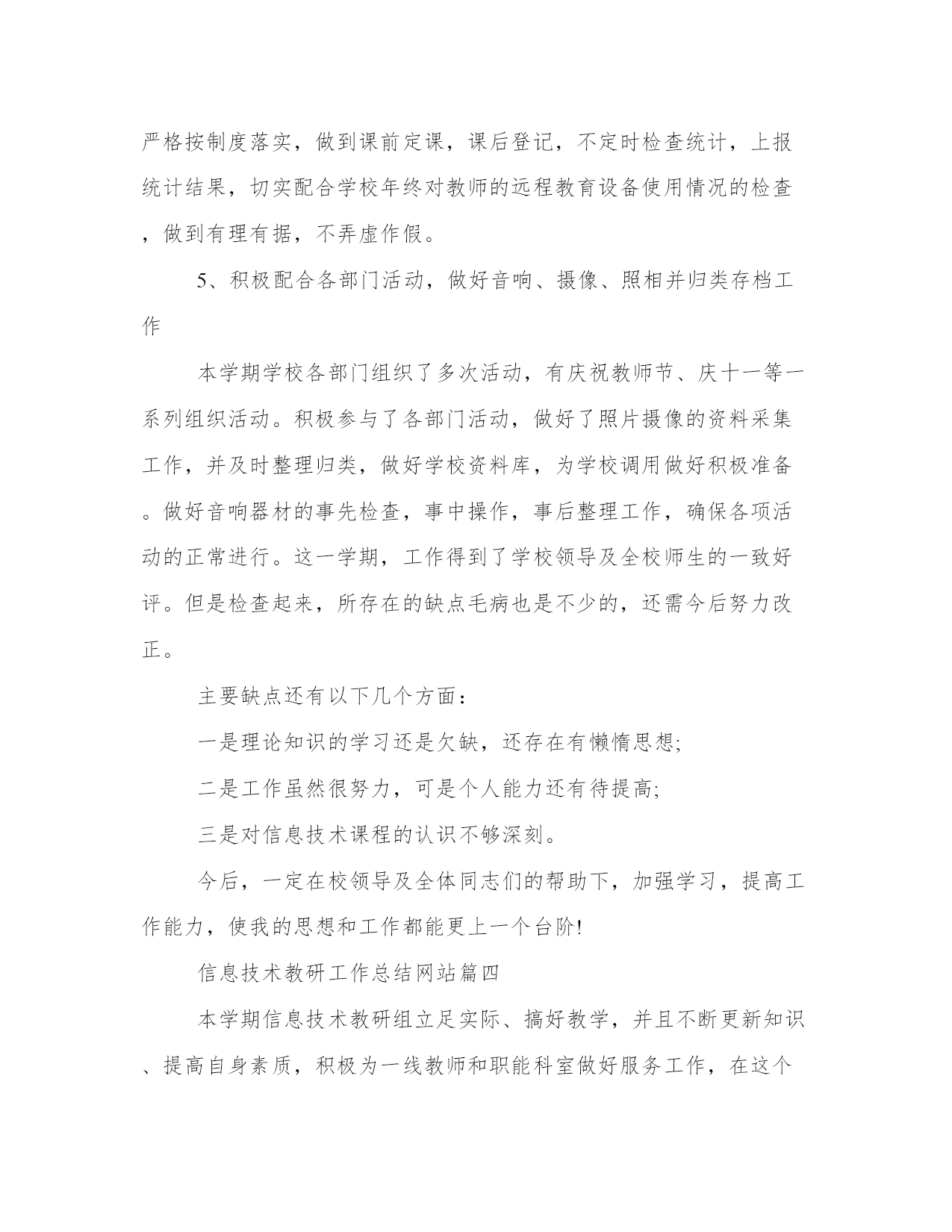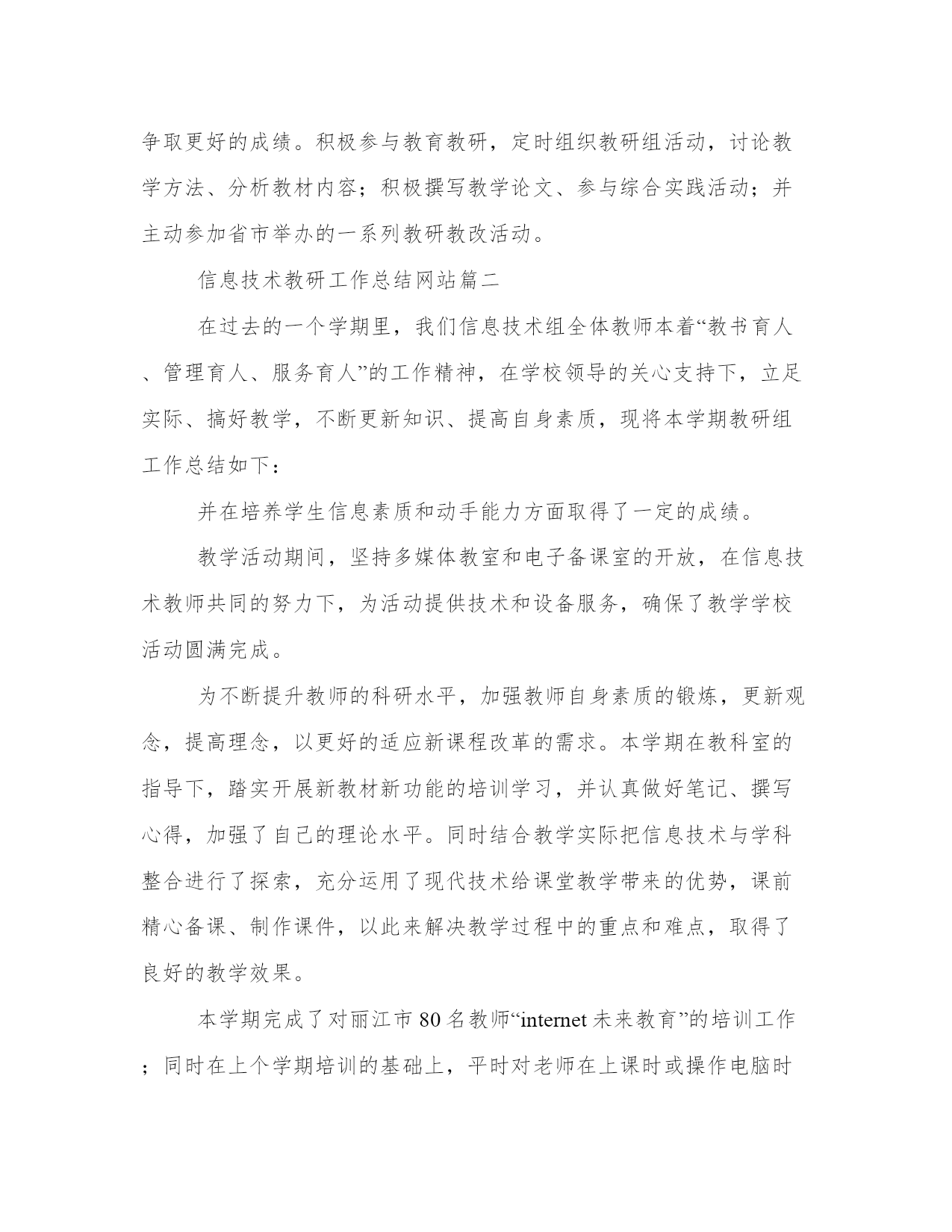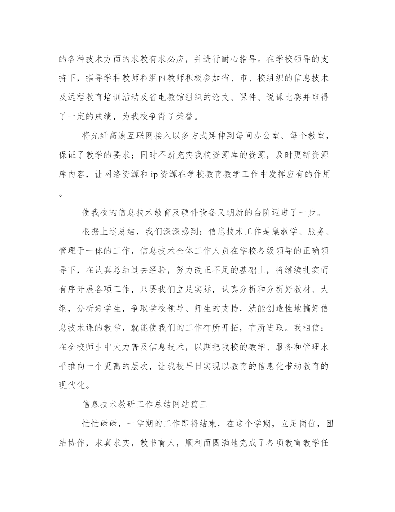 信息技术教研工作总结网站(十篇)总结是写给人看的,条理不清,人们就看不下去,即使看了也不知其所以然,这样就达不到总结的目的。相信许多人会觉得总结很难写?下面是小编带来的优秀总结范文,希望大家能够喜欢!信息技术教研工作总结网站篇一开学初,按照学校的统一要求,召开了教研会议,学习学校在本学期的工作计划和校教导处的工作安排,明确了工作目标,总结上学期的成绩与不足,制订了本教研组本学期的工作计划。1、认真完成常规教学:按学校要求实行电子备课,电子备课的条理清晰、认真细致,能按要求认真完成。作业方面:基本是上机操作随堂完成。听课方面:教研组教师采取互听互评的方式,不断提高自身教学水平,并积极学习其它教研组教研活动的先进经验。2、做好网络电教工作:①教研组教师利用远教资源开发和组建校本教育资源网站,汇集教学课件、习题专集等,供全校教师教学使用。②继续完善ftp服务器和内网的维护工作,实现校园网上公文通知往来和无纸化办公。③做好学生机房和网络中心的设备维护工作,并协力完成班级、办公室电脑的维修,保证教学工作的正常进行。④电教工作,虽然该项工作比较繁重,但仍然尽力做好,主要是多媒体教室及计算机教室维护,日常而繁琐。⑤协助其他教研组,如英语、化学、数学等教研组的教师制作和完善课件,取得良好的反响。1、立足实际、搞好教学:我校的学生在信息技术方面的情况比较特殊,因为拥有一些学生之前从没有学过电脑,在这方面是个空白,甚至不知道鼠标的用法,不知道开关机的方法,而其他的学生呢?已经会在网上邻居查找游戏,知道怎么将一个文件夹共享、隐藏、给共享加访问权限,有的时候老师都拿他没有办法。怎样让一个从未接触过信息技术知识的学生,熟练地掌握最基本的知识,我校进行了“分层教学”的模式,并加强个别辅导、实现同学间一帮一、多帮一,基本解决了常规教学中难以攻克的难题。2、加强管理,确保信息技术健康发展:调查分析信息技术教育工作,针对存在的问题和发展方向,学校领导及时多次组织召开会议。对信息技术教学提出许多指导意见。3、调动各方积极性,加快信息技术基础教育设施建设步伐:我校的硬件投入一直遵循着"适度超前、量力而行"的原则,每年都要规划投入,逐步添加和更新教育教学设备,力争营造先进的现代化教学环境,20xx年3月,为了顺利完成八年级信息技术水平考试,我校新建了一个计算机教室。4、加快信息技术培训速度,提高教师信息技术教育操做能力:充分利用现有的培训条件,经常组织教师培训与校外培训相结合;假期培训和平时培训相结合;集中培训和分散培训相结合的原则,为信息技术在学科教学中应用给予了有效师资保证。几年来,开设的讲座有:word的基本操作、windows98的基本操作、怎样使用wps编辑文件、怎样连接上网,怎样浏览网页、怎样实现校园局域网络共享、各教室终端设备的应用和操作、怎样运用powerpoint制作幻灯片、authorware入门、等十几个课题,共计50多课时。5、加强信息技术教学工作,提高学生信息技术操作能力:为学生开设信息技术教育课,培养学生学习信息技术的兴趣,教师坚持深入学习,认真备课,刻苦分析,增强信息技术教学的知识性和趣味性,提高信息技术课教学质量。6、加强软件建设,不断丰富信息技术教育资源。我们在发展硬件建设的同时,更加注重软件的开发和利用,对教师的公开课、说课进行录像,教师自制课件收集方面,我校保存了较多的校本资源,并逐步扩充资源库。7、加强信息技术应用分析,促进信息技术与学科教学的整合。信息技术与学科教学的整合,实现教学手段和方法的现代化,提高课程改革的质量。培养学生收集信息、整理信息、应用信息和自主学习、主动探索知识的能力。我们虽然取得一些工作成效,但由于信息技术教育正处于发展阶段,同时也存在一些问题,归纳起来有以下3点:1、信息技术在教育教学管理的作用还没有完全发挥出来。2、信息技术与学科教学的整合还远远不够。一是能够做到整合的教师数量还比较少,二是还没有做到经常化。信息技术与学科教学整合要求领导和教师不但要有这方面的能力和水平,而且还要求教师具有不怕困难、努力工作的奉献精神。开展信息技术与学科教学整合工作每天需要花费大量的时间,这就为坚持应用信息技术带来一定困难,所以造成软件开发和现有软件应用还不够。3、信息技术设备维护和应用还存在死角。教师坚持学习应用还不够,由于没有专职教师进行维护,计算机等电教设备出现故障时不能及时排除。以上这些问题都需要我们在今后工作中加以克服和完善。1.今后的教育教学工作中,将加强学生的思想教育,提高学生的教、研、学素质和探索精神。2.加强基础知识和基本技能的教学,提高学生的上机操作能力。注意教学方法的运用,采用形式多样的教学手段,充分调动学生的学习积极性和主动性,激发学生的求知
