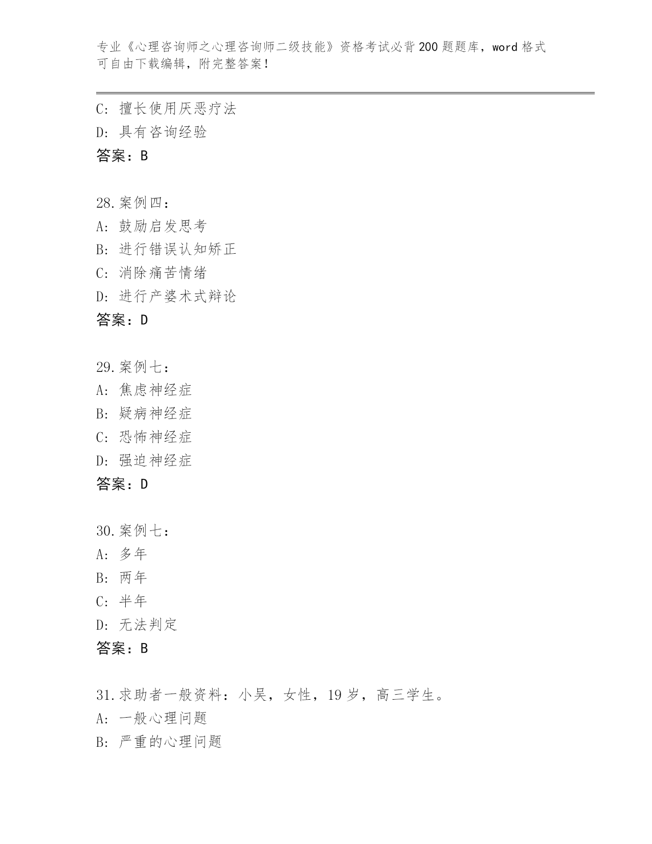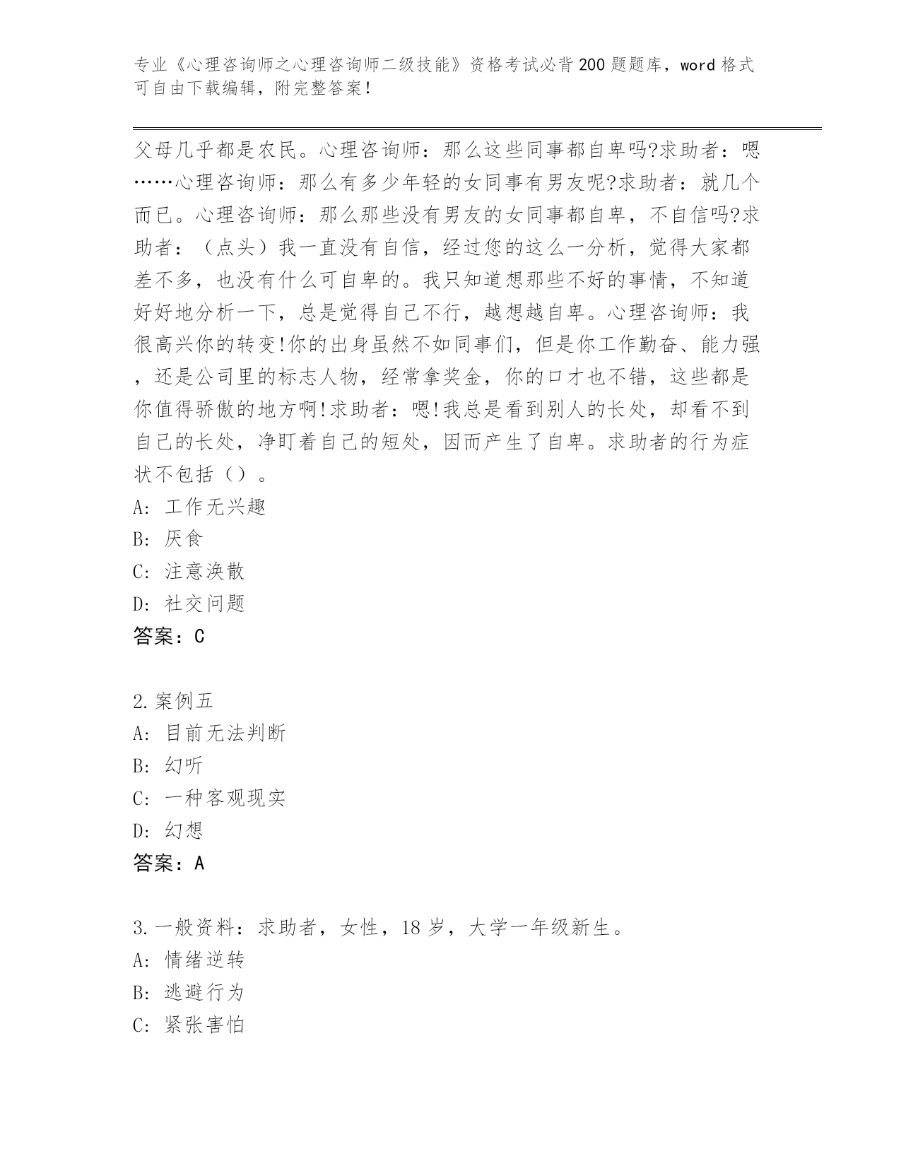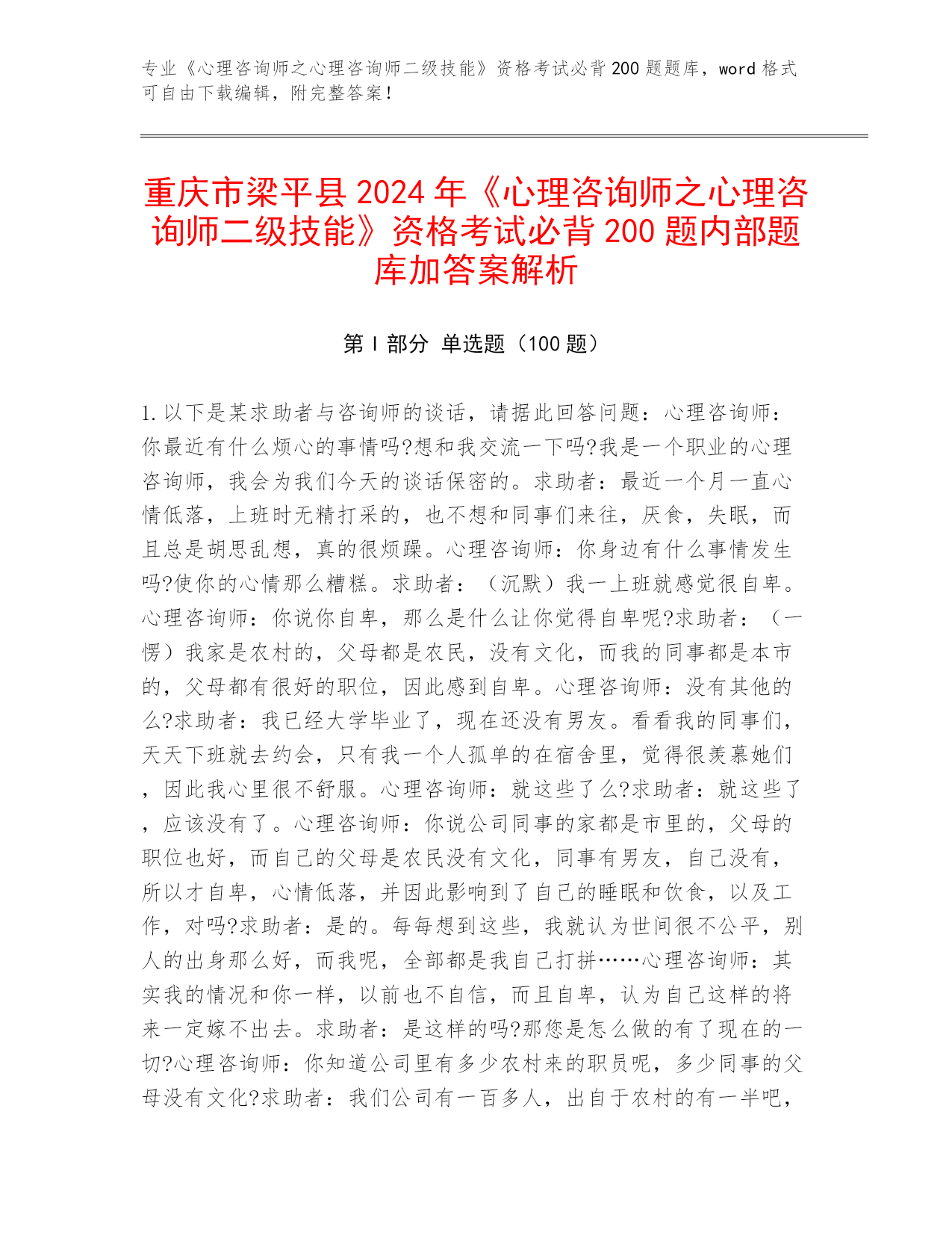 重庆市梁平县2024年《心理咨询师之心理咨询师二级技能》资格考试必背200题内部题库加答案解析
