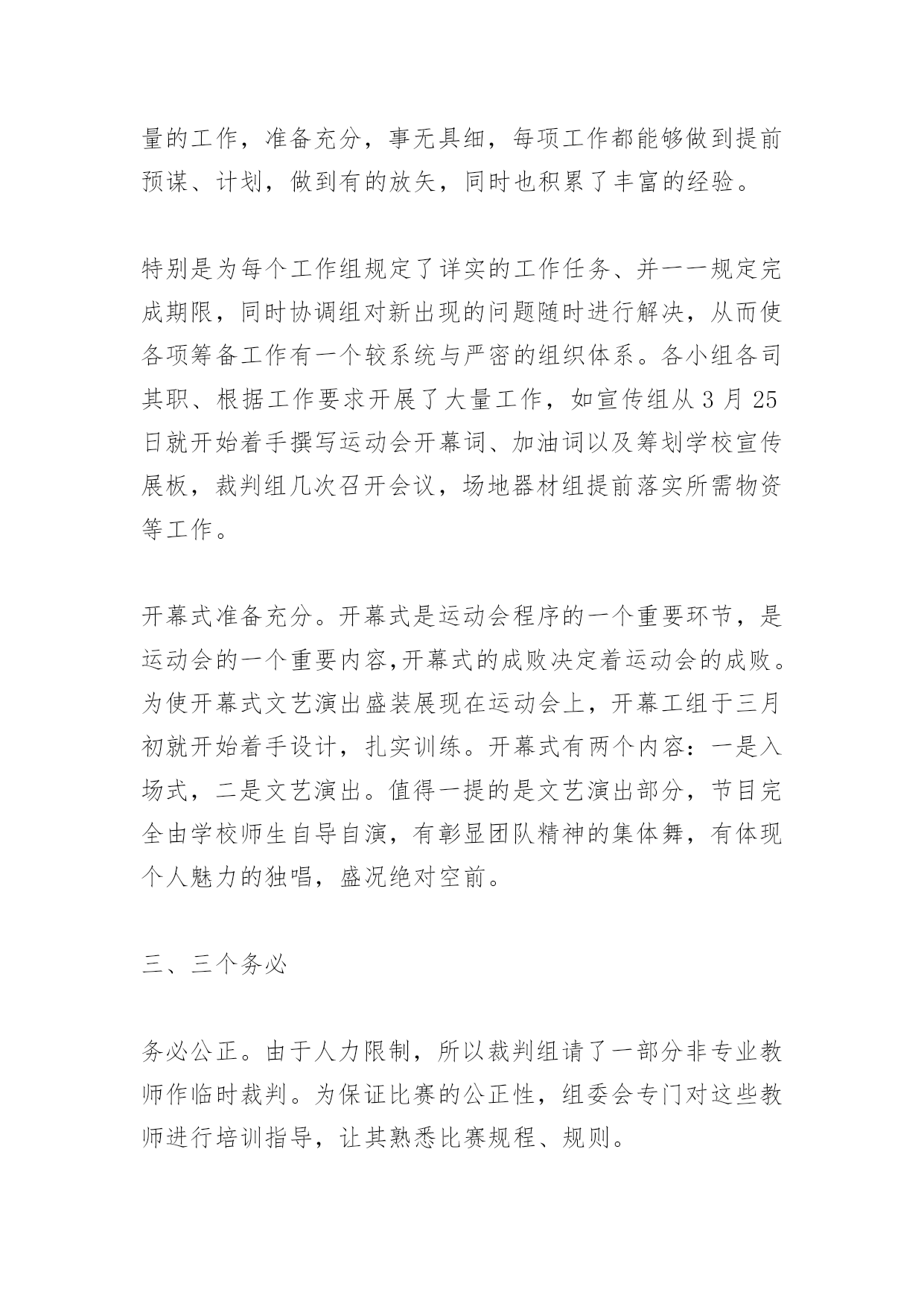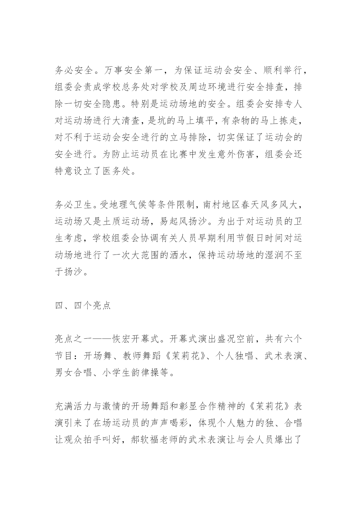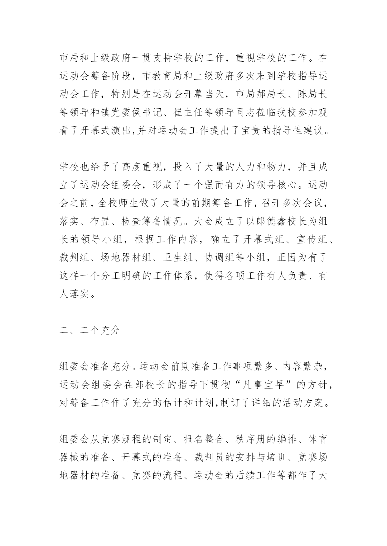 田径运动会总结辉县市(南村赛区)中学生田径运动会总结南村镇中心学校在市教育局的安排下,我校于2015年4月8日举办了辉县市(南村赛区)中学生田径运动会,后庄初中、西平罗乡中心学校、沙窑乡中心学校、南寨镇中心学校和南村镇中心学校等五所中学参加了此次运动会。这次运动会,在市局的正确指导下,在参与学校的大力支持下,在我校全体教职工的共同努力下,圆满落下了帷幕。这次运动会是对盘上片区学校体育工作的一次大检阅,整个运动会气氛热烈、秩序井然,充分体现了盘上五所中学良好的精神风貌,同时也展示了我校全体教职工的郎校长的团结带领下报表现出的凝聚力与向心力,充分展示了我校良好的管理和组织水平,有力地宣传了我校的各项工作。此次运动会是热情的、是欢乐的、是成功的。综观本届运动会,归结起来就是“一个重视、二个充分、三个务必、四个亮点”。一、一个重视市局和上级政府一贯支持学校的工作,重视学校的工作。在运动会筹备阶段,市教育局和上级政府多次来到学校指导运动会工作,特别是在运动会开幕当天,市局郝局长、陈局长等领导和镇党委侯书记、崔主任等领导同志莅临我校参加观看了开幕式演出,并对运动会工作提出了宝贵的指导性建议。学校也给予了高度重视,投入了大量的人力和物力,并且成立了运动会组委会,形成了一个强而有力的领导核心。运动会之前,全校师生做了大量的前期筹备工作,召开多次会议,落实、布置、检查筹备情况。大会成立了以郎德鑫校长为组长的领导小组,根据工作内容,确立了开幕式组、宣传组、裁判组、场地器材组、卫生组、协调组等小组,正因为有了这样一个分工明确的工作体系,使得各项工作有人负责、有人落实。二、二个充分组委会准备充分。运动会前期准备工作事项繁多、内容繁杂,运动会组委会在郎校长的指导下贯彻“凡事宜早”的方针,对筹备工作作了充分的估计和计划,制订了详细的活动方案。组委会从竞赛规程的制定、报名整合、秩序册的编排、体育器械的准备、开幕式的准备、裁判员的安排与培训、竞赛场地器材的准备、竞赛的流程、运动会的后续工作等都作了大量的工作,准备充分,事无具细,每项工作都能够做到提前预谋、计划,做到有的放矢,同时也积累了丰富的经验。特别是为每个工作组规定了详实的工作任务、并一一规定完成期限,同时协调组对新出现的问题随时进行解决,从而使各项筹备工作有一个较系统与严密的组织体系。各小组各司其职、根据工作要求开展了大量工作,如宣传组从3月25日就开始着手撰写运动会开幕词、加油词以及筹划学校宣传展板,裁判组几次召开会议,场地器材组提前落实所需物资等工作。开幕式准备充分。开幕式是运动会程序的一个重要环节,是运动会的一个重要内容,开幕式的成败决定着运动会的成败。为使开幕式文艺演出盛装展现在运动会上,开幕工组于三月初就开始着手设计,扎实训练。开幕式有两个内容:一是入场式,二是文艺演出。值得一提的是文艺演出部分,节目完全由学校师生自导自演,有彰显团队精神的集体舞,有体现个人魅力的独唱,盛况绝对空前。三、三个务必务必公正。由于人力限制,所以裁判组请了一部分非专业教师作临时裁判。为保证比赛的公正性,组委会专门对这些教师进行培训指导,让其熟悉比赛规程、规则。务必安全。万事安全第一,为保证运动会安全、顺利举行,组委会责成学校总务处对学校及周边环境进行安全排查,排除一切安全隐患。特别是运动场地的安全。组委会安排专人对运动场进行大清查,是坑的马上填平,有杂物的马上拣走,对不利于运动会安全进行的立马排除,切实保证了运动会的安全进行。为防止运动员在比赛中发生意外伤害,组委会还特意设立了医务处。务必卫生。受地理气侯等条件限制,南村地区春天风多风大,运动场又是土质运动场,易起风扬沙。为出于对运动员的卫生考虑,学校组委会协调有关人员早期利用节假日时间对运动场地进行了一次大范围的洒水,保持运动场地的湿润不至于扬沙。四、四个亮点亮点之一——恢宏开幕式。开幕式演出盛况空前,共有六个节目:开场舞、教师舞蹈《茉莉花》、个人独唱、武术表演、男女合唱、小学生韵律操等。充满活力与激情的开场舞蹈和彰显合作精神的《茉莉花》表演引来了在场运动员的声声喝彩,体现个人魅力的独、合唱让观众拍手叫好,郝软福老师的武术表演让与会人员爆出了雷鸣般的掌声,把文艺演出推向了高-潮,整齐划一的小学生韵律操表演赢得了大家的翘首称赞。局领导对此次开幕式文艺演出给予了高度评价,并不时地拿出相机拍照精彩瞬间。