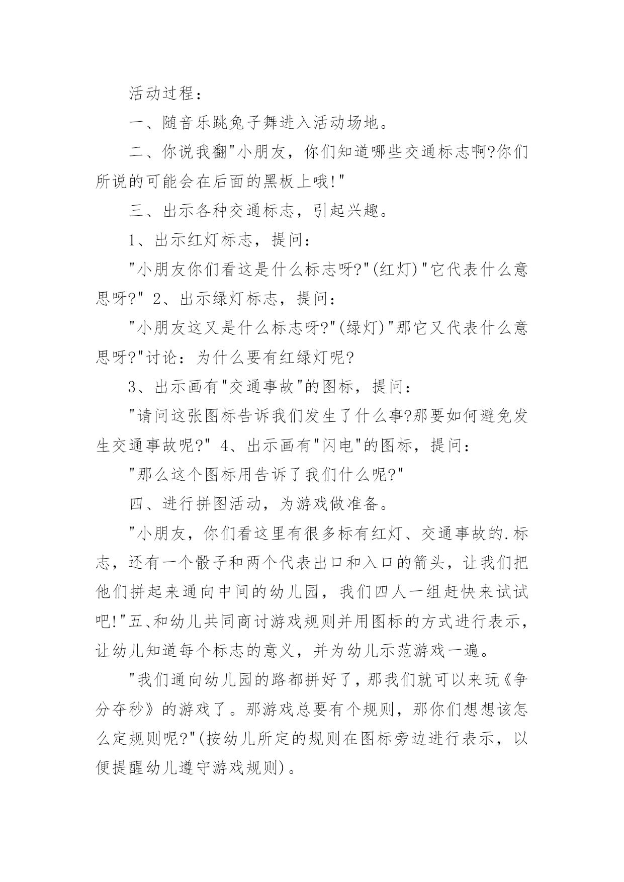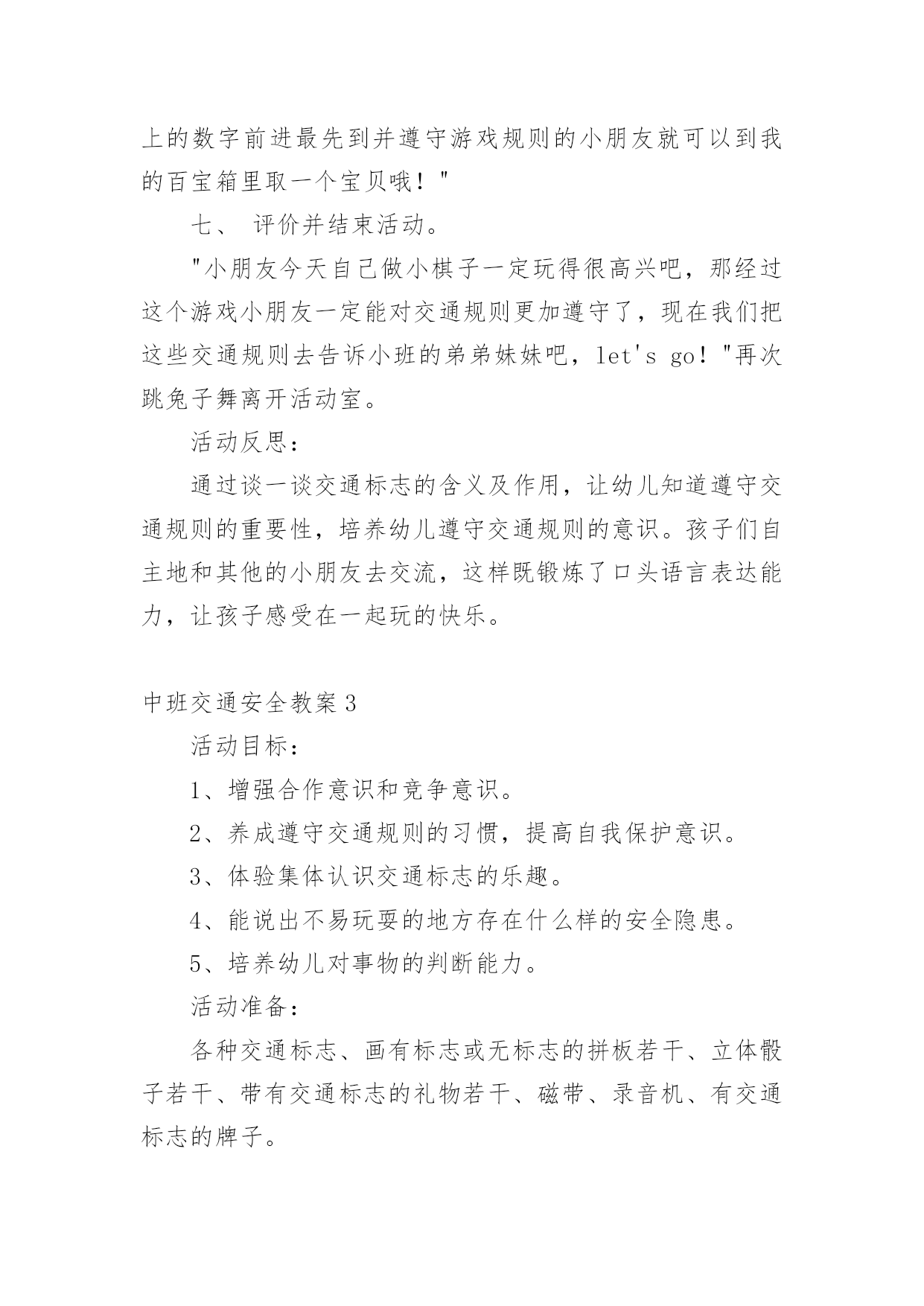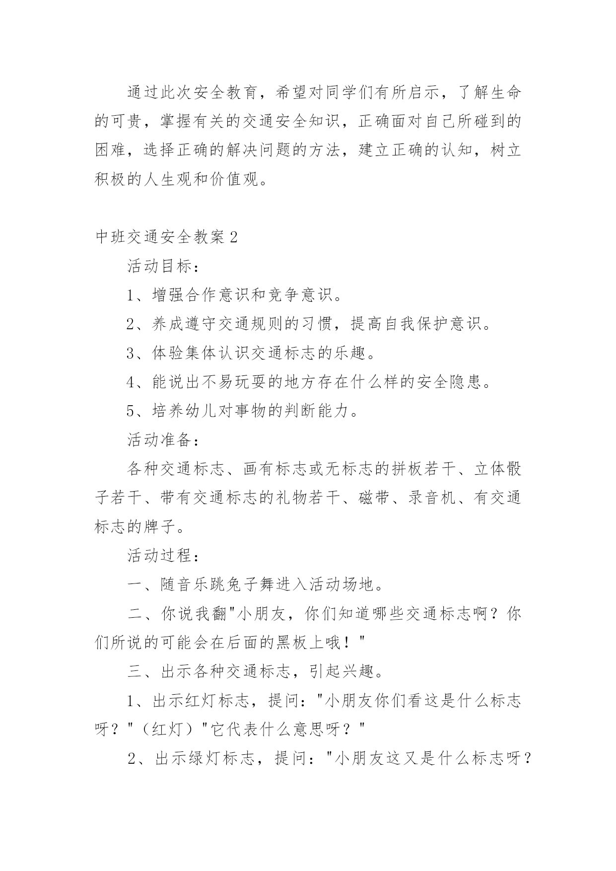 中班交通安全教案作为一名默默奉献的教育工作者,就难以避免地要准备教案,编写教案助于积累教学经验,不断提高教学质量。快来参考教案是怎么写的吧!下面是小编帮大家整理的中班交通安全教案,仅供参考,欢迎大家阅读。中班交通安全教案1教学目标:1、通过交通安全的教育使学生了解生命的可贵,掌握有关的交通安全知识,认清学习目的,增强学生安全意识2、引导学生在活动中认识生命的意义,在自我体验中发挥潜能,丰富自我生命,提升生命意义。热爱生命、保护生命3、为加强对学生法制与交通安全的教育与管理,使学生增加法制观念,做到懂法、知法、守法,确保身心健康,平安完成学业,教学重点:让学生知道各种常见的交通信号、标志和标线,知道有关交通常识,懂得应自觉遵守交通规则。教学难点:加强交通法规知识的学习,遵守交通法规教学过程:讲解交通安全事故案例一、导入:通过一系列的活动,让学生树立交通安全意识,从精神上远离交通安全隐患,加强自身的素质培养.为了贯彻落实公安部、教育部《关于加强中职学校交通安全工作的通知》精神,继续进一步搞好我校的交通安全教育,减少交通违章,杜绝交通事故。让学生了解交通活动中必备的安全知识,懂得安全的重要,并把自己学到的知识传达给周围的人们二、交通法规法律条文法规篇:1、道路、交通2、交通安全3、交通法规4、道路交通标志和交通信号5、看图识标志常识篇:1、行人为什么要在人行道上行走,没有人行道要靠路边行走?2、行人横过马路为什么要走人行横道?3、没有划设人行横道的马路应该注意哪些?4、为什么不能翻越护栏?5、为什么不准扒车、追车、强行拦车?6、为什么走路时不能看书或做其它活动?7、骑自行车应该注意什么?8、乘汽车时要注意什么?9、遇到交通事故怎么办?警示篇:1、骑自行车违反交通法规2、行走时违反交通法规3、铁路或铁路口违反交通法规4、交通安全教育卡三、观看小品--《爸妈,对不起》情景一:一个孩子要出去上学,他的爸妈一个劲的叮嘱,路在一定要小心……,他却一个劲地说爸妈罗嗦情景二:一次来学校,他因在路在耽搁了一些时间,快迟到了,在横过学校门口的的马路时,他因心急,不走人行横道,想快速地跑向对面,就在这时,悲剧上演了,就在他横冲时,一辆车直接撞上了他,他倒在了血泊里。情景三:因医院抢救他保住了生命,可从此他再也站不起来了,生活也不能自理。他看着为他悲痛伤心的爸爸妈妈,留下了深深悔过的`泪水。老师提问:看完小品后,有什么感受?同时你觉得我们应该怎么做,才会尽量避免这些悲剧的发生?小组成员进行讨论,说出感受本课小结同学们,我们通过一系列的活动,让学生树立交通安全意识,从精神上远离交通安全隐患,加强自身的素质培养.继续进一步搞好我们的交通安全教育,减少交通违章,杜绝交通事故。四、交通知识问答课堂练习1、行人在经过人行横道时,怎样走才最安全?()a、一直向右看b、一直向左看c、先向左看,再向右看2、行人在没有交通信号灯和人行横道的路口应如何通过?()a、跑步快速通过b、示意机动车让行后直行通过c、确认安全后直行通过3、黄灯持续闪烁时表示()a、有危险,车辆、行人不准通过b、车辆、行人须注意观望,确认安全后通过c、车辆、行人可以优先通过4、当路口信号灯为红灯和黄灯同时亮时,它表示的是什么含义?()a、即将变为绿灯,做好起步准备b、清理路口,不准通行c、道路通畅,快速通过5、机动车行驶时,除驾驶人应当按规定使用安全带外,同车还有哪些人要使用安全带?()a、前排乘车人b、后排乘车人c、全部乘车人六、课后作业1、当你需要乘坐出租车时,你可以()a、站在机动车道上拦乘b、站在路口拦乘c、站在人行道上拦乘2、当机动车停在机动车道上时,你应当怎样上下车?()a、从机动车左侧下车b、从机动车右侧上下车c、只要不妨碍其他车辆和行人通行,左右侧上下车都可以3、小红在等候乘坐公共汽车时,应该站在(),依次排队a.机动车道上b.站台或指定位置c.非机动车道上d.人行道上4、小杨每天都经过铁路道口,他在经过铁路道口时应该()a.快速跨越铁轨b.进入到口,观察后通过c.一停,二看,三通过d.在栏杆放下时抢先通过5、明明在晚自习课后骑自行车回家途中,迎面遇到一辆驶来的汽车,灯光非常耀眼,为了安全明明应该()a.用手遮挡风光b.闭目缓慢形式c.下车靠边避让d.迎着灯光行驶七、应采取的措施1、提高学生交通安全意识2、知道交通安全有些行为是不安全的3、引导青少年树立正确的价值观、人生观、择业观4、培养青少年自我防范交通安全意识5、一旦不安全的事情发生了,知道应该如何去处理总结:通过此次安全教育,希望对同学们有所启示,了解生命的可贵,掌握有关的交通安全知识,正确面对自己所碰到的困难,选择正确的解决问题的方法,建立正确的认知,树立积极的人生观和价值观。中班交通安全教案2活动目标:1、增强合作意识和