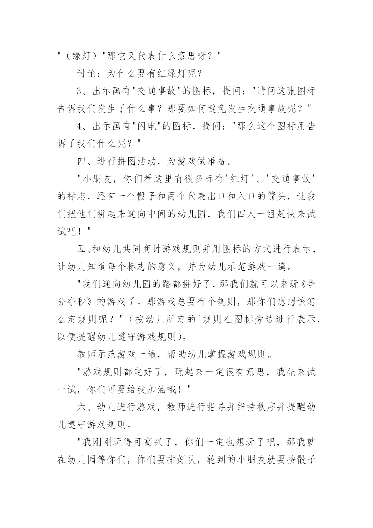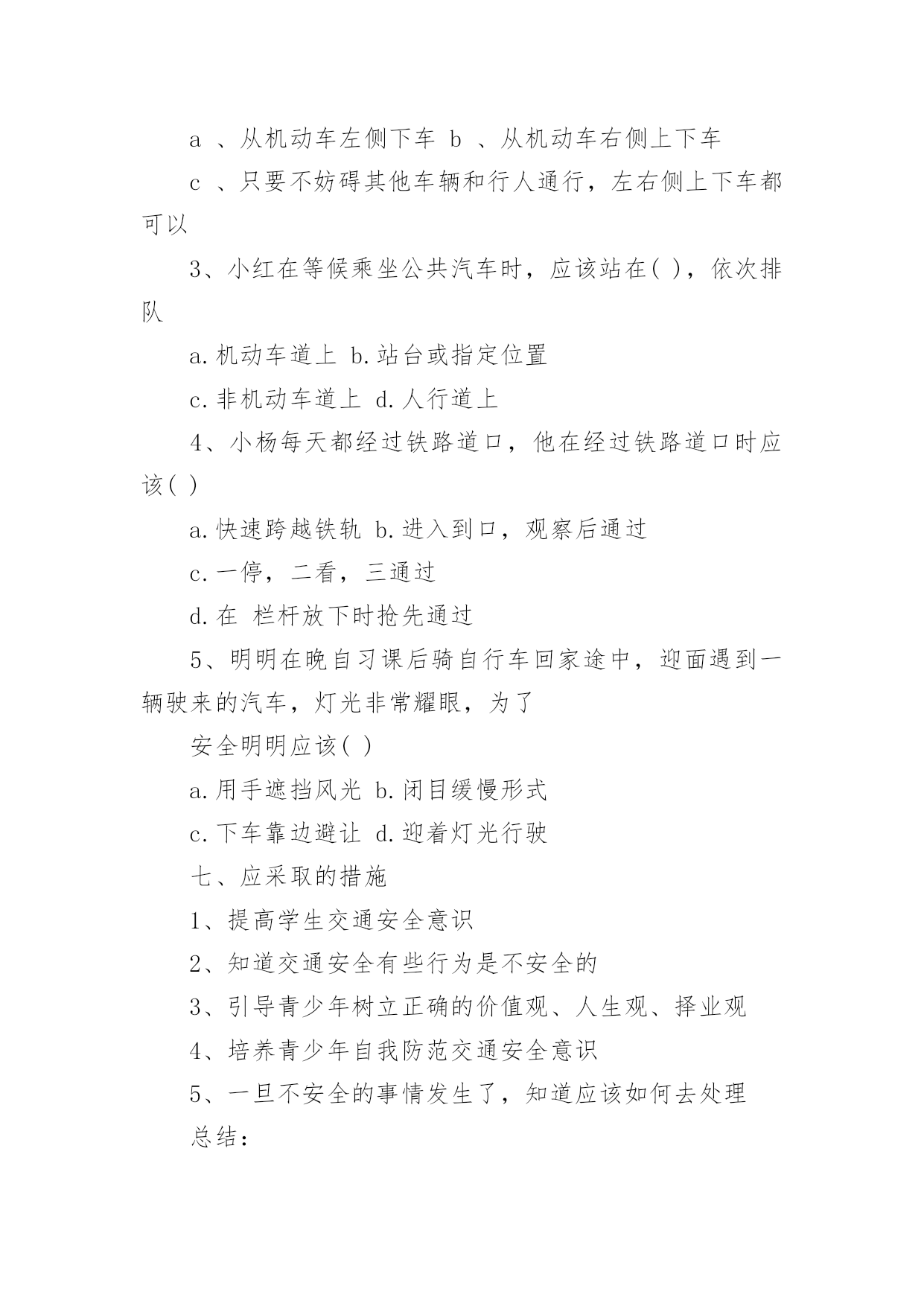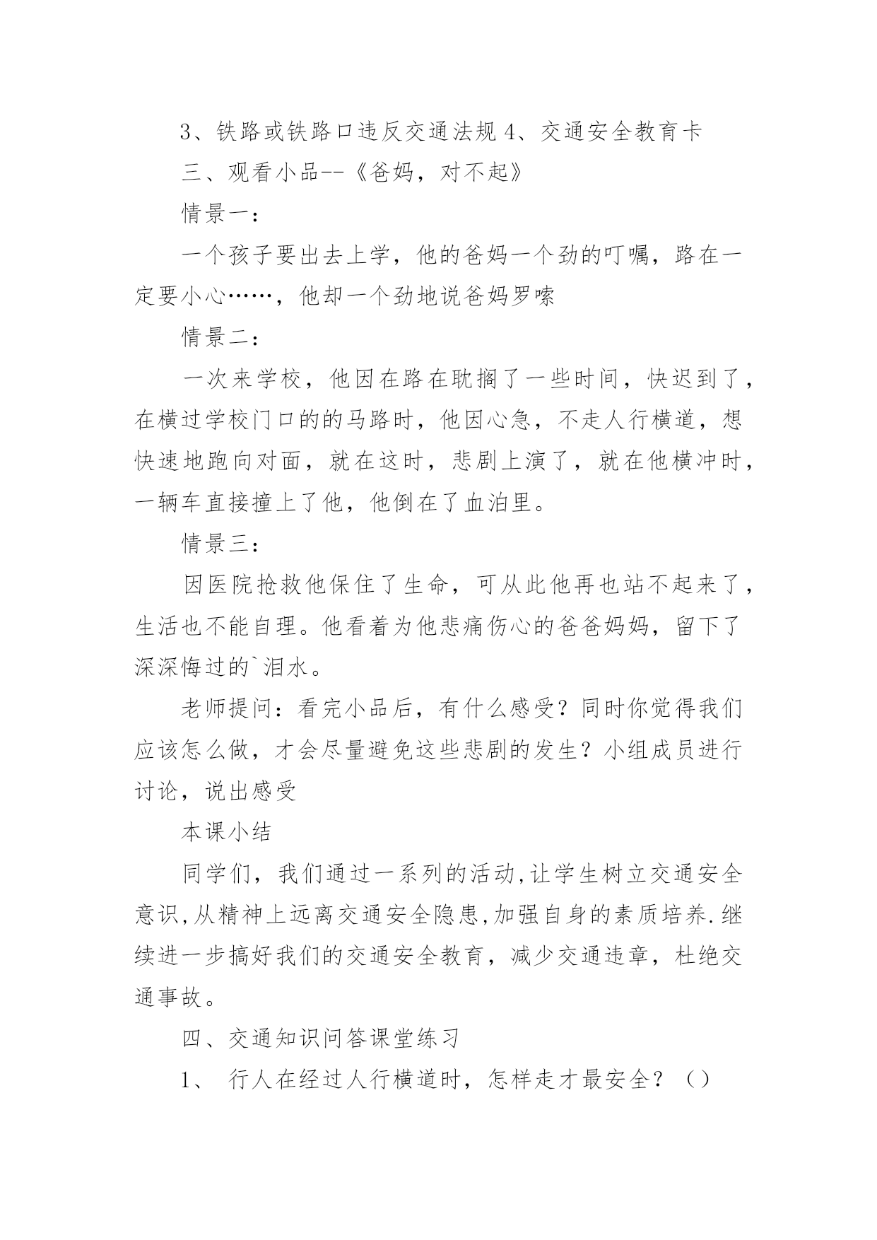 中班交通安全教案作为一名默默奉献的教育工作者,就难以避免地要准备教案,编写教案助于积累教学经验,不断提高教学质量。快来参考教案是怎么写的吧!下面是小编帮大家整理的中班交通安全教案,仅供参考,欢迎大家阅读。中班交通安全教案1教学目标:1、通过交通安全的教育使学生了解生命的可贵,掌握有关的交通安全知识,认清学习目的,增强学生安全意识2、引导学生在活动中认识生命的意义,在自我体验中发挥潜能,丰富自我生命,提升生命意义。热爱生命、保护生命3、为加强对学生法制与交通安全的教育与管理,使学生增加法制观念,做到懂法、知法、守法,确保身心健康,平安完成学业,教学重点:让学生知道各种常见的交通信号、标志和标线,知道有关交通常识,懂得应自觉遵守交通规则。教学难点:加强交通法规知识的学习,遵守交通法规教学过程:讲解交通安全事故案例一、导入:通过一系列的活动,让学生树立交通安全意识,从精神上远离交通安全隐患,加强自身的素质培养.为了贯彻落实公安部、教育部《关于加强中职学校交通安全工作的通知》精神,继续进一步搞好我校的交通安全教育,减少交通违章,杜绝交通事故。让学生了解交通活动中必备的安全知识,懂得安全的重要,并把自己学到的知识传达给周围的人们二、交通法规法律条文法规篇:1、道路、交通2、交通安全3、交通法规4、道路交通标志和交通信号5、看图识标志常识篇:1、行人为什么要在人行道上行走,没有人行道要靠路边行走?2、行人横过马路为什么要走人行横道?3、没有划设人行横道的马路应该注意哪些?4、为什么不能翻越护栏?5、为什么不准扒车、追车、强行拦车?6、为什么走路时不能看书或做其它活动?7、骑自行车应该注意什么?8、乘汽车时要注意什么?9、遇到交通事故怎么办?警示篇:1、骑自行车违反交通法规2、行走时违反交通法规3、铁路或铁路口违反交通法规4、交通安全教育卡三、观看小品--《爸妈,对不起》情景一:一个孩子要出去上学,他的爸妈一个劲的叮嘱,路在一定要小心……,他却一个劲地说爸妈罗嗦情景二:一次来学校,他因在路在耽搁了一些时间,快迟到了,在横过学校门口的的马路时,他因心急,不走人行横道,想快速地跑向对面,就在这时,悲剧上演了,就在他横冲时,一辆车直接撞上了他,他倒在了血泊里。情景三:因医院抢救他保住了生命,可从此他再也站不起来了,生活也不能自理。他看着为他悲痛伤心的爸爸妈妈,留下了深深悔过的`泪水。老师提问:看完小品后,有什么感受?同时你觉得我们应该怎么做,才会尽量避免这些悲剧的发生?小组成员进行讨论,说出感受本课小结同学们,我们通过一系列的活动,让学生树立交通安全意识,从精神上远离交通安全隐患,加强自身的素质培养.继续进一步搞好我们的交通安全教育,减少交通违章,杜绝交通事故。四、交通知识问答课堂练习1、行人在经过人行横道时,怎样走才最安全?()a、一直向右看b、一直向左看c、先向左看,再向右看2、行人在没有交通信号灯和人行横道的路口应如何通过?()a、跑步快速通过b、示意机动车让行后直行通过c、确认安全后直行通过3、黄灯持续闪烁时表示()a、有危险,车辆、行人不准通过b、车辆、行人须注意观望,确认安全后通过c、车辆、行人可以优先通过4、当路口信号灯为红灯和黄灯同时亮时,它表示的是什么含义?()a、即将变为绿灯,做好起步准备b、清理路口,不准通行c、道路通畅,快速通过5、机动车行驶时,除驾驶人应当按规定使用安全带外,同车还有哪些人要使用安全带?()a、前排乘车人b、后排乘车人c、全部乘车人六、课后作业1、当你需要乘坐出租车时,你可以()a、站在机动车道上拦乘b、站在路口拦乘c、站在人行道上拦乘2、当机动车停在机动车道上时,你应当怎样上下车?()a、从机动车左侧下车b、从机动车右侧上下车c、只要不妨碍其他车辆和行人通行,左右侧上下车都可以3、小红在等候乘坐公共汽车时,应该站在(),依次排队a.机动车道上b.站台或指定位置c.非机动车道上d.人行道上4、小杨每天都经过铁路道口,他在经过铁路道口时应该()a.快速跨越铁轨b.进入到口,观察后通过c.一停,二看,三通过d.在栏杆放下时抢先通过5、明明在晚自习课后骑自行车回家途中,迎面遇到一辆驶来的汽车,灯光非常耀眼,为了安全明明应该()a.用手遮挡风光b.闭目缓慢形式c.下车靠边避让d.迎着灯光行驶七、应采取的措施1、提高学生交通安全意识2、知道交通安全有些行为是不安全的3、引导青少年树立正确的价值观、人生观、择业观4、培养青少年自我防范交通安全意识5、一旦不安全的事情发生了,知道应该如何去处理总结:通过此次安全教育,希望对同学们有所启示,了解生命的可贵,掌握有关的交通安全知识,正确面对自己所碰到的困难,选择正确的解决问题的方法,建立正确的认知,树立积极的人生观和价值观。中班交通安全教案2活动目标:1、增强合作意识和