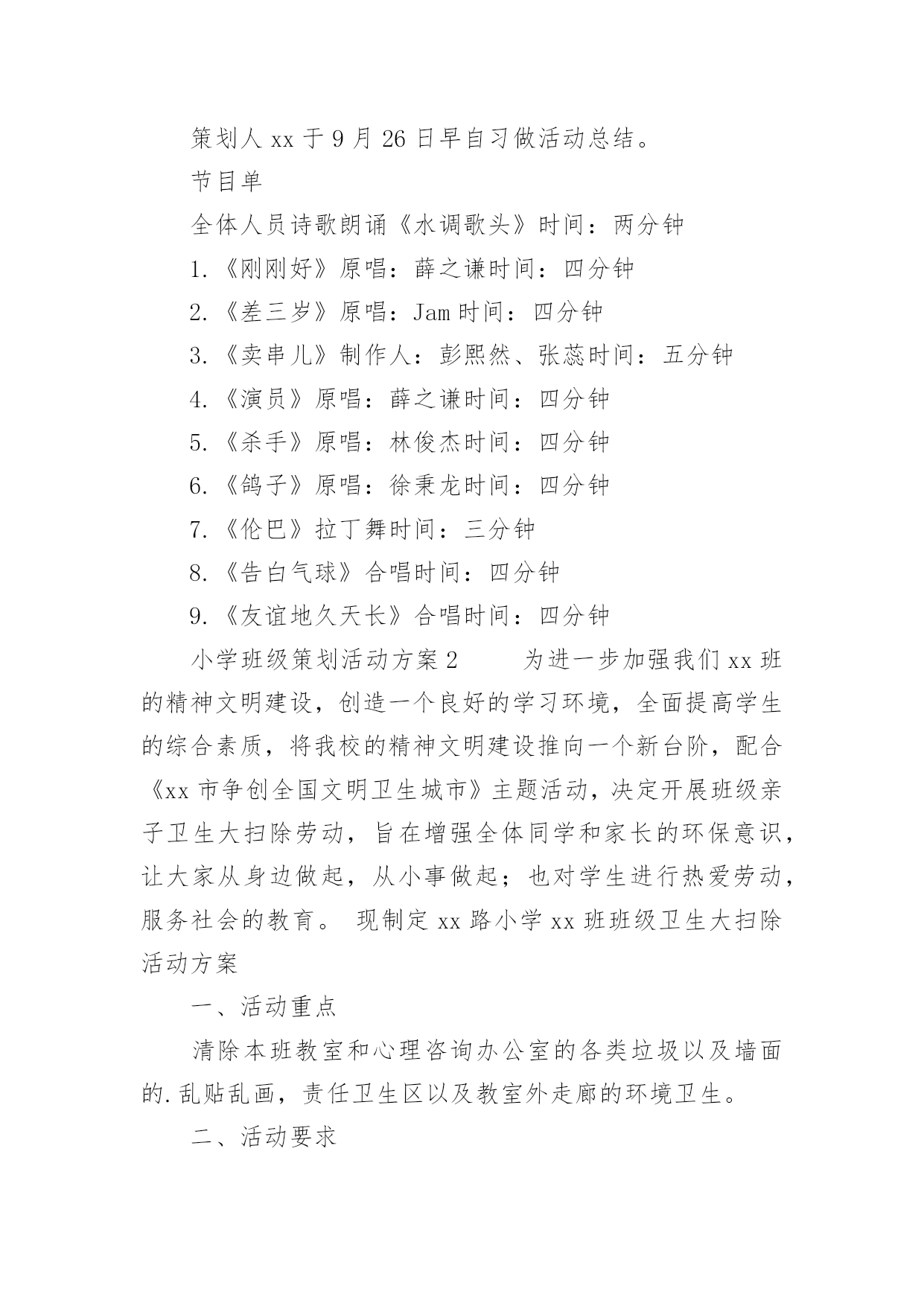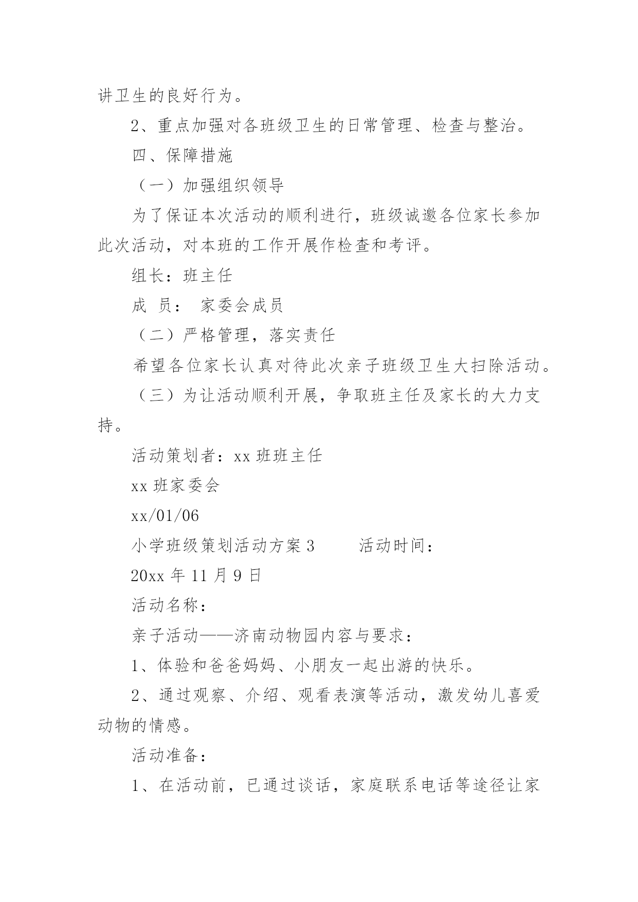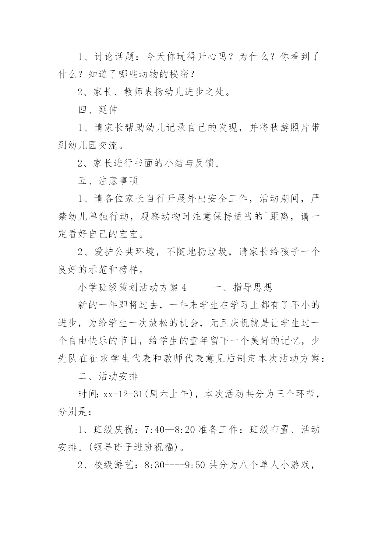 小学班级策划活动方案小学班级策划活动方案为了确保事情或工作得以顺利进行,通常需要提前准备好一份方案,方案是为某一行动所制定的具体行动实施办法细则、步骤和安排等。那么方案应该怎么制定才合适呢?以下是小编为大家收集的小学班级策划活动方案,供大家参考借鉴,希望可以帮助到有需要的朋友。小学班级策划活动方案1活动时间:20xx年9月25日12:20活动地点:普高一班教室活动策划:xx、xx活动组织单位及人员:普高一班全体师生一、活动目的中秋节是中国的'传统民俗,是团圆的日子,鉴于我班有27位同学住校,不能与家人共度中秋,故在班级举行中秋午宴,全班过一个团圆的中秋,也为师生搭建一个了解的平台,同时增进师生情谊。二、活动开展活动分为三个阶段:前期:按照策划进行活动前的准备;活动:活动后:收尾及相关工作。前期:节目报名:9月23日前,微信或者QQ联系班长龚紫洋,报节目内容(曲目;乐器),用时时间。邀请卡制作及邀请卡送达:9月25日课间操前,邀请卡负责人:xx,送达人:各科代表及xx和xx(校长、刘主任)、xx(季主任),xx(中专二的xx)。PPT及音乐制作:PPT负责人:9月24日xx,音乐制作负责人xx。9月25日7:30晨会,xx安排具体事宜。会场布置:9月25日12:00-12:20,负责人:xx,全班同学一起行动,椅子不够去普高二借(xx协调)。会场拍摄及照片视频上传:xx、xx。主持人:xx(撰写主持稿及主持)。卫生负责人:xx(安排具体打扫人员)。午饭及餐具准备:普高一班全体同学自行准备。总协调:xx。活动:会场一切准备工作就绪,12:20正式开场主持人宣布中秋午宴开始欢迎参加此次活动的老师文艺汇演及午宴主持人宣布晚会闭幕及班主任总结活动后:打扫会场,准备上课,13:40前完成。扫地:xx、xx;拖地:xx倒垃圾:xx。xx负责活动宣传,9月25日下午完成。策划人xx于9月26日早自习做活动总结。节目单全体人员诗歌朗诵《水调歌头》时间:两分钟1.《刚刚好》原唱:薛之谦时间:四分钟2.《差三岁》原唱:Jam时间:四分钟3.《卖串儿》制作人:彭熙然、张蕊时间:五分钟4.《演员》原唱:薛之谦时间:四分钟5.《杀手》原唱:林俊杰时间:四分钟6.《鸽子》原唱:徐秉龙时间:四分钟7.《伦巴》拉丁舞时间:三分钟8.《告白气球》合唱时间:四分钟9.《友谊地久天长》合唱时间:四分钟小学班级策划活动方案2为进一步加强我们xx班的精神文明建设,创造一个良好的学习环境,全面提高学生的综合素质,将我校的精神文明建设推向一个新台阶,配合《xx市争创全国文明卫生城市》主题活动,决定开展班级亲子卫生大扫除劳动,旨在增强全体同学和家长的环保意识,让大家从身边做起,从小事做起;也对学生进行热爱劳动,服务社会的教育。现制定xx路小学xx班班级卫生大扫除活动方案一、活动重点清除本班教室和心理咨询办公室的各类垃圾以及墙面的.乱贴乱画,责任卫生区以及教室外走廊的环境卫生。二、活动要求各位家长加强对班级亲子卫生大扫除工作的重视,认真组织动员班级全体学生和家长积极参加班级卫生大扫除活动,以确保我们班责任卫生区的卫生大扫除各项工作顺利进行。具体要求:1、教育学生注意安全,不在活动时打闹、玩耍、做与活动无关的事。2、要结合本班学生特点,认真调配人员,合理分工,各班将班级人数分成若干小组,每小组落实一个安全责任人。3、将班级内外所有墙面上的贴画、污染物等清除干净。4、各位家长按照指定区域做到先洒水,后扫地。5、责任卫生区墙面乱贴乱画一并清扫,做到清洁无垃圾、杂物。三、时间安排。(一)组织发动(xx年01月07日)1、家委会向全体家长进行宣传动员;2、组织动员本班级学生积极开展卫生大扫除活动。(二)贯彻实施(xx年13月9日)家委会将组织全班师生参与班级卫生大扫除活动。结束后组织检查活动结果。(三)活动延伸(xx年春期)1、将此次活动延伸到校园环境卫生的日常工作中,中队要加大宣传力度,开展形式多样的宣传活动,使每个孩子明白此次活动开展的目的和重要性,从而自觉形成讲文明、讲卫生的良好行为。2、重点加强对各班级卫生的日常管理、检查与整治。四、保障措施(一)加强组织领导为了保证本次活动的顺利进行,班级诚邀各位家长参加此次活动,对本班的工作开展作检查和考评。组长:班主任成员:家委会成员(二)严格管理,落实责任希望各位家长认真对待此次亲子班级卫生大扫除活动。(三)为让活动顺利开展,争取班主任及家长的大力支持。活动策划者:xx班班主任xx班家委会xx/01/06小学班级策划活动方案3活动时间:20xx年11月9日活动名称:亲子活动——济南动物园内容与要求:1、体验和爸爸妈妈、小朋友一起出游的快乐。2、通过观察、介绍、观看表演等活动,激发幼儿喜爱动物的情感。活动准备:1、在活动前,已通过谈话,
