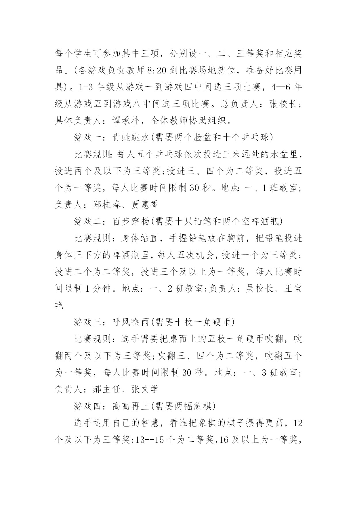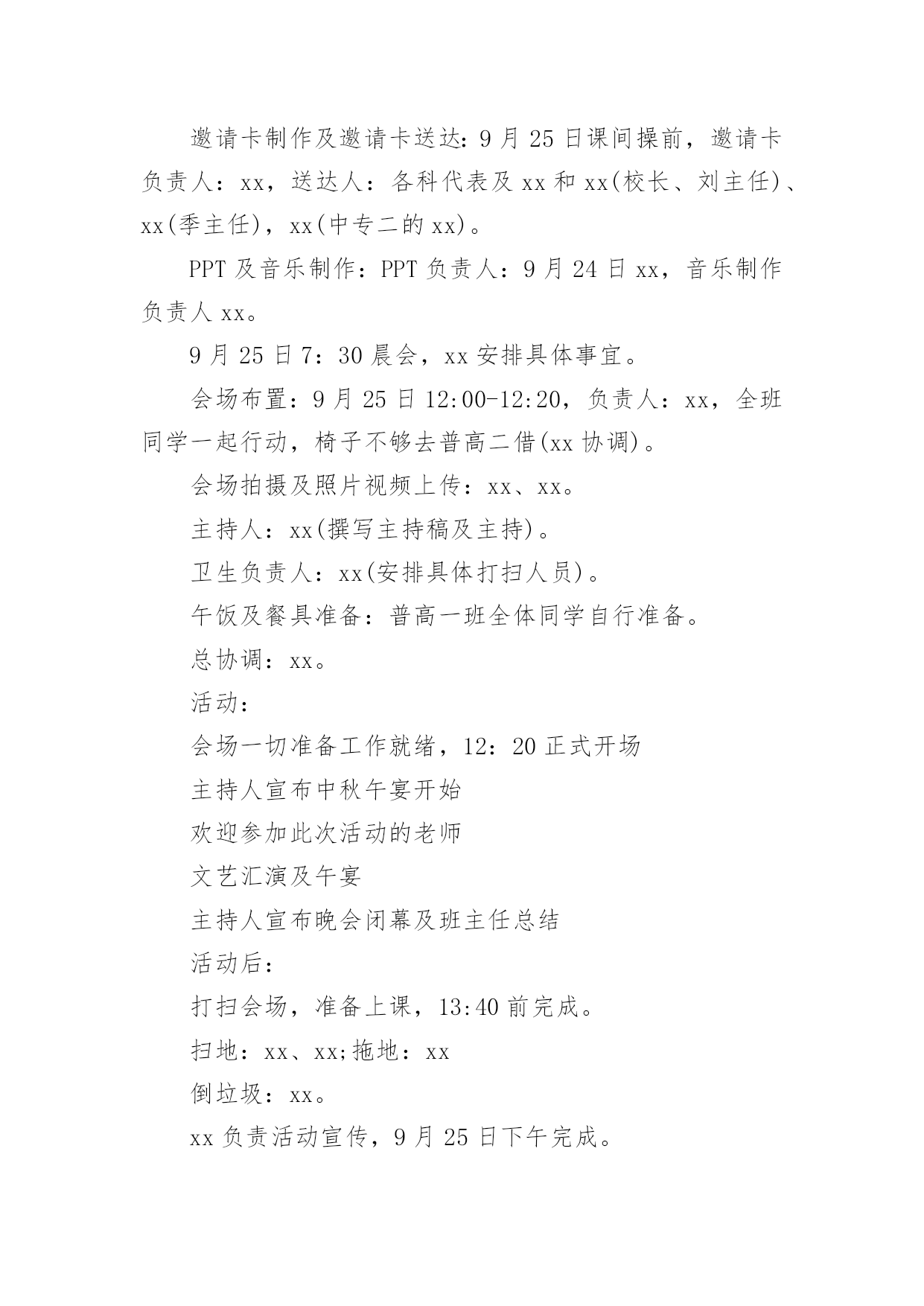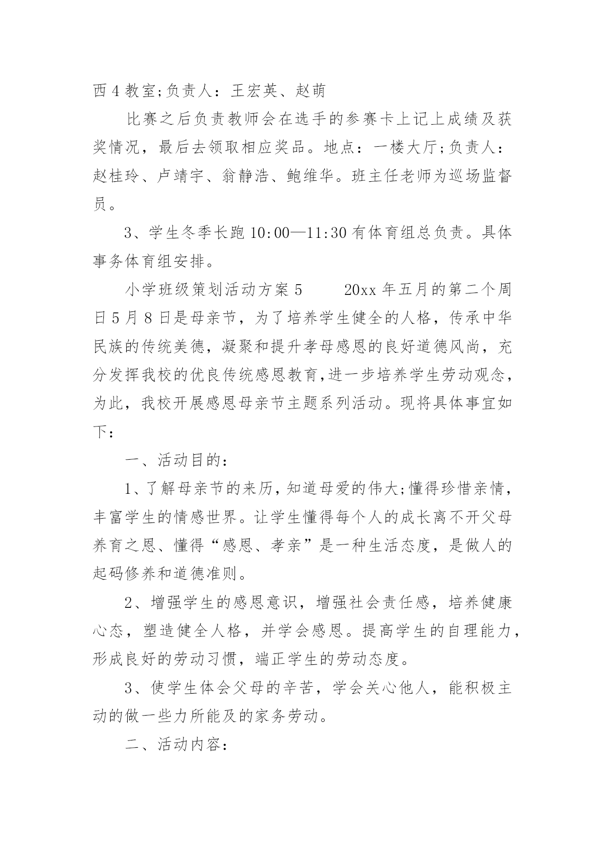 小学班级策划活动方案小学班级策划活动方案为了确保事情或工作得以顺利进行,通常需要提前准备好一份方案,方案是为某一行动所制定的具体行动实施办法细则、步骤和安排等。那么方案应该怎么制定才合适呢?以下是小编为大家收集的小学班级策划活动方案,供大家参考借鉴,希望可以帮助到有需要的朋友。小学班级策划活动方案1活动时间:20xx年9月25日12:20活动地点:普高一班教室活动策划:xx、xx活动组织单位及人员:普高一班全体师生一、活动目的中秋节是中国的'传统民俗,是团圆的日子,鉴于我班有27位同学住校,不能与家人共度中秋,故在班级举行中秋午宴,全班过一个团圆的中秋,也为师生搭建一个了解的平台,同时增进师生情谊。二、活动开展活动分为三个阶段:前期:按照策划进行活动前的准备;活动:活动后:收尾及相关工作。前期:节目报名:9月23日前,微信或者QQ联系班长龚紫洋,报节目内容(曲目;乐器),用时时间。邀请卡制作及邀请卡送达:9月25日课间操前,邀请卡负责人:xx,送达人:各科代表及xx和xx(校长、刘主任)、xx(季主任),xx(中专二的xx)。PPT及音乐制作:PPT负责人:9月24日xx,音乐制作负责人xx。9月25日7:30晨会,xx安排具体事宜。会场布置:9月25日12:00-12:20,负责人:xx,全班同学一起行动,椅子不够去普高二借(xx协调)。会场拍摄及照片视频上传:xx、xx。主持人:xx(撰写主持稿及主持)。卫生负责人:xx(安排具体打扫人员)。午饭及餐具准备:普高一班全体同学自行准备。总协调:xx。活动:会场一切准备工作就绪,12:20正式开场主持人宣布中秋午宴开始欢迎参加此次活动的老师文艺汇演及午宴主持人宣布晚会闭幕及班主任总结活动后:打扫会场,准备上课,13:40前完成。扫地:xx、xx;拖地:xx倒垃圾:xx。xx负责活动宣传,9月25日下午完成。策划人xx于9月26日早自习做活动总结。节目单全体人员诗歌朗诵《水调歌头》时间:两分钟1.《刚刚好》原唱:薛之谦时间:四分钟2.《差三岁》原唱:Jam时间:四分钟3.《卖串儿》制作人:彭熙然、张蕊时间:五分钟4.《演员》原唱:薛之谦时间:四分钟5.《杀手》原唱:林俊杰时间:四分钟6.《鸽子》原唱:徐秉龙时间:四分钟7.《伦巴》拉丁舞时间:三分钟8.《告白气球》合唱时间:四分钟9.《友谊地久天长》合唱时间:四分钟小学班级策划活动方案2为进一步加强我们xx班的精神文明建设,创造一个良好的学习环境,全面提高学生的综合素质,将我校的精神文明建设推向一个新台阶,配合《xx市争创全国文明卫生城市》主题活动,决定开展班级亲子卫生大扫除劳动,旨在增强全体同学和家长的环保意识,让大家从身边做起,从小事做起;也对学生进行热爱劳动,服务社会的教育。现制定xx路小学xx班班级卫生大扫除活动方案一、活动重点清除本班教室和心理咨询办公室的各类垃圾以及墙面的.乱贴乱画,责任卫生区以及教室外走廊的环境卫生。二、活动要求各位家长加强对班级亲子卫生大扫除工作的重视,认真组织动员班级全体学生和家长积极参加班级卫生大扫除活动,以确保我们班责任卫生区的卫生大扫除各项工作顺利进行。具体要求:1、教育学生注意安全,不在活动时打闹、玩耍、做与活动无关的事。2、要结合本班学生特点,认真调配人员,合理分工,各班将班级人数分成若干小组,每小组落实一个安全责任人。3、将班级内外所有墙面上的贴画、污染物等清除干净。4、各位家长按照指定区域做到先洒水,后扫地。5、责任卫生区墙面乱贴乱画一并清扫,做到清洁无垃圾、杂物。三、时间安排。(一)组织发动(xx年01月07日)1、家委会向全体家长进行宣传动员;2、组织动员本班级学生积极开展卫生大扫除活动。(二)贯彻实施(xx年13月9日)家委会将组织全班师生参与班级卫生大扫除活动。结束后组织检查活动结果。(三)活动延伸(xx年春期)1、将此次活动延伸到校园环境卫生的日常工作中,中队要加大宣传力度,开展形式多样的宣传活动,使每个孩子明白此次活动开展的目的和重要性,从而自觉形成讲文明、讲卫生的良好行为。2、重点加强对各班级卫生的日常管理、检查与整治。四、保障措施(一)加强组织领导为了保证本次活动的顺利进行,班级诚邀各位家长参加此次活动,对本班的工作开展作检查和考评。组长:班主任成员:家委会成员(二)严格管理,落实责任希望各位家长认真对待此次亲子班级卫生大扫除活动。(三)为让活动顺利开展,争取班主任及家长的大力支持。活动策划者:xx班班主任xx班家委会xx/01/06小学班级策划活动方案3活动时间:20xx年11月9日活动名称:亲子活动——济南动物园内容与要求:1、体验和爸爸妈妈、小朋友一起出游的快乐。2、通过观察、介绍、观看表演等活动,激发幼儿喜爱动物的情感。活动准备:1、在活动前,已通过谈话,
