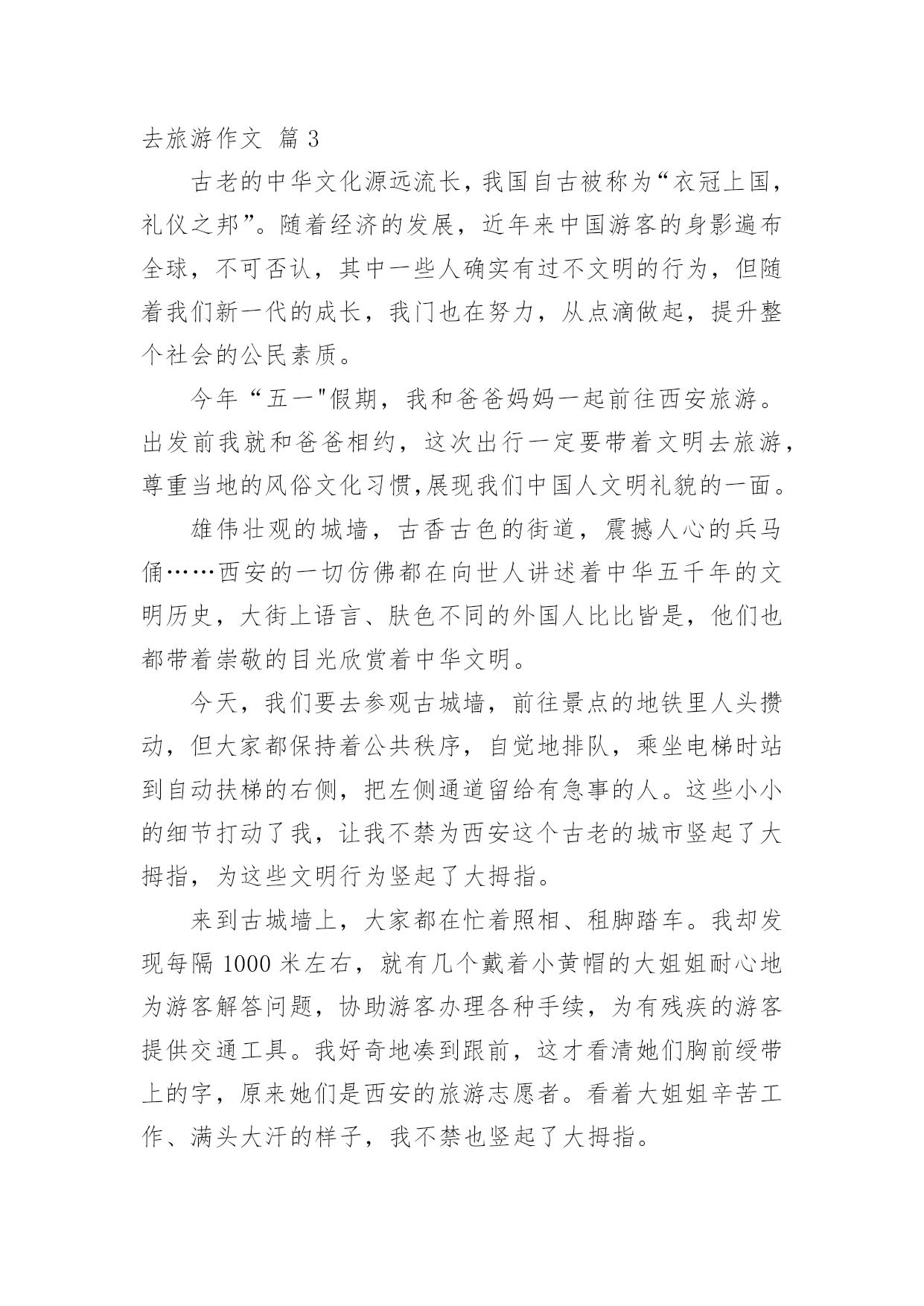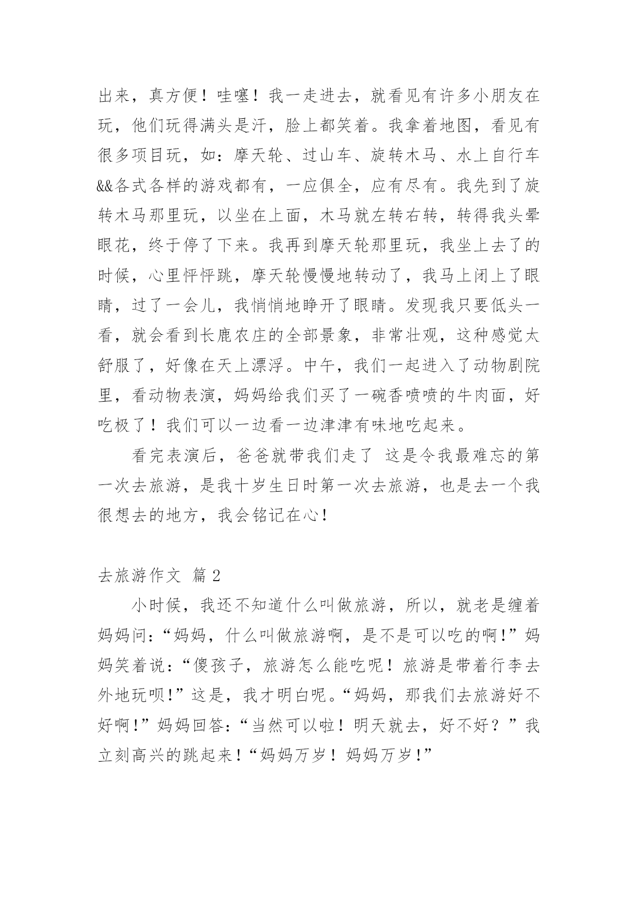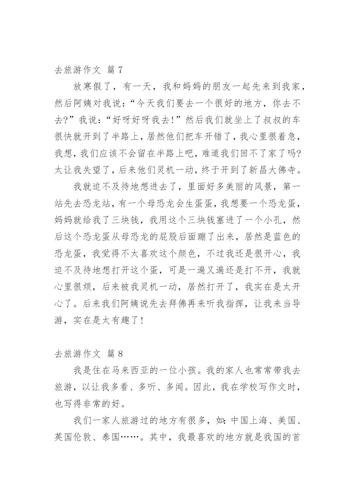 去旅游作文【精华】去旅游作文9篇在学习、工作乃至生活中,许多人都写过作文吧,作文是通过文字来表达一个主题意义的记叙方法。你所见过的作文是什么样的呢?下面是小编整理的去旅游作文9篇,欢迎大家借鉴与参考,希望对大家有所帮助。去旅游作文篇1今天是星期天,风和日丽,晴空万里。爸爸妈妈带我去旅游,这可是我第一次去旅游啊!我高兴得又蹦又跳,心里乐滋滋的。我好奇地问爸爸,说:爸爸,我们去哪儿玩呢?去到你就会知道的啦!爸爸回答道。爸爸妈妈兴高采烈地把我带到一个地方,坐上了汽车,乘了很久很久,又下车了。爸爸对我说:女儿,你仔细看看,这里是什么地方,想一下。我了一下四周,人山人海的,很热闹!想了一下,我惊讶地说:爸爸,这是不是我做梦都想去的长鹿农庄呢?是的,你知道今天是什么日子吗?今天是你的10岁生日!爸爸说完,我立刻惊呆了,没想到,我自己也不记得自己的生日,爸爸妈妈却记得,还给了我这样一个惊喜。这时,我激动的泪水夺眶而出,凝视着他们。妈妈对我说:傻孩子,别哭了。进去玩吧!我们买了票,热情的售票姐姐给了我们一张游戏地图,地图上写的很详细,什么时候有什么游戏玩都清清楚楚地写出来,真方便!哇噻!我一走进去,就看见有许多小朋友在玩,他们玩得满头是汗,脸上都笑着。我拿着地图,看见有很多项目玩,如:摩天轮、过山车、旋转木马、水上自行车&&各式各样的游戏都有,一应俱全,应有尽有。我先到了旋转木马那里玩,以坐在上面,木马就左转右转,转得我头晕眼花,终于停了下来。我再到摩天轮那里玩,我坐上去了的时候,心里怦怦跳,摩天轮慢慢地转动了,我马上闭上了眼睛,过了一会儿,我悄悄地睁开了眼睛。发现我只要低头一看,就会看到长鹿农庄的全部景象,非常壮观,这种感觉太舒服了,好像在天上漂浮。中午,我们一起进入了动物剧院里,看动物表演,妈妈给我们买了一碗香喷喷的牛肉面,好吃极了!我们可以一边看一边津津有味地吃起来。看完表演后,爸爸就带我们走了这是令我最难忘的第一次去旅游,是我十岁生日时第一次去旅游,也是去一个我很想去的地方,我会铭记在心!去旅游作文篇2小时候,我还不知道什么叫做旅游,所以,就老是缠着妈妈问:“妈妈,什么叫做旅游啊,是不是可以吃的啊!”妈妈笑着说:“傻孩子,旅游怎么能吃呢!旅游是带着行李去外地玩呗!”这是,我才明白呢。“妈妈,那我们去旅游好不好啊!”妈妈回答:“当然可以啦!明天就去,好不好?”我立刻高兴的跳起来!“妈妈万岁!妈妈万岁!”去旅游作文篇3古老的中华文化源远流长,我国自古被称为“衣冠上国,礼仪之邦”。随着经济的发展,近年来中国游客的身影遍布全球,不可否认,其中一些人确实有过不文明的行为,但随着我们新一代的成长,我门也在努力,从点滴做起,提升整个社会的公民素质。今年“五一"假期,我和爸爸妈妈一起前往西安旅游。出发前我就和爸爸相约,这次出行一定要带着文明去旅游,尊重当地的风俗文化习惯,展现我们中国人文明礼貌的一面。雄伟壮观的城墙,古香古色的街道,震撼人心的兵马俑……西安的一切仿佛都在向世人讲述着中华五千年的文明历史,大街上语言、肤色不同的外国人比比皆是,他们也都带着崇敬的目光欣赏着中华文明。今天,我们要去参观古城墙,前往景点的地铁里人头攒动,但大家都保持着公共秩序,自觉地排队,乘坐电梯时站到自动扶梯的右侧,把左侧通道留给有急事的人。这些小小的细节打动了我,让我不禁为西安这个古老的城市竖起了大拇指,为这些文明行为竖起了大拇指。来到古城墙上,大家都在忙着照相、租脚踏车。我却发现每隔1000米左右,就有几个戴着小黄帽的大姐姐耐心地为游客解答问题,协助游客办理各种手续,为有残疾的游客提供交通工具。我好奇地凑到跟前,这才看清她们胸前绶带上的字,原来她们是西安的旅游志愿者。看着大姐姐辛苦工作、满头大汗的样子,我不禁也竖起了大拇指。正在这时,一旁几名外国游客拿着旅游地图焦急地讨论起来。一位志愿者也看到了这一幕,赶紧走过去,用熟练的英语和他们交流起来。看着大姐姐友善的微笑,看着外国人满意兴奋的表情,我知道这就是我和爸爸带着文明去旅游的意义。让世界各地的游客,不仅能欣赏到我们祖国的大好河山,更能感受到我们中华民族的文明、热情和友善。结束了西安之旅,我决心一定要从我做起,像志愿者大姐姐们一样,将中华文明的火炬传递下去,让世界知道富强的中国,了解文明的中华民族。去旅游作文篇4明天就要出去旅游了,我非常兴奋,晚上竟然一点都不瞌睡。我妈妈在吃饭时,一直苦口婆心,语重心长的对我说:“王涵,你这回出去玩,千万千万要注意安全,千万不要往水深的地方去啊!而且你记好了,出去旅游可不像在家里一样,想什么时候吃东西就有的吃,所以吃饭的时候一定要吃饱,不然就只能饿着了,”妈妈顿了一下,喝了一口水,接着说,“吃饭的时候,一定要快吃、快吃、快吃,多吃、多吃、多吃。吃饱了才有力气玩。”我说道:“喳,谨遵母亲