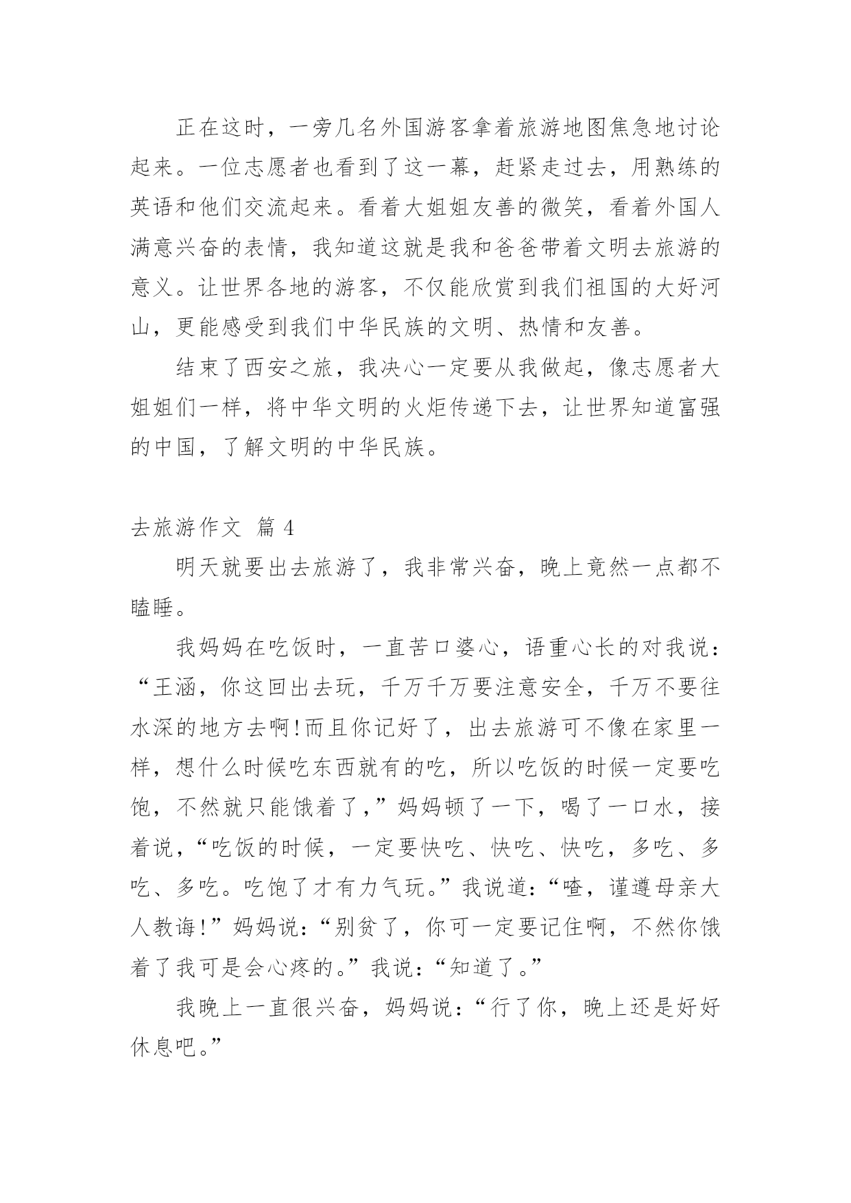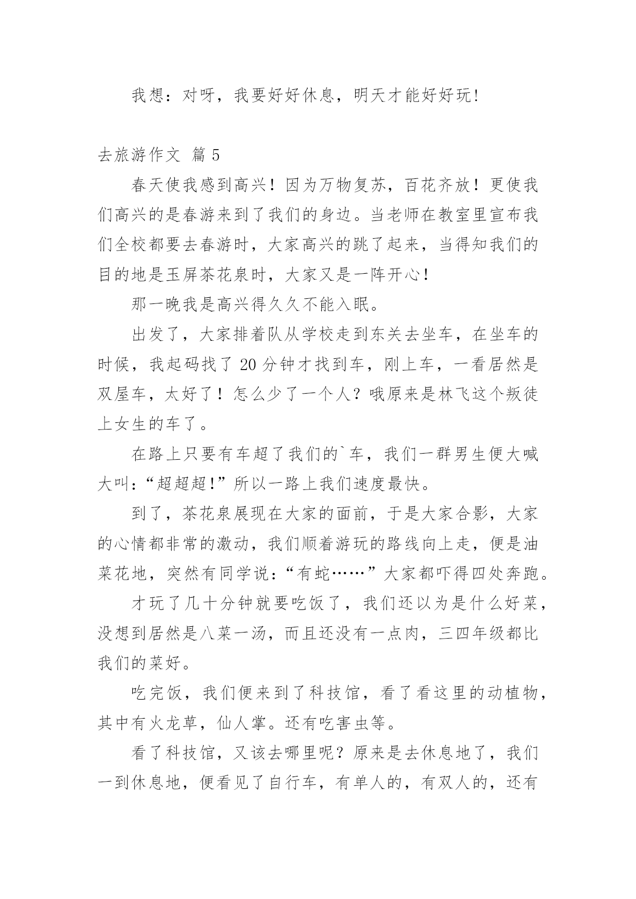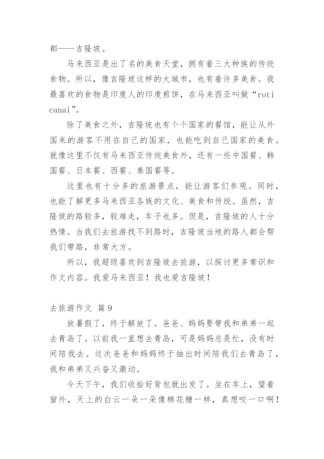去旅游作文【精华】去旅游作文9篇在学习、工作乃至生活中,许多人都写过作文吧,作文是通过文字来表达一个主题意义的记叙方法。你所见过的作文是什么样的呢?下面是小编整理的去旅游作文9篇,欢迎大家借鉴与参考,希望对大家有所帮助。去旅游作文篇1今天是星期天,风和日丽,晴空万里。爸爸妈妈带我去旅游,这可是我第一次去旅游啊!我高兴得又蹦又跳,心里乐滋滋的。我好奇地问爸爸,说:爸爸,我们去哪儿玩呢?去到你就会知道的啦!爸爸回答道。爸爸妈妈兴高采烈地把我带到一个地方,坐上了汽车,乘了很久很久,又下车了。爸爸对我说:女儿,你仔细看看,这里是什么地方,想一下。我了一下四周,人山人海的,很热闹!想了一下,我惊讶地说:爸爸,这是不是我做梦都想去的长鹿农庄呢?是的,你知道今天是什么日子吗?今天是你的10岁生日!爸爸说完,我立刻惊呆了,没想到,我自己也不记得自己的生日,爸爸妈妈却记得,还给了我这样一个惊喜。这时,我激动的泪水夺眶而出,凝视着他们。妈妈对我说:傻孩子,别哭了。进去玩吧!我们买了票,热情的售票姐姐给了我们一张游戏地图,地图上写的很详细,什么时候有什么游戏玩都清清楚楚地写出来,真方便!哇噻!我一走进去,就看见有许多小朋友在玩,他们玩得满头是汗,脸上都笑着。我拿着地图,看见有很多项目玩,如:摩天轮、过山车、旋转木马、水上自行车&&各式各样的游戏都有,一应俱全,应有尽有。我先到了旋转木马那里玩,以坐在上面,木马就左转右转,转得我头晕眼花,终于停了下来。我再到摩天轮那里玩,我坐上去了的时候,心里怦怦跳,摩天轮慢慢地转动了,我马上闭上了眼睛,过了一会儿,我悄悄地睁开了眼睛。发现我只要低头一看,就会看到长鹿农庄的全部景象,非常壮观,这种感觉太舒服了,好像在天上漂浮。中午,我们一起进入了动物剧院里,看动物表演,妈妈给我们买了一碗香喷喷的牛肉面,好吃极了!我们可以一边看一边津津有味地吃起来。看完表演后,爸爸就带我们走了这是令我最难忘的第一次去旅游,是我十岁生日时第一次去旅游,也是去一个我很想去的地方,我会铭记在心!去旅游作文篇2小时候,我还不知道什么叫做旅游,所以,就老是缠着妈妈问:“妈妈,什么叫做旅游啊,是不是可以吃的啊!”妈妈笑着说:“傻孩子,旅游怎么能吃呢!旅游是带着行李去外地玩呗!”这是,我才明白呢。“妈妈,那我们去旅游好不好啊!”妈妈回答:“当然可以啦!明天就去,好不好?”我立刻高兴的跳起来!“妈妈万岁!妈妈万岁!”去旅游作文篇3古老的中华文化源远流长,我国自古被称为“衣冠上国,礼仪之邦”。随着经济的发展,近年来中国游客的身影遍布全球,不可否认,其中一些人确实有过不文明的行为,但随着我们新一代的成长,我门也在努力,从点滴做起,提升整个社会的公民素质。今年“五一"假期,我和爸爸妈妈一起前往西安旅游。出发前我就和爸爸相约,这次出行一定要带着文明去旅游,尊重当地的风俗文化习惯,展现我们中国人文明礼貌的一面。雄伟壮观的城墙,古香古色的街道,震撼人心的兵马俑……西安的一切仿佛都在向世人讲述着中华五千年的文明历史,大街上语言、肤色不同的外国人比比皆是,他们也都带着崇敬的目光欣赏着中华文明。今天,我们要去参观古城墙,前往景点的地铁里人头攒动,但大家都保持着公共秩序,自觉地排队,乘坐电梯时站到自动扶梯的右侧,把左侧通道留给有急事的人。这些小小的细节打动了我,让我不禁为西安这个古老的城市竖起了大拇指,为这些文明行为竖起了大拇指。来到古城墙上,大家都在忙着照相、租脚踏车。我却发现每隔1000米左右,就有几个戴着小黄帽的大姐姐耐心地为游客解答问题,协助游客办理各种手续,为有残疾的游客提供交通工具。我好奇地凑到跟前,这才看清她们胸前绶带上的字,原来她们是西安的旅游志愿者。看着大姐姐辛苦工作、满头大汗的样子,我不禁也竖起了大拇指。正在这时,一旁几名外国游客拿着旅游地图焦急地讨论起来。一位志愿者也看到了这一幕,赶紧走过去,用熟练的英语和他们交流起来。看着大姐姐友善的微笑,看着外国人满意兴奋的表情,我知道这就是我和爸爸带着文明去旅游的意义。让世界各地的游客,不仅能欣赏到我们祖国的大好河山,更能感受到我们中华民族的文明、热情和友善。结束了西安之旅,我决心一定要从我做起,像志愿者大姐姐们一样,将中华文明的火炬传递下去,让世界知道富强的中国,了解文明的中华民族。去旅游作文篇4明天就要出去旅游了,我非常兴奋,晚上竟然一点都不瞌睡。我妈妈在吃饭时,一直苦口婆心,语重心长的对我说:“王涵,你这回出去玩,千万千万要注意安全,千万不要往水深的地方去啊!而且你记好了,出去旅游可不像在家里一样,想什么时候吃东西就有的吃,所以吃饭的时候一定要吃饱,不然就只能饿着了,”妈妈顿了一下,喝了一口水,接着说,“吃饭的时候,一定要快吃、快吃、快吃,多吃、多吃、多吃。吃饱了才有力气玩。”我说道:“喳,谨遵母亲