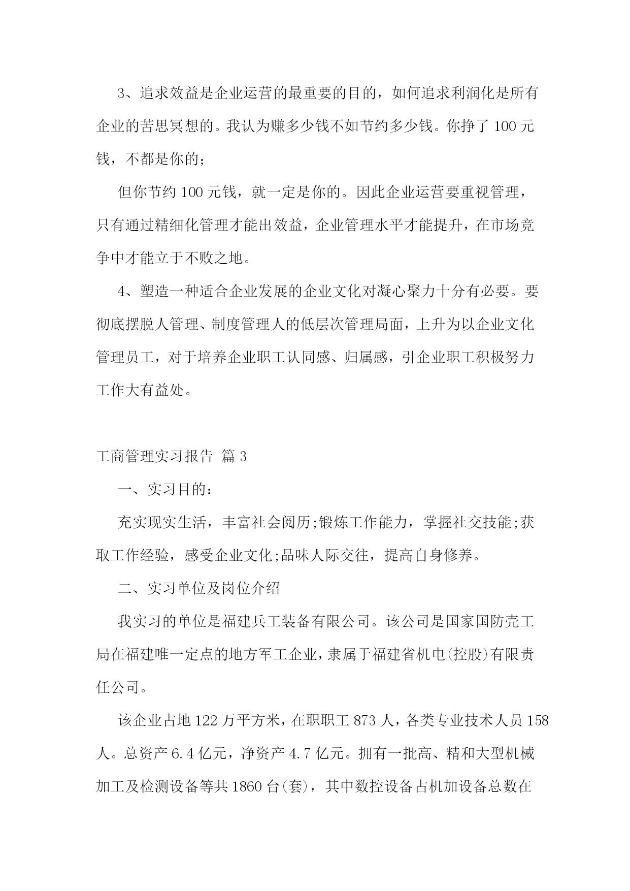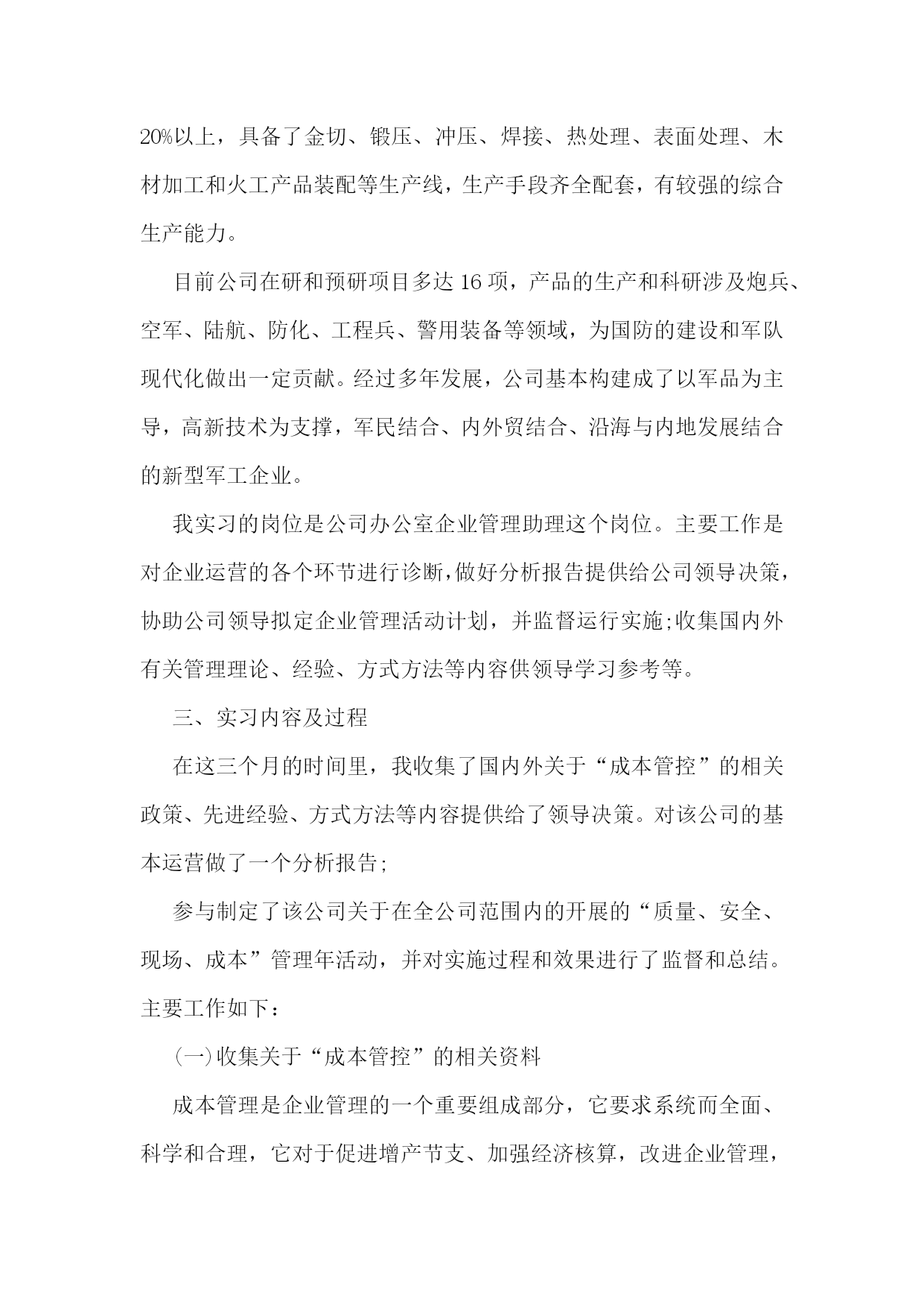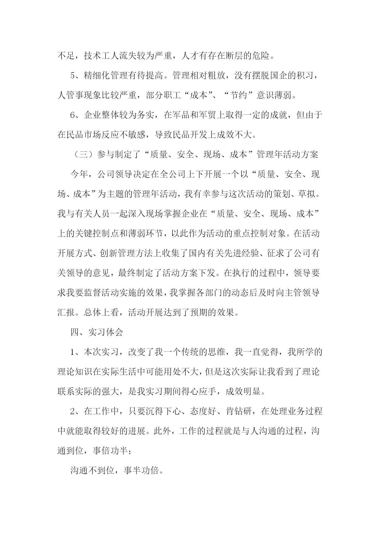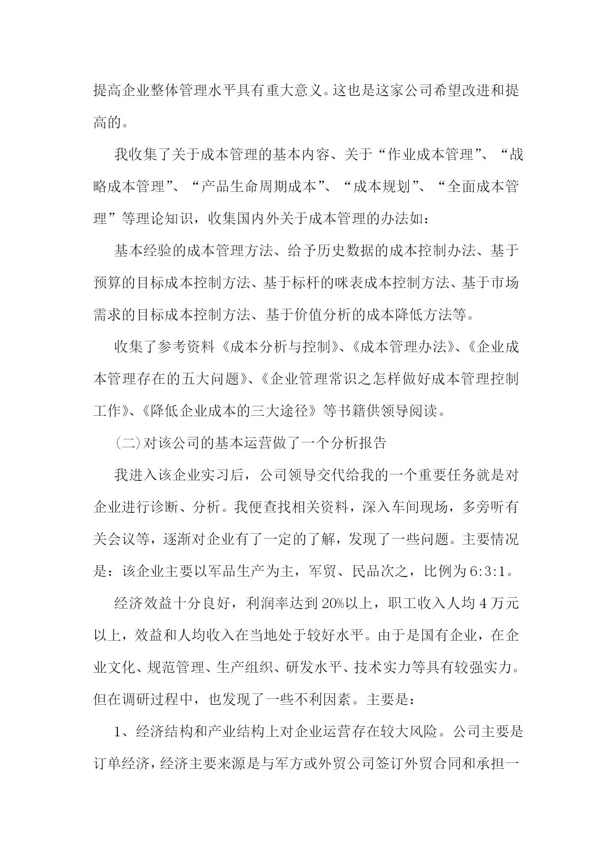 工商管理实习报告(13篇)工商管理实习报告篇2一、实习目的充实现实生活,丰富社会阅历;锻炼工作能力,掌握社交技能;获取工作经验,感受企业文化;品味人际交往,提高自身修养。二、实习单位及岗位介绍我实习的单位是xxxx有限公司。隶属于xx省xx(控股)有限责任公司。该企业占地xxx万平方米,在职职工xxx人,各类专业技术人员xxx人。总资产xx亿元,净资产xx亿元。拥有一批高、精和大型机械加工及检测设备等共xxx台(套),其中数控设备占机加设备总数在20%以上,具备了金切、锻压、冲压、焊接、热处理、表面处理、木材加工和火工产品装配等生产线,生产手段齐全配套,有较强的综合生产能力。目前公司在研和预研项目多达xx项,产品的生产和科研涉及空军、陆航、防化、工程兵、警用装备等领域,经过多年发展,公司基本构建成了以军品为主导,高新技术为支撑,军民结合、内外贸结合、沿海与内地发展结合的新型军工企业。我实习的岗位是公司办公室企业管理助理这个岗位。主要工作是对企业运营的各个环节进行诊断,做好分析报告提供给公司领导决策,协助公司领导拟定企业管理活动计划,并监督运行实施;收集国内外有关管理理论、经验、方式方法等内容供领导学习参考等。三、实习内容及过程在这三个月的时间里,我收集了国内外关于“成本管控”的相关政策、先进经验、方式方法等内容提供给了领导决策。对该公司的基本运营做了一个分析报告;参与制定了该公司关于在全公司范围内的开展的“质量、安全、现场、成本”管理年活动,并对实施过程和效果进行了监督和总结。主要工作如下:(一)收集关于“成本管控”的相关资料成本管理是企业管理的一个重要组成部分,它要求系统而全面、科学和合理,它对于促进增产节支、加强经济核算,改进企业管理,提高企业整体管理水平具有重大意义。这也是这家公司希望改进和提高的。我收集了关于成本管理的基本内容、关于“作业成本管理”、“战略成本管理”、“产品生命周期成本”、“成本规划”、“全面成本管理”等理论知识,收集国内外关于成本管理的办法如:基本经验的成本管理方法、给予历史数据的成本控制办法、基于预算的目标成本控制方法、基于标杆的咪表成本控制方法、基于市场需求的目标成本控制方法、基于价值分析的成本降低方法等。收集了参考资料《成本分析与控制》、《成本管理办法》、《企业成本管理存在的五大问题》、《企业管理常识之怎样做好成本管理控制工作》、《降低企业成本的三大途径》等书籍供领导阅读。(二)对该公司的基本运营做了一个分析报告我进入该企业实习后,公司领导交代给我的一个重要任务就是对企业进行诊断、分析。我便查找相关资料,深入车间现场,多旁听有关会议等,逐渐对企业有了一定的了解,发现了一些问题。主要情况是:该企业主要以军品生产为主,军贸、民品次之,比例为6:3:1。经济效益十分良好,利润率达到20%以上,职工收入人均4万元以上,效益和人均收入在当地处于较好水平。由于是国有企业,在企业文化、规范管理、生产组织、研发水平、技术实力等具有较强实力。但在调研过程中,也发现了一些不利因素。主要是:1、经济结构和产业结构上对企业运营存在较大风险。公司主要是订单经济,经济主要来源是与军方或外贸公司签订外贸合同和承担一些外协加工等。企业发展受政治因素影响较大。产业结构上,军品独大的局面长期难以打破,军贸和民品板块实力较弱,特别是民品,没有一个像样的项目,对企业持续健康稳定发展不利,企业面临的经营风险较大。2、对质量、安全、保密的要求过高。企业是军工企业,质量第一、安全为天、保密责任重大。任何一次事故的发生,均有可能造成企业的重大损失,严重的甚至可使企业灭亡。3、企业对科研开发、技术创新的要求很高。企业行业的特殊性质使得产品更新换代很快,只有不断研发才能永葆青春,为此,企业每年要付出高昂的技术开发费(占销售收入的5%),才能确保企业持续发展。4、企业人才结构不合理。整个企业老职工较多,青工和后备干部不足,技术工人流失较为严重,人才有存在断层的危险。5、精细化管理有待提高。管理相对粗放,没有摆脱国企的积习,人管事现象比较严重,部分职工“成本”、“节约”意识薄弱。6、企业整体较为务实,在军品和军贸上取得一定的成就,但由于在民品市场反应不敏感,导致民品开发上成效不大。(三)参与制定了“质量、安全、现场、成本”管理年活动方案今年,公司领导决定在全公司上下开展一个以“质量、安全、现场、成本”为主题的管理年活动,我有幸参与这次活动的策划、草拟。我与有关人员一起深入现场掌握企业在“质量、安全、现场、成本”上的关键控制点和薄弱环节,以此作为活动的重点控制对象。在活动开展方式、创新管理方法上收集了国内有关先进经验、征求了公司有关领导的意见,最终制定了活动方案下发。在执行的过程中,领导要求我要监督活动