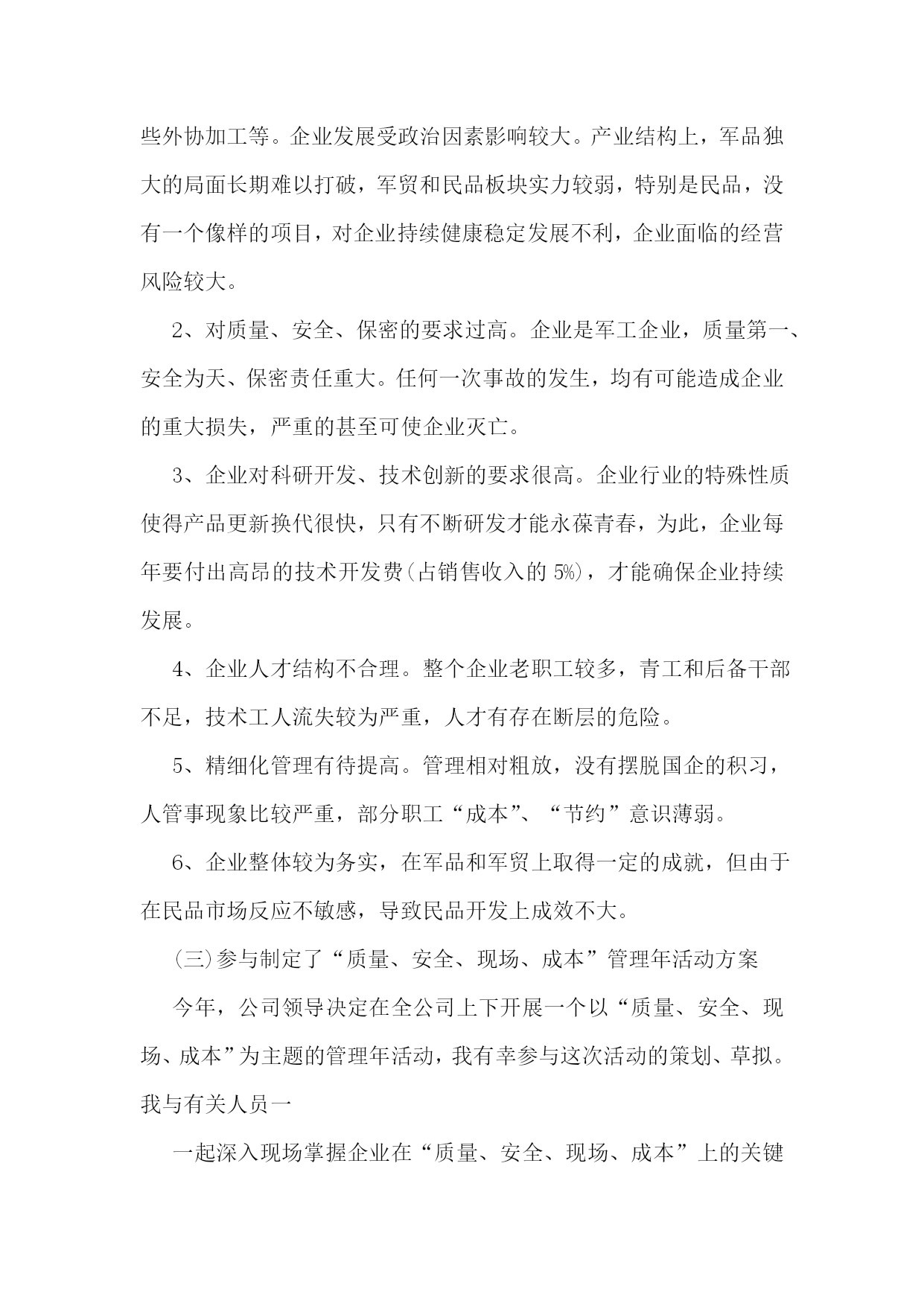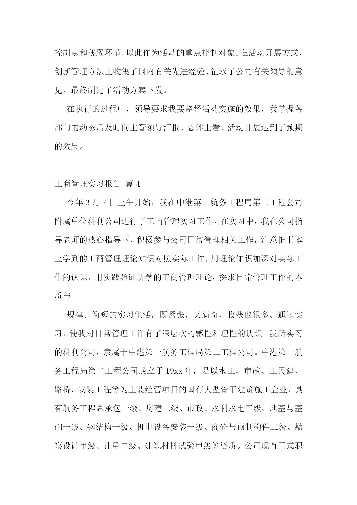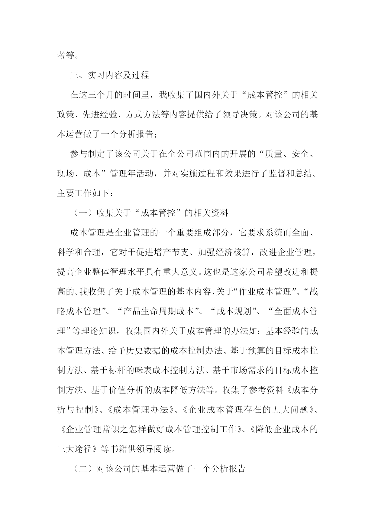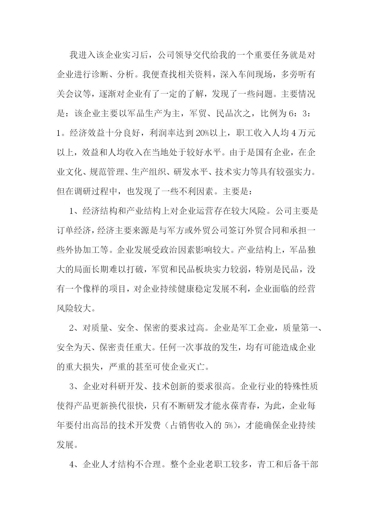 工商管理实习报告(13篇)工商管理实习报告篇2一、实习目的充实现实生活,丰富社会阅历;锻炼工作能力,掌握社交技能;获取工作经验,感受企业文化;品味人际交往,提高自身修养。二、实习单位及岗位介绍我实习的单位是xxxx有限公司。隶属于xx省xx(控股)有限责任公司。该企业占地xxx万平方米,在职职工xxx人,各类专业技术人员xxx人。总资产xx亿元,净资产xx亿元。拥有一批高、精和大型机械加工及检测设备等共xxx台(套),其中数控设备占机加设备总数在20%以上,具备了金切、锻压、冲压、焊接、热处理、表面处理、木材加工和火工产品装配等生产线,生产手段齐全配套,有较强的综合生产能力。目前公司在研和预研项目多达xx项,产品的生产和科研涉及空军、陆航、防化、工程兵、警用装备等领域,经过多年发展,公司基本构建成了以军品为主导,高新技术为支撑,军民结合、内外贸结合、沿海与内地发展结合的新型军工企业。我实习的岗位是公司办公室企业管理助理这个岗位。主要工作是对企业运营的各个环节进行诊断,做好分析报告提供给公司领导决策,协助公司领导拟定企业管理活动计划,并监督运行实施;收集国内外有关管理理论、经验、方式方法等内容供领导学习参考等。三、实习内容及过程在这三个月的时间里,我收集了国内外关于“成本管控”的相关政策、先进经验、方式方法等内容提供给了领导决策。对该公司的基本运营做了一个分析报告;参与制定了该公司关于在全公司范围内的开展的“质量、安全、现场、成本”管理年活动,并对实施过程和效果进行了监督和总结。主要工作如下:(一)收集关于“成本管控”的相关资料成本管理是企业管理的一个重要组成部分,它要求系统而全面、科学和合理,它对于促进增产节支、加强经济核算,改进企业管理,提高企业整体管理水平具有重大意义。这也是这家公司希望改进和提高的。我收集了关于成本管理的基本内容、关于“作业成本管理”、“战略成本管理”、“产品生命周期成本”、“成本规划”、“全面成本管理”等理论知识,收集国内外关于成本管理的办法如:基本经验的成本管理方法、给予历史数据的成本控制办法、基于预算的目标成本控制方法、基于标杆的咪表成本控制方法、基于市场需求的目标成本控制方法、基于价值分析的成本降低方法等。收集了参考资料《成本分析与控制》、《成本管理办法》、《企业成本管理存在的五大问题》、《企业管理常识之怎样做好成本管理控制工作》、《降低企业成本的三大途径》等书籍供领导阅读。(二)对该公司的基本运营做了一个分析报告我进入该企业实习后,公司领导交代给我的一个重要任务就是对企业进行诊断、分析。我便查找相关资料,深入车间现场,多旁听有关会议等,逐渐对企业有了一定的了解,发现了一些问题。主要情况是:该企业主要以军品生产为主,军贸、民品次之,比例为6:3:1。经济效益十分良好,利润率达到20%以上,职工收入人均4万元以上,效益和人均收入在当地处于较好水平。由于是国有企业,在企业文化、规范管理、生产组织、研发水平、技术实力等具有较强实力。但在调研过程中,也发现了一些不利因素。主要是:1、经济结构和产业结构上对企业运营存在较大风险。公司主要是订单经济,经济主要来源是与军方或外贸公司签订外贸合同和承担一些外协加工等。企业发展受政治因素影响较大。产业结构上,军品独大的局面长期难以打破,军贸和民品板块实力较弱,特别是民品,没有一个像样的项目,对企业持续健康稳定发展不利,企业面临的经营风险较大。2、对质量、安全、保密的要求过高。企业是军工企业,质量第一、安全为天、保密责任重大。任何一次事故的发生,均有可能造成企业的重大损失,严重的甚至可使企业灭亡。3、企业对科研开发、技术创新的要求很高。企业行业的特殊性质使得产品更新换代很快,只有不断研发才能永葆青春,为此,企业每年要付出高昂的技术开发费(占销售收入的5%),才能确保企业持续发展。4、企业人才结构不合理。整个企业老职工较多,青工和后备干部不足,技术工人流失较为严重,人才有存在断层的危险。5、精细化管理有待提高。管理相对粗放,没有摆脱国企的积习,人管事现象比较严重,部分职工“成本”、“节约”意识薄弱。6、企业整体较为务实,在军品和军贸上取得一定的成就,但由于在民品市场反应不敏感,导致民品开发上成效不大。(三)参与制定了“质量、安全、现场、成本”管理年活动方案今年,公司领导决定在全公司上下开展一个以“质量、安全、现场、成本”为主题的管理年活动,我有幸参与这次活动的策划、草拟。我与有关人员一起深入现场掌握企业在“质量、安全、现场、成本”上的关键控制点和薄弱环节,以此作为活动的重点控制对象。在活动开展方式、创新管理方法上收集了国内有关先进经验、征求了公司有关领导的意见,最终制定了活动方案下发。在执行的过程中,领导要求我要监督活动