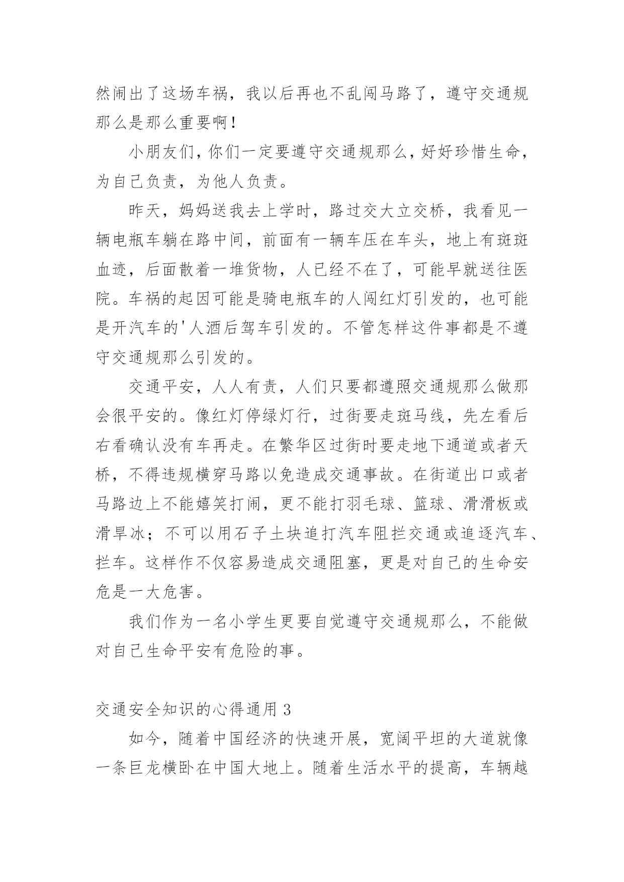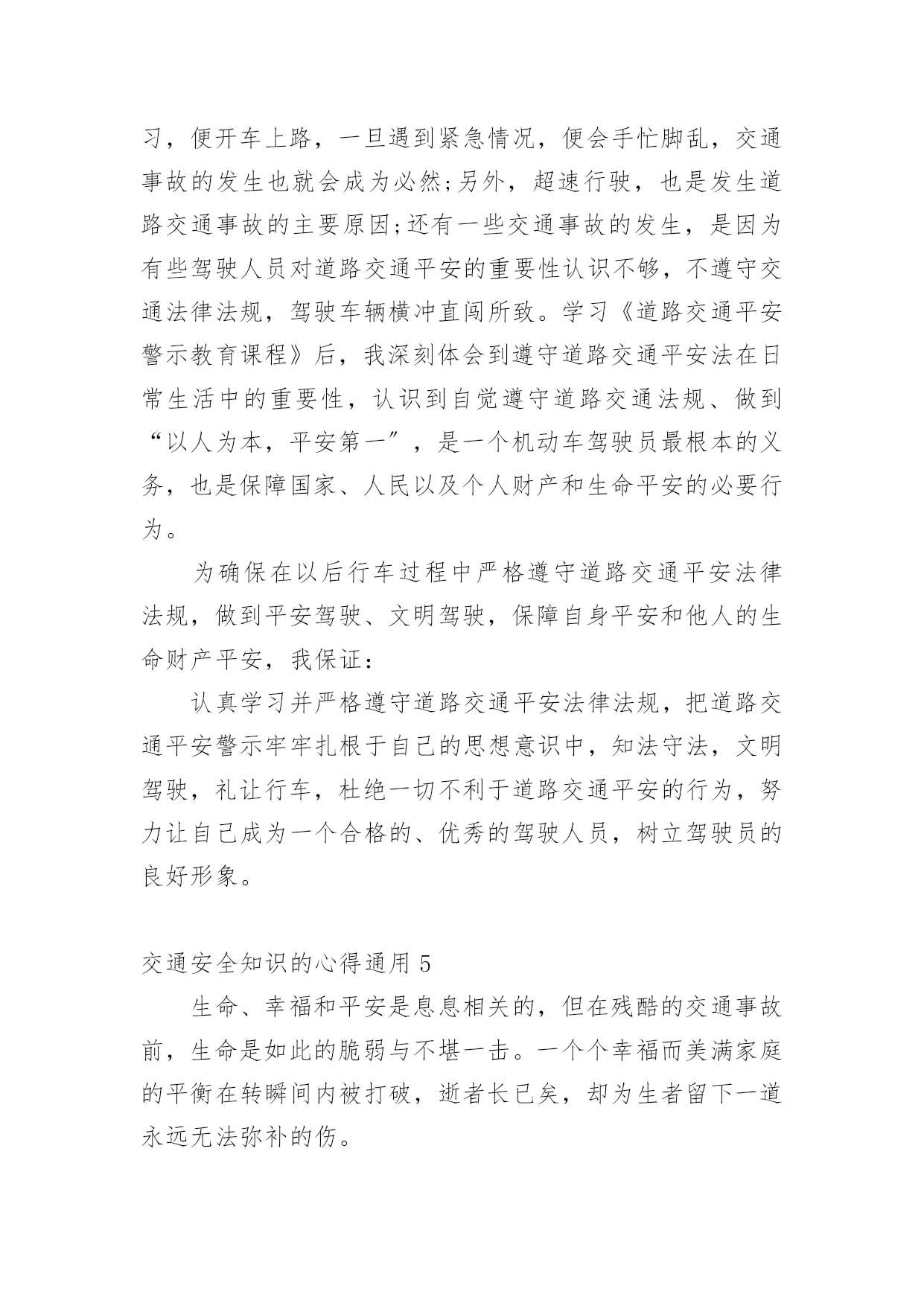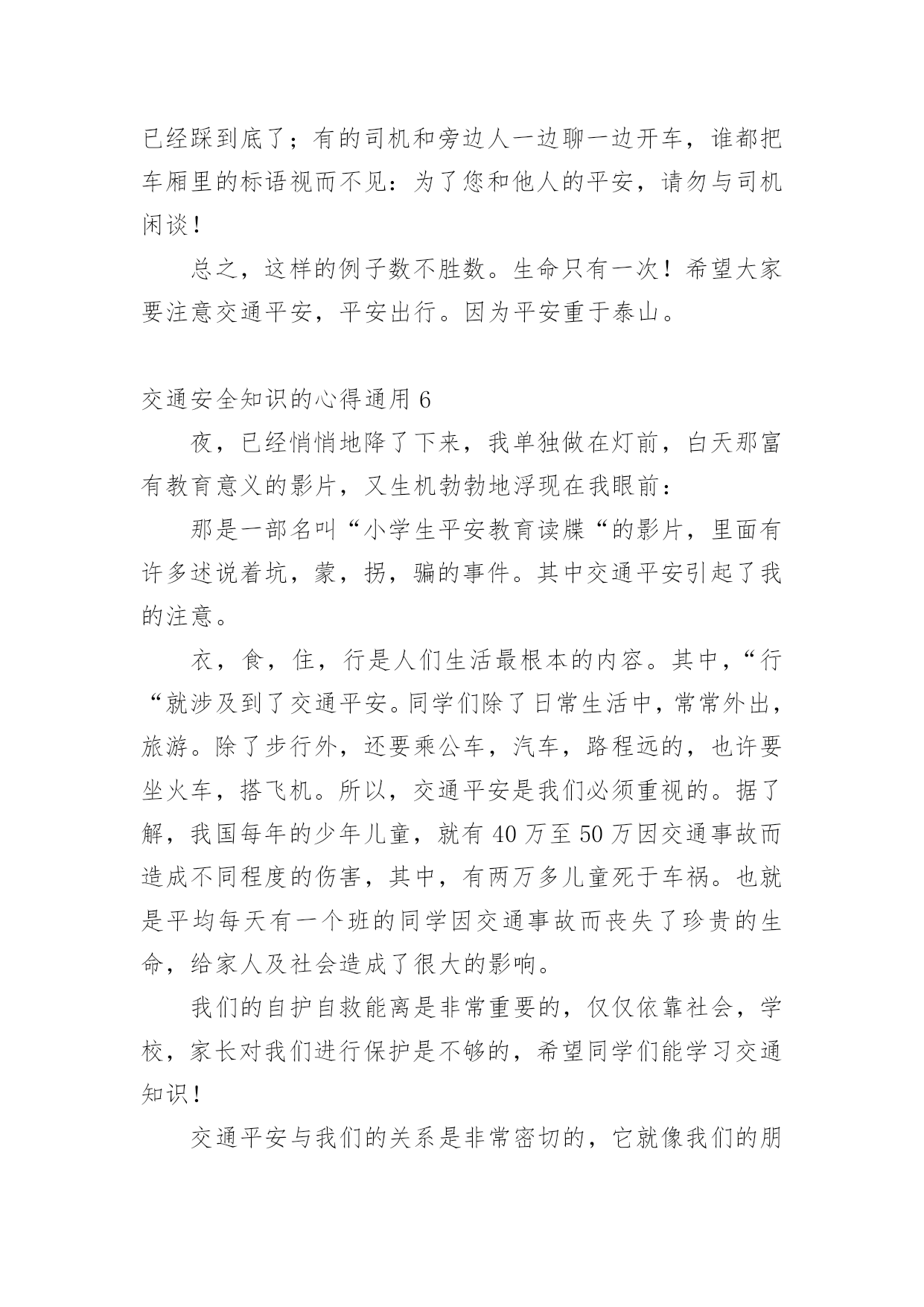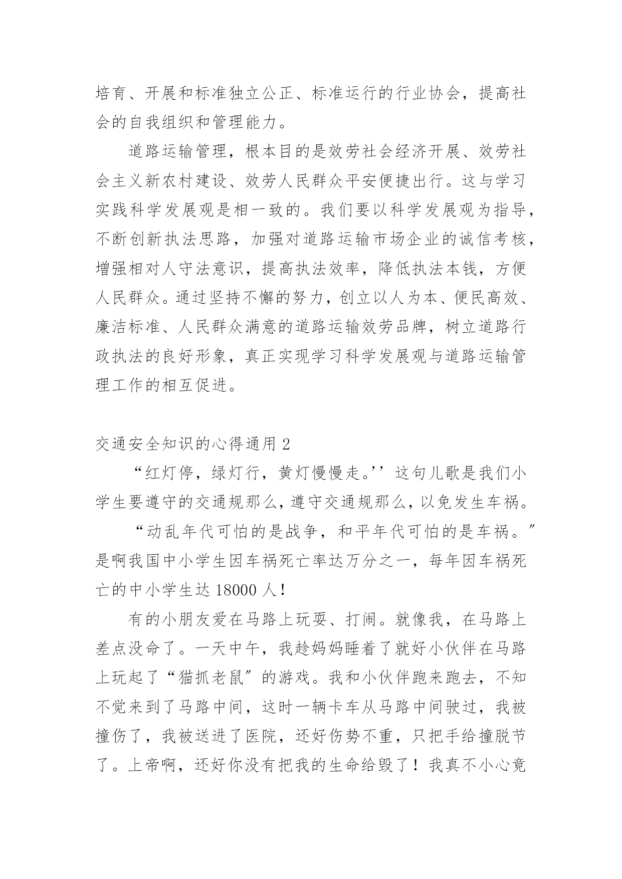 交通安全知识的心得交通安全知识的心得通用当我们对人生或者事物有了新的思考时,就很有必要写一篇心得体会,这样可以记录我们的思想活动。那么问题来了,应该如何写心得体会呢?以下是小编精心整理的交通安全知识的心得通用,仅供参考,欢迎大家阅读。交通安全知识的心得通用1开展深入学习实践科学发展观活动,是党的十七大作出的一项重大战略部署,是用中国特色社会主义理论武装全党的重大举措,是深入推进改革开放、推动经济社会又好又快开展、促进社会和谐稳定的迫切需要,是提高党的执政能力、保持和开展党的先进性的必然要求,也是当前和今后一个时期的一项重要政治任务。这对道路运输这个根底性产业提出了新的目标和要求,也带来了新的开展机遇和挑战。通过县交通局党委召开的开展深入学习实践科学发展观活动发动会及机关党总支的集中学习和自学,在今后的工作中,就如何结合行业实际贯彻好、落实好科学发展观,做好效劳,实现我县道路运输业又好又快开展,下面自已有以下几点学习体会:一、充分掌握科学发展观的科学内涵、精神实质和根本要求科学发展观紧紧围绕开展中国特色社会主义这个主题,深入分析了我国开展的阶段性特征,准确把握了我国国情和开展趋势,明确答复了我国经济建设、政治建设、文化建设、社会建设、生态文明建设以及党的建设面临的一系列重大问题,是我们建设中国特色社会主义必须长期坚持和贯彻的.重大战略思想。科学发展观在实践根底上创立,又在实践中不断丰富和开展,内涵不断深化,为我国经济社会开展指明了方向,我国社会主义实践充分显示了科学发展观的强大威力。科学发展观反映了我党“权为民所用、情为民所系、利为民所谋〞的本质要求,代表了人民群众的根本利益,揭示了新世纪、新阶段人民群众过上幸福美好生活的新期待,一经提出,就很快为全党、全军、全国各族人民所认同,成为改造客观世界和主观世界的强大思想武器。二、提高学习贯彻落实科学发展观的自觉性和坚决性从根本上讲,加强党的执政能力建设首先是要提高全体党员,特别是各级领导干部的素质。党员和干部素质如何,最终决定党执政能力的上下。要使全省运管行业各级领导干部牢固树立科学发展观,增强执政能力,首先就是要认真学习科学发展观,更新开展观念。实现道路运输业又好又快开展,需要我们按照科学发展观的要求,准确把握开展规律,制定符合我省行业实际的政策;需要我们不断扩大运输市场的规模,确保行业稳定有序开展;需要我们继续加强节能减排工作,打造能源资源节约和环境友好型行业;需要我们积极协调,推进城乡客运一体化进程,促进区域、城乡协调开展。坚持贯彻落实科学发展观就必须在工作中时刻表达科学开展的内涵,将科学发展观表达行业管理的各个方面、各个环节。把开展深入学习实践科学发展观活动与推进当前工作有机结合起来,做到“两不误、两促进〞。学习和实践的统一,是学习实践科学发展观的根本要求。明确了学习实践活动要以创立“六型〞(学习型、效劳型、创新型、效能型、廉洁型、活力型)为载体。对道路运输管理部门而言,深入贯彻科学发展观,就是要着力解决影响和制约道路运输科学开展以及群众反映强烈的突出问题,着力构建起充满活力、富有效率、更加协调、有利于科学开展的体制机制,全面提高道路道路运输管理科学开展能力。当前,税费制度改革,使交通道路运输管理以及对市场的监管都发生了重大变化。我们要把科学发展观落实到实践,开展以执法为民、公平正义、效劳大局为主要内容的社会主义法治理念教育,引导广阔执法人员树立正确的执法动机和目的。我们要牢固树立正确的执法理念,要以保护和发挥道路运输根底设施功能为目标,以效劳人民群众平安便捷出行为目的,以开展壮大道路运输效劳产业为己任,严格依法行政,标准执法行为。按照“有所为有所不为〞的要求,不断创新管理理念,把开展作为道路运输管理的第一导向,把效劳作为道路运输管理的根本宗旨,把执法为民作为道路运输管理的根本目的,在道路运输执法中把该管的一定管好,切实把行政管理职能转到行业监督、市场监管、公共效劳上来,培育、开展和标准独立公正、标准运行的行业协会,提高社会的自我组织和管理能力。道路运输管理,根本目的是效劳社会经济开展、效劳社会主义新农村建设、效劳人民群众平安便捷出行。这与学习实践科学发展观是相一致的。我们要以科学发展观为指导,不断创新执法思路,加强对道路运输市场企业的诚信考核,增强相对人守法意识,提高执法效率,降低执法本钱,方便人民群众。通过坚持不懈的努力,创立以人为本、便民高效、廉洁标准、人民群众满意的道路运输效劳品牌,树立道路行政执法的良好形象,真正实现学习科学发展观与道路运输管理工作的相互促进。交通安全知识的心得通用2“红灯停,绿灯行,黄灯慢慢走。’’这句儿歌是我们小学生要遵守的交通规那么,遵守交通规那么,以免发生车祸。“动乱年代可怕的是战争,和平年代可怕的是车祸。〞是啊我国中小学生因车祸死亡率达