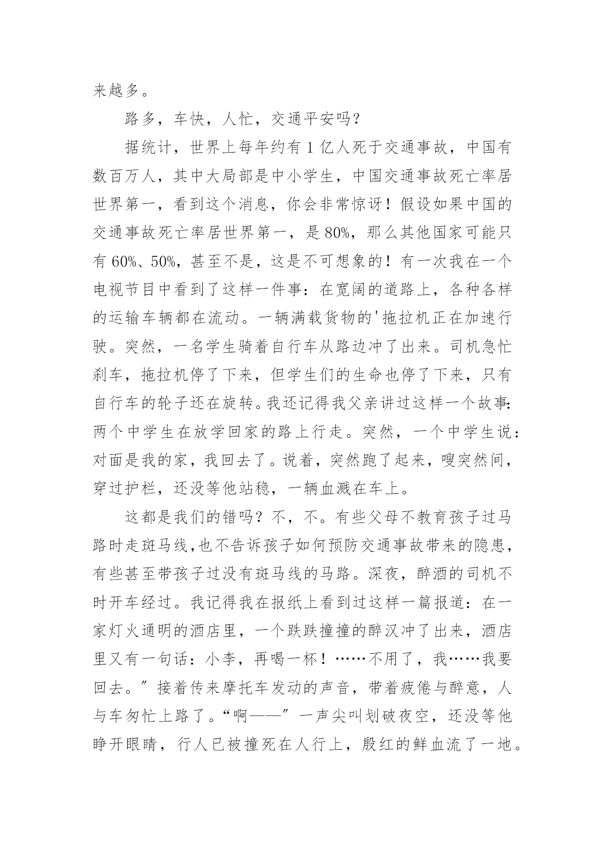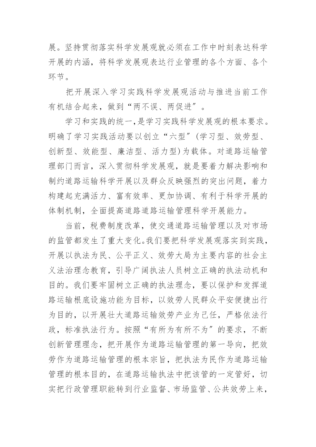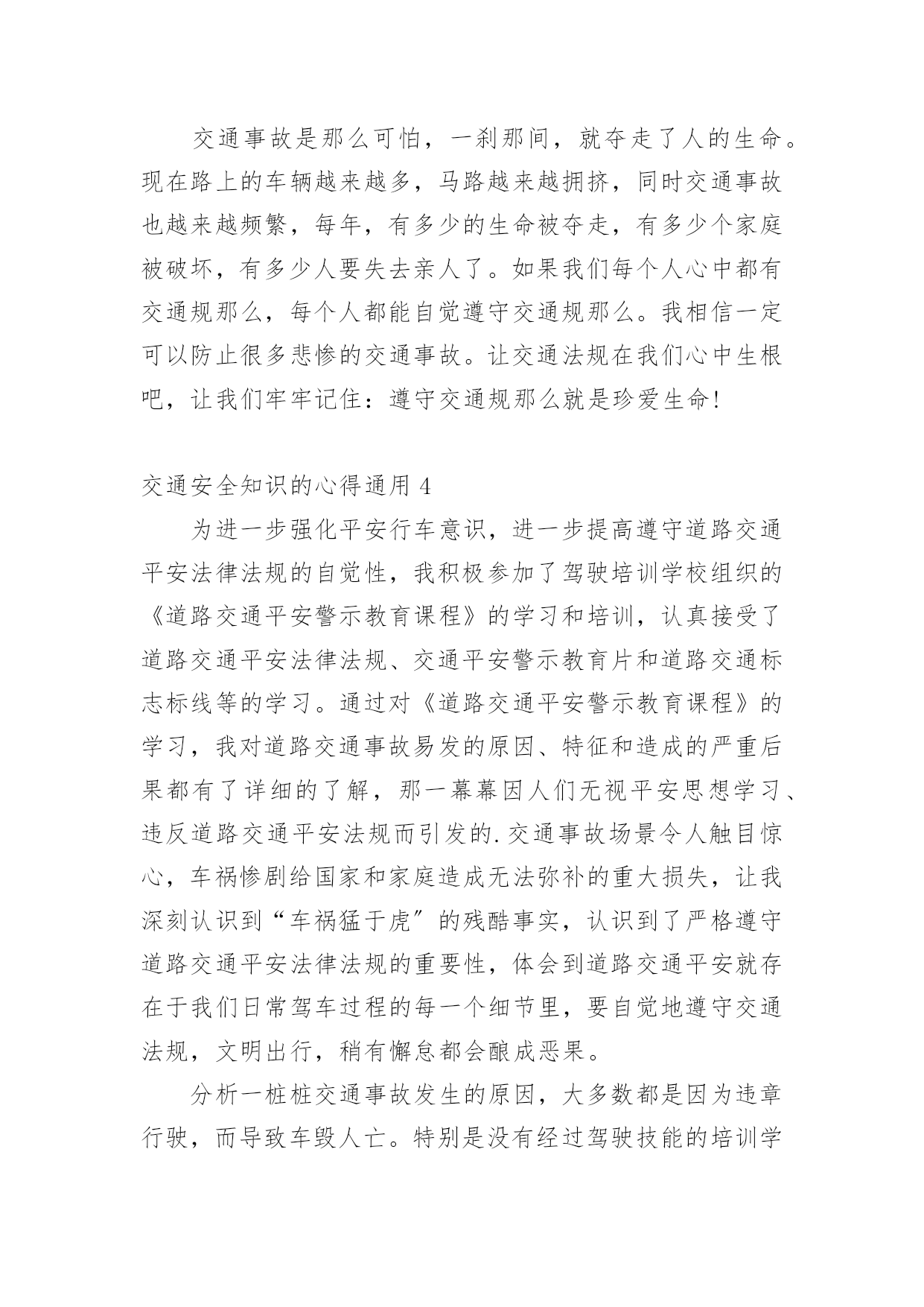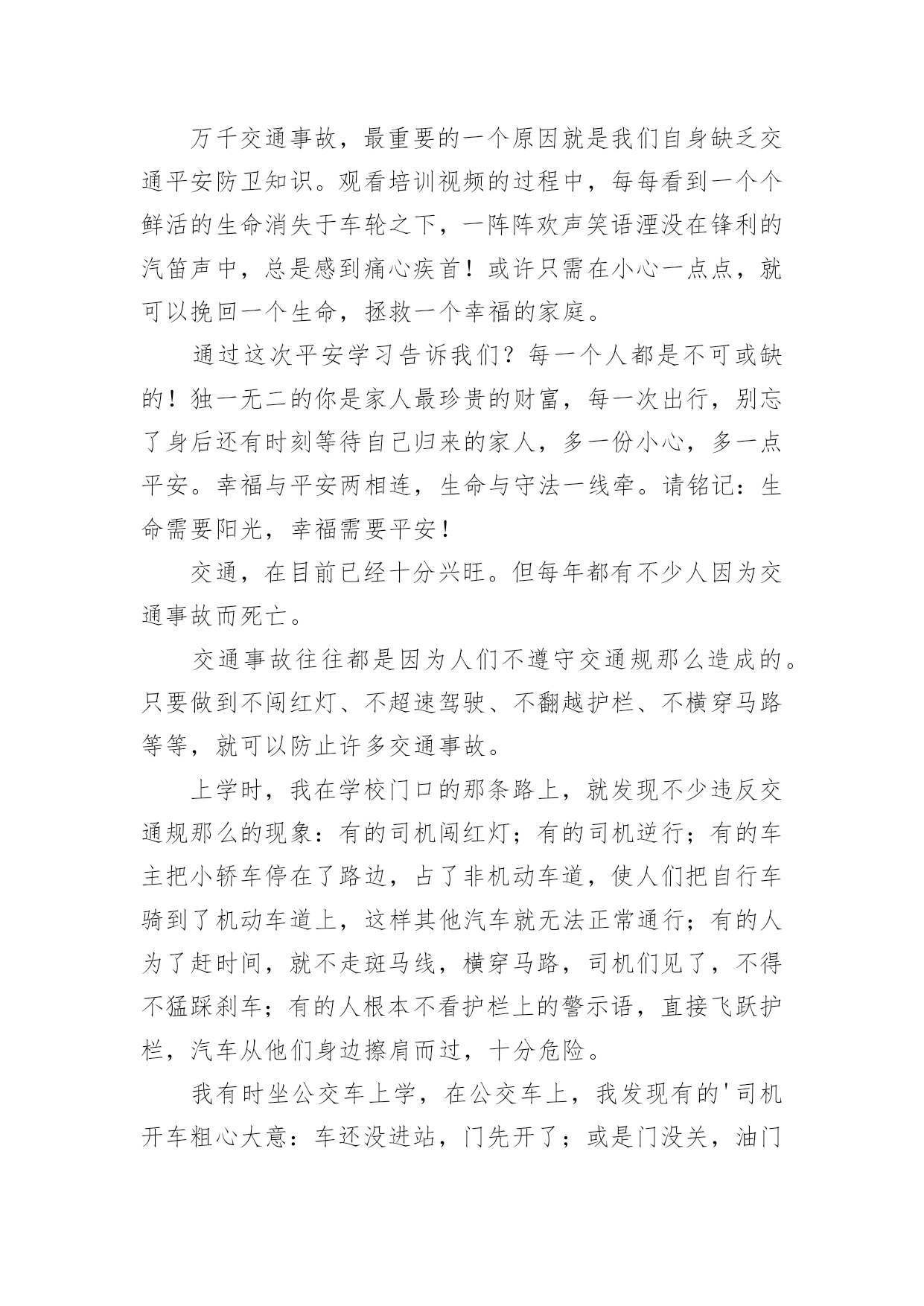 交通安全知识的心得交通安全知识的心得通用当我们对人生或者事物有了新的思考时,就很有必要写一篇心得体会,这样可以记录我们的思想活动。那么问题来了,应该如何写心得体会呢?以下是小编精心整理的交通安全知识的心得通用,仅供参考,欢迎大家阅读。交通安全知识的心得通用1开展深入学习实践科学发展观活动,是党的十七大作出的一项重大战略部署,是用中国特色社会主义理论武装全党的重大举措,是深入推进改革开放、推动经济社会又好又快开展、促进社会和谐稳定的迫切需要,是提高党的执政能力、保持和开展党的先进性的必然要求,也是当前和今后一个时期的一项重要政治任务。这对道路运输这个根底性产业提出了新的目标和要求,也带来了新的开展机遇和挑战。通过县交通局党委召开的开展深入学习实践科学发展观活动发动会及机关党总支的集中学习和自学,在今后的工作中,就如何结合行业实际贯彻好、落实好科学发展观,做好效劳,实现我县道路运输业又好又快开展,下面自已有以下几点学习体会:一、充分掌握科学发展观的科学内涵、精神实质和根本要求科学发展观紧紧围绕开展中国特色社会主义这个主题,深入分析了我国开展的阶段性特征,准确把握了我国国情和开展趋势,明确答复了我国经济建设、政治建设、文化建设、社会建设、生态文明建设以及党的建设面临的一系列重大问题,是我们建设中国特色社会主义必须长期坚持和贯彻的.重大战略思想。科学发展观在实践根底上创立,又在实践中不断丰富和开展,内涵不断深化,为我国经济社会开展指明了方向,我国社会主义实践充分显示了科学发展观的强大威力。科学发展观反映了我党“权为民所用、情为民所系、利为民所谋〞的本质要求,代表了人民群众的根本利益,揭示了新世纪、新阶段人民群众过上幸福美好生活的新期待,一经提出,就很快为全党、全军、全国各族人民所认同,成为改造客观世界和主观世界的强大思想武器。二、提高学习贯彻落实科学发展观的自觉性和坚决性从根本上讲,加强党的执政能力建设首先是要提高全体党员,特别是各级领导干部的素质。党员和干部素质如何,最终决定党执政能力的上下。要使全省运管行业各级领导干部牢固树立科学发展观,增强执政能力,首先就是要认真学习科学发展观,更新开展观念。实现道路运输业又好又快开展,需要我们按照科学发展观的要求,准确把握开展规律,制定符合我省行业实际的政策;需要我们不断扩大运输市场的规模,确保行业稳定有序开展;需要我们继续加强节能减排工作,打造能源资源节约和环境友好型行业;需要我们积极协调,推进城乡客运一体化进程,促进区域、城乡协调开展。坚持贯彻落实科学发展观就必须在工作中时刻表达科学开展的内涵,将科学发展观表达行业管理的各个方面、各个环节。把开展深入学习实践科学发展观活动与推进当前工作有机结合起来,做到“两不误、两促进〞。学习和实践的统一,是学习实践科学发展观的根本要求。明确了学习实践活动要以创立“六型〞(学习型、效劳型、创新型、效能型、廉洁型、活力型)为载体。对道路运输管理部门而言,深入贯彻科学发展观,就是要着力解决影响和制约道路运输科学开展以及群众反映强烈的突出问题,着力构建起充满活力、富有效率、更加协调、有利于科学开展的体制机制,全面提高道路道路运输管理科学开展能力。当前,税费制度改革,使交通道路运输管理以及对市场的监管都发生了重大变化。我们要把科学发展观落实到实践,开展以执法为民、公平正义、效劳大局为主要内容的社会主义法治理念教育,引导广阔执法人员树立正确的执法动机和目的。我们要牢固树立正确的执法理念,要以保护和发挥道路运输根底设施功能为目标,以效劳人民群众平安便捷出行为目的,以开展壮大道路运输效劳产业为己任,严格依法行政,标准执法行为。按照“有所为有所不为〞的要求,不断创新管理理念,把开展作为道路运输管理的第一导向,把效劳作为道路运输管理的根本宗旨,把执法为民作为道路运输管理的根本目的,在道路运输执法中把该管的一定管好,切实把行政管理职能转到行业监督、市场监管、公共效劳上来,培育、开展和标准独立公正、标准运行的行业协会,提高社会的自我组织和管理能力。道路运输管理,根本目的是效劳社会经济开展、效劳社会主义新农村建设、效劳人民群众平安便捷出行。这与学习实践科学发展观是相一致的。我们要以科学发展观为指导,不断创新执法思路,加强对道路运输市场企业的诚信考核,增强相对人守法意识,提高执法效率,降低执法本钱,方便人民群众。通过坚持不懈的努力,创立以人为本、便民高效、廉洁标准、人民群众满意的道路运输效劳品牌,树立道路行政执法的良好形象,真正实现学习科学发展观与道路运输管理工作的相互促进。交通安全知识的心得通用2“红灯停,绿灯行,黄灯慢慢走。’’这句儿歌是我们小学生要遵守的交通规那么,遵守交通规那么,以免发生车祸。“动乱年代可怕的是战争,和平年代可怕的是车祸。〞是啊我国中小学生因车祸死亡率达