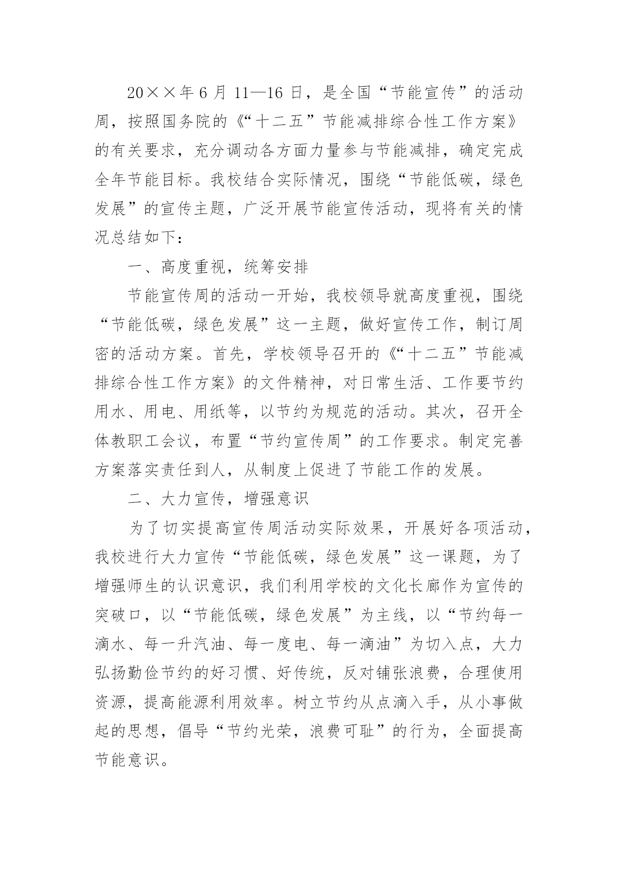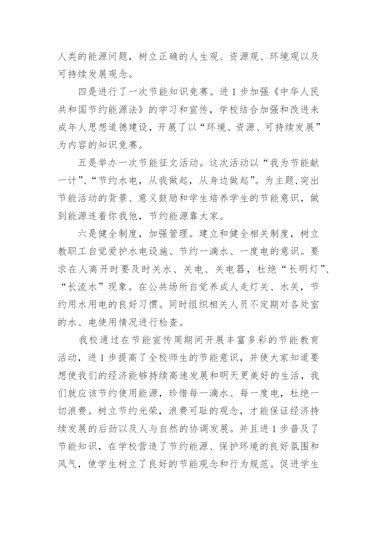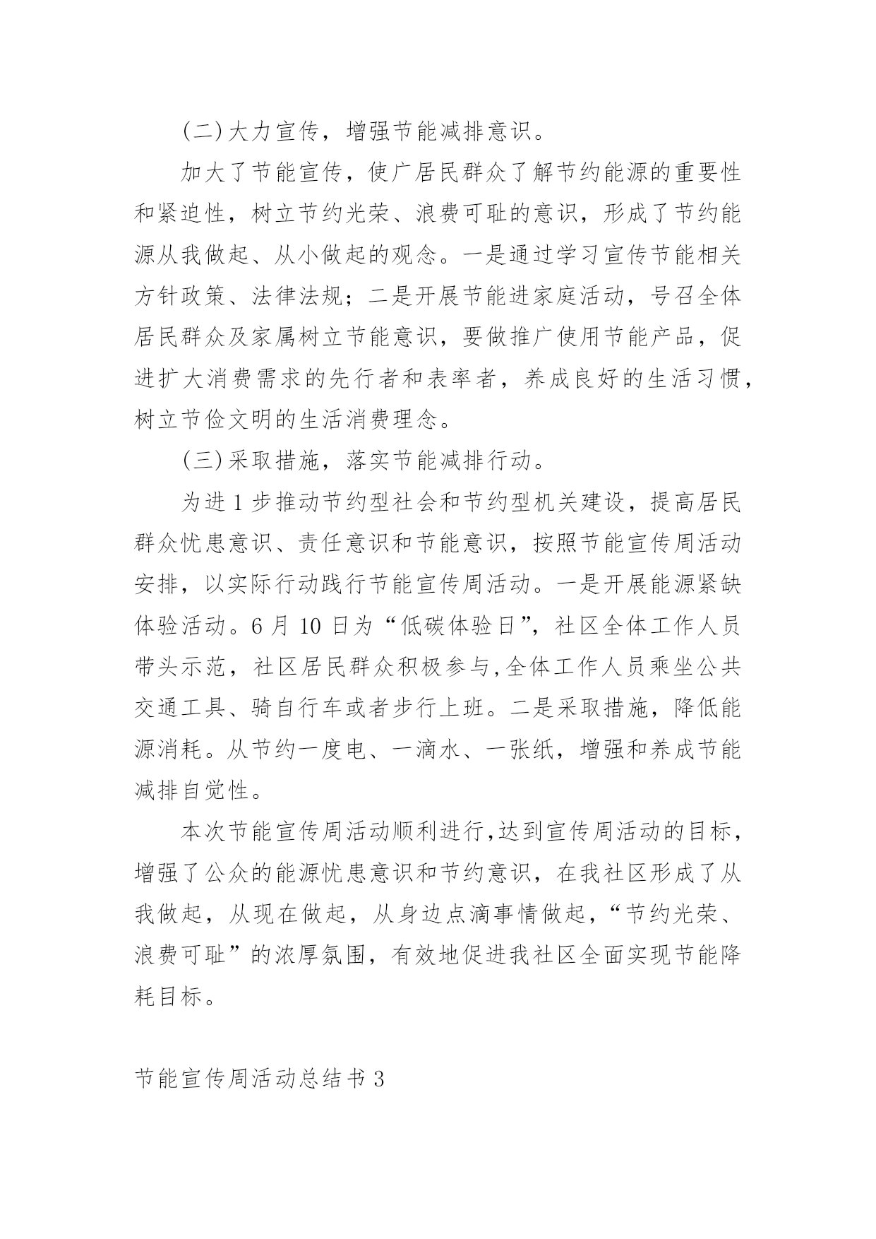 节能宣传周活动总结书节能宣传周活动总结书节能宣传周活动总结书1按照市节能减排工作领导小组办公室文件要求,我校紧紧围绕“节能低碳绿色发展”这一主题,对今年的宣传周活动进行了安排部署,既营造了良好的氛围,又取得了较好的效果。现将我校节能宣传周活动总结如下。一、加强组织领导,明确工作职责为确保宣传周活动的顺利开展,成立了以主要领导为组长,分管领导为副组长,各班班主任为成员的宣传活动领导小组,加强对宣传周活动的监督、指导,为宣传活动提供强有力的组织保障。二、开展宣传教育,树立绿色理念1、召开全校师生大会,做“节能低碳绿色发展”的主题报告,在全校师生中进行大力宣传。2、在学校醒目处悬挂宣传横幅,营造“节能低碳、绿色发展”的氛围。3、印发《节能减排绿色生活》宣传资料,对学生进行节能、节水、节粮等方面的教育,提高学生的节能、节水、节电、节粮的意识,培养他们养成节约的良好习惯。三、举行主题活动,开展绿色行动。1、充分利用黑板报、宣传栏等进行节能减排教育活动,宣传保护环境、节能减排、抵制白色污染的重要意义,各个班级开展一次节能减排的主题班会。2、开展“节约进家庭”教育活动,通过“教育1个学生,带动1个家庭,拉动1个社组”的方式,倡导师生从“关闭电器的同时拔掉插头、将灯泡换成节能灯泡、减少使用塑料袋”3个生活细节做起,在全校营造节能减排的良好氛围。3、教职工以身作则,做节能减排先行者。教职工要做学生的榜样,从细小处入手,整合办公资源。管理、使用好现有的办学、办公设备,抓好设施、设备的节能,节约办公、教学用品,减少办公、教学用品消耗。办公规定纸张尽量双面打印,单面使用的留给下次重复使用等。四、从身边做起,从点滴做起。1、节约用水。珍惜水资源,洗刷不用“长流水”,提倡使用脸盆洗手洗脸,洗涮拖把不过量用水;合理循环使用自来水;爱护节水设施,关紧水龙头。自觉做到爱水、惜水、节水,严格做到人走水断流,严防跑冒滴漏;随身带走未饮用完的瓶装矿泉水,减少浪费。2、节约用电。尽量多采用自然光;人走灯灭,离室关电,避免“白昼灯”、“长明灯”;使用完计算机、打印机、复印机、饮水机等设备后,及时断电,减少待机损耗。3、节约用纸。尽量少用一次性纸杯,提倡自带水杯。4、节约粮食。尽可能不浪费一粒粮食,尽可能不吃或减少进食零食。5、节约用钱,合理消费。学生不攀比不超前消费,学会精打细算,充分利用学习用品,养成善于理财的好习惯。本次节能减排宣传周活动顺利进行,达到宣传周活动的目标,增强了师生的能源忧患意识和节约意识,在我校形成了从我做起,从现在做起,从身边点滴事情做起,“节约光荣、浪费可耻”的浓厚氛围。节能宣传周活动总结书2一、指导思想以广泛地开展节能教育,集中宣传节能降耗的极端重要性和紧迫性,宣传国家有关节能的方针政策、法律法规和标准规范,不断提高全民资源忧患意识和节约意识,增强紧迫感和责任感,努力营造浓厚的节能氛围,全力打好节能减排攻坚仗。二、加强组织领导为确保宣传周活动的顺利开展,成立了以主要社区主任为组长,社区副主任为副组长,全体社区干事为成员的宣传活动领导小组,加强对宣传周活动的监督、指导,为宣传活动提供强有力的组织保障。三、开展活动情况(一)高度重视,统筹安排节能活动。高官台社区党总支高度重视,,成立了节能减排领导小组,召开了全体社区工作人员大会,对宣传活动进行了安排部署,并要求各单位要以节能宣传周活动为契机,结合社区自己的实际,认真落实节能宣传活动。(二)大力宣传,增强节能减排意识。加大了节能宣传,使广居民群众了解节约能源的重要性和紧迫性,树立节约光荣、浪费可耻的意识,形成了节约能源从我做起、从小做起的观念。一是通过学习宣传节能相关方针政策、法律法规;二是开展节能进家庭活动,号召全体居民群众及家属树立节能意识,要做推广使用节能产品,促进扩大消费需求的先行者和表率者,养成良好的生活习惯,树立节俭文明的生活消费理念。(三)采取措施,落实节能减排行动。为进1步推动节约型社会和节约型机关建设,提高居民群众忧患意识、责任意识和节能意识,按照节能宣传周活动安排,以实际行动践行节能宣传周活动。一是开展能源紧缺体验活动。6月10日为“低碳体验日”,社区全体工作人员带头示范,社区居民群众积极参与,全体工作人员乘坐公共交通工具、骑自行车或者步行上班。二是采取措施,降低能源消耗。从节约一度电、一滴水、一张纸,增强和养成节能减排自觉性。本次节能宣传周活动顺利进行,达到宣传周活动的目标,增强了公众的能源忧患意识和节约意识,在我社区形成了从我做起,从现在做起,从身边点滴事情做起,“节约光荣、浪费可耻”的浓厚氛围,有效地促进我社区全面实现节能降耗目标。节能宣传周活动总结书320××年6月11—16日,是全国“节能宣传”的活动周,按照国务院的《“十二五”节能减排综合性工作方案》的有关要求,充
