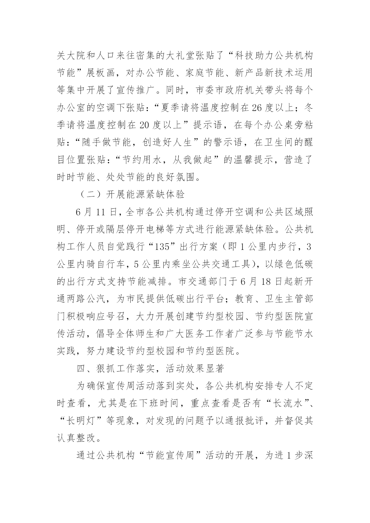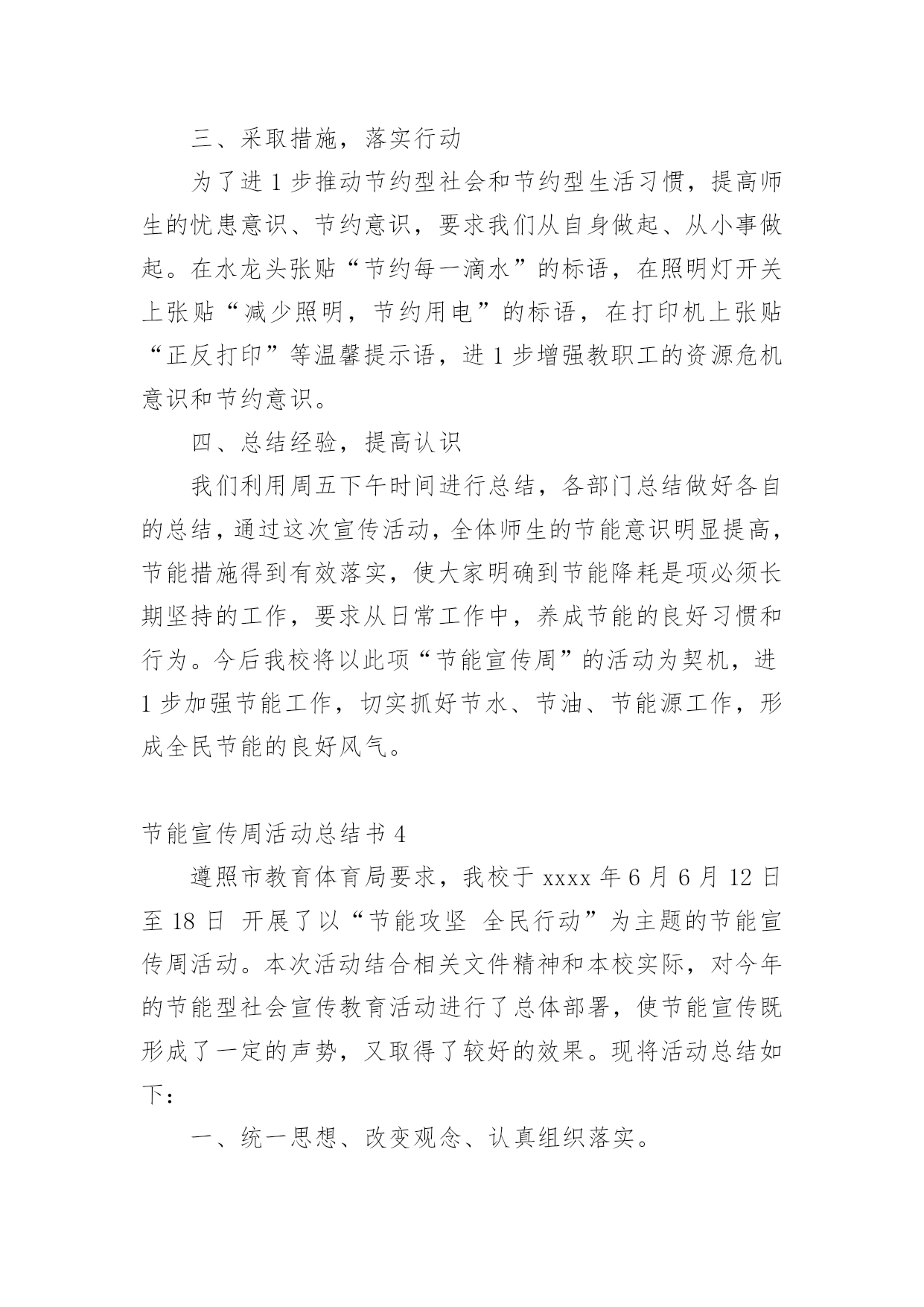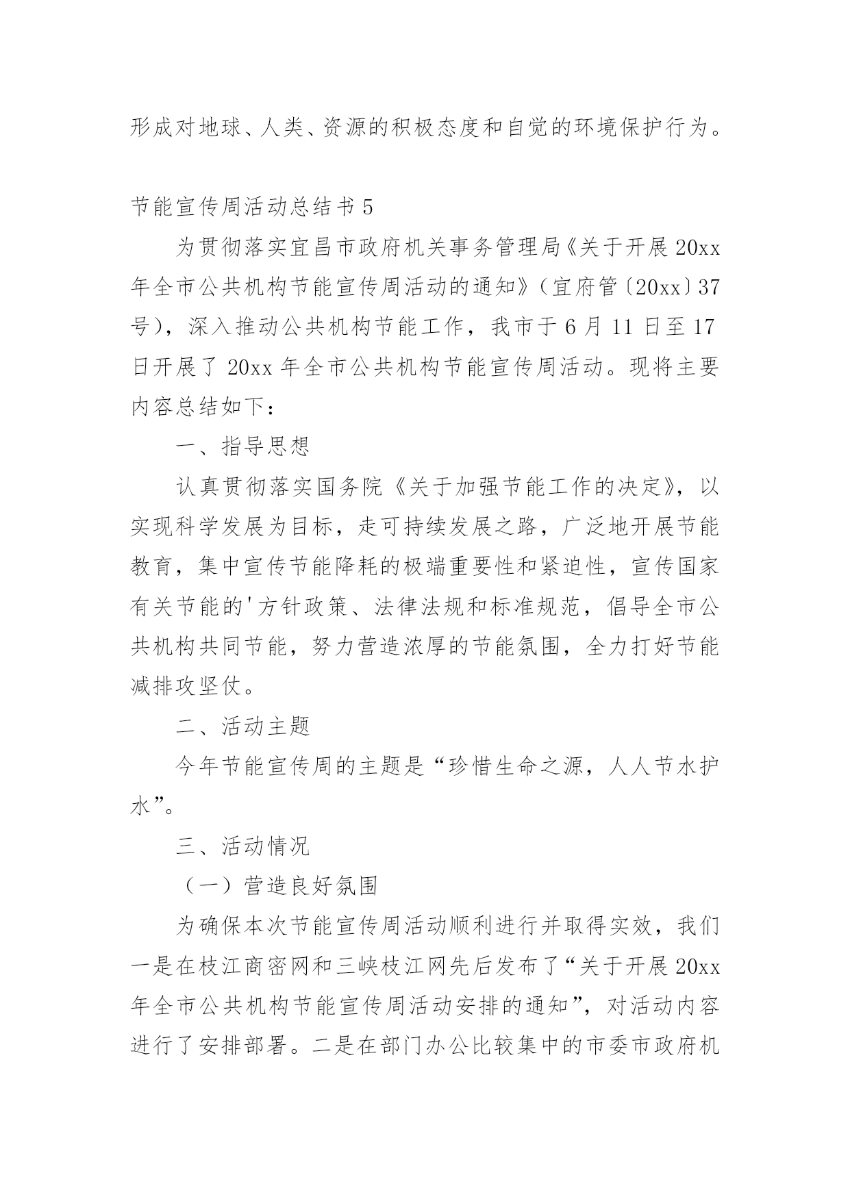 节能宣传周活动总结书节能宣传周活动总结书节能宣传周活动总结书1按照市节能减排工作领导小组办公室文件要求,我校紧紧围绕“节能低碳绿色发展”这一主题,对今年的宣传周活动进行了安排部署,既营造了良好的氛围,又取得了较好的效果。现将我校节能宣传周活动总结如下。一、加强组织领导,明确工作职责为确保宣传周活动的顺利开展,成立了以主要领导为组长,分管领导为副组长,各班班主任为成员的宣传活动领导小组,加强对宣传周活动的监督、指导,为宣传活动提供强有力的组织保障。二、开展宣传教育,树立绿色理念1、召开全校师生大会,做“节能低碳绿色发展”的主题报告,在全校师生中进行大力宣传。2、在学校醒目处悬挂宣传横幅,营造“节能低碳、绿色发展”的氛围。3、印发《节能减排绿色生活》宣传资料,对学生进行节能、节水、节粮等方面的教育,提高学生的节能、节水、节电、节粮的意识,培养他们养成节约的良好习惯。三、举行主题活动,开展绿色行动。1、充分利用黑板报、宣传栏等进行节能减排教育活动,宣传保护环境、节能减排、抵制白色污染的重要意义,各个班级开展一次节能减排的主题班会。2、开展“节约进家庭”教育活动,通过“教育1个学生,带动1个家庭,拉动1个社组”的方式,倡导师生从“关闭电器的同时拔掉插头、将灯泡换成节能灯泡、减少使用塑料袋”3个生活细节做起,在全校营造节能减排的良好氛围。3、教职工以身作则,做节能减排先行者。教职工要做学生的榜样,从细小处入手,整合办公资源。管理、使用好现有的办学、办公设备,抓好设施、设备的节能,节约办公、教学用品,减少办公、教学用品消耗。办公规定纸张尽量双面打印,单面使用的留给下次重复使用等。四、从身边做起,从点滴做起。1、节约用水。珍惜水资源,洗刷不用“长流水”,提倡使用脸盆洗手洗脸,洗涮拖把不过量用水;合理循环使用自来水;爱护节水设施,关紧水龙头。自觉做到爱水、惜水、节水,严格做到人走水断流,严防跑冒滴漏;随身带走未饮用完的瓶装矿泉水,减少浪费。2、节约用电。尽量多采用自然光;人走灯灭,离室关电,避免“白昼灯”、“长明灯”;使用完计算机、打印机、复印机、饮水机等设备后,及时断电,减少待机损耗。3、节约用纸。尽量少用一次性纸杯,提倡自带水杯。4、节约粮食。尽可能不浪费一粒粮食,尽可能不吃或减少进食零食。5、节约用钱,合理消费。学生不攀比不超前消费,学会精打细算,充分利用学习用品,养成善于理财的好习惯。本次节能减排宣传周活动顺利进行,达到宣传周活动的目标,增强了师生的能源忧患意识和节约意识,在我校形成了从我做起,从现在做起,从身边点滴事情做起,“节约光荣、浪费可耻”的浓厚氛围。节能宣传周活动总结书2一、指导思想以广泛地开展节能教育,集中宣传节能降耗的极端重要性和紧迫性,宣传国家有关节能的方针政策、法律法规和标准规范,不断提高全民资源忧患意识和节约意识,增强紧迫感和责任感,努力营造浓厚的节能氛围,全力打好节能减排攻坚仗。二、加强组织领导为确保宣传周活动的顺利开展,成立了以主要社区主任为组长,社区副主任为副组长,全体社区干事为成员的宣传活动领导小组,加强对宣传周活动的监督、指导,为宣传活动提供强有力的组织保障。三、开展活动情况(一)高度重视,统筹安排节能活动。高官台社区党总支高度重视,,成立了节能减排领导小组,召开了全体社区工作人员大会,对宣传活动进行了安排部署,并要求各单位要以节能宣传周活动为契机,结合社区自己的实际,认真落实节能宣传活动。(二)大力宣传,增强节能减排意识。加大了节能宣传,使广居民群众了解节约能源的重要性和紧迫性,树立节约光荣、浪费可耻的意识,形成了节约能源从我做起、从小做起的观念。一是通过学习宣传节能相关方针政策、法律法规;二是开展节能进家庭活动,号召全体居民群众及家属树立节能意识,要做推广使用节能产品,促进扩大消费需求的先行者和表率者,养成良好的生活习惯,树立节俭文明的生活消费理念。(三)采取措施,落实节能减排行动。为进1步推动节约型社会和节约型机关建设,提高居民群众忧患意识、责任意识和节能意识,按照节能宣传周活动安排,以实际行动践行节能宣传周活动。一是开展能源紧缺体验活动。6月10日为“低碳体验日”,社区全体工作人员带头示范,社区居民群众积极参与,全体工作人员乘坐公共交通工具、骑自行车或者步行上班。二是采取措施,降低能源消耗。从节约一度电、一滴水、一张纸,增强和养成节能减排自觉性。本次节能宣传周活动顺利进行,达到宣传周活动的目标,增强了公众的能源忧患意识和节约意识,在我社区形成了从我做起,从现在做起,从身边点滴事情做起,“节约光荣、浪费可耻”的浓厚氛围,有效地促进我社区全面实现节能降耗目标。节能宣传周活动总结书320××年6月11—16日,是全国“节能宣传”的活动周,按照国务院的《“十二五”节能减排综合性工作方案》的有关要求,充