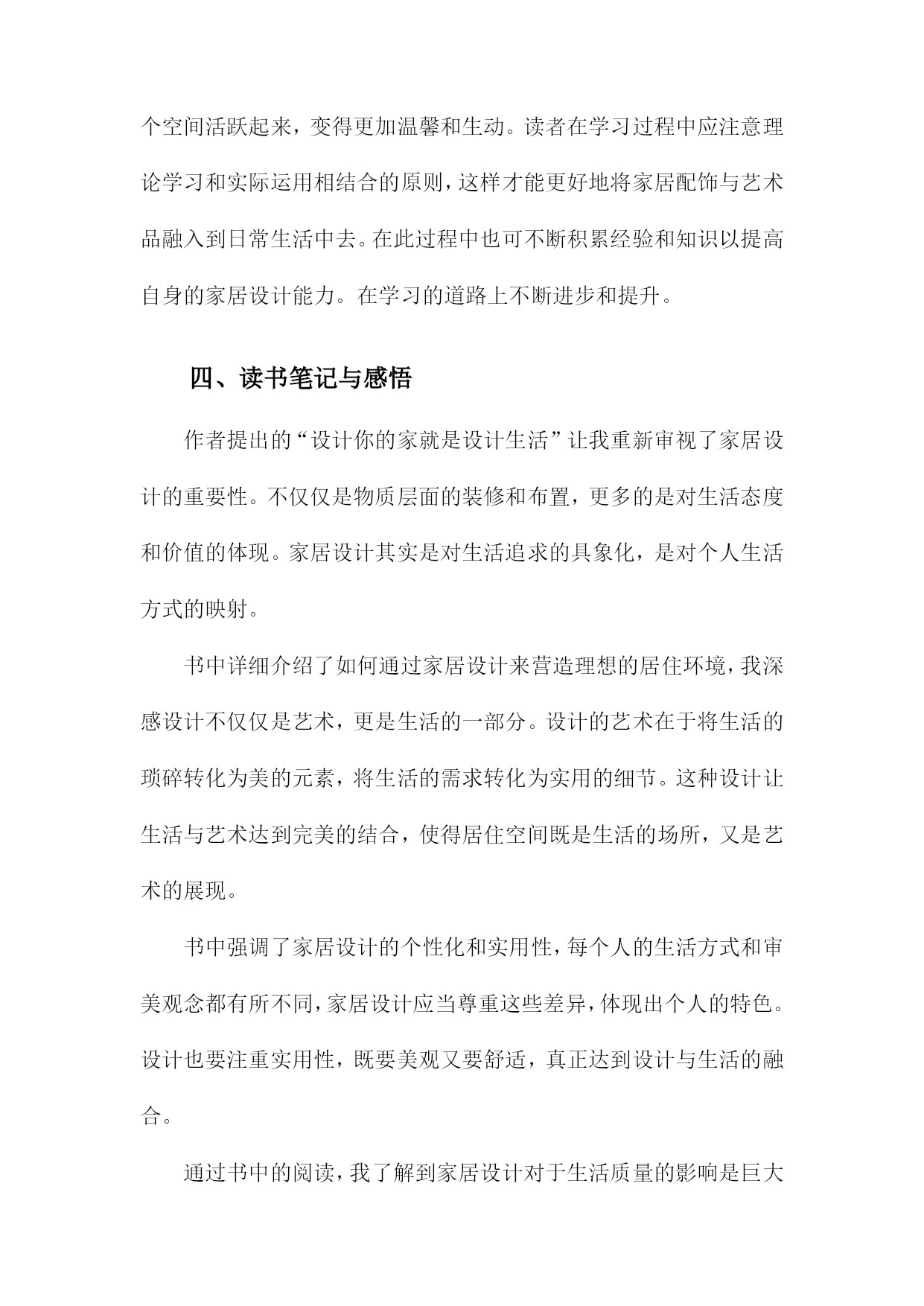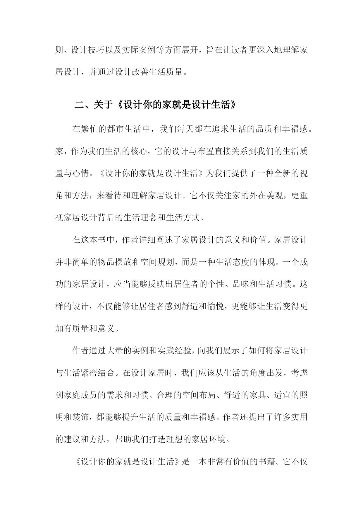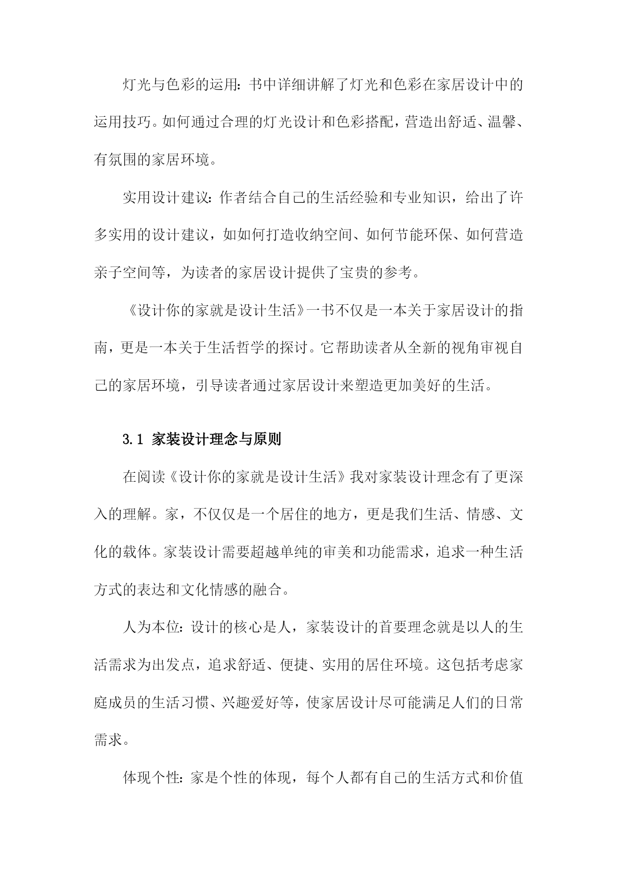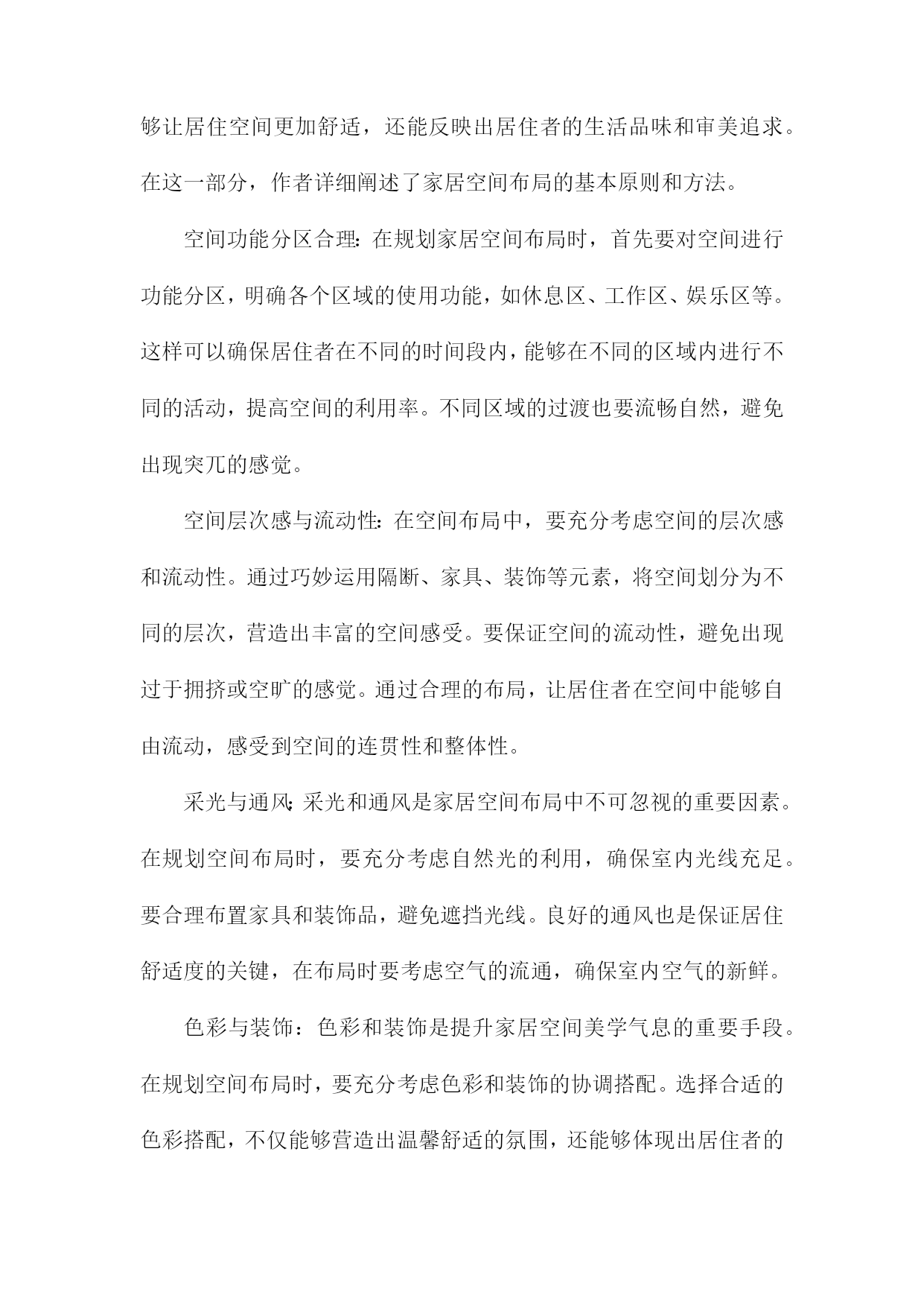 《设计你的家就是设计生活》读书笔记一、内容描述《设计你的家就是设计生活》是一本关于家居设计与生活哲学的书籍。作者深入探讨了家居设计的重要性,并阐述了如何通过精心设计家居环境来改善生活质量。本书内容涵盖了设计理念、设计原则、设计技巧以及实际案例等多个方面,旨在帮助读者理解并实践家居设计。在读书笔记中,我将首先介绍本书的整体框架和主要内容,包括作者的设计理念以及他对家居设计的独特见解。我会详细阐述书中的几个关键章节,如空间规划、色彩搭配、家具选购等,并结合自己的理解和实际经验进行分析。我还会介绍书中提到的一些有趣或富有启发性的观点,例如如何通过家居设计来反映个人品味和生活态度,以及如何将自然元素融入家居环境等。我还会分享书中提到的实际案例,这些案例展示了如何将设计理念应用到具体家居环境中。通过案例分析,我将阐述这些设计理念在实际操作中的可行性和实用性。我也会结合自己对家居设计的理解和经验,提出一些新的思考或观点,以及从本书中获得的一些启示。《设计你的家就是设计生活》读书笔记将围绕设计理念、设计原则、设计技巧以及实际案例等方面展开,旨在让读者更深入地理解家居设计,并通过设计改善生活质量。二、关于《设计你的家就是设计生活》在繁忙的都市生活中,我们每天都在追求生活的品质和幸福感。家,作为我们生活的核心,它的设计与布置直接关系到我们的生活质量与心情。《设计你的家就是设计生活》为我们提供了一种全新的视角和方法,来看待和理解家居设计。它不仅关注家的外在美观,更重视家居设计背后的生活理念和生活方式。在这本书中,作者详细阐述了家居设计的意义和价值。家居设计并非简单的物品摆放和空间规划,而是一种生活态度的体现。一个成功的家居设计,应当能够反映出居住者的个性、品味和生活习惯。这样的设计,不仅能够让居住者感到舒适和愉悦,更能够让生活变得更加有质量和意义。作者通过大量的实例和实践经验,向我们展示了如何将家居设计与生活紧密结合。在设计家居时,我们应该从生活的角度出发,考虑到家庭成员的需求和习惯。合理的空间布局、舒适的家具、适宜的照明和装饰,都能够提升生活的质量和幸福感。作者还提出了许多实用的建议和方法,帮助我们打造理想的家居环境。《设计你的家就是设计生活》是一本非常有价值的书籍。它不仅提供了丰富的理论知识和实践经验,更提供了一种全新的生活理念和生活方式。通过阅读这本书,我深刻认识到家居设计的重要性,并学会了如何将家居设计与生活紧密结合。在未来的生活中,我将更加注重家居设计的细节和人性化设计,努力打造出一个舒适、有质量和意义的家居环境。三、书中主要内容家居设计理念:作者首先阐述了家居设计的核心理念,即家居设计不仅仅是物质的堆砌,更是生活态度的展现。设计的目的在于创造一个舒适、和谐、富有美感的生活环境,反映居住者的个性和品味。空间规划布局:书中详细探讨了如何进行空间规划布局,如何充分利用家居空间,如何做到动线流畅、动静分区等。也强调了空间布局与居住者生活习惯的紧密结合,使家居空间既实用又美观。装修风格与设计风格:作者介绍了各种常见的装修风格和设计风格,包括现代简约、欧式古典、北欧风等,并对每种风格的特点和适用场景进行了分析。也鼓励读者根据自己的喜好和生活需求,创造出独一无二的设计风格。家具选购与搭配:书中对家具的选购和搭配进行了详细的讲解,包括家具的材质、颜色、风格等方面的选择。也强调了家具与整体装修风格和居住者的生活习惯的协调性。灯光与色彩的运用:书中详细讲解了灯光和色彩在家居设计中的运用技巧。如何通过合理的灯光设计和色彩搭配,营造出舒适、温馨、有氛围的家居环境。实用设计建议:作者结合自己的生活经验和专业知识,给出了许多实用的设计建议,如如何打造收纳空间、如何节能环保、如何营造亲子空间等,为读者的家居设计提供了宝贵的参考。《设计你的家就是设计生活》一书不仅是一本关于家居设计的指南,更是一本关于生活哲学的探讨。它帮助读者从全新的视角审视自己的家居环境,引导读者通过家居设计来塑造更加美好的生活。3.1家装设计理念与原则在阅读《设计你的家就是设计生活》我对家装设计理念有了更深入的理解。家,不仅仅是一个居住的地方,更是我们生活、情感、文化的载体。家装设计需要超越单纯的审美和功能需求,追求一种生活方式的表达和文化情感的融合。人为本位:设计的核心是人,家装设计的首要理念就是以人的生活需求为出发点,追求舒适、便捷、实用的居住环境。这包括考虑家庭成员的生活习惯、兴趣爱好等,使家居设计尽可能满足人们的日常需求。体现个性:家是个性的体现,每个人都有自己的生活方式和价值观。家装设计应当尊重并体现这种个性,让家居空间成为个人特色的延伸。设计师需要通过与业主的沟通,了解他们的需求和期望,将他们的个性融入到设计中。兼顾美学与功能:美学和功能