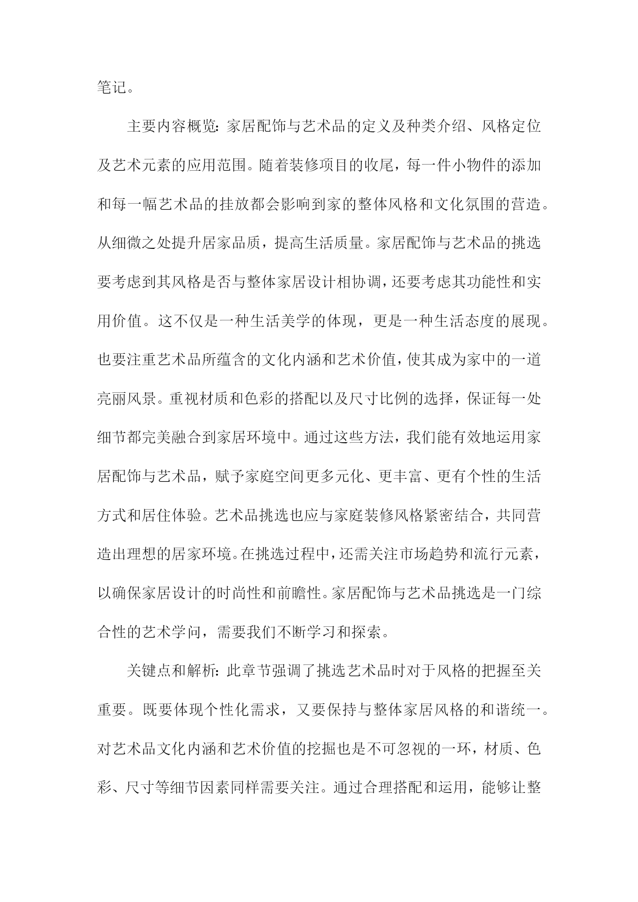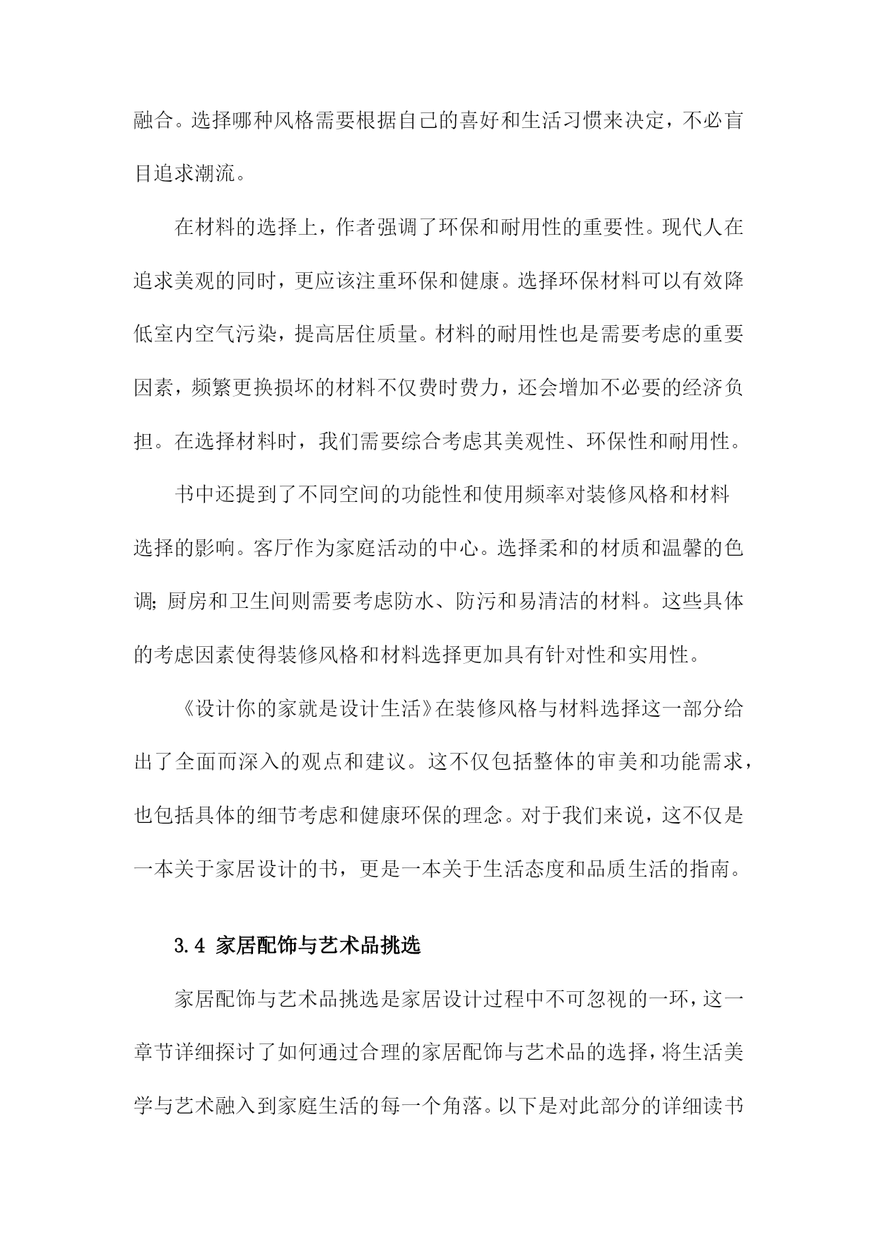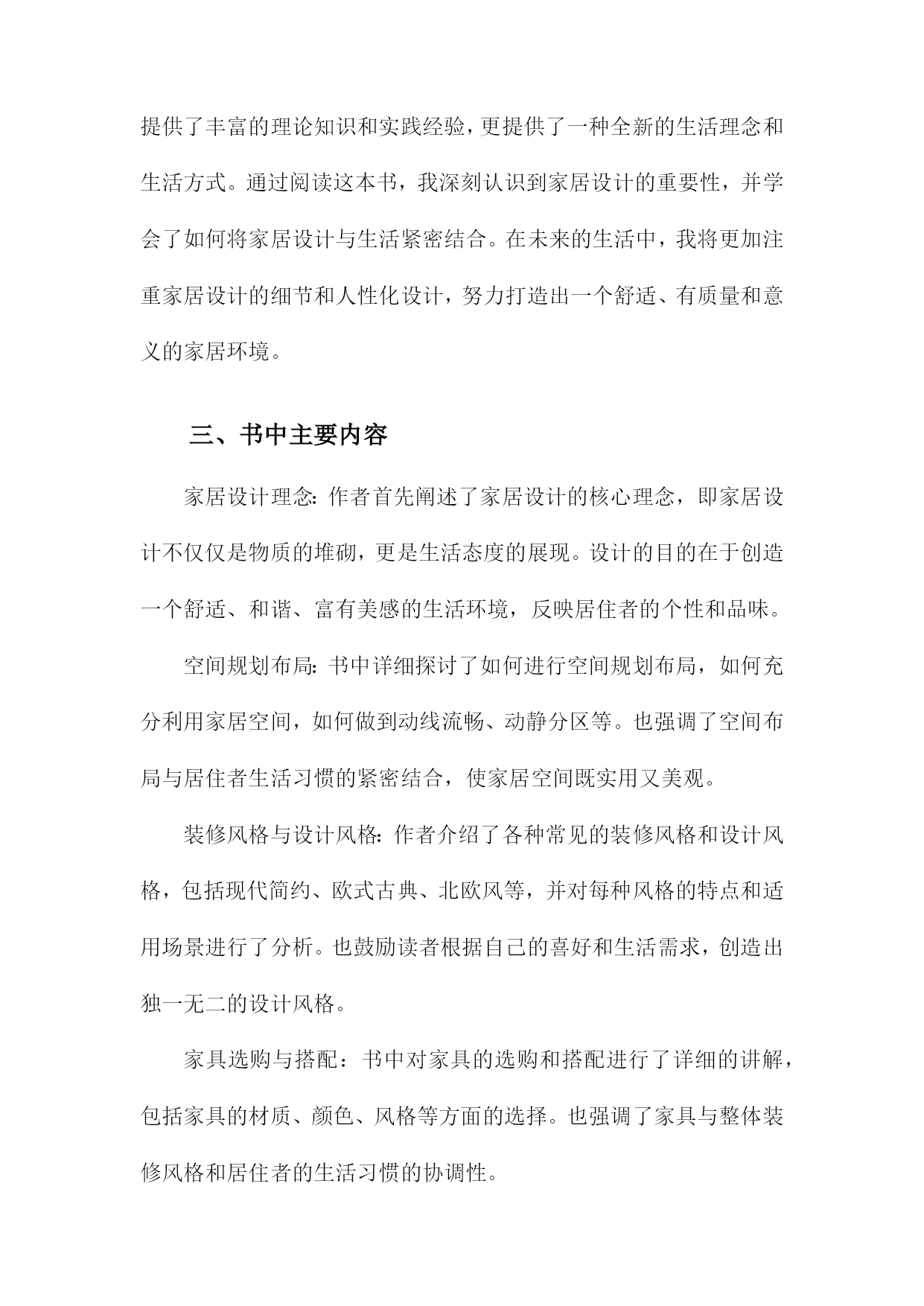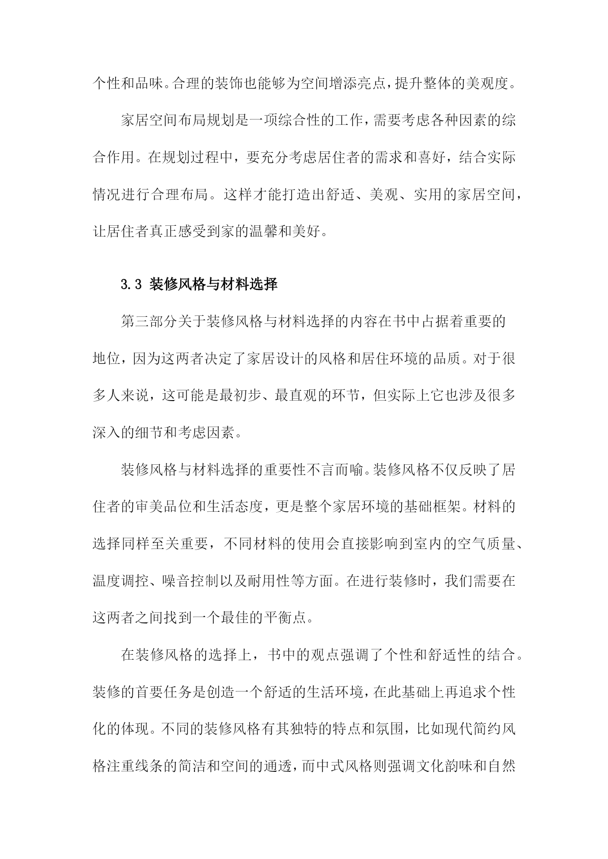 《设计你的家就是设计生活》读书笔记一、内容描述《设计你的家就是设计生活》是一本关于家居设计与生活哲学的书籍。作者深入探讨了家居设计的重要性,并阐述了如何通过精心设计家居环境来改善生活质量。本书内容涵盖了设计理念、设计原则、设计技巧以及实际案例等多个方面,旨在帮助读者理解并实践家居设计。在读书笔记中,我将首先介绍本书的整体框架和主要内容,包括作者的设计理念以及他对家居设计的独特见解。我会详细阐述书中的几个关键章节,如空间规划、色彩搭配、家具选购等,并结合自己的理解和实际经验进行分析。我还会介绍书中提到的一些有趣或富有启发性的观点,例如如何通过家居设计来反映个人品味和生活态度,以及如何将自然元素融入家居环境等。我还会分享书中提到的实际案例,这些案例展示了如何将设计理念应用到具体家居环境中。通过案例分析,我将阐述这些设计理念在实际操作中的可行性和实用性。我也会结合自己对家居设计的理解和经验,提出一些新的思考或观点,以及从本书中获得的一些启示。《设计你的家就是设计生活》读书笔记将围绕设计理念、设计原则、设计技巧以及实际案例等方面展开,旨在让读者更深入地理解家居设计,并通过设计改善生活质量。二、关于《设计你的家就是设计生活》在繁忙的都市生活中,我们每天都在追求生活的品质和幸福感。家,作为我们生活的核心,它的设计与布置直接关系到我们的生活质量与心情。《设计你的家就是设计生活》为我们提供了一种全新的视角和方法,来看待和理解家居设计。它不仅关注家的外在美观,更重视家居设计背后的生活理念和生活方式。在这本书中,作者详细阐述了家居设计的意义和价值。家居设计并非简单的物品摆放和空间规划,而是一种生活态度的体现。一个成功的家居设计,应当能够反映出居住者的个性、品味和生活习惯。这样的设计,不仅能够让居住者感到舒适和愉悦,更能够让生活变得更加有质量和意义。作者通过大量的实例和实践经验,向我们展示了如何将家居设计与生活紧密结合。在设计家居时,我们应该从生活的角度出发,考虑到家庭成员的需求和习惯。合理的空间布局、舒适的家具、适宜的照明和装饰,都能够提升生活的质量和幸福感。作者还提出了许多实用的建议和方法,帮助我们打造理想的家居环境。《设计你的家就是设计生活》是一本非常有价值的书籍。它不仅提供了丰富的理论知识和实践经验,更提供了一种全新的生活理念和生活方式。通过阅读这本书,我深刻认识到家居设计的重要性,并学会了如何将家居设计与生活紧密结合。在未来的生活中,我将更加注重家居设计的细节和人性化设计,努力打造出一个舒适、有质量和意义的家居环境。三、书中主要内容家居设计理念:作者首先阐述了家居设计的核心理念,即家居设计不仅仅是物质的堆砌,更是生活态度的展现。设计的目的在于创造一个舒适、和谐、富有美感的生活环境,反映居住者的个性和品味。空间规划布局:书中详细探讨了如何进行空间规划布局,如何充分利用家居空间,如何做到动线流畅、动静分区等。也强调了空间布局与居住者生活习惯的紧密结合,使家居空间既实用又美观。装修风格与设计风格:作者介绍了各种常见的装修风格和设计风格,包括现代简约、欧式古典、北欧风等,并对每种风格的特点和适用场景进行了分析。也鼓励读者根据自己的喜好和生活需求,创造出独一无二的设计风格。家具选购与搭配:书中对家具的选购和搭配进行了详细的讲解,包括家具的材质、颜色、风格等方面的选择。也强调了家具与整体装修风格和居住者的生活习惯的协调性。灯光与色彩的运用:书中详细讲解了灯光和色彩在家居设计中的运用技巧。如何通过合理的灯光设计和色彩搭配,营造出舒适、温馨、有氛围的家居环境。实用设计建议:作者结合自己的生活经验和专业知识,给出了许多实用的设计建议,如如何打造收纳空间、如何节能环保、如何营造亲子空间等,为读者的家居设计提供了宝贵的参考。《设计你的家就是设计生活》一书不仅是一本关于家居设计的指南,更是一本关于生活哲学的探讨。它帮助读者从全新的视角审视自己的家居环境,引导读者通过家居设计来塑造更加美好的生活。3.1家装设计理念与原则在阅读《设计你的家就是设计生活》我对家装设计理念有了更深入的理解。家,不仅仅是一个居住的地方,更是我们生活、情感、文化的载体。家装设计需要超越单纯的审美和功能需求,追求一种生活方式的表达和文化情感的融合。人为本位:设计的核心是人,家装设计的首要理念就是以人的生活需求为出发点,追求舒适、便捷、实用的居住环境。这包括考虑家庭成员的生活习惯、兴趣爱好等,使家居设计尽可能满足人们的日常需求。体现个性:家是个性的体现,每个人都有自己的生活方式和价值观。家装设计应当尊重并体现这种个性,让家居空间成为个人特色的延伸。设计师需要通过与业主的沟通,了解他们的需求和期望,将他们的个性融入到设计中。兼顾美学与功能:美学和功能