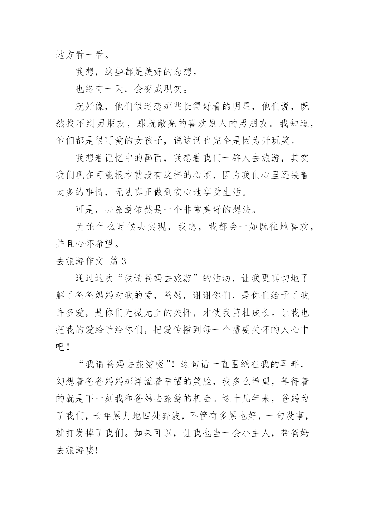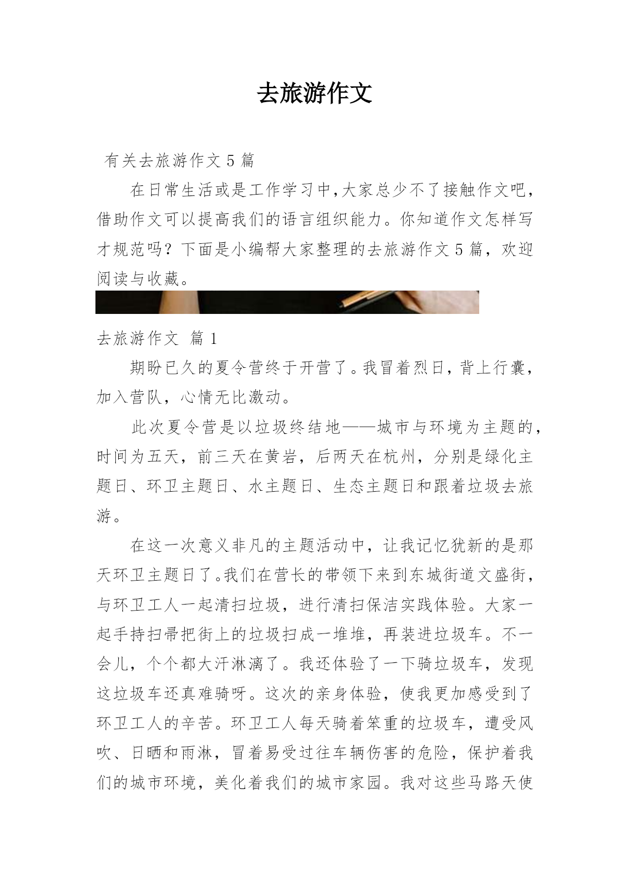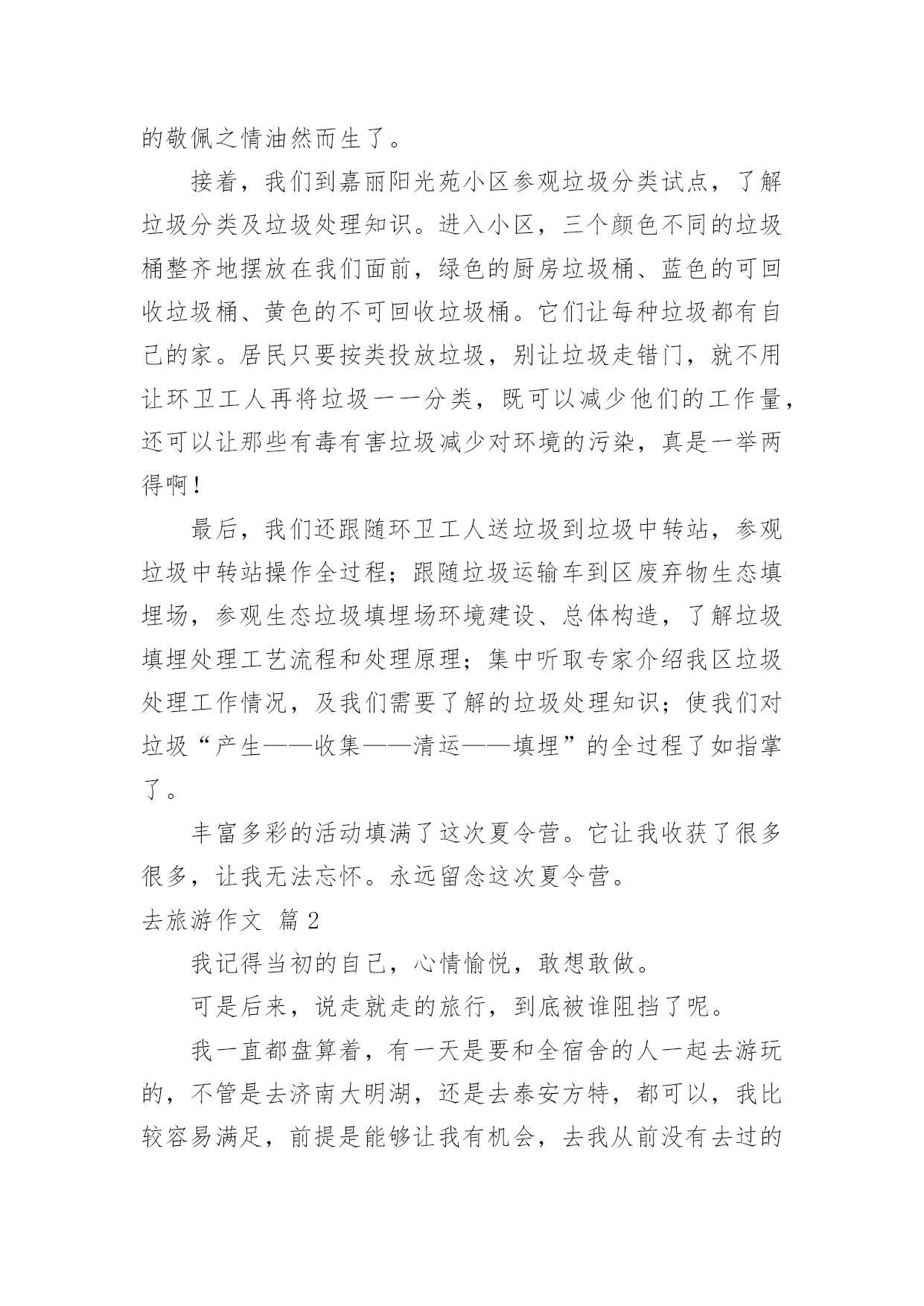 去旅游作文有关去旅游作文5篇在日常生活或是工作学习中,大家总少不了接触作文吧,借助作文可以提高我们的语言组织能力。你知道作文怎样写才规范吗?下面是小编帮大家整理的去旅游作文5篇,欢迎阅读与收藏。去旅游作文篇1期盼已久的夏令营终于开营了。我冒着烈日,背上行囊,加入营队,心情无比激动。此次夏令营是以垃圾终结地——城市与环境为主题的,时间为五天,前三天在黄岩,后两天在杭州,分别是绿化主题日、环卫主题日、水主题日、生态主题日和跟着垃圾去旅游。在这一次意义非凡的主题活动中,让我记忆犹新的是那天环卫主题日了。我们在营长的带领下来到东城街道文盛街,与环卫工人一起清扫垃圾,进行清扫保洁实践体验。大家一起手持扫帚把街上的垃圾扫成一堆堆,再装进垃圾车。不一会儿,个个都大汗淋漓了。我还体验了一下骑垃圾车,发现这垃圾车还真难骑呀。这次的亲身体验,使我更加感受到了环卫工人的辛苦。环卫工人每天骑着笨重的垃圾车,遭受风吹、日晒和雨淋,冒着易受过往车辆伤害的危险,保护着我们的城市环境,美化着我们的城市家园。我对这些马路天使的敬佩之情油然而生了。接着,我们到嘉丽阳光苑小区参观垃圾分类试点,了解垃圾分类及垃圾处理知识。进入小区,三个颜色不同的垃圾桶整齐地摆放在我们面前,绿色的厨房垃圾桶、蓝色的可回收垃圾桶、黄色的不可回收垃圾桶。它们让每种垃圾都有自己的家。居民只要按类投放垃圾,别让垃圾走错门,就不用让环卫工人再将垃圾一一分类,既可以减少他们的工作量,还可以让那些有毒有害垃圾减少对环境的污染,真是一举两得啊!最后,我们还跟随环卫工人送垃圾到垃圾中转站,参观垃圾中转站操作全过程;跟随垃圾运输车到区废弃物生态填埋场,参观生态垃圾填埋场环境建设、总体构造,了解垃圾填埋处理工艺流程和处理原理;集中听取专家介绍我区垃圾处理工作情况,及我们需要了解的垃圾处理知识;使我们对垃圾“产生——收集——清运——填埋”的全过程了如指掌了。丰富多彩的活动填满了这次夏令营。它让我收获了很多很多,让我无法忘怀。永远留念这次夏令营。去旅游作文篇2我记得当初的自己,心情愉悦,敢想敢做。可是后来,说走就走的旅行,到底被谁阻挡了呢。我一直都盘算着,有一天是要和全宿舍的人一起去游玩的,不管是去济南大明湖,还是去泰安方特,都可以,我比较容易满足,前提是能够让我有机会,去我从前没有去过的地方看一看。我想,这些都是美好的念想。也终有一天,会变成现实。就好像,他们很迷恋那些长得好看的明星,他们说,既然找不到男朋友,那就敞亮的喜欢别人的男朋友。我知道,他们都是很可爱的女孩子,说这话也完全是因为开玩笑。我想着记忆中的画面,我想着我们一群人去旅游,其实我们现在可能根本就没有这样的心境,因为我们心里还装着太多的事情,无法真正做到安心地享受生活。可是,去旅游依然是一个非常美好的想法。无论什么时候去实现,我想,我都会一如既往地喜欢,并且心怀希望。去旅游作文篇3通过这次“我请爸妈去旅游”的活动,让我更真切地了解了爸爸妈妈对我的爱,爸妈,谢谢你们,是你们给予了我许多爱,是你们无微无至的关怀,才使我茁壮成长。让我也把我的爱给予给你们,把爱传播到每一个需要关怀的人心中吧!“我请爸妈去旅游喽”!这句话一直围绕在我的耳畔,幻想着爸爸妈妈那洋溢着幸福的笑脸,我多么希望,等待着的就是下一刻我和爸妈去旅游的机会。这十几年来,爸妈为了我们,长年累月地四处奔波,不管有多累也好,一句没事,就打发掉了我们。如果可以,让我也当一会小主人,带爸妈去旅游喽!这一次,我觉得是最有意义的一次活动,在这次活动中,我寻找到了快乐的足迹,同时也不忘为爸妈喝彩。当我们乘坐汽车来到万家时,可难以想象心头上涌上一股欢喜之情。刚下车,我们便迫不得及待转往万家百货里跑,看到新鲜事就忍不住好奇心,这里瞧瞧,那儿望望,好像永远都是纯真无暇的孩子。我们几个同学围在一起。你一句,我一句地说个不停,有的同学猜测:这次活动肯定很精彩!虽然我也这么认为,但为什么只有我们的小记者呀?哎!兴许是我们早来的吧!你可不知道,整个万佳百货都被我们玩转了,等我们乐呵呵的从百货里走出来,小记者的活动已经开始了,我们只得找个位置坐下,之后主持人手拿麦克风,滔滔不绝地演讲着他的语句,把我们在场上的小记者们不亦乐乎。然后,由几位肯德基的姐姐们和奇奇一起带领着六位小朋友跳舞,音乐就由此响遍了整个广场。最后就是“星际飃车王”的比赛了,虽然我不是参赛选手,但也在时刻关注着。只见参赛选手一个个摩拳擦掌,跃跃欲试。比赛进行得相当热烈,气氛都在紧张之中,选手们争得面红耳赤。于是我趁着这样的机会,跑到几位比赛完的选手面前,我问道:“你在比赛时紧张吗?”他很坦然地对我说:“其实没什么好紧张的,只要自己掌握了技术,就不怕赢不到”。之后,有几位选手经过了我的一番调查,都向我说明了自己的心情。后来由于场面混乱而看不到结尾,但