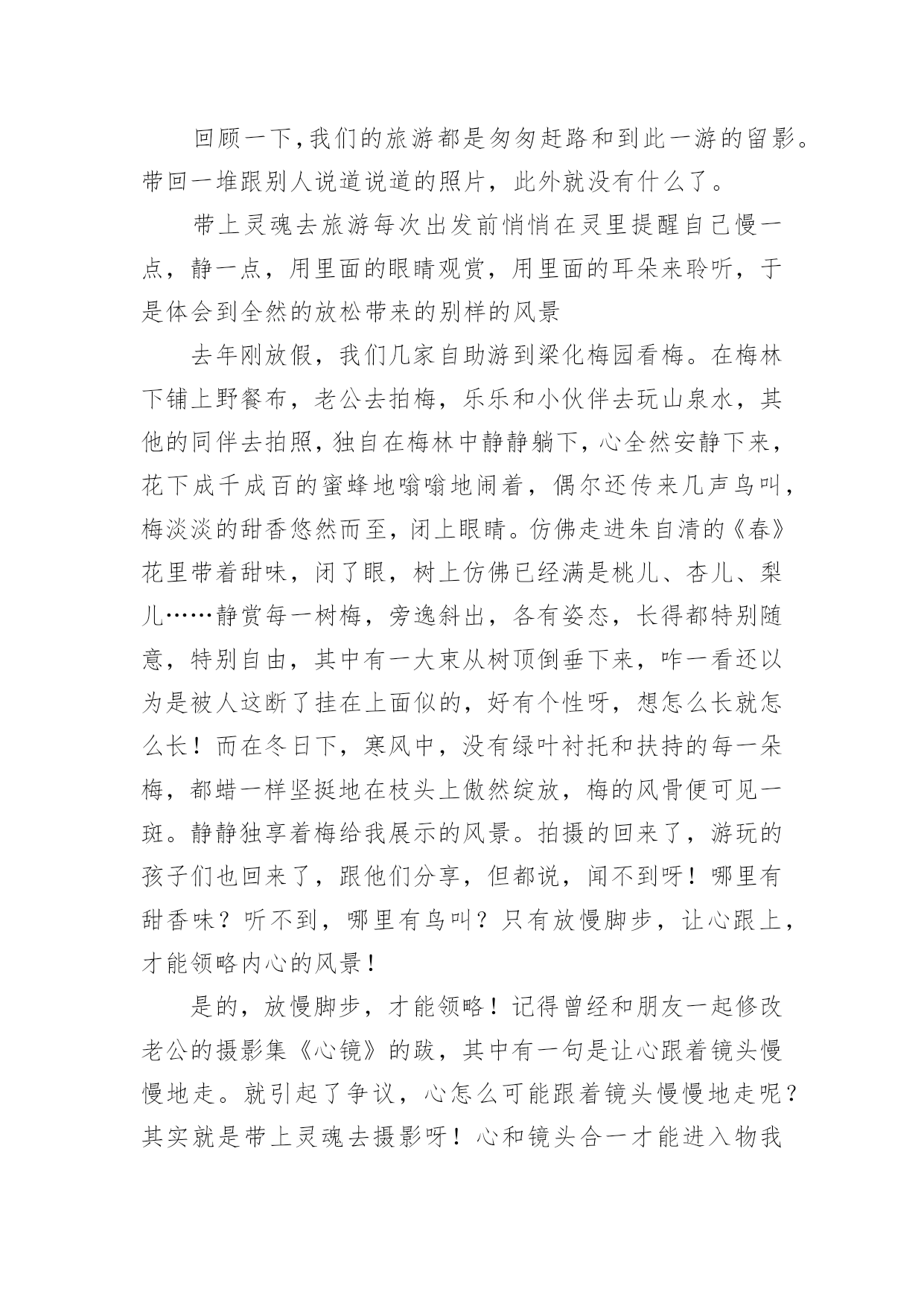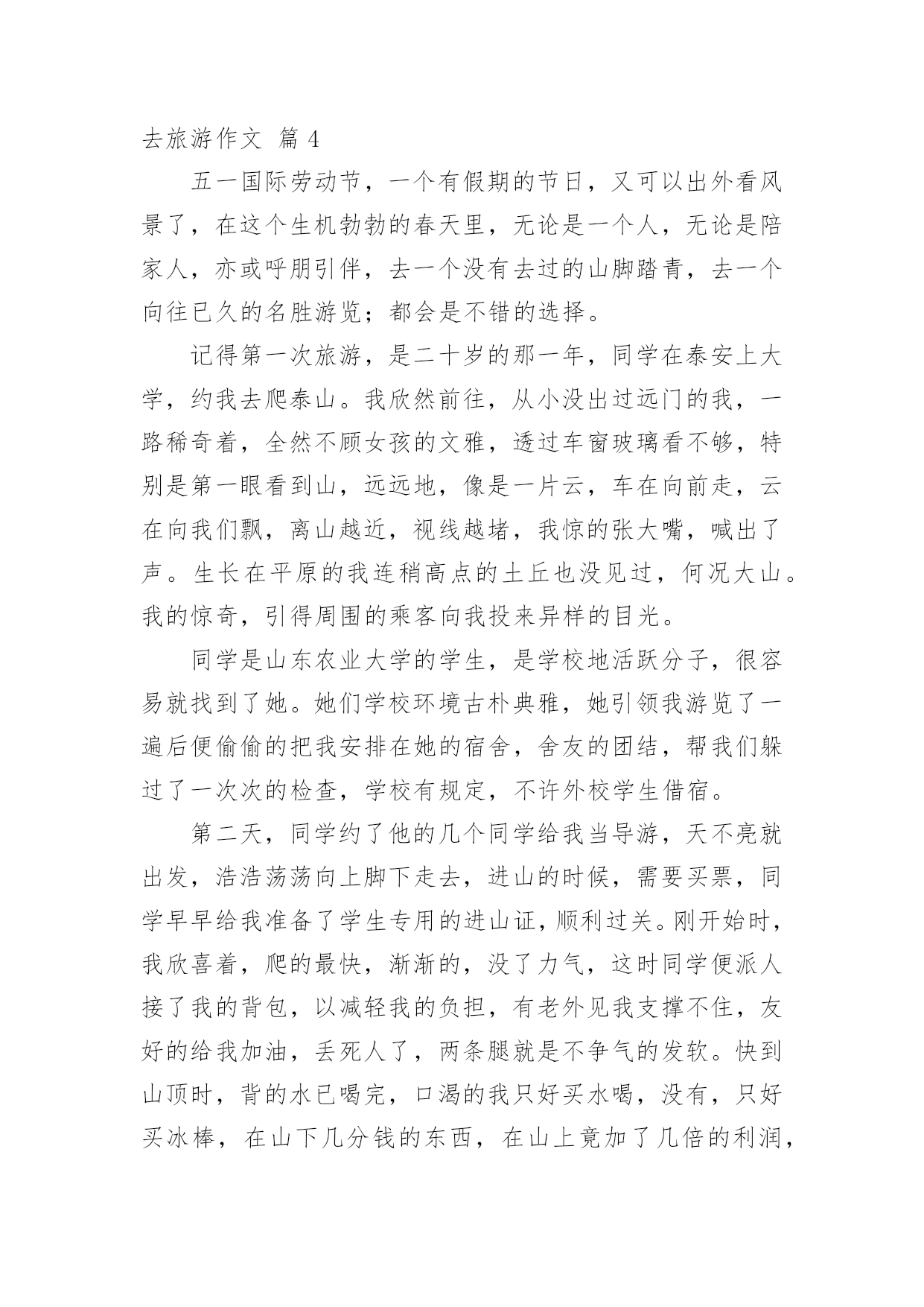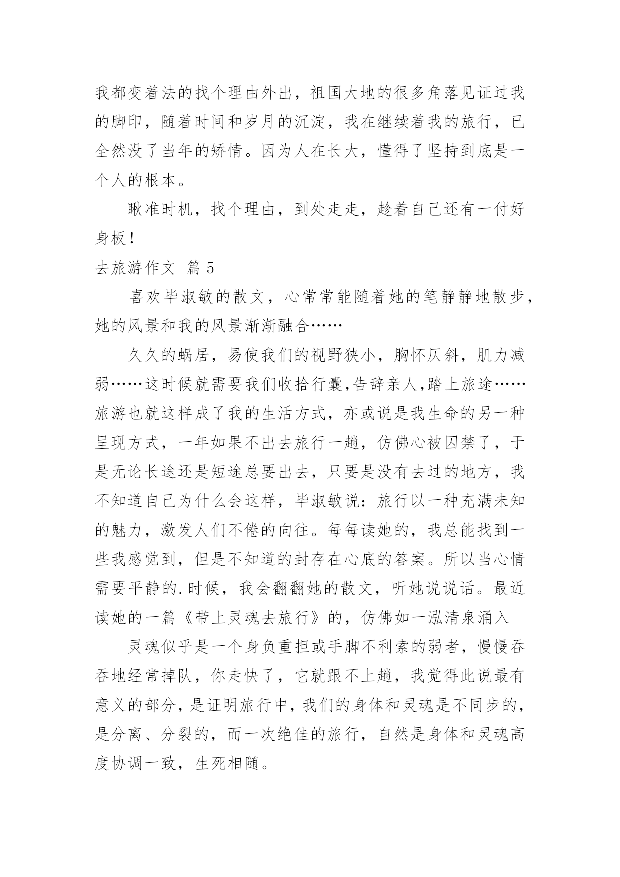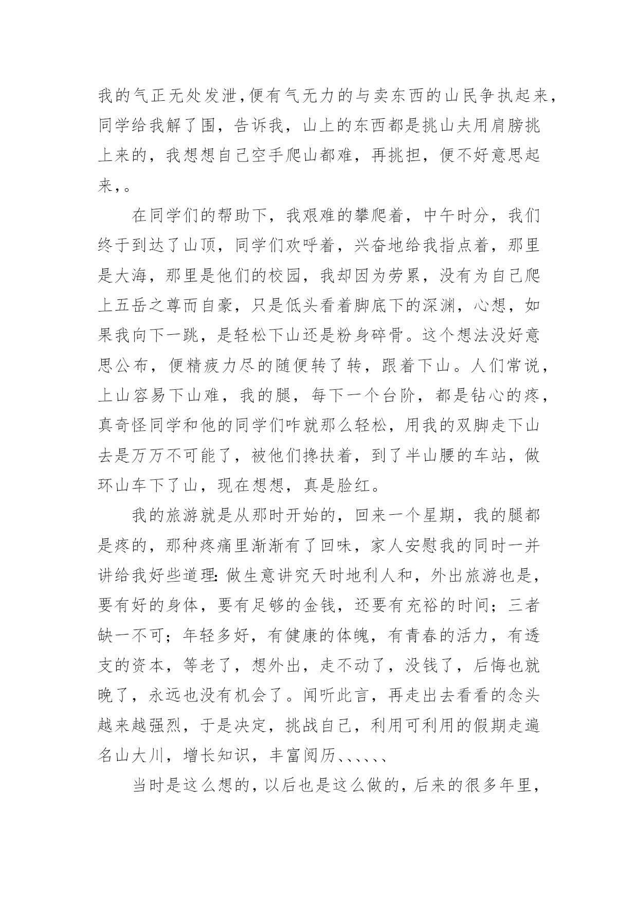 去旅游作文有关去旅游作文5篇在日常生活或是工作学习中,大家总少不了接触作文吧,借助作文可以提高我们的语言组织能力。你知道作文怎样写才规范吗?下面是小编帮大家整理的去旅游作文5篇,欢迎阅读与收藏。去旅游作文篇1期盼已久的夏令营终于开营了。我冒着烈日,背上行囊,加入营队,心情无比激动。此次夏令营是以垃圾终结地——城市与环境为主题的,时间为五天,前三天在黄岩,后两天在杭州,分别是绿化主题日、环卫主题日、水主题日、生态主题日和跟着垃圾去旅游。在这一次意义非凡的主题活动中,让我记忆犹新的是那天环卫主题日了。我们在营长的带领下来到东城街道文盛街,与环卫工人一起清扫垃圾,进行清扫保洁实践体验。大家一起手持扫帚把街上的垃圾扫成一堆堆,再装进垃圾车。不一会儿,个个都大汗淋漓了。我还体验了一下骑垃圾车,发现这垃圾车还真难骑呀。这次的亲身体验,使我更加感受到了环卫工人的辛苦。环卫工人每天骑着笨重的垃圾车,遭受风吹、日晒和雨淋,冒着易受过往车辆伤害的危险,保护着我们的城市环境,美化着我们的城市家园。我对这些马路天使的敬佩之情油然而生了。接着,我们到嘉丽阳光苑小区参观垃圾分类试点,了解垃圾分类及垃圾处理知识。进入小区,三个颜色不同的垃圾桶整齐地摆放在我们面前,绿色的厨房垃圾桶、蓝色的可回收垃圾桶、黄色的不可回收垃圾桶。它们让每种垃圾都有自己的家。居民只要按类投放垃圾,别让垃圾走错门,就不用让环卫工人再将垃圾一一分类,既可以减少他们的工作量,还可以让那些有毒有害垃圾减少对环境的污染,真是一举两得啊!最后,我们还跟随环卫工人送垃圾到垃圾中转站,参观垃圾中转站操作全过程;跟随垃圾运输车到区废弃物生态填埋场,参观生态垃圾填埋场环境建设、总体构造,了解垃圾填埋处理工艺流程和处理原理;集中听取专家介绍我区垃圾处理工作情况,及我们需要了解的垃圾处理知识;使我们对垃圾“产生——收集——清运——填埋”的全过程了如指掌了。丰富多彩的活动填满了这次夏令营。它让我收获了很多很多,让我无法忘怀。永远留念这次夏令营。去旅游作文篇2我记得当初的自己,心情愉悦,敢想敢做。可是后来,说走就走的旅行,到底被谁阻挡了呢。我一直都盘算着,有一天是要和全宿舍的人一起去游玩的,不管是去济南大明湖,还是去泰安方特,都可以,我比较容易满足,前提是能够让我有机会,去我从前没有去过的地方看一看。我想,这些都是美好的念想。也终有一天,会变成现实。就好像,他们很迷恋那些长得好看的明星,他们说,既然找不到男朋友,那就敞亮的喜欢别人的男朋友。我知道,他们都是很可爱的女孩子,说这话也完全是因为开玩笑。我想着记忆中的画面,我想着我们一群人去旅游,其实我们现在可能根本就没有这样的心境,因为我们心里还装着太多的事情,无法真正做到安心地享受生活。可是,去旅游依然是一个非常美好的想法。无论什么时候去实现,我想,我都会一如既往地喜欢,并且心怀希望。去旅游作文篇3通过这次“我请爸妈去旅游”的活动,让我更真切地了解了爸爸妈妈对我的爱,爸妈,谢谢你们,是你们给予了我许多爱,是你们无微无至的关怀,才使我茁壮成长。让我也把我的爱给予给你们,把爱传播到每一个需要关怀的人心中吧!“我请爸妈去旅游喽”!这句话一直围绕在我的耳畔,幻想着爸爸妈妈那洋溢着幸福的笑脸,我多么希望,等待着的就是下一刻我和爸妈去旅游的机会。这十几年来,爸妈为了我们,长年累月地四处奔波,不管有多累也好,一句没事,就打发掉了我们。如果可以,让我也当一会小主人,带爸妈去旅游喽!这一次,我觉得是最有意义的一次活动,在这次活动中,我寻找到了快乐的足迹,同时也不忘为爸妈喝彩。当我们乘坐汽车来到万家时,可难以想象心头上涌上一股欢喜之情。刚下车,我们便迫不得及待转往万家百货里跑,看到新鲜事就忍不住好奇心,这里瞧瞧,那儿望望,好像永远都是纯真无暇的孩子。我们几个同学围在一起。你一句,我一句地说个不停,有的同学猜测:这次活动肯定很精彩!虽然我也这么认为,但为什么只有我们的小记者呀?哎!兴许是我们早来的吧!你可不知道,整个万佳百货都被我们玩转了,等我们乐呵呵的从百货里走出来,小记者的活动已经开始了,我们只得找个位置坐下,之后主持人手拿麦克风,滔滔不绝地演讲着他的语句,把我们在场上的小记者们不亦乐乎。然后,由几位肯德基的姐姐们和奇奇一起带领着六位小朋友跳舞,音乐就由此响遍了整个广场。最后就是“星际飃车王”的比赛了,虽然我不是参赛选手,但也在时刻关注着。只见参赛选手一个个摩拳擦掌,跃跃欲试。比赛进行得相当热烈,气氛都在紧张之中,选手们争得面红耳赤。于是我趁着这样的机会,跑到几位比赛完的选手面前,我问道:“你在比赛时紧张吗?”他很坦然地对我说:“其实没什么好紧张的,只要自己掌握了技术,就不怕赢不到”。之后,有几位选手经过了我的一番调查,都向我说明了自己的心情。后来由于场面混乱而看不到结尾,但
