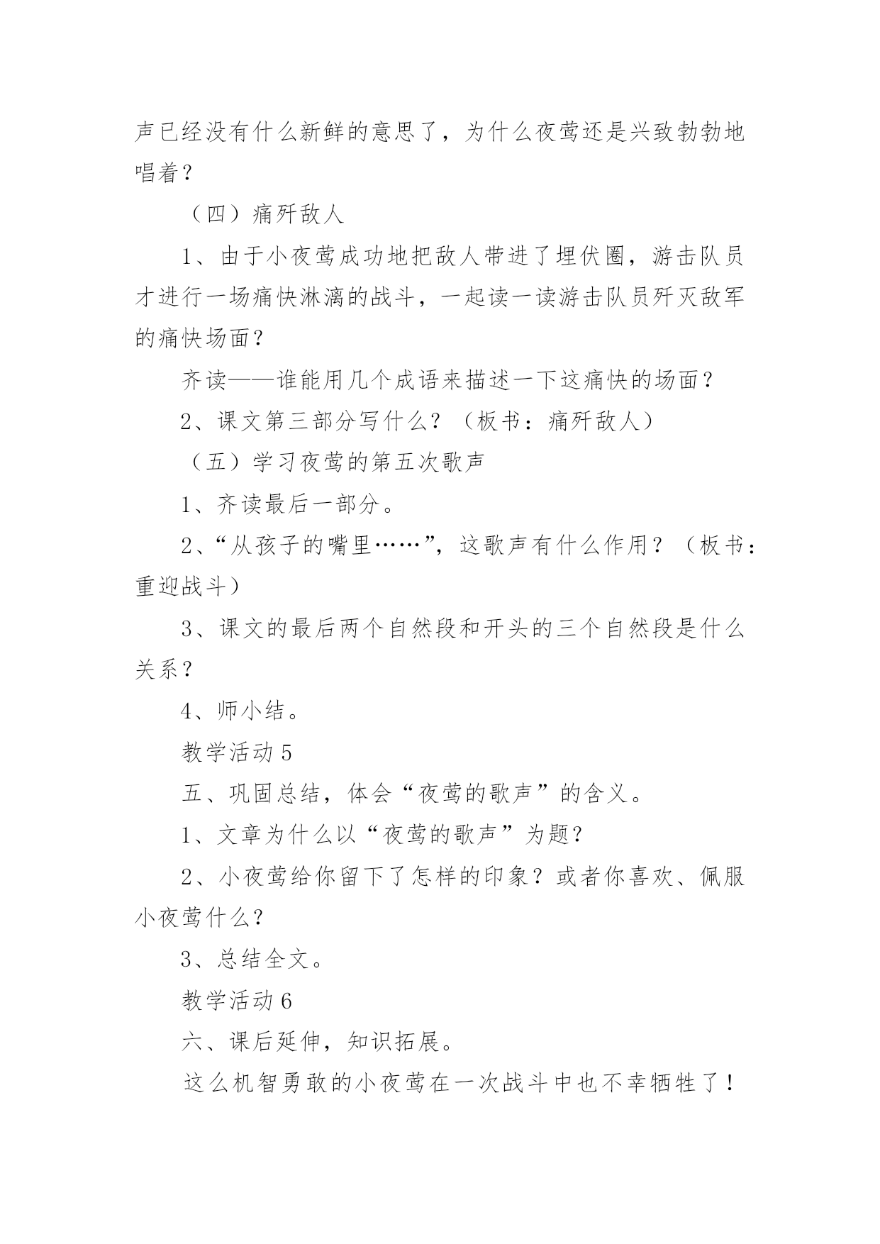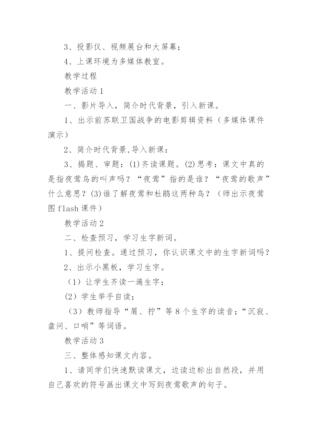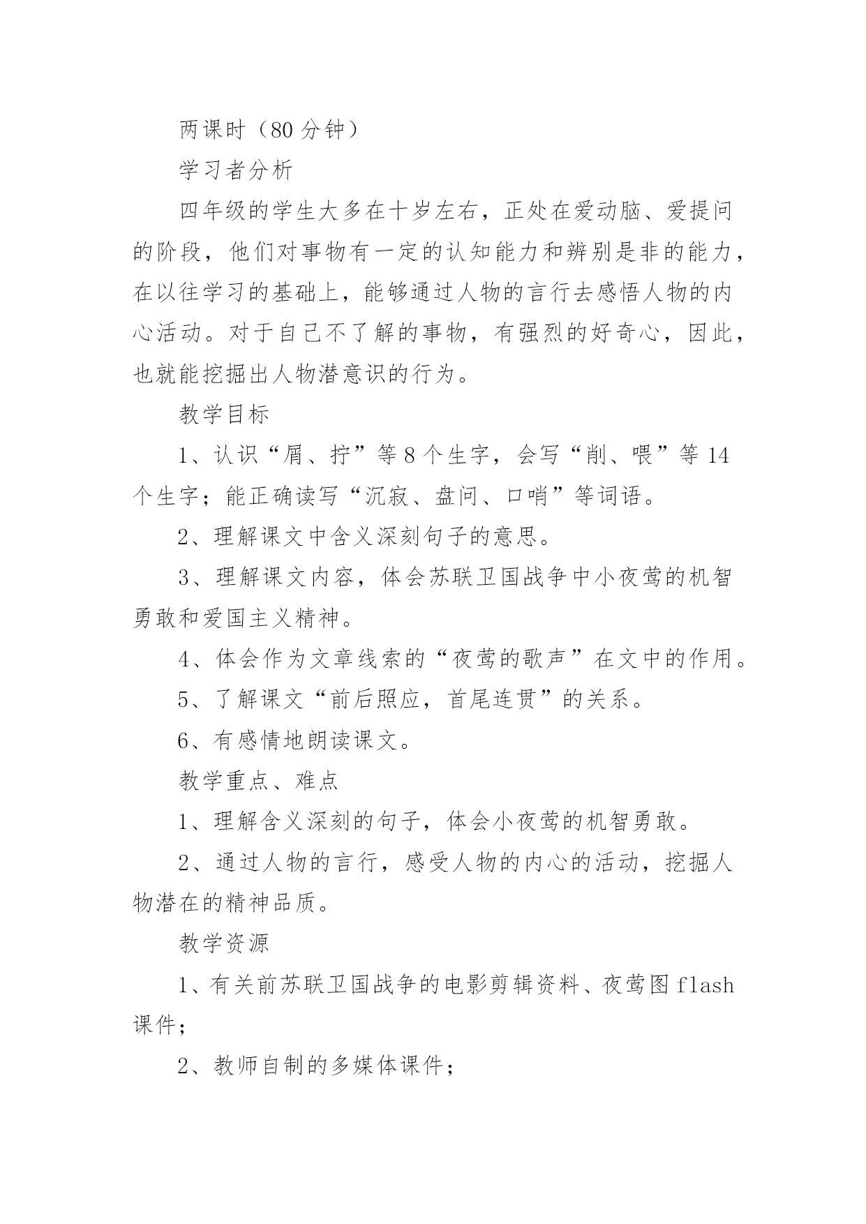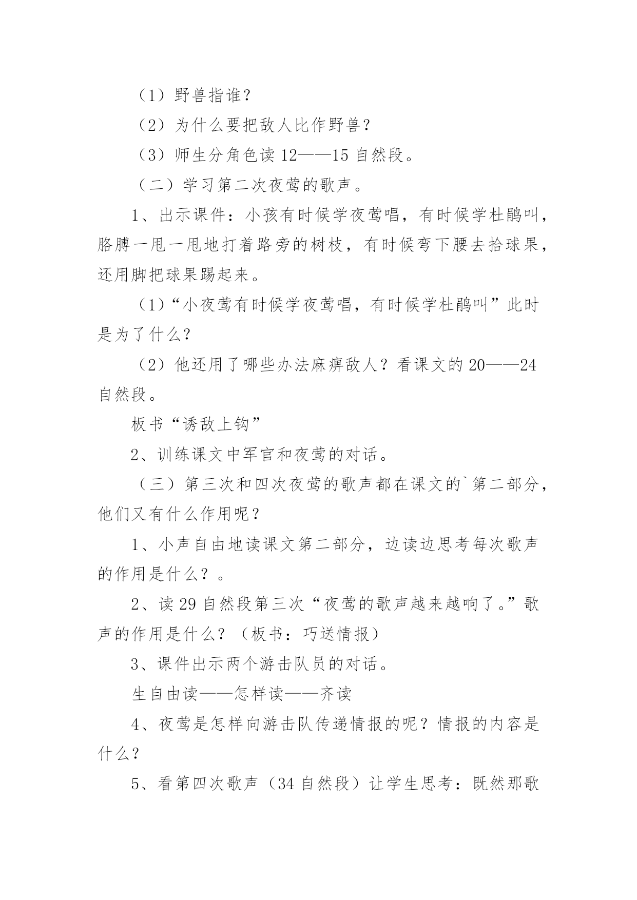 夜莺的歌声教学设计在教学工作者开展教学活动前,就不得不需要编写教学设计,教学设计是教育技术的组成部分,它的功能在于运用系统方法设计教学过程,使之成为一种具有操作性的程序。那么什么样的教学设计才是好的呢?下面是小编精心整理的夜莺的歌声教学设计,希望能够帮助到大家。夜莺的歌声教学设计1教学目标:1、正确、流利、有感情地朗读课文2、读懂课文,从“小夜莺”的精神品质中受到熏陶3、初步领会首尾照应的写法。教学重点:从故事内容中体会““小夜莺”机智勇敢的品质。教学难点:理解文章首尾照应的写法。教学时间:一课时教学过程:一、简介时代背景,导入1941年6月,德国法西斯在已经占领了欧洲许多国家之后,突然进攻苏联。苏联人民开始了卫国战争。在奋起保卫祖国的战斗中,苏联的敌后游击队非常活跃,积极配合红军奋勇作战,涌现了许多可歌可泣的动人故事。今天要学习的课文《夜莺的歌声》讲述的就是这无数事例中的生动一例。板书课题,并齐读,说说读了课题,你有什么问题?二、抓住主线,理清脉络速读全文,通过预习,说说课文主要讲了一件什么事?再观察文章在篇幅上有什么特点?(有空行)文章有几处自然空行就分为几部分,用自己的话说说各部分都写了什么?三、以读促悟,合作深究默读全文,划出课文中描写夜莺歌声的句子,并读一读,再说一说被游击队员称作小夜莺的那个孩子,给你留下了怎样的印象?着重引导以下句子的理解。1、“怎么会就剩下我一个?这里有麻雀、乌鸦、猫头鹰,多着呢。夜莺倒只有我一个!”(岔开问题,装糊涂,在敌人不易察觉中戏弄敌人,体现出他的聪明。)2、“人哪?战争一开始这里就没有人了。”“刚刚一开火,村子就着火了,大家都喊:‘野兽来了,野兽来了’--就都跑了。”(体现出他的机智勇敢,镇静。让敌人觉得他只不过是个不懂事的孩子,相信他,让他带路。)3、“你说的是一种蘑菇吗?没有,我们这里没有这种蘑菇。这里只有红蘑菇、白蘑菇,还有洋蘑菇。”(答非所问,故意岔开,暗含着对鬼子的斥责。)……四、角色朗读、体会人物特点。五、总结全文、拓展延伸1、课文的开头和结尾有什么联系?(互相呼应),从这样的开头和结尾中,你读懂了什么?(都是说小孩在发出夜莺的'歌声,以便配合游击队歼灭敌人,这样更加突出了小夜莺的机智勇敢和爱国主义精神)2、现在谁来说说文章为什么以“夜莺的歌声”为题?(1)小孩叫夜莺,他把敌人带进游击队的埋伏圈,让游击队消灭敌人,夜莺的歌声是胜利的歌声;(2)小孩用夜莺的叫声报告敌人的情况,夜莺的歌声是传递情报的声音;(3)小孩是个爱祖国、恨敌人,机智勇敢的小孩,夜莺的歌声是热爱祖国,勇敢地和敌人斗争的颂歌。3、联系实际,说说你从小夜莺的身上,学到了什么?4、你还知道哪些英雄的故事,说给大家听。板书设计:14夜莺的歌声吸引敌人麻痹敌人传递情报机智勇敢、热爱祖国夜莺的歌声教学设计2课题名称《夜莺的歌声》科目语文年级四年级教学时间两课时(80分钟)学习者分析四年级的学生大多在十岁左右,正处在爱动脑、爱提问的阶段,他们对事物有一定的认知能力和辨别是非的能力,在以往学习的基础上,能够通过人物的言行去感悟人物的内心活动。对于自己不了解的事物,有强烈的好奇心,因此,也就能挖掘出人物潜意识的行为。教学目标1、认识“屑、拧”等8个生字,会写“削、喂”等14个生字;能正确读写“沉寂、盘问、口哨”等词语。2、理解课文中含义深刻句子的意思。3、理解课文内容,体会苏联卫国战争中小夜莺的机智勇敢和爱国主义精神。4、体会作为文章线索的“夜莺的歌声”在文中的作用。5、了解课文“前后照应,首尾连贯”的关系。6、有感情地朗读课文。教学重点、难点1、理解含义深刻的句子,体会小夜莺的机智勇敢。2、通过人物的言行,感受人物的内心的活动,挖掘人物潜在的精神品质。教学资源1、有关前苏联卫国战争的电影剪辑资料、夜莺图flash课件;2、教师自制的多媒体课件;3、投影仪、视频展台和大屏幕;4、上课环境为多媒体教室。教学过程教学活动1一、影片导入,简介时代背景,引入新课。1、出示前苏联卫国战争的电影剪辑资料(多媒体课件演示)2、简介时代背景,导入新课:3、揭题、审题:(1)齐读课题。(2)思考:课文中真的是指夜莺鸟的叫声吗?“夜莺”指的是谁?“夜莺的歌声”什么意思?(3)谁了解夜莺和杜鹃这两种鸟?(师出示夜莺图flash课件)教学活动2二、检查预习,学习生字新词。1、提问检查。通过预习,你认识课文中的生字新词吗?2、出示小黑板,学习生字。(1)让学生齐读一遍生字;(2)学生举手自读;(3)教师指导“屑、拧”等8个生字的读音;“沉寂、盘问、口哨”等词语。教学活动3三、整体感知课文内容。1、请同学们快速默读课文,边读边标出自然段,并用自己喜欢的符号画出课文中写到夜莺歌声的句子。2、有几处?(2自然段、20自然段、29自然段、34自然段和3