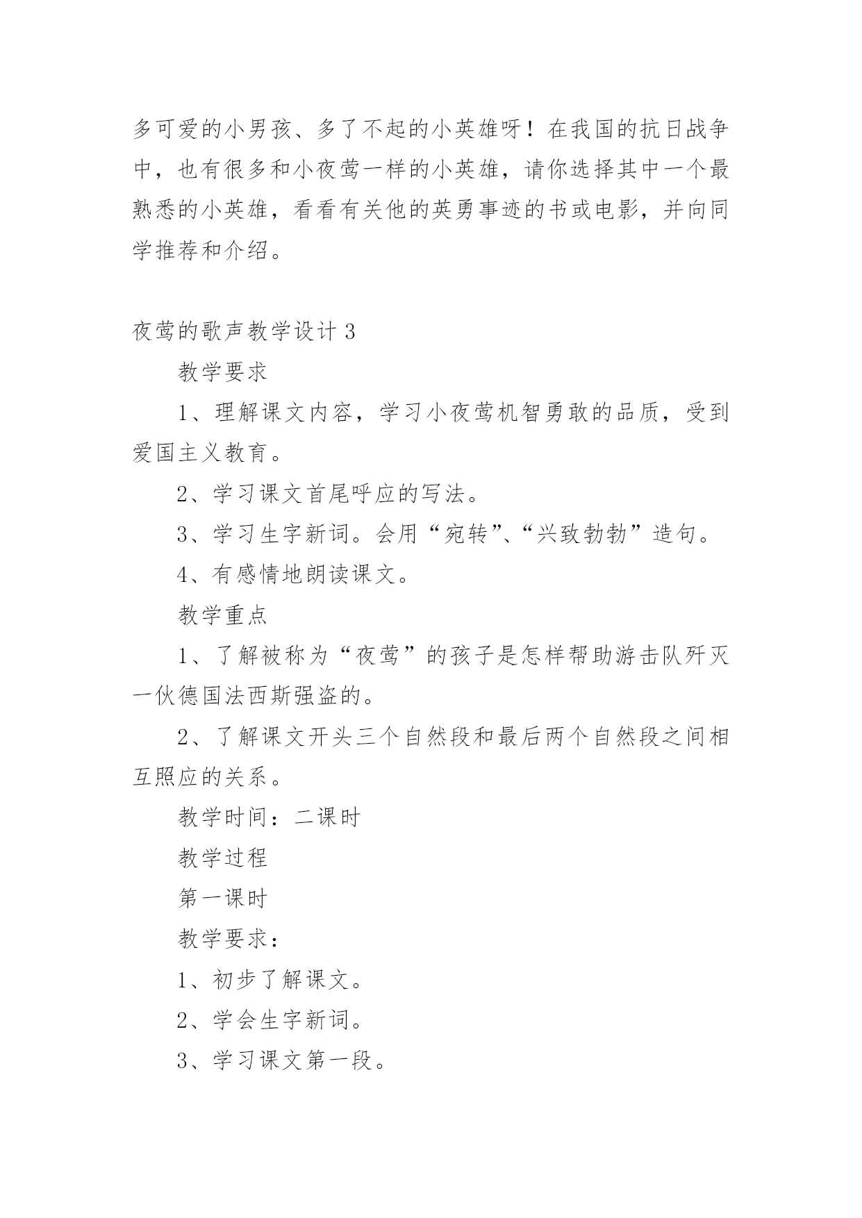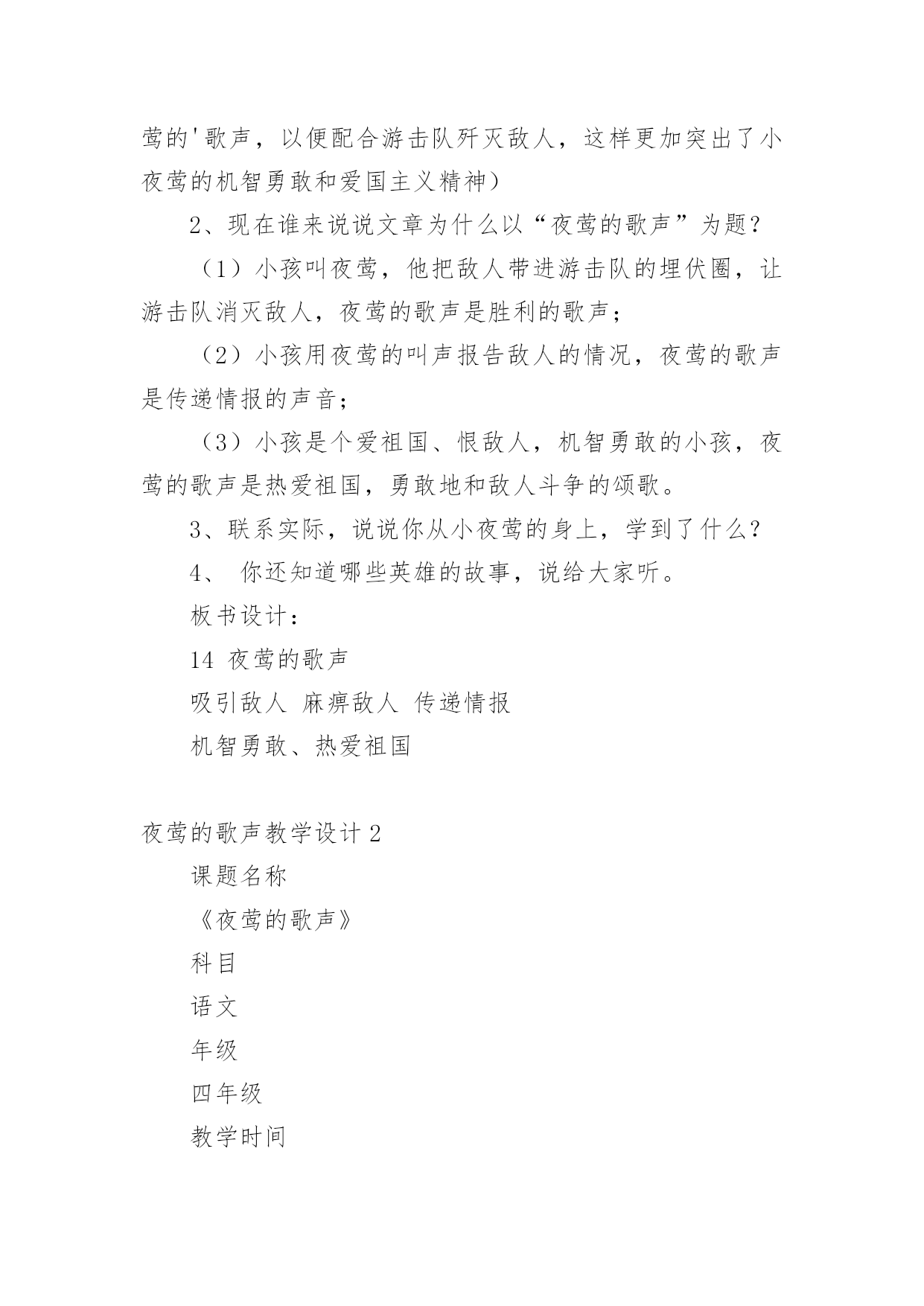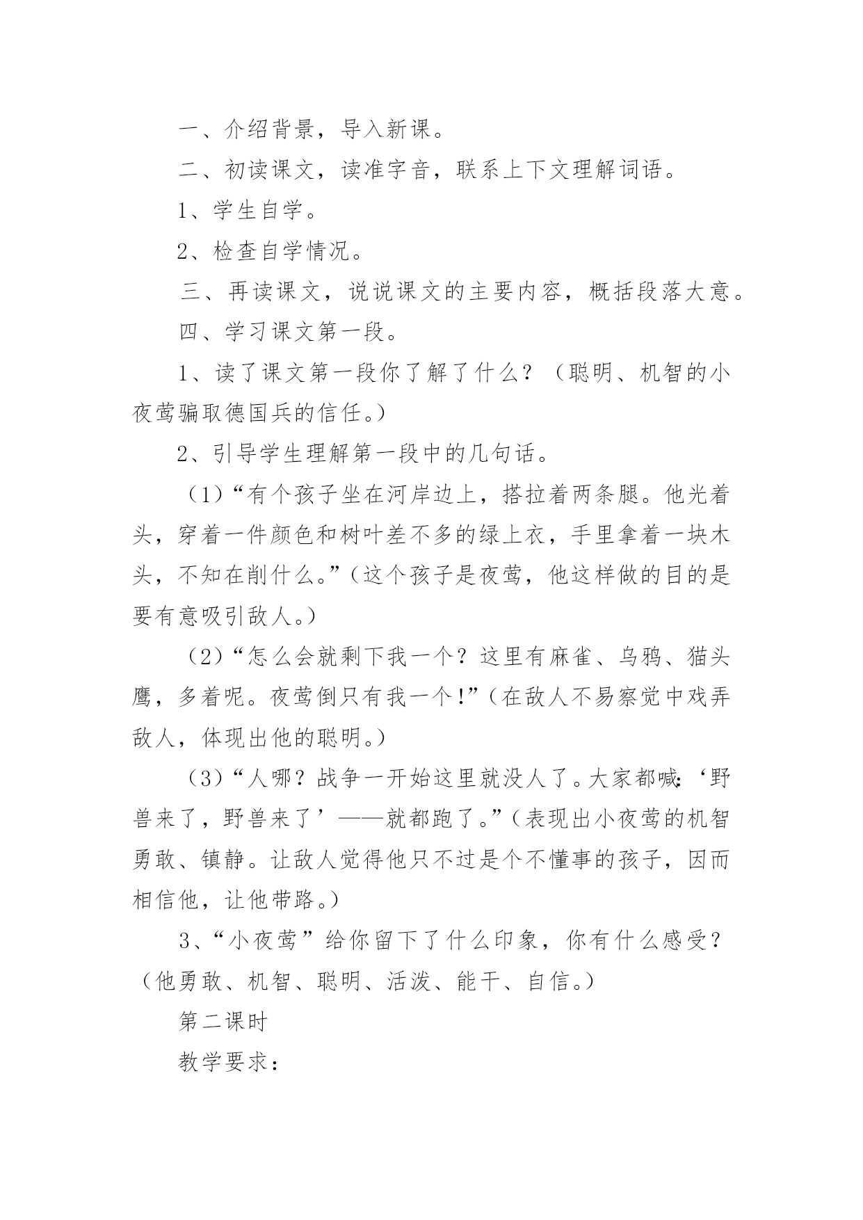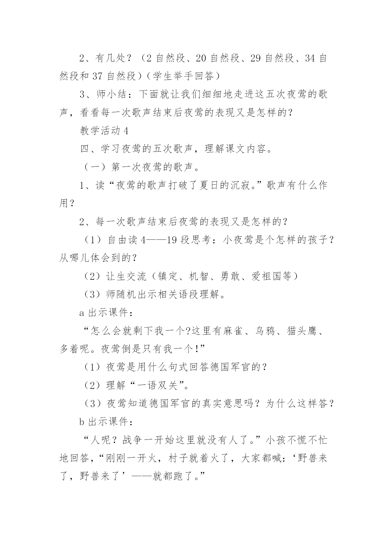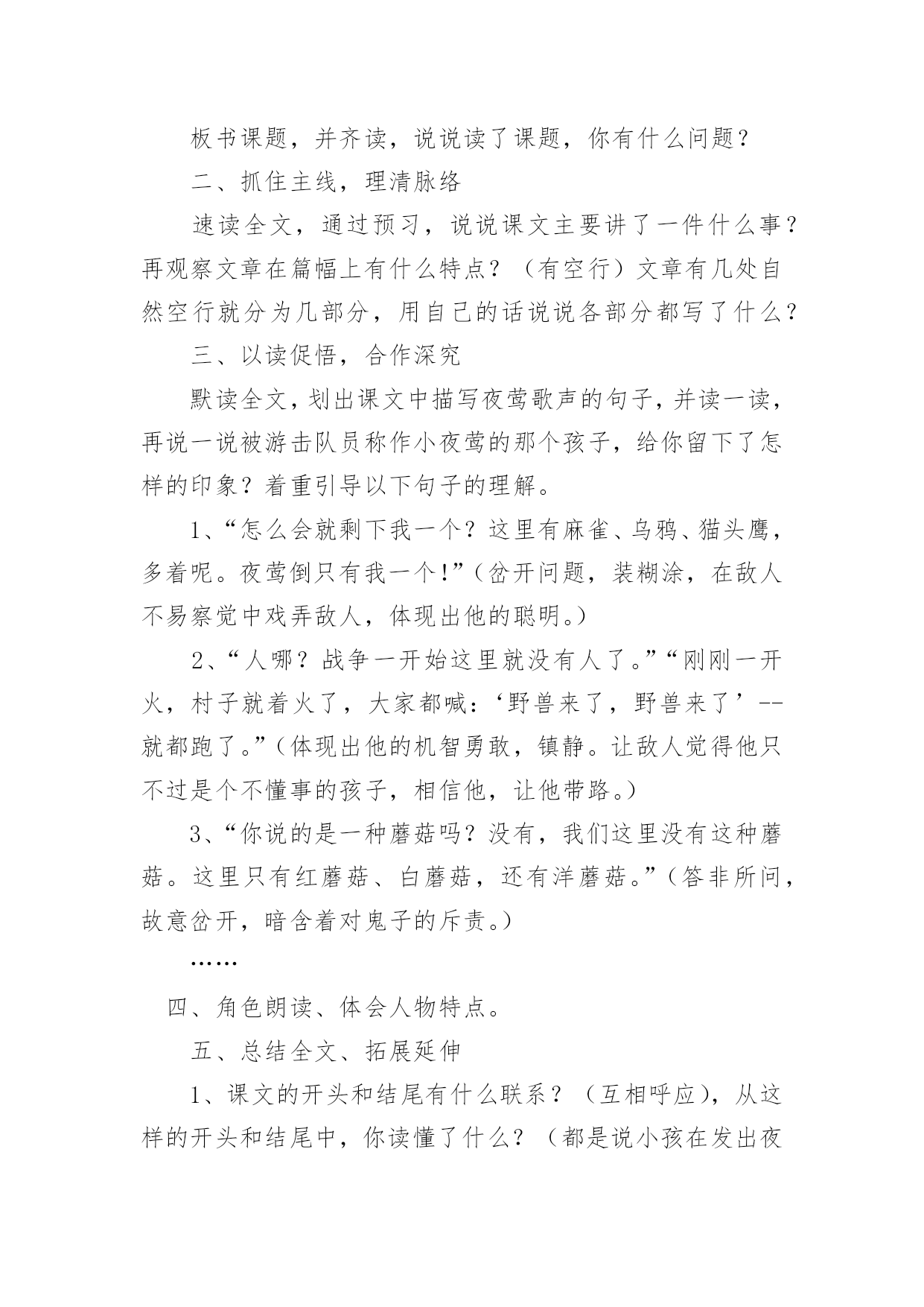夜莺的歌声教学设计在教学工作者开展教学活动前,就不得不需要编写教学设计,教学设计是教育技术的组成部分,它的功能在于运用系统方法设计教学过程,使之成为一种具有操作性的程序。那么什么样的教学设计才是好的呢?下面是小编精心整理的夜莺的歌声教学设计,希望能够帮助到大家。夜莺的歌声教学设计1教学目标:1、正确、流利、有感情地朗读课文2、读懂课文,从“小夜莺”的精神品质中受到熏陶3、初步领会首尾照应的写法。教学重点:从故事内容中体会““小夜莺”机智勇敢的品质。教学难点:理解文章首尾照应的写法。教学时间:一课时教学过程:一、简介时代背景,导入1941年6月,德国法西斯在已经占领了欧洲许多国家之后,突然进攻苏联。苏联人民开始了卫国战争。在奋起保卫祖国的战斗中,苏联的敌后游击队非常活跃,积极配合红军奋勇作战,涌现了许多可歌可泣的动人故事。今天要学习的课文《夜莺的歌声》讲述的就是这无数事例中的生动一例。板书课题,并齐读,说说读了课题,你有什么问题?二、抓住主线,理清脉络速读全文,通过预习,说说课文主要讲了一件什么事?再观察文章在篇幅上有什么特点?(有空行)文章有几处自然空行就分为几部分,用自己的话说说各部分都写了什么?三、以读促悟,合作深究默读全文,划出课文中描写夜莺歌声的句子,并读一读,再说一说被游击队员称作小夜莺的那个孩子,给你留下了怎样的印象?着重引导以下句子的理解。1、“怎么会就剩下我一个?这里有麻雀、乌鸦、猫头鹰,多着呢。夜莺倒只有我一个!”(岔开问题,装糊涂,在敌人不易察觉中戏弄敌人,体现出他的聪明。)2、“人哪?战争一开始这里就没有人了。”“刚刚一开火,村子就着火了,大家都喊:‘野兽来了,野兽来了’--就都跑了。”(体现出他的机智勇敢,镇静。让敌人觉得他只不过是个不懂事的孩子,相信他,让他带路。)3、“你说的是一种蘑菇吗?没有,我们这里没有这种蘑菇。这里只有红蘑菇、白蘑菇,还有洋蘑菇。”(答非所问,故意岔开,暗含着对鬼子的斥责。)……四、角色朗读、体会人物特点。五、总结全文、拓展延伸1、课文的开头和结尾有什么联系?(互相呼应),从这样的开头和结尾中,你读懂了什么?(都是说小孩在发出夜莺的'歌声,以便配合游击队歼灭敌人,这样更加突出了小夜莺的机智勇敢和爱国主义精神)2、现在谁来说说文章为什么以“夜莺的歌声”为题?(1)小孩叫夜莺,他把敌人带进游击队的埋伏圈,让游击队消灭敌人,夜莺的歌声是胜利的歌声;(2)小孩用夜莺的叫声报告敌人的情况,夜莺的歌声是传递情报的声音;(3)小孩是个爱祖国、恨敌人,机智勇敢的小孩,夜莺的歌声是热爱祖国,勇敢地和敌人斗争的颂歌。3、联系实际,说说你从小夜莺的身上,学到了什么?4、你还知道哪些英雄的故事,说给大家听。板书设计:14夜莺的歌声吸引敌人麻痹敌人传递情报机智勇敢、热爱祖国夜莺的歌声教学设计2课题名称《夜莺的歌声》科目语文年级四年级教学时间两课时(80分钟)学习者分析四年级的学生大多在十岁左右,正处在爱动脑、爱提问的阶段,他们对事物有一定的认知能力和辨别是非的能力,在以往学习的基础上,能够通过人物的言行去感悟人物的内心活动。对于自己不了解的事物,有强烈的好奇心,因此,也就能挖掘出人物潜意识的行为。教学目标1、认识“屑、拧”等8个生字,会写“削、喂”等14个生字;能正确读写“沉寂、盘问、口哨”等词语。2、理解课文中含义深刻句子的意思。3、理解课文内容,体会苏联卫国战争中小夜莺的机智勇敢和爱国主义精神。4、体会作为文章线索的“夜莺的歌声”在文中的作用。5、了解课文“前后照应,首尾连贯”的关系。6、有感情地朗读课文。教学重点、难点1、理解含义深刻的句子,体会小夜莺的机智勇敢。2、通过人物的言行,感受人物的内心的活动,挖掘人物潜在的精神品质。教学资源1、有关前苏联卫国战争的电影剪辑资料、夜莺图flash课件;2、教师自制的多媒体课件;3、投影仪、视频展台和大屏幕;4、上课环境为多媒体教室。教学过程教学活动1一、影片导入,简介时代背景,引入新课。1、出示前苏联卫国战争的电影剪辑资料(多媒体课件演示)2、简介时代背景,导入新课:3、揭题、审题:(1)齐读课题。(2)思考:课文中真的是指夜莺鸟的叫声吗?“夜莺”指的是谁?“夜莺的歌声”什么意思?(3)谁了解夜莺和杜鹃这两种鸟?(师出示夜莺图flash课件)教学活动2二、检查预习,学习生字新词。1、提问检查。通过预习,你认识课文中的生字新词吗?2、出示小黑板,学习生字。(1)让学生齐读一遍生字;(2)学生举手自读;(3)教师指导“屑、拧”等8个生字的读音;“沉寂、盘问、口哨”等词语。教学活动3三、整体感知课文内容。1、请同学们快速默读课文,边读边标出自然段,并用自己喜欢的符号画出课文中写到夜莺歌声的句子。2、有几处?(2自然段、20自然段、29自然段、34自然段和3
