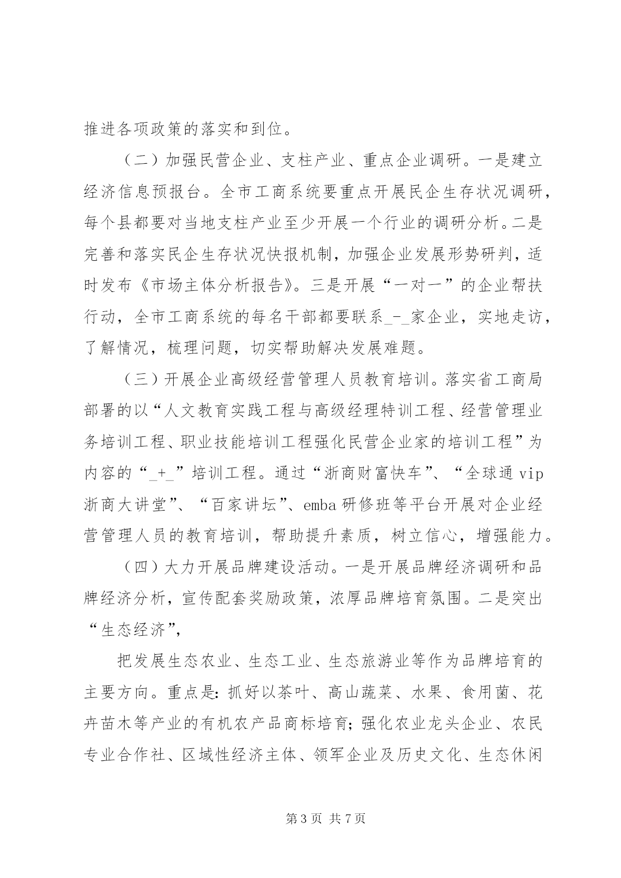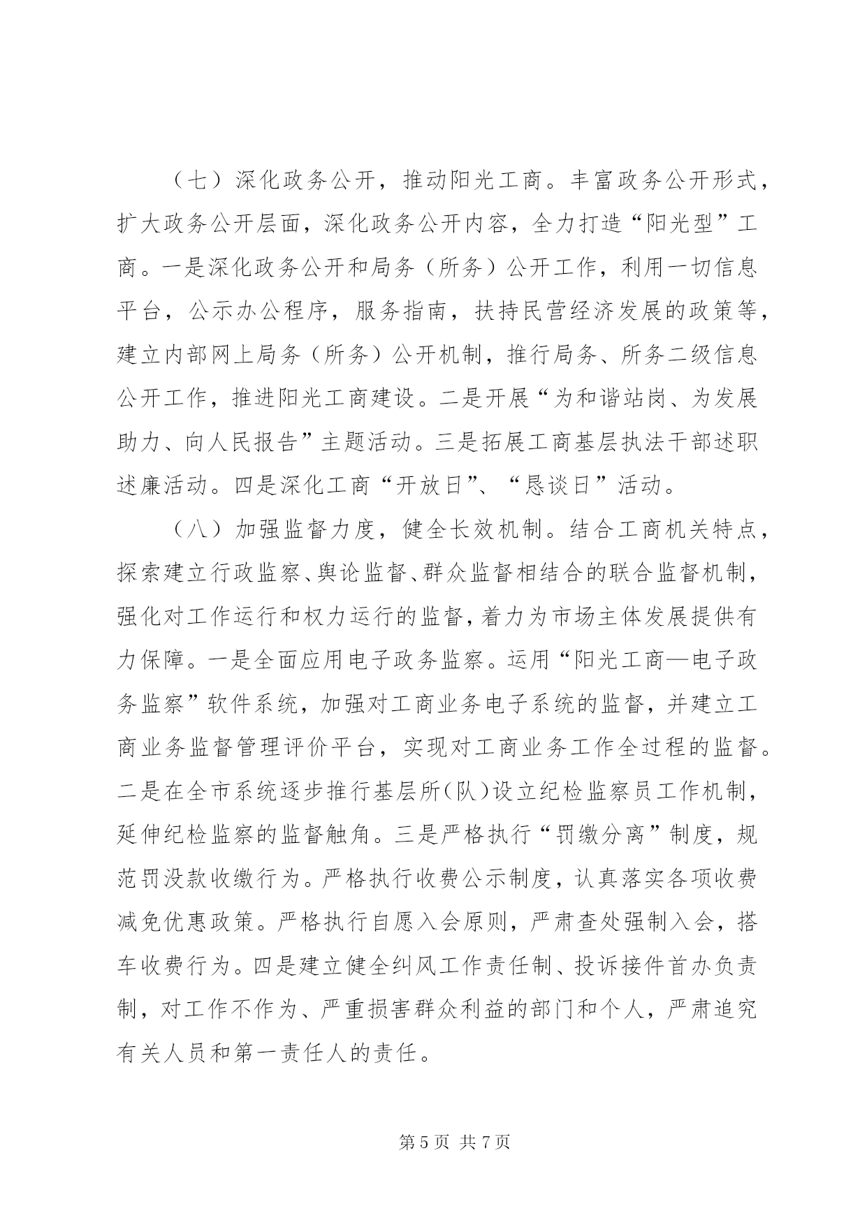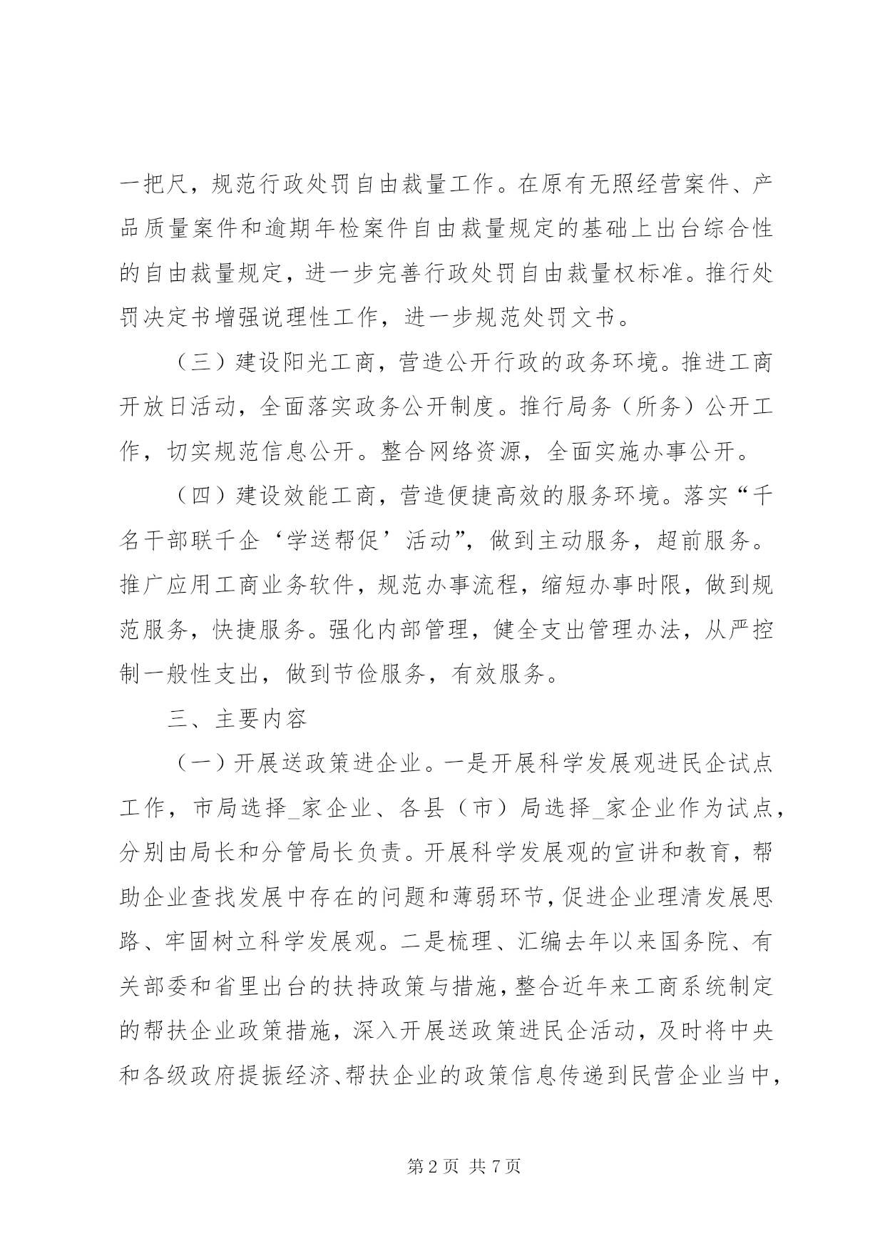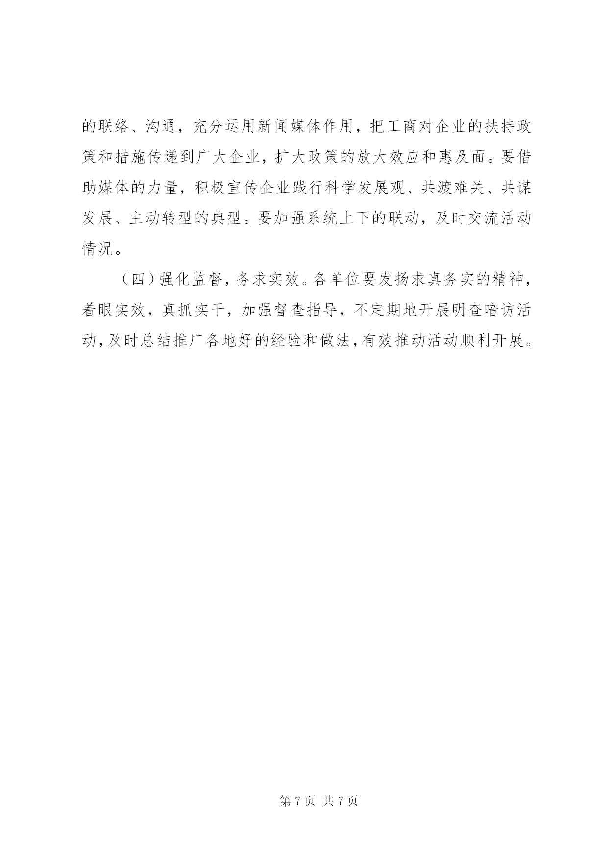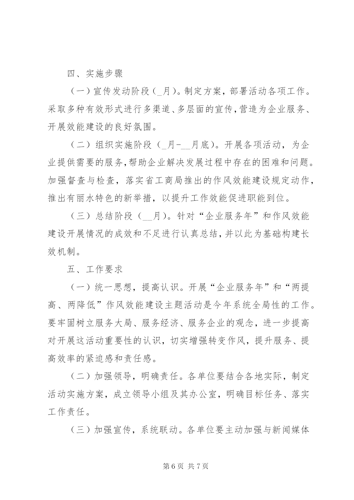 第PAGE\*Arabic\*MERGEFORMAT7页共NUMPAGES\*MERGEFORMAT7页市工商局作风效能建设活动方案为贯彻落实省委、省政府“标本兼治、保稳促调”的决策部署,保持经济平稳较快发展和社会和谐稳定,巩固学习实践科学发展观活动的成果,根据省委省政府及省工商局相关文件要求,市局就全市工商系统开展“企业服务年”和“两提高、两降低”作风效能建设主题活动制定本活动方案。一、指导思想以邓小平理论和“三个代表”重要思想为指导,认真贯彻党的十七大、十七届三中全会精神,按照中央保增长扩内需调结构的要求,用特殊时期的特别助动、特别维护、特别监管和对队伍的特别要求来践行科学发展观,深入推进机关作风建设,提高工作效能,创新服务方法,提高服务质量,落实服务措施,降低公务支出,降低行政成本,实现“服务效能大提速”,为各类市场主体提供良好的发展环境,为“创业富民、创新强市”总战略的实施提供有力保障,推进我市经济又好又快发展。二、工作目标(一)建设服务型工商,营造健康有序的市场环境。以帮扶企业,助动经济,提升理念,科学监管,关注民生,消费维权为重点,维护市场秩序,发展市场主体,实现以民为本的消费安全,为保持经济平稳较快发展作出贡献。(二)建设法治工商,营造规范行政的法治环境。坚持办案一把尺,规范行政处罚自由裁量工作。在原有无照经营案件、产品质量案件和逾期年检案件自由裁量规定的基础上出台综合性的自由裁量规定,进一步完善行政处罚自由裁量权标准。推行处罚决定书增强说理性工作,进一步规范处罚文书。(三)建设阳光工商,营造公开行政的政务环境。推进工商开放日活动,全面落实政务公开制度。推行局务(所务)公开工作,切实规范信息公开。整合网络资源,全面实施办事公开。(四)建设效能工商,营造便捷高效的服务环境。落实“千名干部联千企‘学送帮促’活动”,做到主动服务,超前服务。推广应用工商业务软件,规范办事流程,缩短办事时限,做到规范服务,快捷服务。强化内部管理,健全支出管理办法,从严控制一般性支出,做到节俭服务,有效服务。三、主要内容(一)开展送政策进企业。一是开展科学发展观进民企试点工作,市局选择_家企业、各县(市)局选择_家企业作为试点,分别由局长和分管局长负责。开展科学发展观的宣讲和教育,帮助企业查找发展中存在的问题和薄弱环节,促进企业理清发展思路、牢固树立科学发展观。二是梳理、汇编去年以来国务院、有关部委和省里出台的扶持政策与措施,整合近年来工商系统制定的帮扶企业政策措施,深入开展送政策进民企活动,及时将中央和各级政府提振经济、帮扶企业的政策信息传递到民营企业当中,推进各项政策的落实和到位。(二)加强民营企业、支柱产业、重点企业调研。一是建立经济信息预报台。全市工商系统要重点开展民企生存状况调研,每个县都要对当地支柱产业至少开展一个行业的调研分析。二是完善和落实民企生存状况快报机制,加强企业发展形势研判,适时发布《市场主体分析报告》。三是开展“一对一”的企业帮扶行动,全市工商系统的每名干部都要联系_-_家企业,实地走访,了解情况,梳理问题,切实帮助解决发展难题。(三)开展企业高级经营管理人员教育培训。落实省工商局部署的以“人文教育实践工程与高级经理特训工程、经营管理业务培训工程、职业技能培训工程强化民营企业家的培训工程”为内容的“_+_”培训工程。通过“浙商财富快车”、“全球通vip浙商大讲堂”、“百家讲坛”、emba研修班等平台开展对企业经营管理人员的教育培训,帮助提升素质,树立信心,增强能力。(四)大力开展品牌建设活动。一是开展品牌经济调研和品牌经济分析,宣传配套奖励政策,浓厚品牌培育氛围。二是突出“生态经济”,把发展生态农业、生态工业、生态旅游业等作为品牌培育的主要方向。重点是:抓好以茶叶、高山蔬菜、水果、食用菌、花卉苗木等产业的有机农产品商标培育;强化农业龙头企业、农民专业合作社、区域性经济主体、领军企业及历史文化、生态休闲旅游、农家乐、专业商标品牌基地等培育;运作好地方特色证明商标的申报注册。三是开展品牌战略指导,以拓展品牌论坛、派驻品牌指导员、建立品牌指导站等抓手,推进品牌战略指导。特别关注证明商标的跟踪指导,实现一个品牌带动一方产业,活跃一方经济,惠及一方百姓。(五)倾情服务三农,助推新农村建设。一是订单农业重点关注范围拓展、订单数量和金额增长、服务站创建、完善示范文本、实施涉农企业信用分类监管等,取得明显成效。二是鼓励引导返乡民工创业。三是扶持农家乐、经纪人、农产品连锁、农民专业合作社等涉农市场主体发展。四是强化红盾护农,突出抓好农资市场监管。(六)强化效能建设,优化服务质量。开展“提高工作效率、提高服务水平、降低公务支出、降低行政成本”为主要内容的效能建设主题活动,积极创建“效能建设示范单位”、“服务效