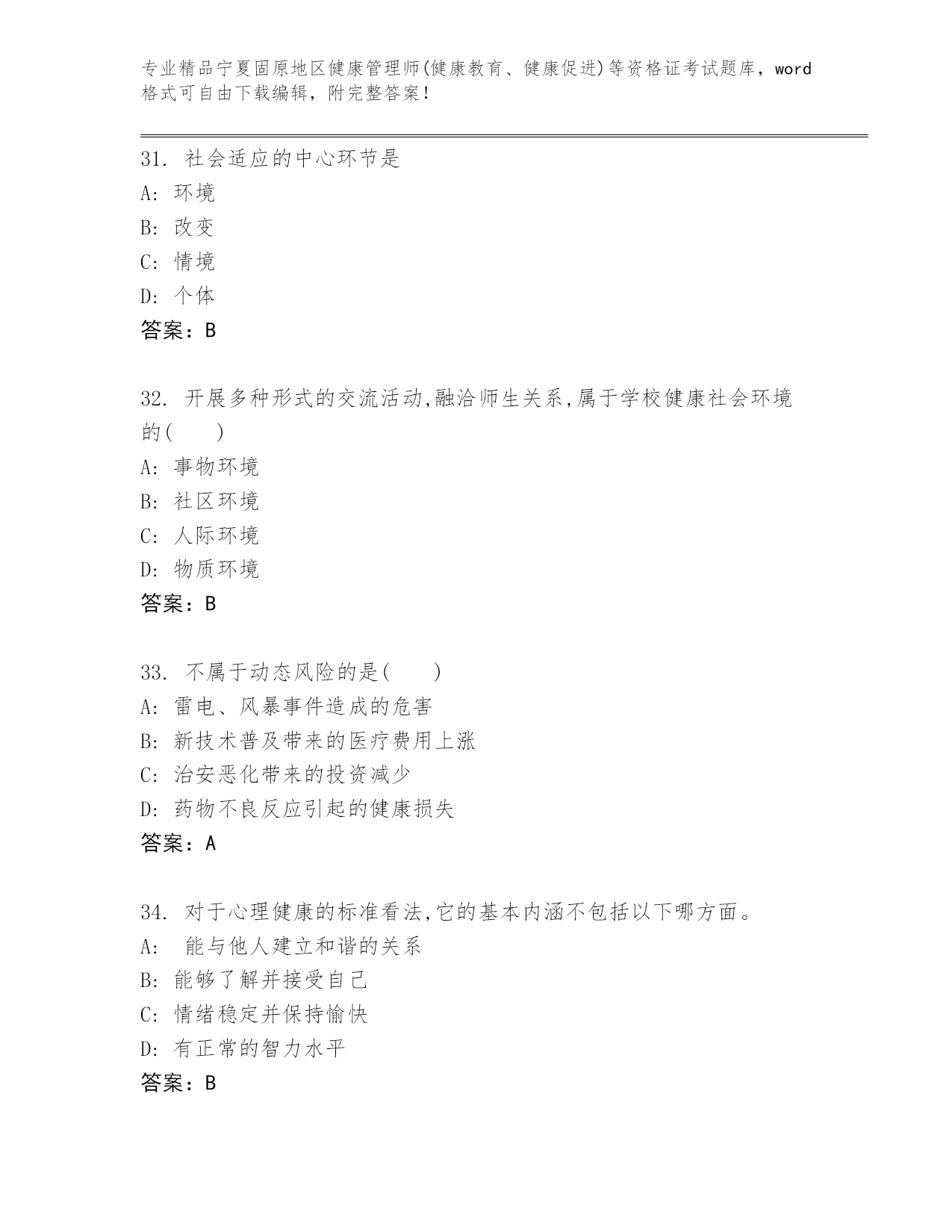完整版宁夏固原地区健康管理师(健康教育、健康促进)等资格证考试大全精品及答案