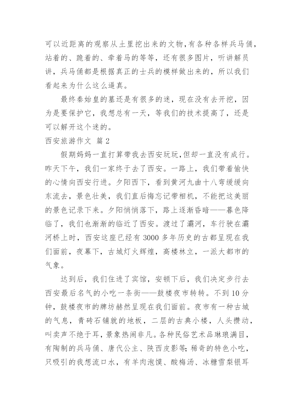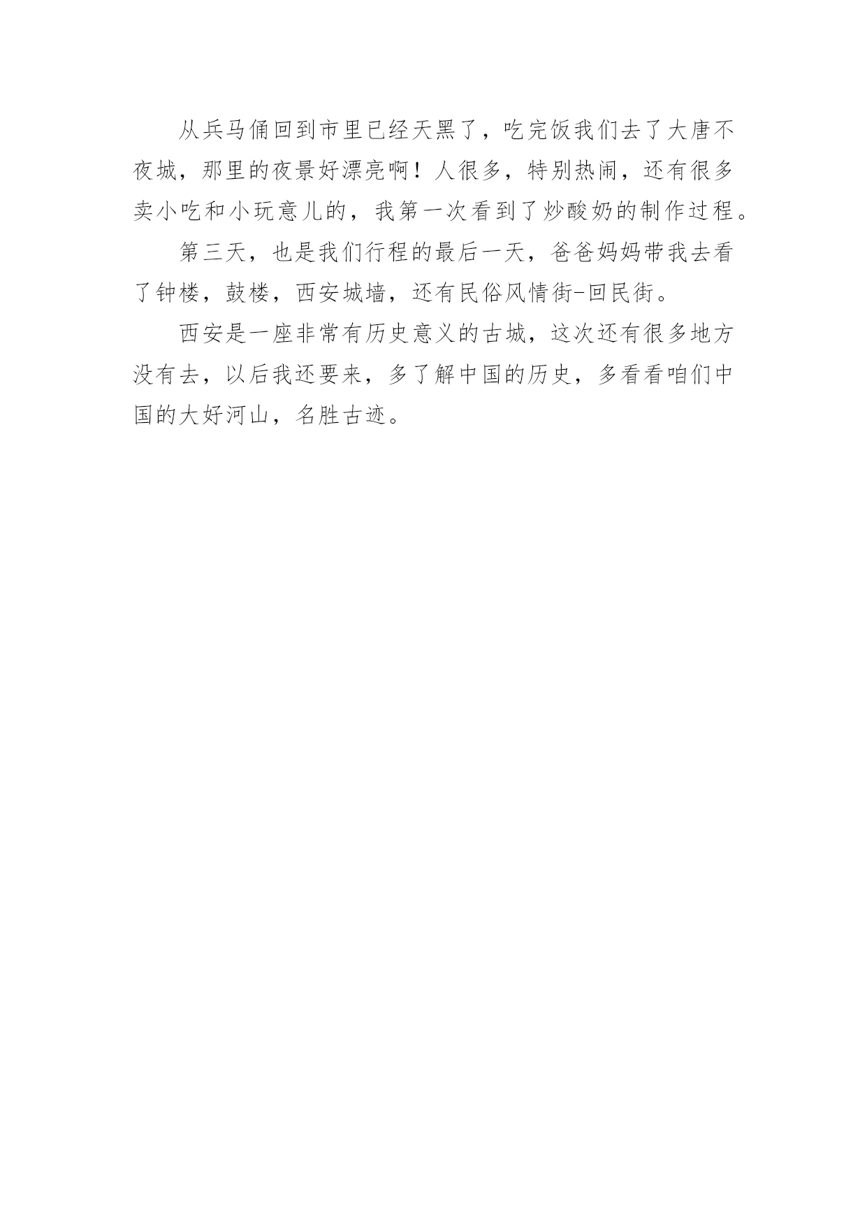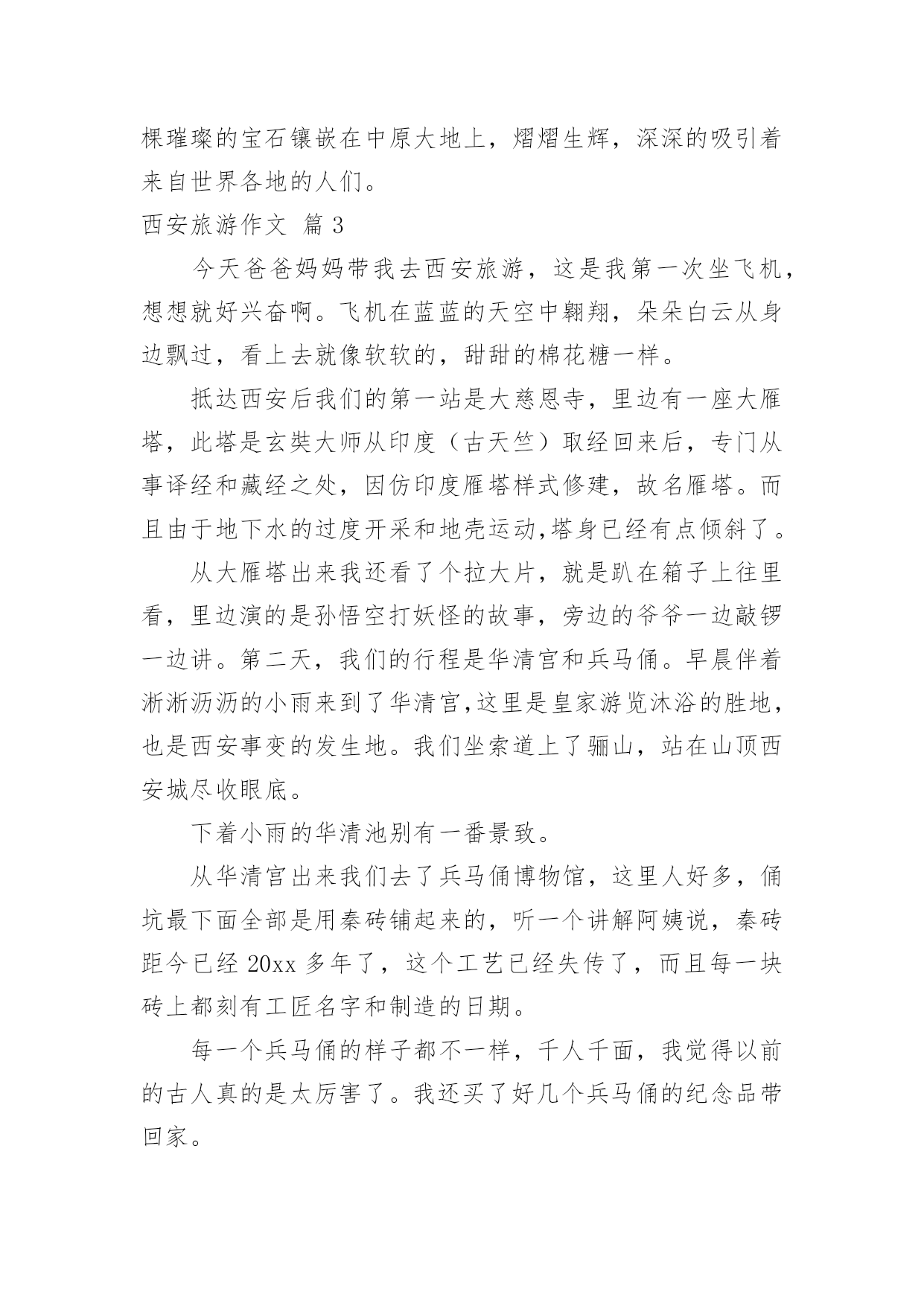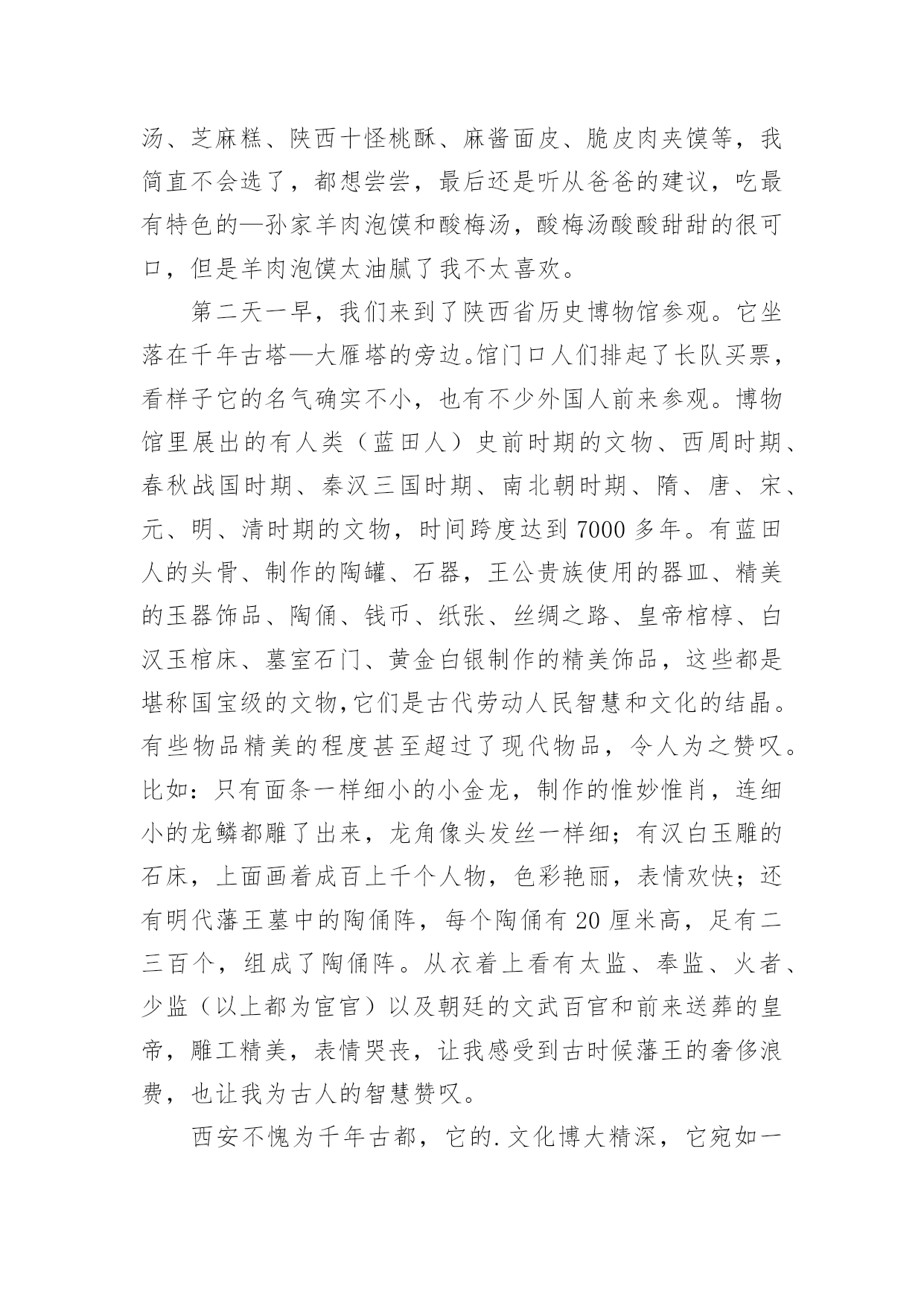 西安旅游作文精选西安旅游作文3篇在平日的学习、工作和生活里,大家一定都接触过作文吧,作文可分为小学作文、中学作文、大学作文(论文)。相信许多人会觉得作文很难写吧,下面是小编帮大家整理的西安旅游作文3篇,供大家参考借鉴,希望可以帮助到有需要的朋友。西安旅游作文篇1今年暑假我、妈妈和外公一起去西安旅游。一到西安,我到旅馆放了下行李,就坐车去兵马俑。到了兵马俑我们来到了1号厅,只见里面有一个很大很大的黄土坑,坑里面有数以万计的卫兵、马和战车。突然,我看到了好大一块布盖在土上面,后来我听讲解员说了才知道,布下面是有颜色的兵马俑,现在不敢挖出来,因为现在的技术还不行,一挖出来,见了阳光颜色就会没有了,都象现在的这样的土青色。我们又来到2号厅,里面的展品和1号厅差不多,只是有一些工作人员还在挖文物、拼碎片。里面的光线暗暗地,听说也是为了保护文物,当然也不允许用闪光灯拍照。接下来的3号厅也和前面2个厅差不多,主要有青铜战车,透过玻璃还是可以看到以前的青铜工艺还是很厉害,马做得很逼真,我觉得以前的工匠们的技术一点也不比现在人差。最后来到了4号厅,它是最独一无二的了,因为里面可以近距离的观察从土里挖出来的文物,有各种各样兵马俑,站着的、跪着的、牵着马的等等,还有很多图片,听讲解员讲,兵马俑都是根据真正的士兵的模样做出来的,所以我们看起来为什么这么逼真。最终秦始皇的墓还是有很多的迷,现在没有去开挖,因为是要保护它,我想总有一天,等我们的技术提高了,还是可以解开这个迷的。西安旅游作文篇2假期妈妈一直打算带我去西安玩玩,但却一直没有成行。昨天下午,我们一家终于去了西安。一路上,我们带着愉快的心情向西安行进。夕阳西下,看到黄河九曲十八弯缓缓向东流去,景色壮美,我们直后悔忘记带相机,不能把这美丽的景色记录下来。夕阳悄悄落下,路上逐渐昏暗——暮色降临了,我们也渐渐的临近了西安。渡过了灞河,车行驶在灞河桥上时,西安这座已经有3000多年历史的古都呈现在我们面前,夜幕下,古城灯火辉煌,高楼林立,一派大都市的气象。达到后,我们住进了宾馆,安顿下后,我们决定步行去西安最后名气的小吃一条街——鼓楼夜市转转。不到10分钟,鼓楼夜市的牌坊赫然呈现在我们面前。夜市有一种古城的气息,青砖石铺就的地板,二层的古典小楼,人头攒动,叫卖声不绝于耳,景象热闹非凡。各种民俗艺术品琳琅满目,有陶制的兵马俑、唐代公主、陕西皮影等;稀奇的特色小吃,只吸引的我想流口水,有羊肉泡馍、酸梅汤、冰糖雪梨银耳汤、芝麻糕、陕西十怪桃酥、麻酱面皮、脆皮肉夹馍等,我简直不会选了,都想尝尝,最后还是听从爸爸的建议,吃最有特色的—孙家羊肉泡馍和酸梅汤,酸梅汤酸酸甜甜的很可口,但是羊肉泡馍太油腻了我不太喜欢。第二天一早,我们来到了陕西省历史博物馆参观。它坐落在千年古塔—大雁塔的旁边。馆门口人们排起了长队买票,看样子它的名气确实不小,也有不少外国人前来参观。博物馆里展出的有人类(蓝田人)史前时期的文物、西周时期、春秋战国时期、秦汉三国时期、南北朝时期、隋、唐、宋、元、明、清时期的文物,时间跨度达到7000多年。有蓝田人的头骨、制作的陶罐、石器,王公贵族使用的器皿、精美的玉器饰品、陶俑、钱币、纸张、丝绸之路、皇帝棺椁、白汉玉棺床、墓室石门、黄金白银制作的精美饰品,这些都是堪称国宝级的文物,它们是古代劳动人民智慧和文化的结晶。有些物品精美的程度甚至超过了现代物品,令人为之赞叹。比如:只有面条一样细小的小金龙,制作的惟妙惟肖,连细小的龙鳞都雕了出来,龙角像头发丝一样细;有汉白玉雕的石床,上面画着成百上千个人物,色彩艳丽,表情欢快;还有明代藩王墓中的陶俑阵,每个陶俑有20厘米高,足有二三百个,组成了陶俑阵。从衣着上看有太监、奉监、火者、少监(以上都为宦官)以及朝廷的文武百官和前来送葬的皇帝,雕工精美,表情哭丧,让我感受到古时候藩王的奢侈浪费,也让我为古人的智慧赞叹。西安不愧为千年古都,它的.文化博大精深,它宛如一棵璀璨的宝石镶嵌在中原大地上,熠熠生辉,深深的吸引着来自世界各地的人们。西安旅游作文篇3今天爸爸妈妈带我去西安旅游,这是我第一次坐飞机,想想就好兴奋啊。飞机在蓝蓝的天空中翱翔,朵朵白云从身边飘过,看上去就像软软的,甜甜的棉花糖一样。抵达西安后我们的第一站是大慈恩寺,里边有一座大雁塔,此塔是玄奘大师从印度(古天竺)取经回来后,专门从事译经和藏经之处,因仿印度雁塔样式修建,故名雁塔。而且由于地下水的过度开采和地壳运动,塔身已经有点倾斜了。从大雁塔出来我还看了个拉大片,就是趴在箱子上往里看,里边演的是孙悟空打妖怪的故事,旁边的爷爷一边敲锣一边讲。第二天,我们的行程是华清宫和兵马俑。早晨伴着淅淅沥沥的小雨来到了华清宫,这里是皇家游览沐浴的胜地,也是西安事变的发生地。我们坐索道上了骊山,站在山顶西安城尽收眼底。下着小雨