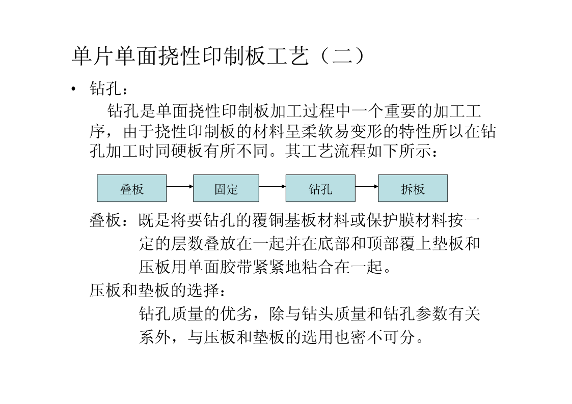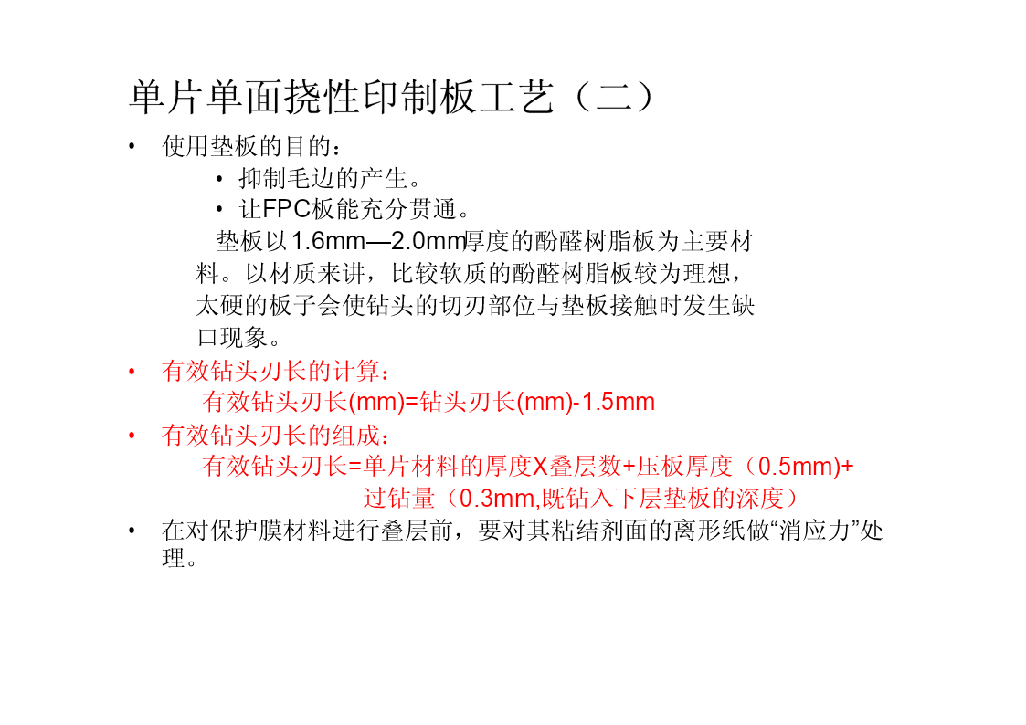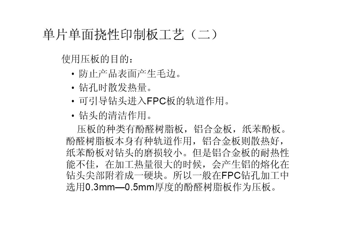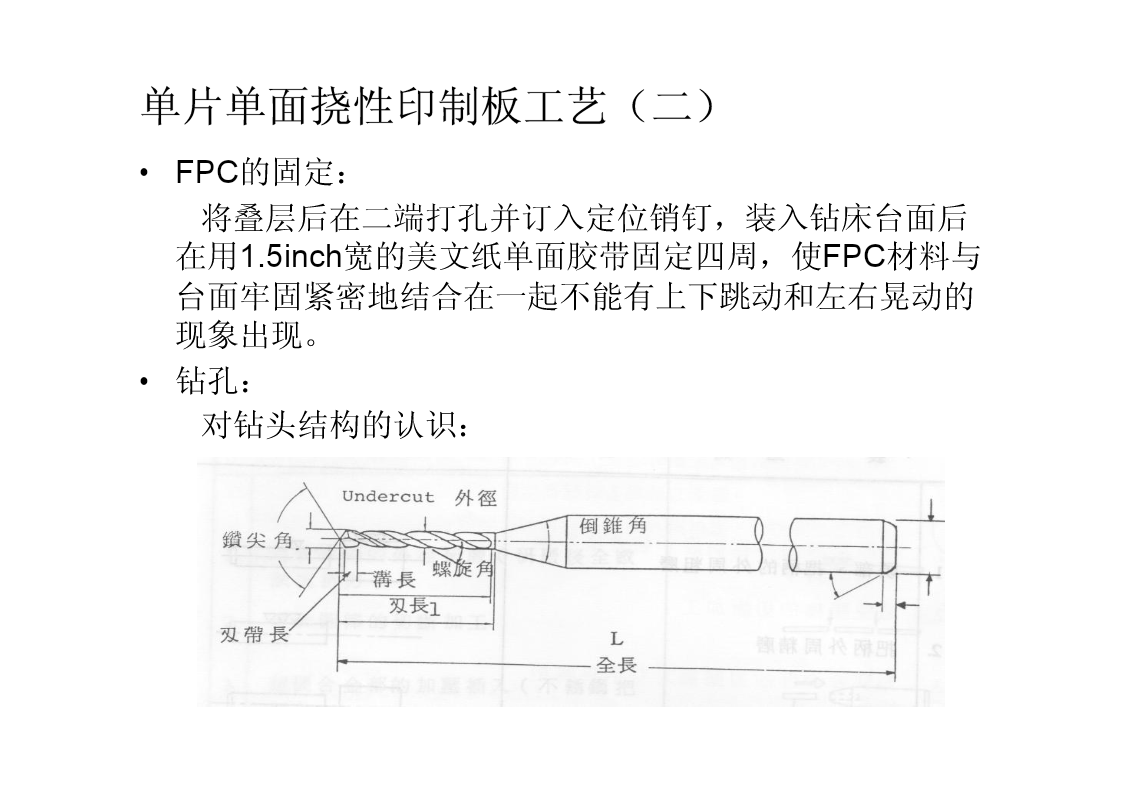单片单面挠性印制板制造工艺单片多层,刚挠印制板制造工艺成立群单片单面挠性印制板制造工艺单片单面挠性印制板工艺流程单片单面挠性印制板工艺(一)•材料的切割:挠性印制印制板的材料主要分为二大部份;第一类是:覆铜基板材料,按绝缘材料的类型又可分为聚酰亚胺和聚酯类;按导电铜箔的类型又可分为压延铜箔和电解铜箔;按结构分又可分为三层结构(有胶基材)和二层结构(无胶基材)。第二类是:保护膜材料,按材料的类型可分为聚酰亚胺和聚酯类。在材料的切割过程要做到切割尺寸的规整,避免使用正方形的切割尺寸。对使用压延铜箔基材时要注意铜箔的压延方向与设计时的要求一致。单片单面挠性印制板工艺(二)•钻孔:钻孔是单面挠性印制板加工过程中一个重要的加工工序,由于挠性印制板的材料呈柔软易变形的特性所以在钻孔加工时同硬板有所不同。其工艺流程如下所示:叠板固定钻孔拆板叠板:既是将要钻孔的覆铜基板材料或保护膜材料按一定的层数叠放在一起并在底部和顶部覆上垫板和压板用单面胶带紧紧地粘合在一起。压板和垫板的选择:钻孔质量的优劣,除与钻头质量和钻孔参数有关系外,与压板和垫板的选用也密不可分。单片单面挠性印制板工艺(二)使用压板的目的:•防止产品表面产生毛边。•钻孔时散发热量。•可引导钻头进入FPC板的轨道作用。•钻头的清洁作用。压板的种类有酚醛树脂板,铝合金板,纸苯酚板。酚醛树脂板本身有种轨道作用,铝合金板则散热好,纸苯酚板对钻头的磨损较小。但是铝合金板的耐热性能不佳,在加工热量很大的时候,会产生铝的熔化在钻头尖部附着成一硬块。所以一般在FPC钻孔加工中选用0.3mm—0.5mm厚度的酚醛树脂板作为压板。单片单面挠性印制板工艺(二)•使用垫板的目的:•抑制毛边的产生。•让FPC板能充分贯通。垫板以1.6mm—2.0mm厚度的酚醛树脂板为主要材料。以材质来讲,比较软质的酚醛树脂板较为理想,太硬的板子会使钻头的切刃部位与垫板接触时发生缺口现象。•有效钻头刃长的计算:有效钻头刃长(mm)=钻头刃长(mm)-1.5mm•有效钻头刃长的组成:有效钻头刃长=单片材料的厚度X叠层数+压板厚度(0.5mm)+过钻量(0.3mm,既钻入下层垫板的深度)•在对保护膜材料进行叠层前,要对其粘结剂面的离形纸做“消应力”处理。单片单面挠性印制板工艺(二)•FPC的固定:将叠层后在二端打孔并订入定位销钉,装入钻床台面后在用1.5inch宽的美文纸单面胶带固定四周,使FPC材料与台面牢固紧密地结合在一起不能有上下跳动和左右晃动的现象出现。•钻孔:对钻头结构的认识:单片单面挠性印制板工艺(二)•各部分的功能:(1)钻尖角钻尖角影响切削物的排出方向和切削物的形状以及切削抵抗,毛边等的产生。*钻尖角较大的钻头,其排出物成粒状,比较易于屑的排出,如果钻尖角比较小的话,排出物则成条状,易造成钻头的折断和孔壁的粗糙。单片单面挠性印制板工艺(二)*切削抵抗是进刀速度,F一定时,钻尖角如果比较小则在钻头上的推力(V)减小,扭矩(H)增加。反之,如果钻尖角较大,则推力增大,扭矩减小。综合起来切削抵抗是钻尖角大的时候比较小。*毛边的产生是由于钻屑不能及时被排出造成的。钻屑的排出能力与钻尖角有一定的关系,钻尖角比较小的时候其切削部长度比较长则会有不良的影响,又在一样的钻尖角情况下,如果钻头的外径增大时,切削部的长度也会加长,所以为了减短其长度的增加,以及时钻屑的排出更容易,因此随着钻头外径的增大有必要将钻头的钻尖角角度也同时加大。单片单面挠性印制板工艺(二)(2)螺旋角*螺旋角是钻头的切削角度(前角)一个重要的决定因素。(螺旋角=前角)螺旋角对屑的排出性,切削抵抗,刀刃强度,以及钻头的刚性有着显著的影响。*有关屑的排出性,在一些适当的螺旋角度里,有助于钻屑的排出,但是切削屑移动到排出口的路程较远,如果吸尘效果不好的话,就容易有孔壁粗糙的现象产生,从力学角度分析螺旋角大的排出性比较好。*有关切削抵抗,螺旋角越大,则刀尖角越小刀刃部位则越锐利,则切削性能提高,因此所需的推力和扭矩减小,只要稍微力量,便可进去钻孔。但也存在缺点,由于刀刃强度减小,在比较差的切削条件下易造成钻头的缺口和异常磨损。*从钻头的刚性来讲,螺旋角越大,则刚性越差,钻头的刚性下降后易造成钻头的弯曲。单片单面挠性印制板工艺(二)•钻头的保管钻头的抗冲击性是非常脆弱的,而钻头的刀刃部位很锐利,因此在存取钻头的过程中必须加以保护和注意。如果不小心碰撞缺损的话,切削性能会降低,且会加大钻头的磨损和孔壁的钻污产生。所以就钻头的存
