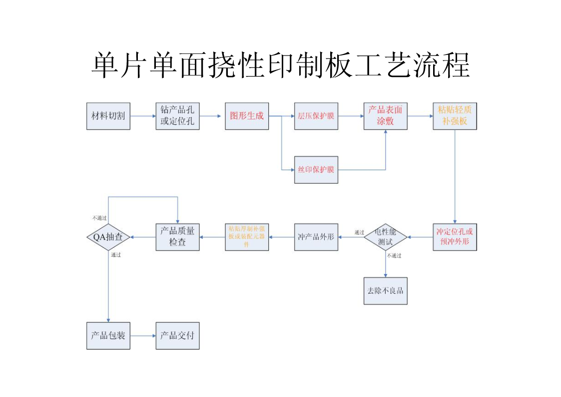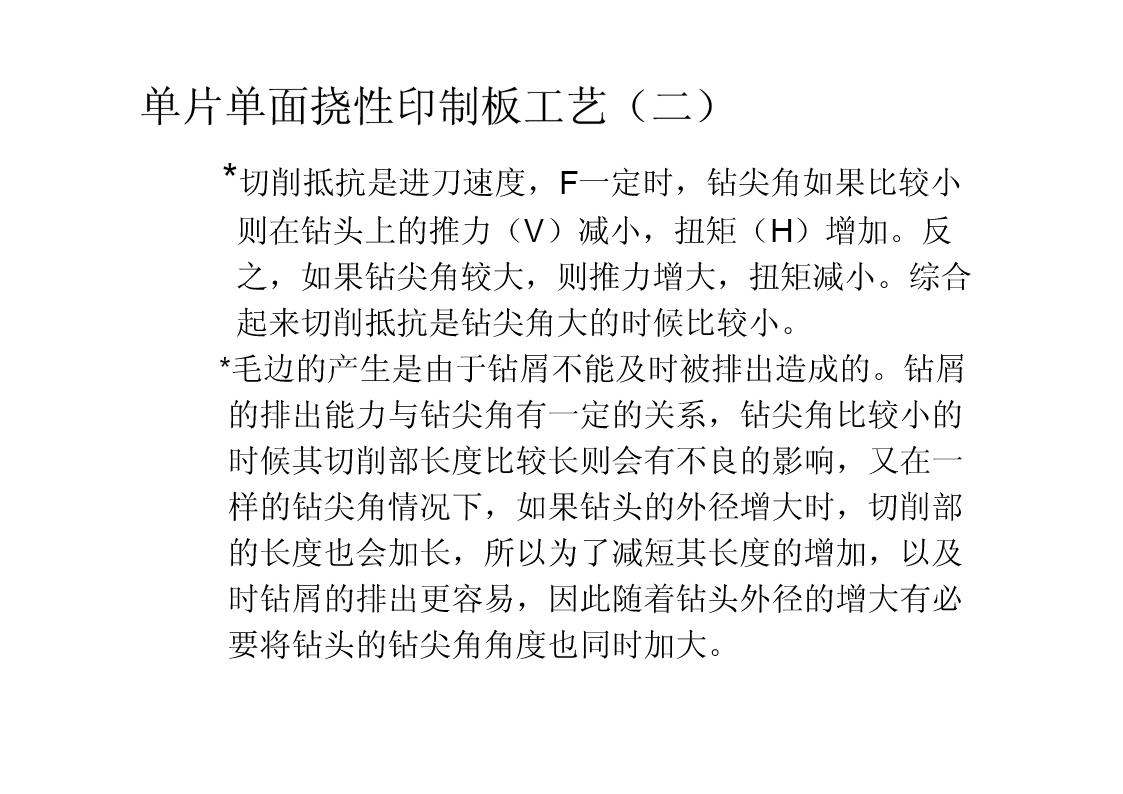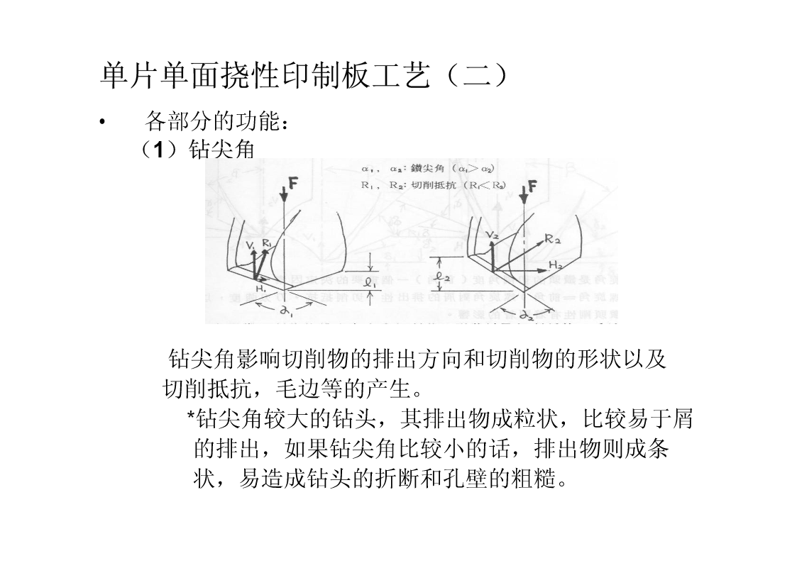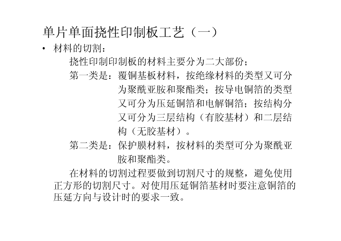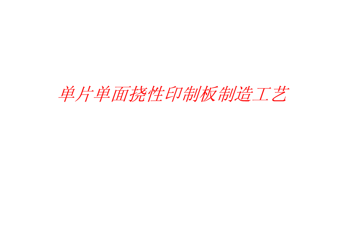 单片单面挠性印制板制造工艺单片多层,刚挠印制板制造工艺成立群单片单面挠性印制板制造工艺单片单面挠性印制板工艺流程单片单面挠性印制板工艺(一)•材料的切割:挠性印制印制板的材料主要分为二大部份;第一类是:覆铜基板材料,按绝缘材料的类型又可分为聚酰亚胺和聚酯类;按导电铜箔的类型又可分为压延铜箔和电解铜箔;按结构分又可分为三层结构(有胶基材)和二层结构(无胶基材)。第二类是:保护膜材料,按材料的类型可分为聚酰亚胺和聚酯类。在材料的切割过程要做到切割尺寸的规整,避免使用正方形的切割尺寸。对使用压延铜箔基材时要注意铜箔的压延方向与设计时的要求一致。单片单面挠性印制板工艺(二)•钻孔:钻孔是单面挠性印制板加工过程中一个重要的加工工序,由于挠性印制板的材料呈柔软易变形的特性所以在钻孔加工时同硬板有所不同。其工艺流程如下所示:叠板固定钻孔拆板叠板:既是将要钻孔的覆铜基板材料或保护膜材料按一定的层数叠放在一起并在底部和顶部覆上垫板和压板用单面胶带紧紧地粘合在一起。压板和垫板的选择:钻孔质量的优劣,除与钻头质量和钻孔参数有关系外,与压板和垫板的选用也密不可分。单片单面挠性印制板工艺(二)使用压板的目的:•防止产品表面产生毛边。•钻孔时散发热量。•可引导钻头进入FPC板的轨道作用。•钻头的清洁作用。压板的种类有酚醛树脂板,铝合金板,纸苯酚板。酚醛树脂板本身有种轨道作用,铝合金板则散热好,纸苯酚板对钻头的磨损较小。但是铝合金板的耐热性能不佳,在加工热量很大的时候,会产生铝的熔化在钻头尖部附着成一硬块。所以一般在FPC钻孔加工中选用0.3mm—0.5mm厚度的酚醛树脂板作为压板。单片单面挠性印制板工艺(二)•使用垫板的目的:•抑制毛边的产生。•让FPC板能充分贯通。垫板以1.6mm—2.0mm厚度的酚醛树脂板为主要材料。以材质来讲,比较软质的酚醛树脂板较为理想,太硬的板子会使钻头的切刃部位与垫板接触时发生缺口现象。•有效钻头刃长的计算:有效钻头刃长(mm)=钻头刃长(mm)-1.5mm•有效钻头刃长的组成:有效钻头刃长=单片材料的厚度X叠层数+压板厚度(0.5mm)+过钻量(0.3mm,既钻入下层垫板的深度)•在对保护膜材料进行叠层前,要对其粘结剂面的离形纸做“消应力”处理。单片单面挠性印制板工艺(二)•FPC的固定:将叠层后在二端打孔并订入定位销钉,装入钻床台面后在用1.5inch宽的美文纸单面胶带固定四周,使FPC材料与台面牢固紧密地结合在一起不能有上下跳动和左右晃动的现象出现。•钻孔:对钻头结构的认识:单片单面挠性印制板工艺(二)•各部分的功能:(1)钻尖角钻尖角影响切削物的排出方向和切削物的形状以及切削抵抗,毛边等的产生。*钻尖角较大的钻头,其排出物成粒状,比较易于屑的排出,如果钻尖角比较小的话,排出物则成条状,易造成钻头的折断和孔壁的粗糙。单片单面挠性印制板工艺(二)*切削抵抗是进刀速度,F一定时,钻尖角如果比较小则在钻头上的推力(V)减小,扭矩(H)增加。反之,如果钻尖角较大,则推力增大,扭矩减小。综合起来切削抵抗是钻尖角大的时候比较小。*毛边的产生是由于钻屑不能及时被排出造成的。钻屑的排出能力与钻尖角有一定的关系,钻尖角比较小的时候其切削部长度比较长则会有不良的影响,又在一样的钻尖角情况下,如果钻头的外径增大时,切削部的长度也会加长,所以为了减短其长度的增加,以及时钻屑的排出更容易,因此随着钻头外径的增大有必要将钻头的钻尖角角度也同时加大。单片单面挠性印制板工艺(二)(2)螺旋角*螺旋角是钻头的切削角度(前角)一个重要的决定因素。(螺旋角=前角)螺旋角对屑的排出性,切削抵抗,刀刃强度,以及钻头的刚性有着显著的影响。*有关屑的排出性,在一些适当的螺旋角度里,有助于钻屑的排出,但是切削屑移动到排出口的路程较远,如果吸尘效果不好的话,就容易有孔壁粗糙的现象产生,从力学角度分析螺旋角大的排出性比较好。*有关切削抵抗,螺旋角越大,则刀尖角越小刀刃部位则越锐利,则切削性能提高,因此所需的推力和扭矩减小,只要稍微力量,便可进去钻孔。但也存在缺点,由于刀刃强度减小,在比较差的切削条件下易造成钻头的缺口和异常磨损。*从钻头的刚性来讲,螺旋角越大,则刚性越差,钻头的刚性下降后易造成钻头的弯曲。单片单面挠性印制板工艺(二)•钻头的保管钻头的抗冲击性是非常脆弱的,而钻头的刀刃部位很锐利,因此在存取钻头的过程中必须加以保护和注意。如果不小心碰撞缺损的话,切削性能会降低,且会加大钻头的磨损和孔壁的钻污产生。所以就钻头的存