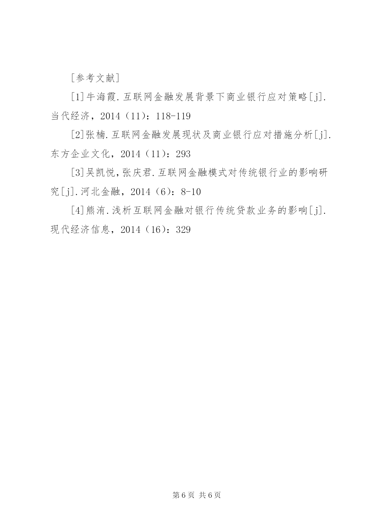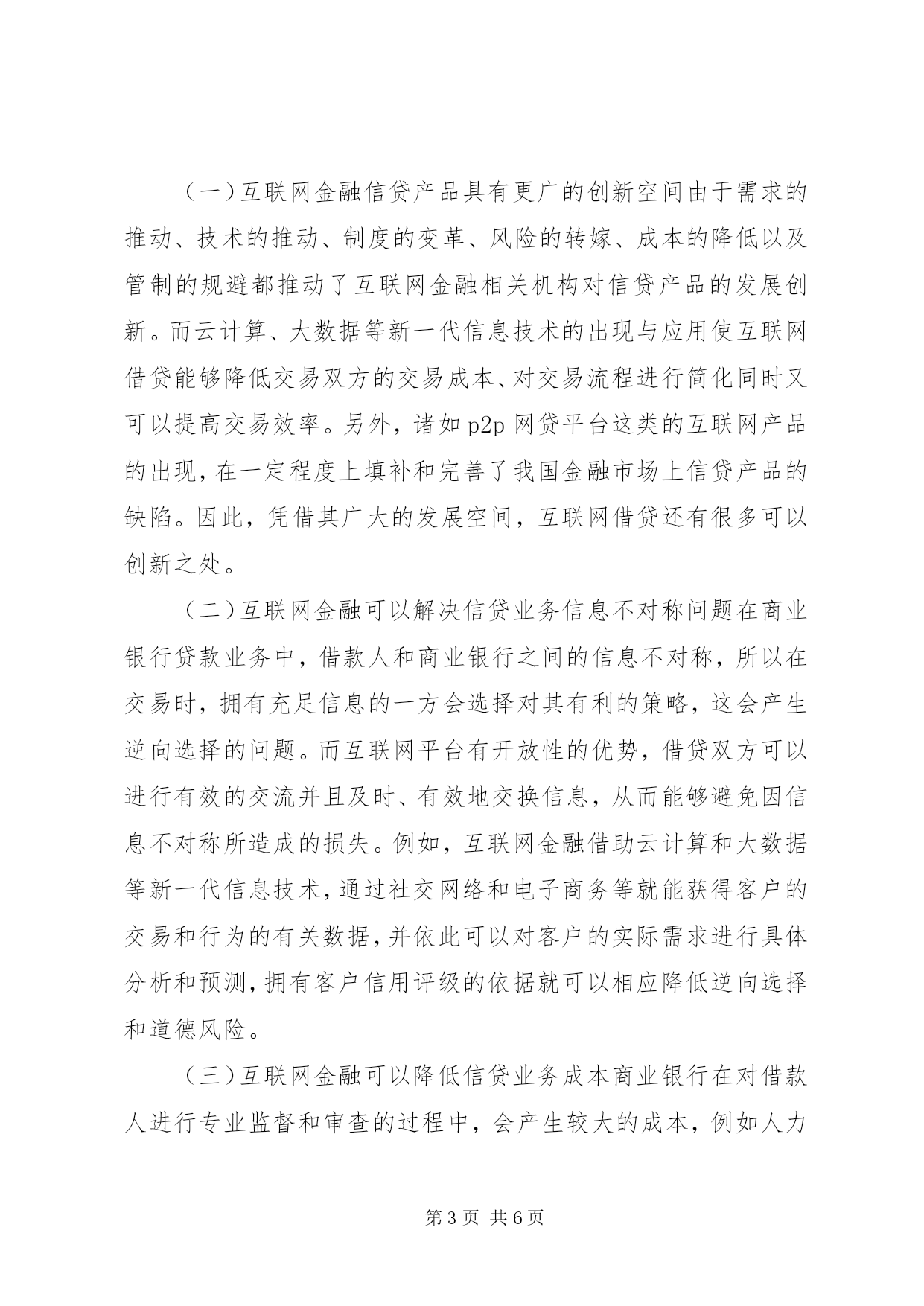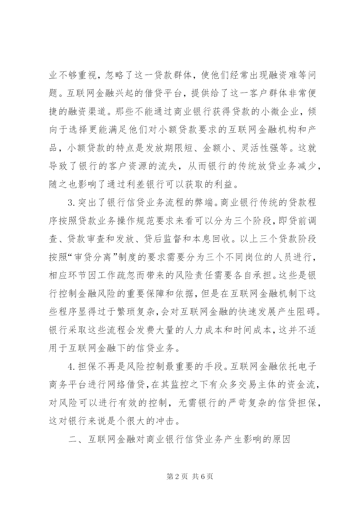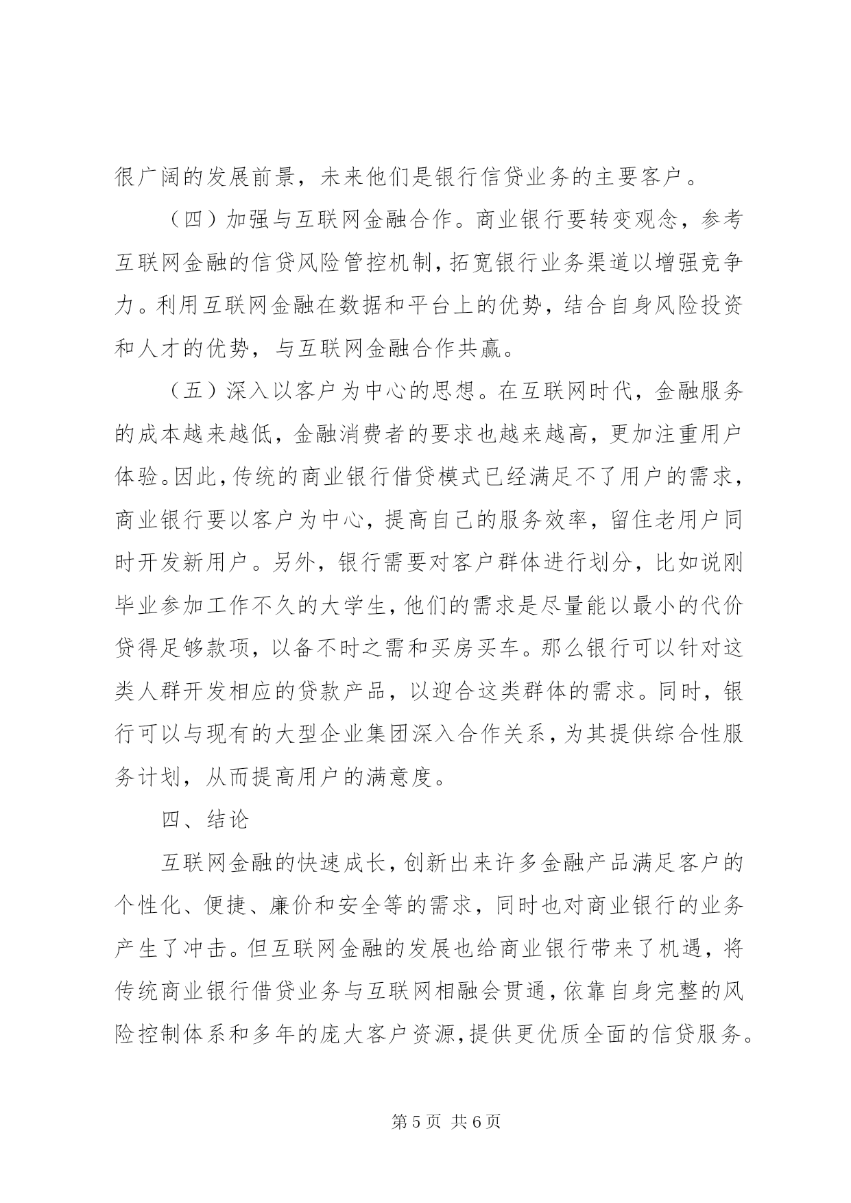 第PAGE\*Arabic\*MERGEFORMAT6页共NUMPAGES\*MERGEFORMAT6页商业银行信贷业务策略研究一、互联网金融对商业银行信贷业务的影响(一)互联网金融对商业银行信贷业务的积极影响1.商业银行信贷业务的市场竞争力可以得到提升。在我国的金融市场中,中央限制了资金的价格利率,而由于商业银行的准入门槛很高同时还可以在政府的保护下获得巨额的存贷利差,因此商业银行一直近乎处于垄断地位。互联网金融模式下市场是个开放市场,借贷双方来决定利率等因素,那么就会刺激商业银行也采取创新,推出更适合当下的信贷产品以获取市场占有率,从而提升其市场竞争力。2.拓展商业银行信贷业务服务渠道。互联网金融信贷产品和服务的多样化满足了客户的金融需求,客户也越来越注重服务质量和体验。为避免资金和客户的流失,商业银行会对当前的信贷业务进行拓展和创新,从而对自身渠道建设提出更高的要求。(二)互联网金融对商业银行信贷业务的消极影响1.银行信贷业务主体地位受到冲击。互联网金融的发展使得各种平台提供给借贷双方各种资金和信息资源,银行的信贷业务功能逐渐弱化,典型的例子有p2p平台提供的借贷服务,可以取代银行的相关功能。这会很快改变在传统借贷业务中银行的地位和作用,银行的中介作用会逐渐降低。2.信贷业务的收入利润减少。商业银行此前对个人和小微企业不够重视,忽略了这一贷款群体,使他们经常出现融资难等问题。互联网金融兴起的借贷平台,提供给了这一客户群体非常便捷的融资渠道。那些不能通过商业银行获得贷款的小微企业,倾向于选择更能满足他们对小额贷款要求的互联网金融机构和产品,小额贷款的特点是发放期限短、金额小、灵活性强等。这就导致了银行的客户资源的流失,从而银行的传统放贷业务减少,随之也影响了通过利差银行可以获取的利益。3.突出了银行信贷业务流程的弊端。商业银行传统的贷款程序按照贷款业务操作规范要求来看可以分为三个阶段,即贷前调查、贷款审查和发放、贷后监督和本息回收。以上三个贷款阶段按照“审贷分离”制度的要求需要分为三个不同岗位的人员进行,相应环节因工作疏忽而带来的风险责任需要各自承担。这些是银行控制金融风险的重要保障和依据,但是在互联网金融机制下这些程序显得过于繁琐复杂,会对互联网金融的快速发展产生阻碍。银行采取这些流程会发费大量的人力成本和时间成本,这并不适用于互联网金融下的信贷业务。4.担保不再是风险控制最重要的手段。互联网金融依托电子商务平台进行网络借贷,在其监控之下有众多交易主体的资金流,对风险可以进行有效的控制,无需银行的严苛复杂的信贷担保,这对银行来说是个很大的冲击。二、互联网金融对商业银行信贷业务产生影响的原因(一)互联网金融信贷产品具有更广的创新空间由于需求的推动、技术的推动、制度的变革、风险的转嫁、成本的降低以及管制的规避都推动了互联网金融相关机构对信贷产品的发展创新。而云计算、大数据等新一代信息技术的出现与应用使互联网借贷能够降低交易双方的交易成本、对交易流程进行简化同时又可以提高交易效率。另外,诸如p2p网贷平台这类的互联网产品的出现,在一定程度上填补和完善了我国金融市场上信贷产品的缺陷。因此,凭借其广大的发展空间,互联网借贷还有很多可以创新之处。(二)互联网金融可以解决信贷业务信息不对称问题在商业银行贷款业务中,借款人和商业银行之间的信息不对称,所以在交易时,拥有充足信息的一方会选择对其有利的策略,这会产生逆向选择的问题。而互联网平台有开放性的优势,借贷双方可以进行有效的交流并且及时、有效地交换信息,从而能够避免因信息不对称所造成的损失。例如,互联网金融借助云计算和大数据等新一代信息技术,通过社交网络和电子商务等就能获得客户的交易和行为的有关数据,并依此可以对客户的实际需求进行具体分析和预测,拥有客户信用评级的依据就可以相应降低逆向选择和道德风险。(三)互联网金融可以降低信贷业务成本商业银行在对借款人进行专业监督和审查的过程中,会产生较大的成本,例如人力成本、时间成本和场地成本等,另外风险评级以及信息维护等方面的费用也都归入这部分成本中,从而使客户的信贷交易成本增加。与之相比,在互联网金融模式下,由于借款方能够参与其中、各部门协调性好并且中间成本低,节省了大量的时间和费用,因此商业银行出于劣势。三、基于信贷业务的商业银行应对策略(一)培养复合型的人才。商业银行需要的是金融和互联网方面的人才,复合型人才可以通过技术经验加强双方的信息资源共享的合作。同时通过系统的分析与考量,可以开发出适合本银行的软件系统和更多适应客户需求的产品。比如,银行通过与互联网金融机构合作,很多小微企业的信用记录就可以进入银行征信系统,小微企业也可以很方便快捷地拿到银行贷款了。(二)加入p2p网贷。商业银行可以参考其他互联网金融的网贷推
