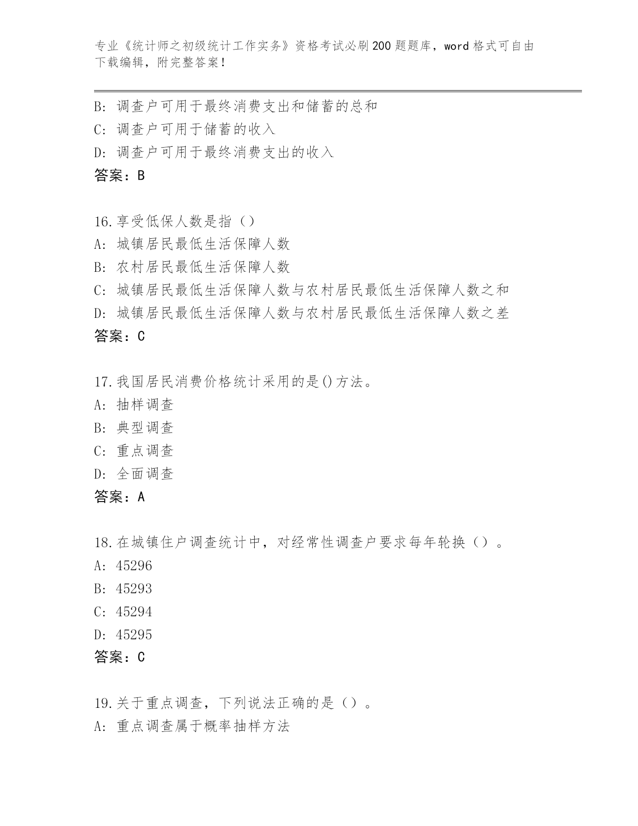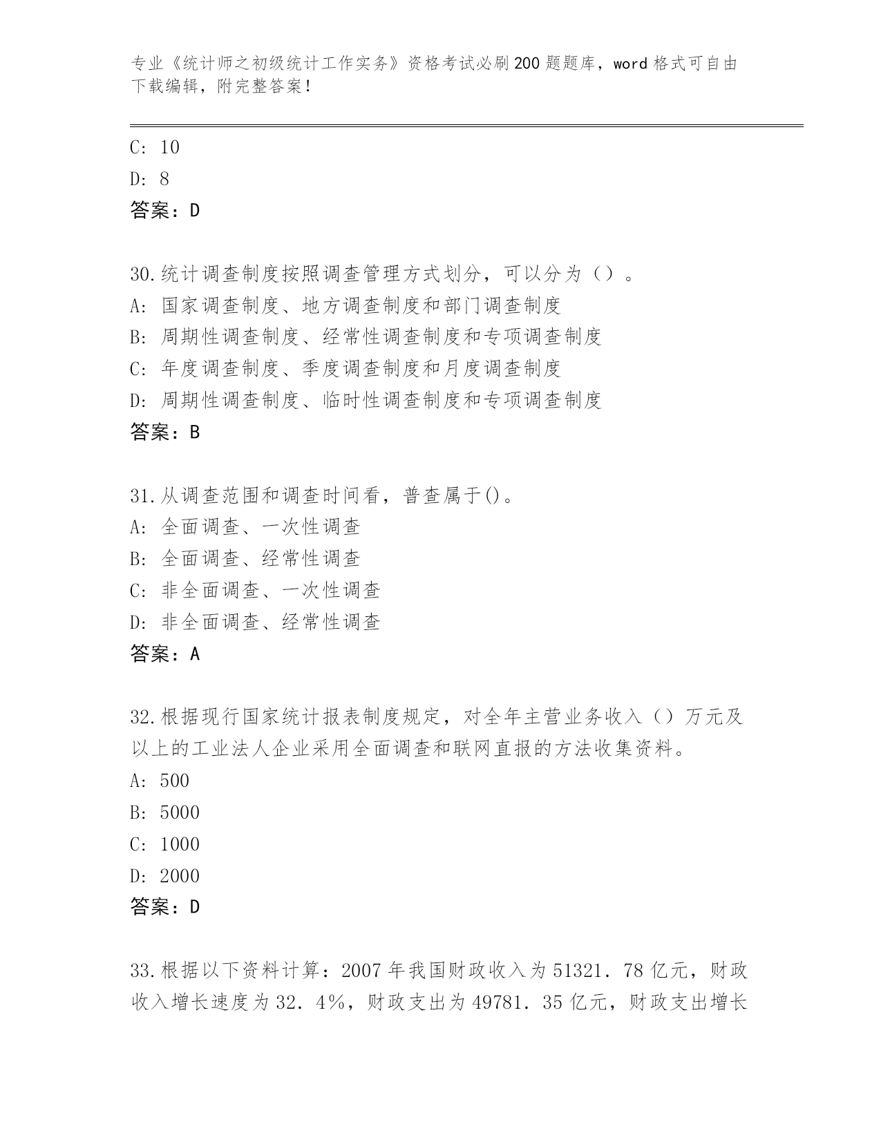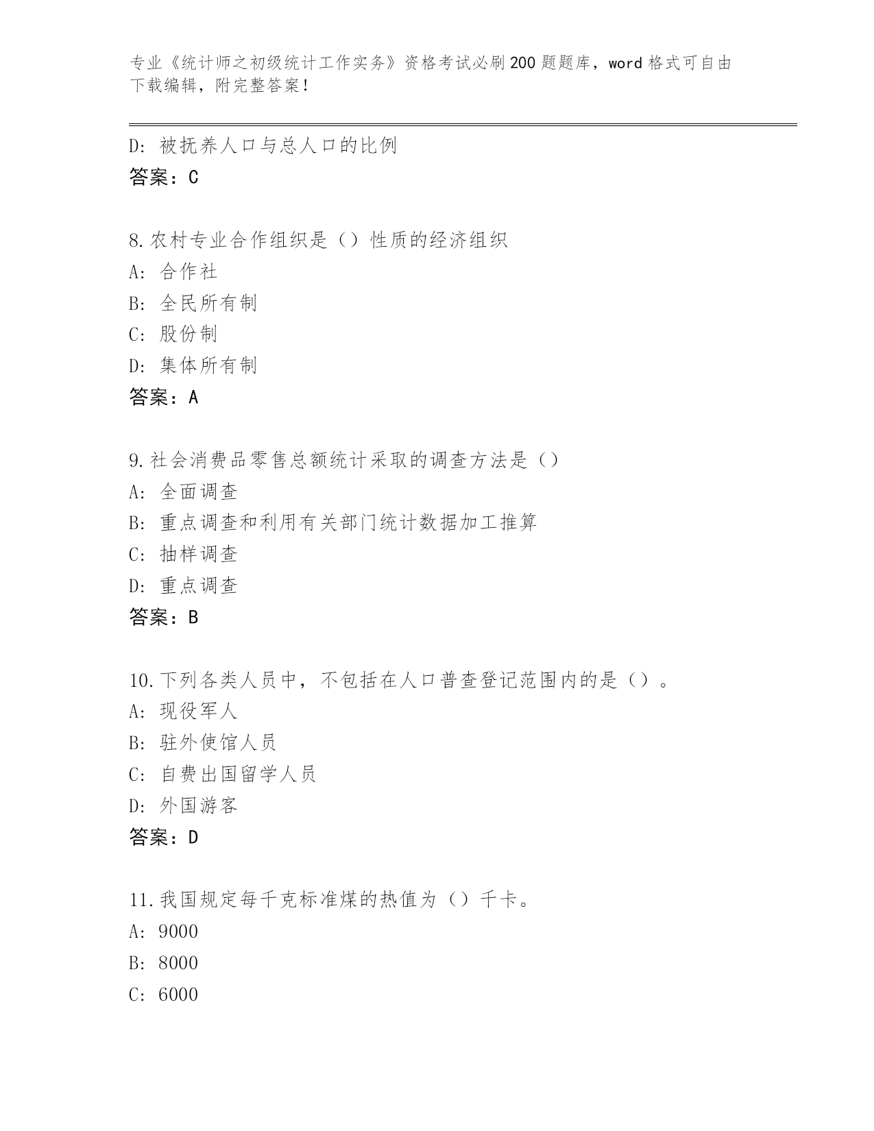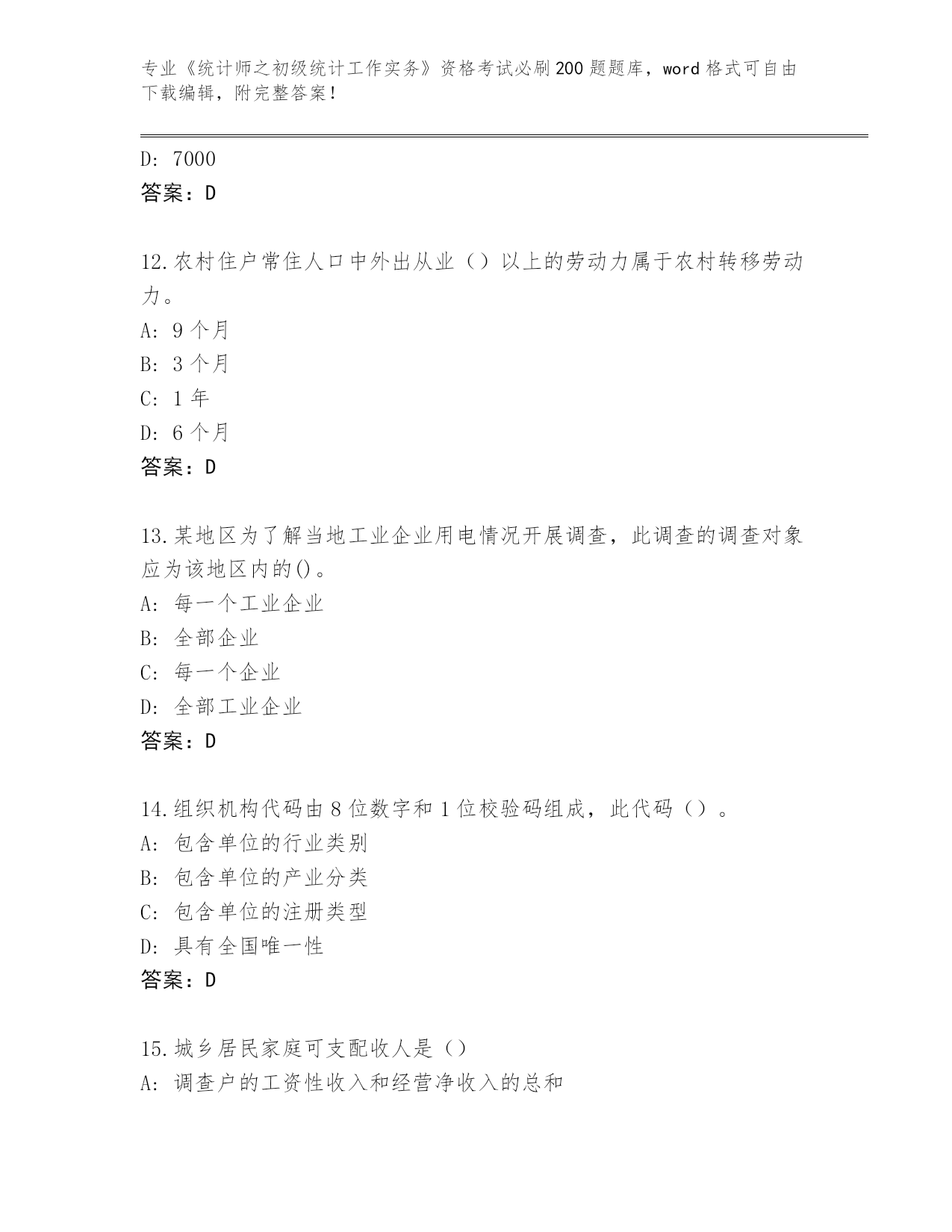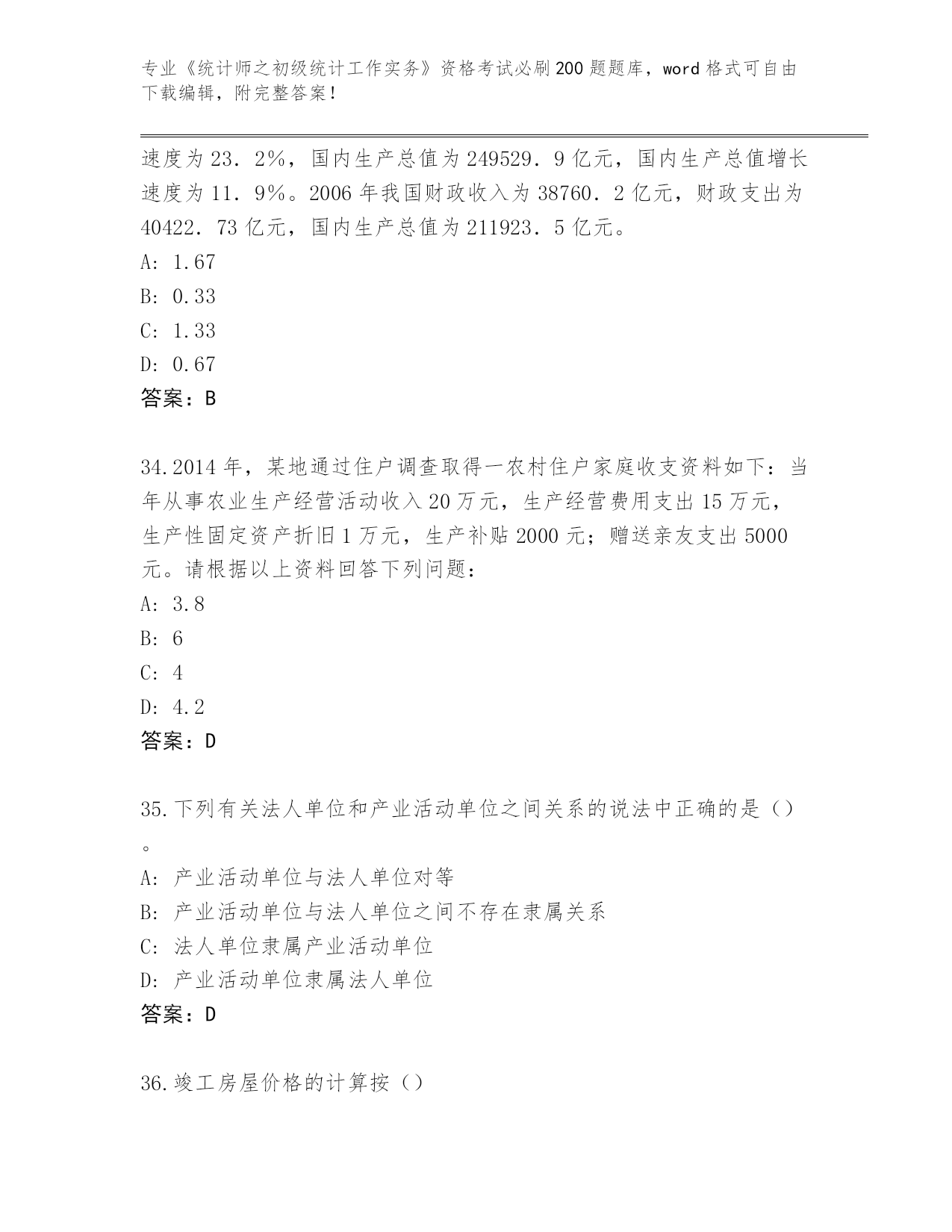 2024年安徽省泾县《统计师之初级统计工作实务》资格考试必背200题(必刷)