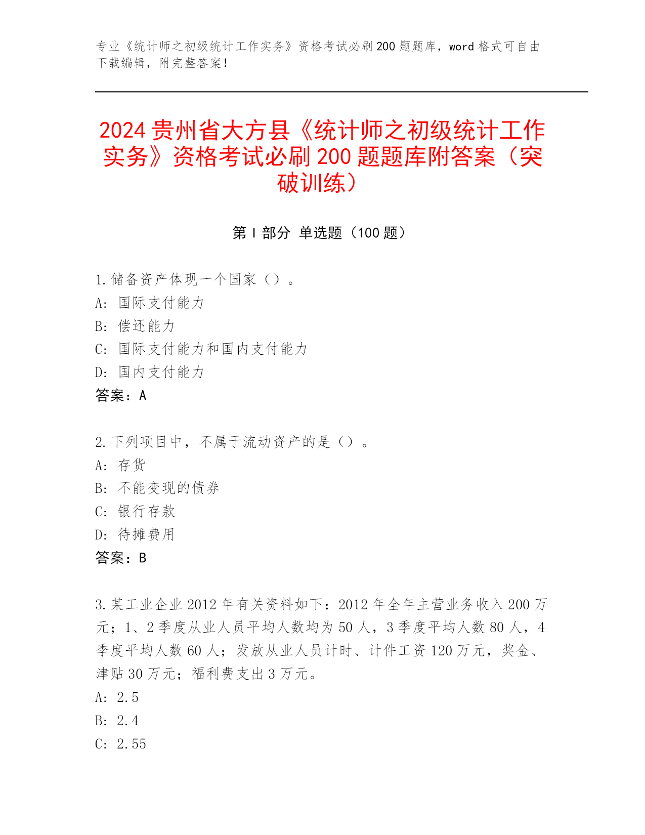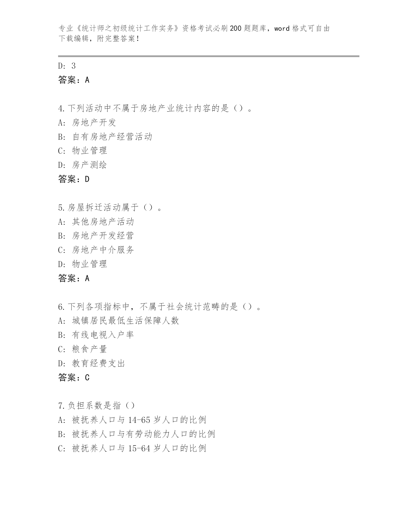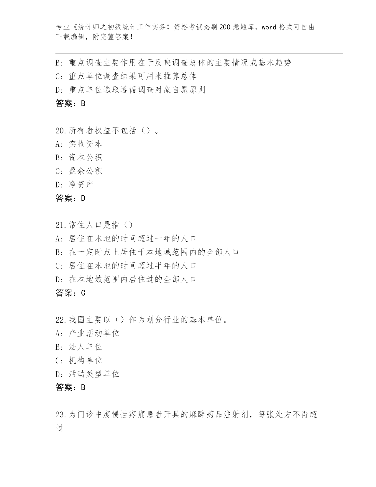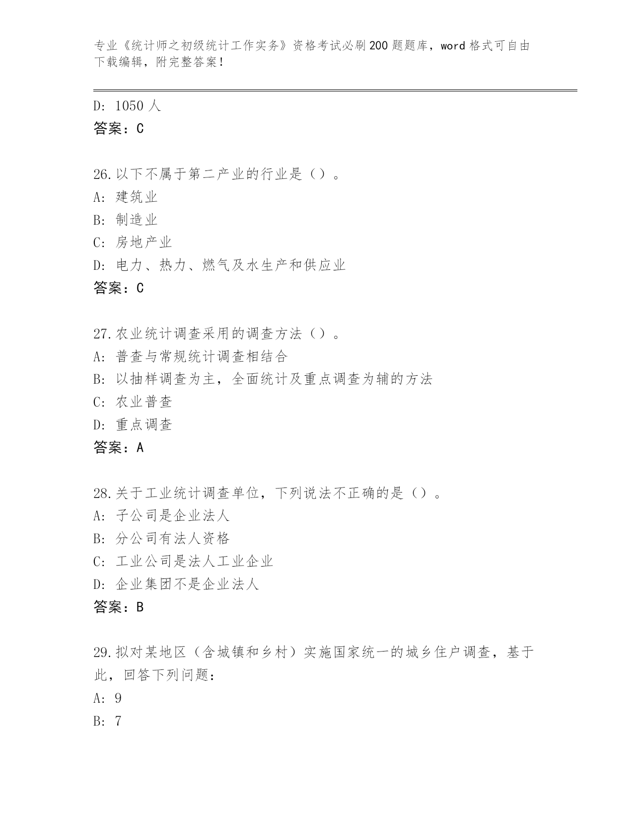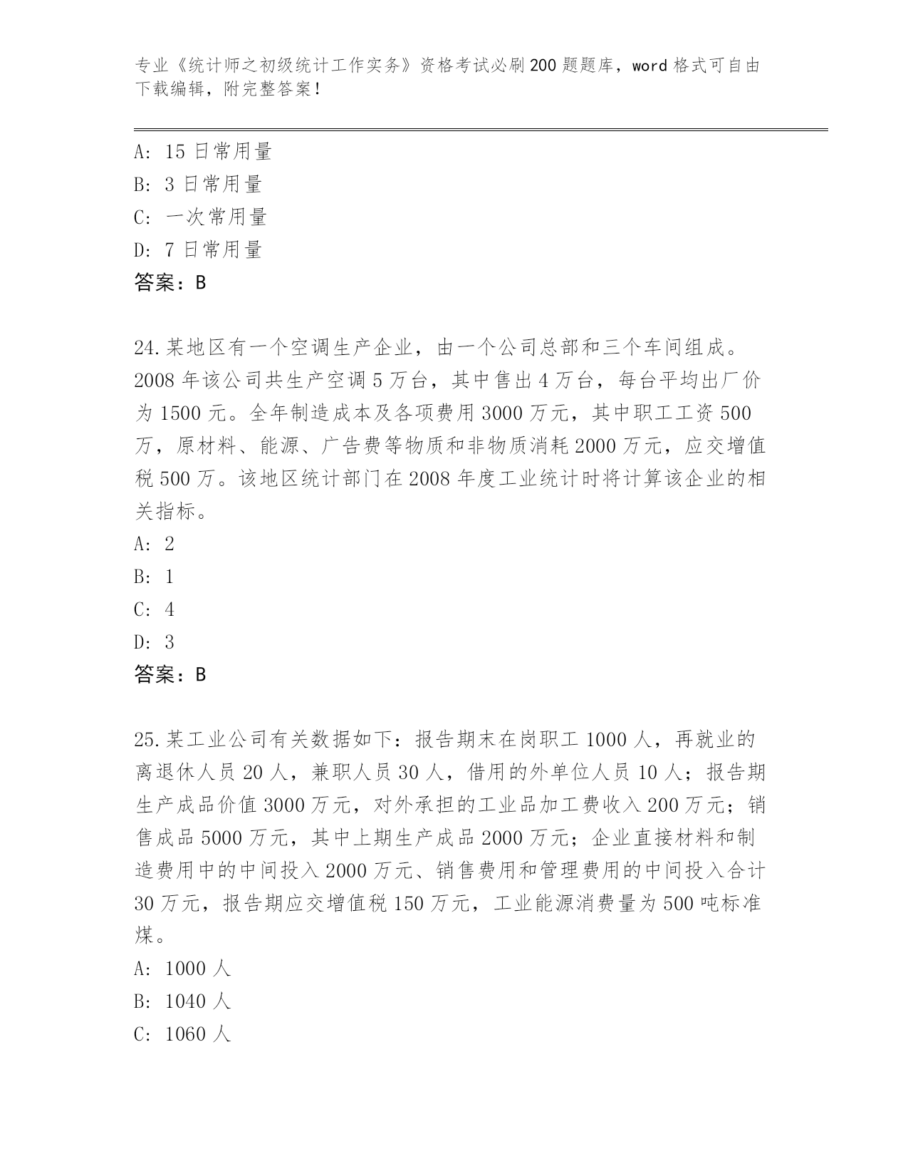 2024年安徽省泾县《统计师之初级统计工作实务》资格考试必背200题(必刷)