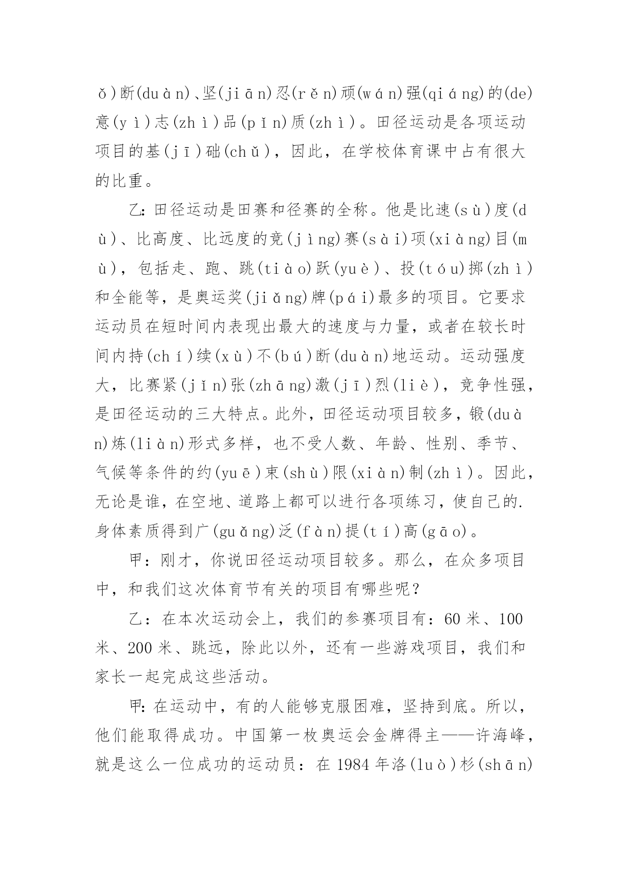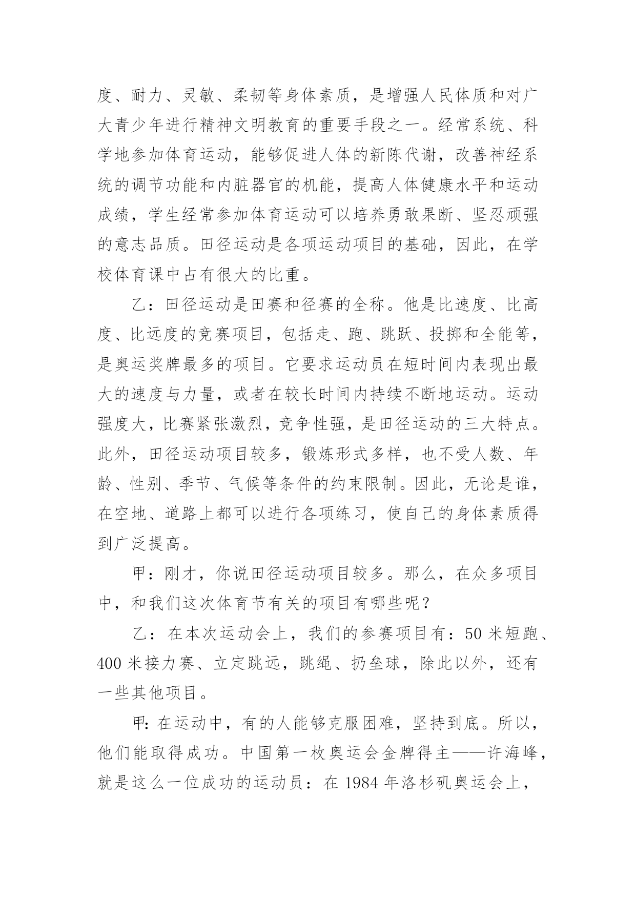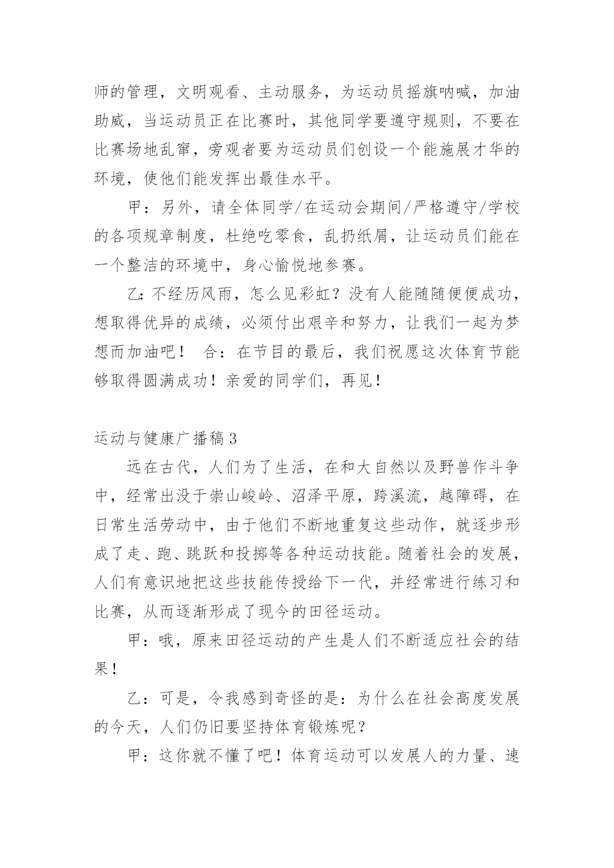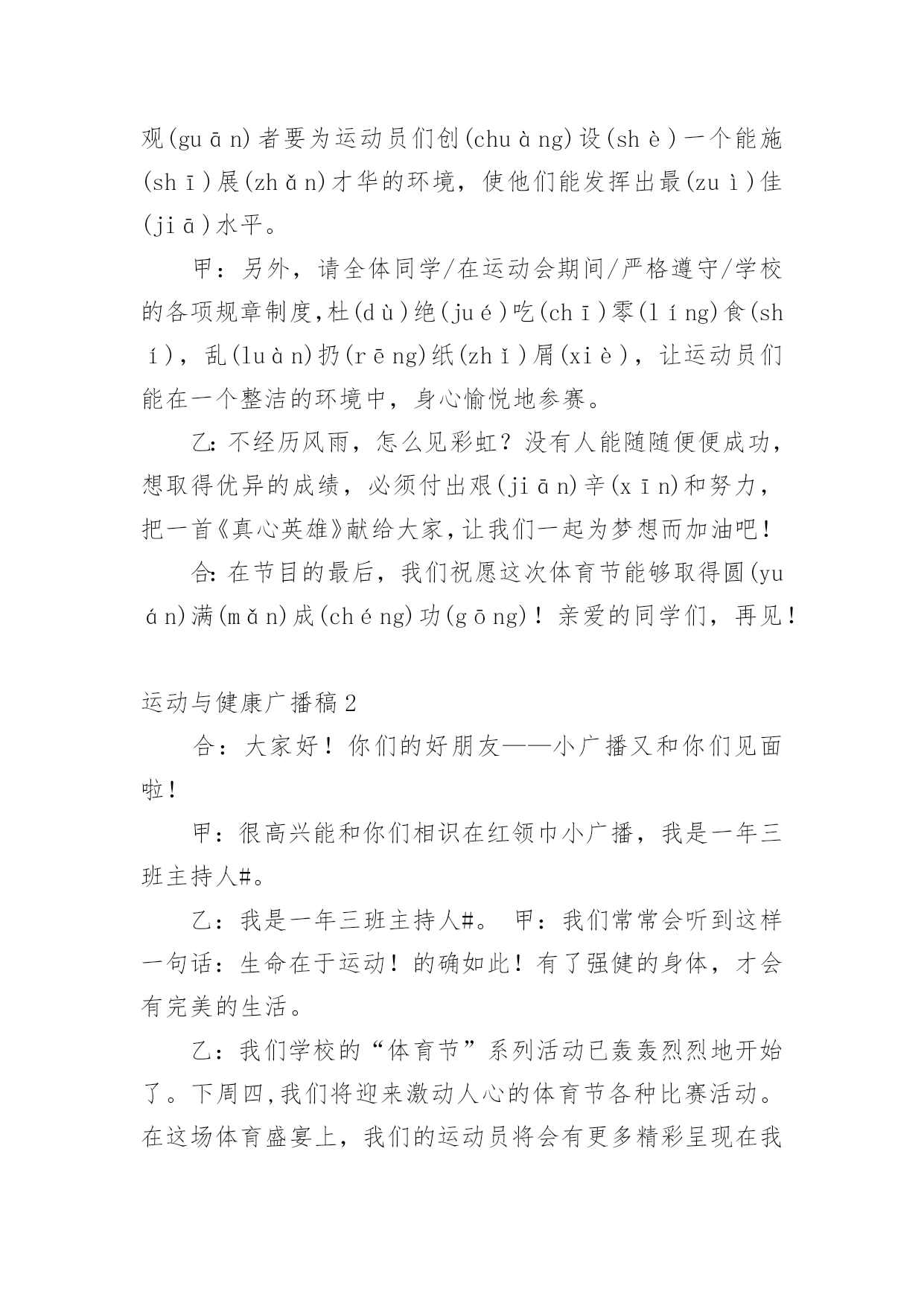 运动与健康广播稿在学校广播站锻炼的同学们,广播前都会提前做好广播稿,广播稿写得漂亮才会有好的节目效果,写广播稿需要注意哪些格式呢?以下是小编为大家整理的运动与健康广播稿,仅供参考,欢迎大家阅读。运动与健康广播稿1合:大家好!你们的好朋友——红领巾小广播又和你们见面啦!甲:很高兴能和你们相识在红领巾小广播,我是一年三班主持人#。乙:我是一年三班主持人#。甲:我们常常会听到这样一句话:生命在于运动!的(dí)确(què)如(rú)此(cǐ)!有了强(qiáng)健(jiàn)的身体,才会有完美的生活。乙:我们学校的“体育节”系列活动/已轰(hōng)轰(hōng)烈(liè)烈(liè)地开始了。本周六,我们将迎来激动人心的田径(jìng)运动会。在这场体育盛(shèng)宴(yàn)上,我们的运动员将会有更多精彩呈(chéng)现(xiàn)在我们面前。甲:说起田径运动会,我倒要考考你,你知道田径运动是怎么产生的吗?乙:这可难(nán)不(bú)倒(dǎo)我!田径运动/是在社会发展中/逐(zhú)渐(jiàn)产生和发展起来的。远在古代,人们为了生活,在和大自然以及野(yě)兽(shòu)作斗争中,经常出没于崇(chóng)山(shān)峻(jùn)岭(lǐng)、沼(zhǎo)泽(zé)平原,跨(kuà)溪(xī)流(liú),越(yuè)障(zhàng)碍(ài),在日常生活劳动中,由于他们不断地重(chóng)复(fù)这些动作,就逐(zhú)步(bù)形成了走、跑、跳(tiào)跃(yuè)和(hé)投(tóu)掷(zhì)等各种运动技(jì)能(néng)。随着社会的发展,人们有意识地把这些技能传(chuán)授(shòu)给下一代,并经常进行练习和比赛,从而逐渐形成了现今的田径运动。甲:哦,原来田径运动的产生是人们不断适(shì)应(yìng)社会的结果!乙:可是,令我感到奇怪的是:为什么在社会高度发展的今天,人们仍旧要坚持体育锻(duàn)炼(liàn)呢?甲:这你就不懂了吧!体育运动可以发展人的力量、速(sù)度(dù)、耐(nài)力(lì)、灵(líng)敏(mǐn)、柔(róu)韧(rèn)等身体素(sù)质(zhì),是增(zēng)强(qiáng)人民体质和对广大青少年进行精神文明教育的重要手(shǒu)段(duàn)之一。经常系(xì)统(tǒng)、科学地参加体育运动,能够促进人体的新(xīn)陈(chén)代(dài)谢(xiè),改(gǎi)善(shàn)神(shén)经(jīng)系(xì)统(tǒng)的(de)调(tiáo)节(ji)功能和内脏器官的机能,提高人体健康水平和运动成(chéng)绩(jì),学生经常参加体育运动可以培(péi)养(yǎng)勇(yǒng)敢(gǎn)果(guǒ)断(duàn)、坚(jiān)忍(rěn)顽(wán)强(qiáng)的(de)意(yì)志(zhì)品(pǐn)质(zhì)。田径运动是各项运动项目的基(jī)础(chǔ),因此,在学校体育课中占有很大的比重。乙:田径运动是田赛和径赛的全称。他是比速(sù)度(dù)、比高度、比远度的竞(jìng)赛(sài)项(xiàng)目(mù),包括走、跑、跳(tiào)跃(yuè)、投(tóu)掷(zhì)和全能等,是奥运奖(jiǎng)牌(pái)最多的项目。它要求运动员在短时间内表现出最大的速度与力量,或者在较长时间内持(chí)续(xù)不(bú)断(duàn)地运动。运动强度大,比赛紧(jǐn)张(zhāng)激(jī)烈(liè),竞争性强,是田径运动的三大特点。此外,田径运动项目较多,锻(duàn)炼(liàn)形式多样,也不受人数、年龄、性别、季节、气候等条件的约(yuē)束(shù)限(xiàn)制(zhì)。因此,无论是谁,在空地、道路上都可以进行各项练习,使自己的.身体素质得到广(guǎng)泛(fàn)提(tí)高(gāo)。甲:刚才,你说田径运动项目较多。那么,在众多项目中,和我们这次体育节有关的项目有哪些呢?乙:在本次运动会上,我们的参赛项目有:60米、100米、200米、跳远,除此以外,还有一些游戏项目,我们和家长一起完成这些活动。甲:在运动中,有的人能够克服困难,坚持到底。所以,他们能取得成功。中国第一枚奥运会金牌得主——许海峰,就是这么一位成功的运动员:在1984年洛(luò)杉(shān)矶(jī)奥(ào)运(yùn)会(huì)上,中国射击选手许(hǔ)海(hǎi)峰(fēng)迎(yíng)战(zhàn)了各种困难,为中国夺得首(shǒu)枚(méi)金(jīn)牌(pái)。奥(ào)委(wěi)会(huì)主(zhǔ)席(xí)萨(sà)满(mǎn)兰(lá