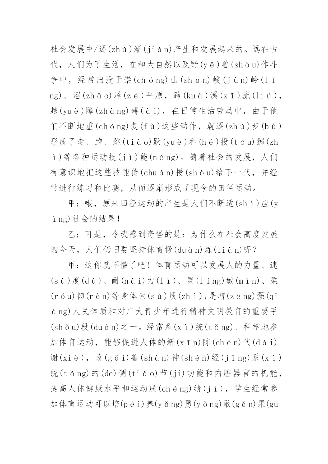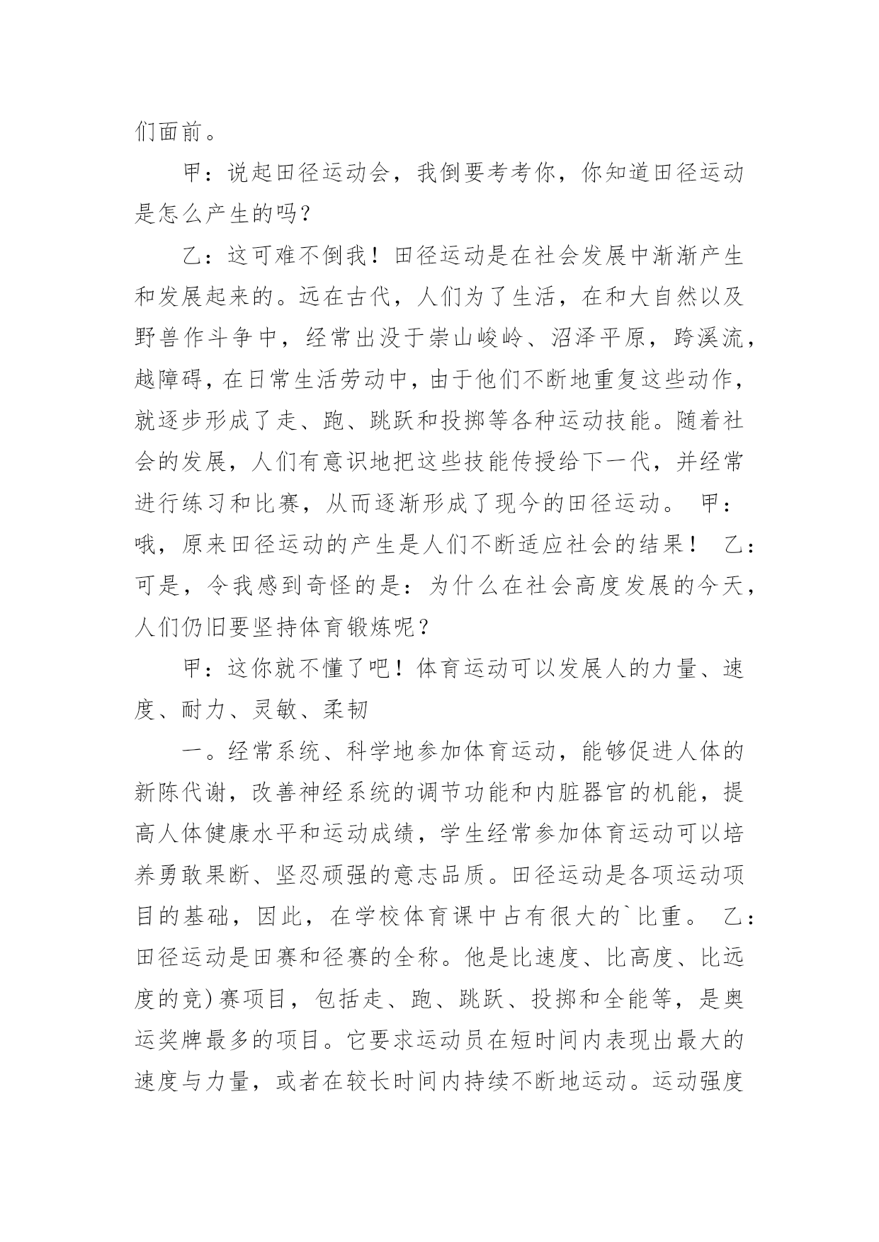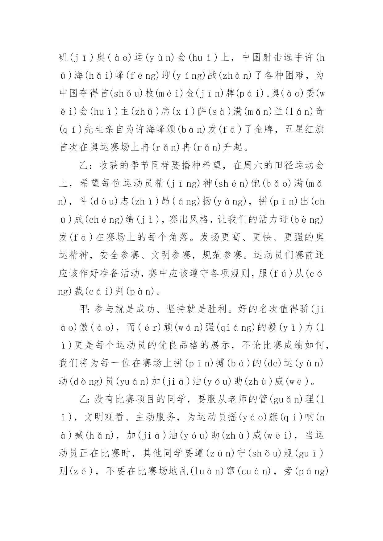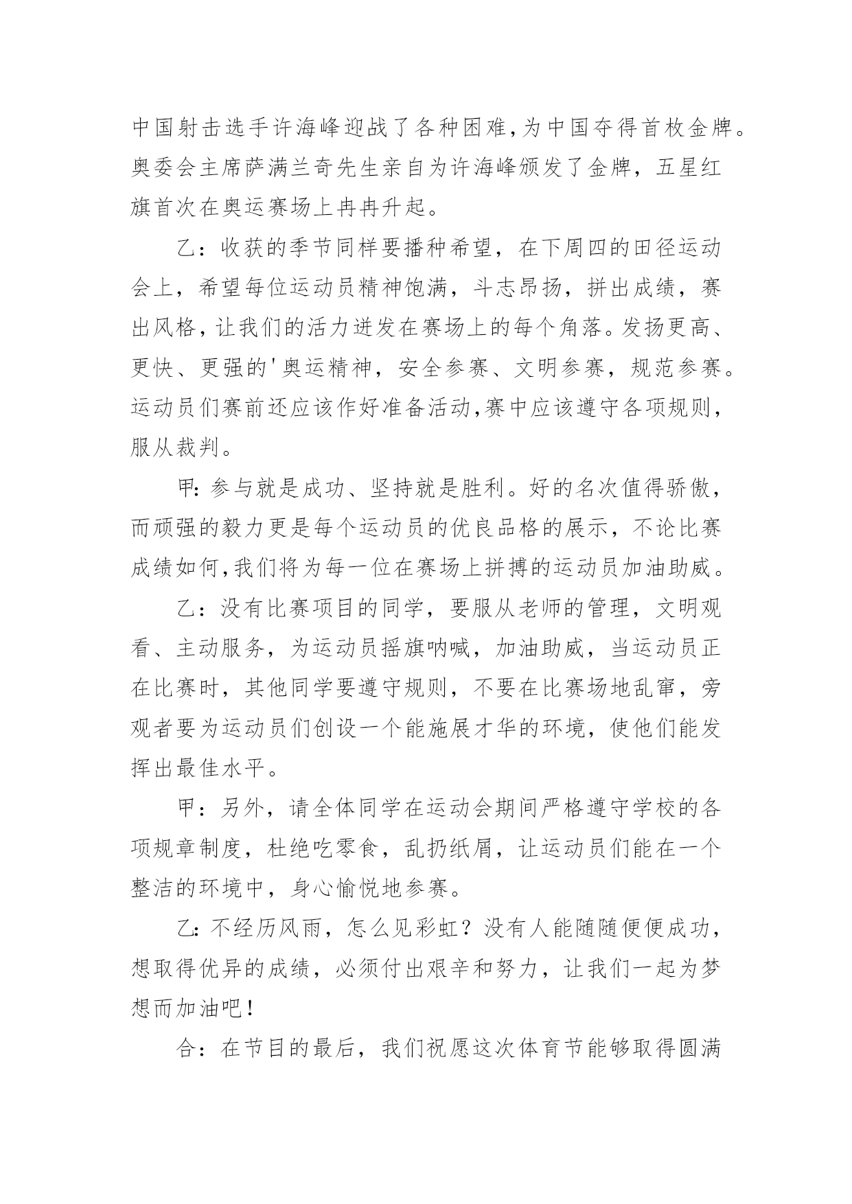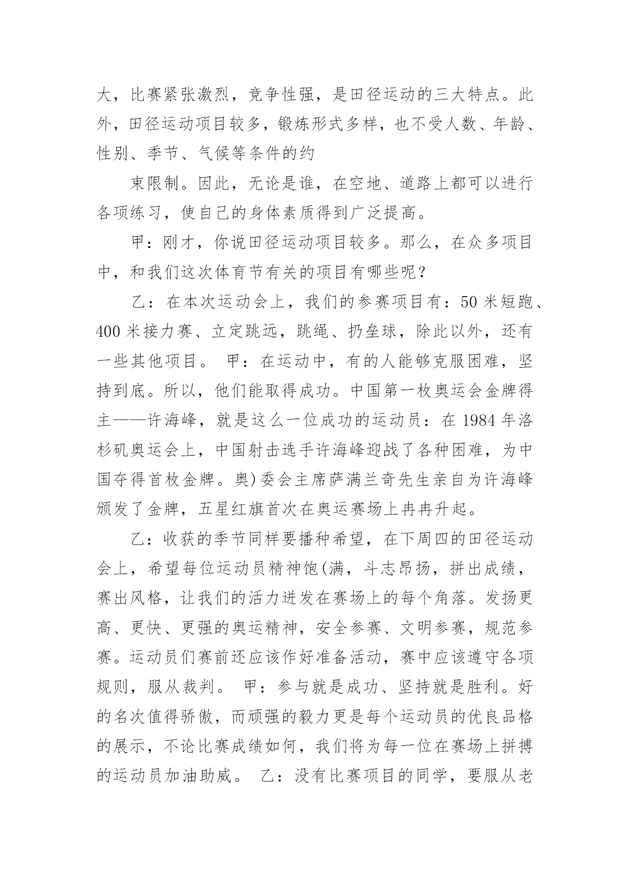 运动与健康广播稿在学校广播站锻炼的同学们,广播前都会提前做好广播稿,广播稿写得漂亮才会有好的节目效果,写广播稿需要注意哪些格式呢?以下是小编为大家整理的运动与健康广播稿,仅供参考,欢迎大家阅读。运动与健康广播稿1合:大家好!你们的好朋友——红领巾小广播又和你们见面啦!甲:很高兴能和你们相识在红领巾小广播,我是一年三班主持人#。乙:我是一年三班主持人#。甲:我们常常会听到这样一句话:生命在于运动!的(dí)确(què)如(rú)此(cǐ)!有了强(qiáng)健(jiàn)的身体,才会有完美的生活。乙:我们学校的“体育节”系列活动/已轰(hōng)轰(hōng)烈(liè)烈(liè)地开始了。本周六,我们将迎来激动人心的田径(jìng)运动会。在这场体育盛(shèng)宴(yàn)上,我们的运动员将会有更多精彩呈(chéng)现(xiàn)在我们面前。甲:说起田径运动会,我倒要考考你,你知道田径运动是怎么产生的吗?乙:这可难(nán)不(bú)倒(dǎo)我!田径运动/是在社会发展中/逐(zhú)渐(jiàn)产生和发展起来的。远在古代,人们为了生活,在和大自然以及野(yě)兽(shòu)作斗争中,经常出没于崇(chóng)山(shān)峻(jùn)岭(lǐng)、沼(zhǎo)泽(zé)平原,跨(kuà)溪(xī)流(liú),越(yuè)障(zhàng)碍(ài),在日常生活劳动中,由于他们不断地重(chóng)复(fù)这些动作,就逐(zhú)步(bù)形成了走、跑、跳(tiào)跃(yuè)和(hé)投(tóu)掷(zhì)等各种运动技(jì)能(néng)。随着社会的发展,人们有意识地把这些技能传(chuán)授(shòu)给下一代,并经常进行练习和比赛,从而逐渐形成了现今的田径运动。甲:哦,原来田径运动的产生是人们不断适(shì)应(yìng)社会的结果!乙:可是,令我感到奇怪的是:为什么在社会高度发展的今天,人们仍旧要坚持体育锻(duàn)炼(liàn)呢?甲:这你就不懂了吧!体育运动可以发展人的力量、速(sù)度(dù)、耐(nài)力(lì)、灵(líng)敏(mǐn)、柔(róu)韧(rèn)等身体素(sù)质(zhì),是增(zēng)强(qiáng)人民体质和对广大青少年进行精神文明教育的重要手(shǒu)段(duàn)之一。经常系(xì)统(tǒng)、科学地参加体育运动,能够促进人体的新(xīn)陈(chén)代(dài)谢(xiè),改(gǎi)善(shàn)神(shén)经(jīng)系(xì)统(tǒng)的(de)调(tiáo)节(ji)功能和内脏器官的机能,提高人体健康水平和运动成(chéng)绩(jì),学生经常参加体育运动可以培(péi)养(yǎng)勇(yǒng)敢(gǎn)果(guǒ)断(duàn)、坚(jiān)忍(rěn)顽(wán)强(qiáng)的(de)意(yì)志(zhì)品(pǐn)质(zhì)。田径运动是各项运动项目的基(jī)础(chǔ),因此,在学校体育课中占有很大的比重。乙:田径运动是田赛和径赛的全称。他是比速(sù)度(dù)、比高度、比远度的竞(jìng)赛(sài)项(xiàng)目(mù),包括走、跑、跳(tiào)跃(yuè)、投(tóu)掷(zhì)和全能等,是奥运奖(jiǎng)牌(pái)最多的项目。它要求运动员在短时间内表现出最大的速度与力量,或者在较长时间内持(chí)续(xù)不(bú)断(duàn)地运动。运动强度大,比赛紧(jǐn)张(zhāng)激(jī)烈(liè),竞争性强,是田径运动的三大特点。此外,田径运动项目较多,锻(duàn)炼(liàn)形式多样,也不受人数、年龄、性别、季节、气候等条件的约(yuē)束(shù)限(xiàn)制(zhì)。因此,无论是谁,在空地、道路上都可以进行各项练习,使自己的.身体素质得到广(guǎng)泛(fàn)提(tí)高(gāo)。甲:刚才,你说田径运动项目较多。那么,在众多项目中,和我们这次体育节有关的项目有哪些呢?乙:在本次运动会上,我们的参赛项目有:60米、100米、200米、跳远,除此以外,还有一些游戏项目,我们和家长一起完成这些活动。甲:在运动中,有的人能够克服困难,坚持到底。所以,他们能取得成功。中国第一枚奥运会金牌得主——许海峰,就是这么一位成功的运动员:在1984年洛(luò)杉(shān)矶(jī)奥(ào)运(yùn)会(huì)上,中国射击选手许(hǔ)海(hǎi)峰(fēng)迎(yíng)战(zhàn)了各种困难,为中国夺得首(shǒu)枚(méi)金(jīn)牌(pái)。奥(ào)委(wěi)会(huì)主(zhǔ)席(xí)萨(sà)满(mǎn)兰(lá