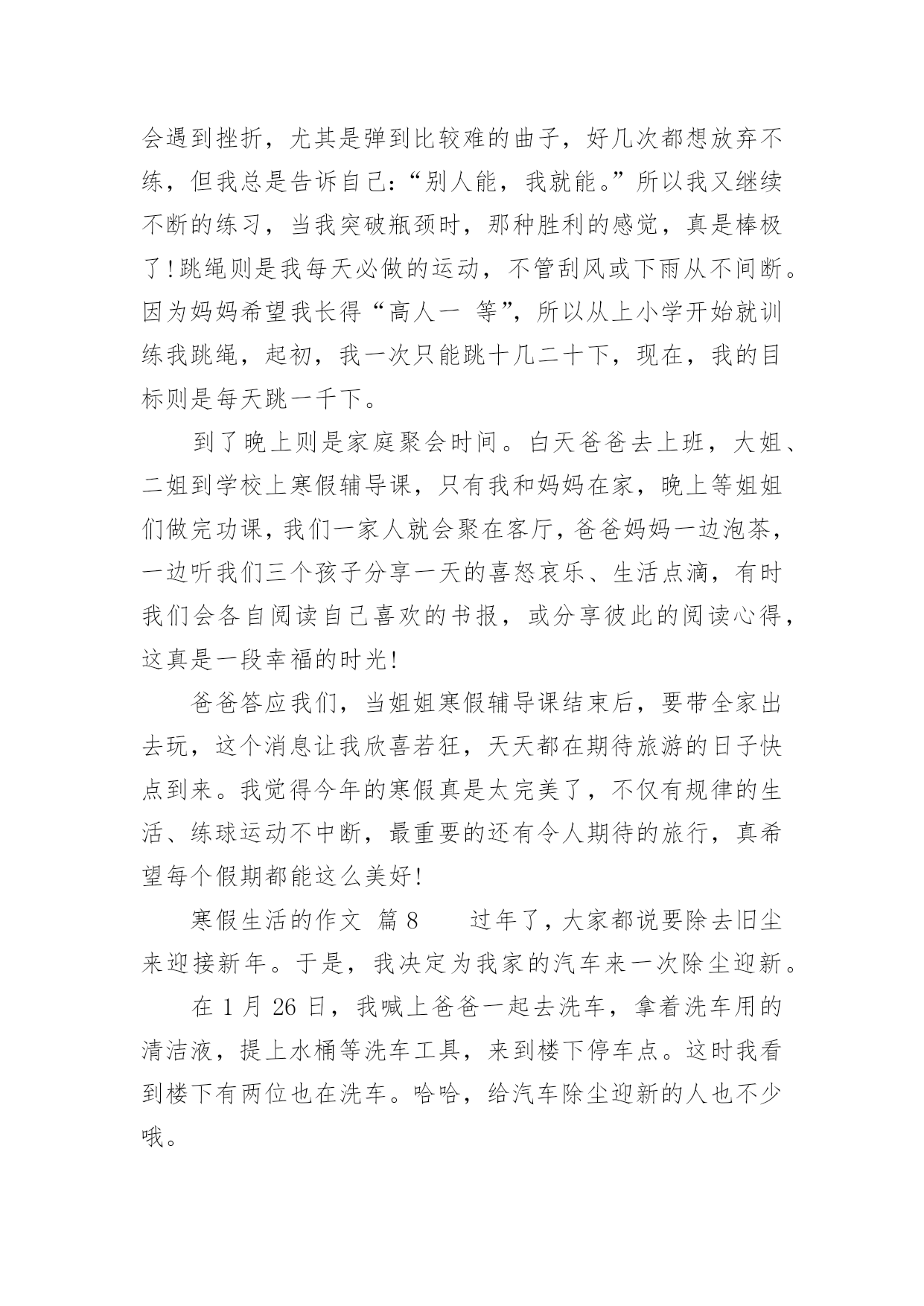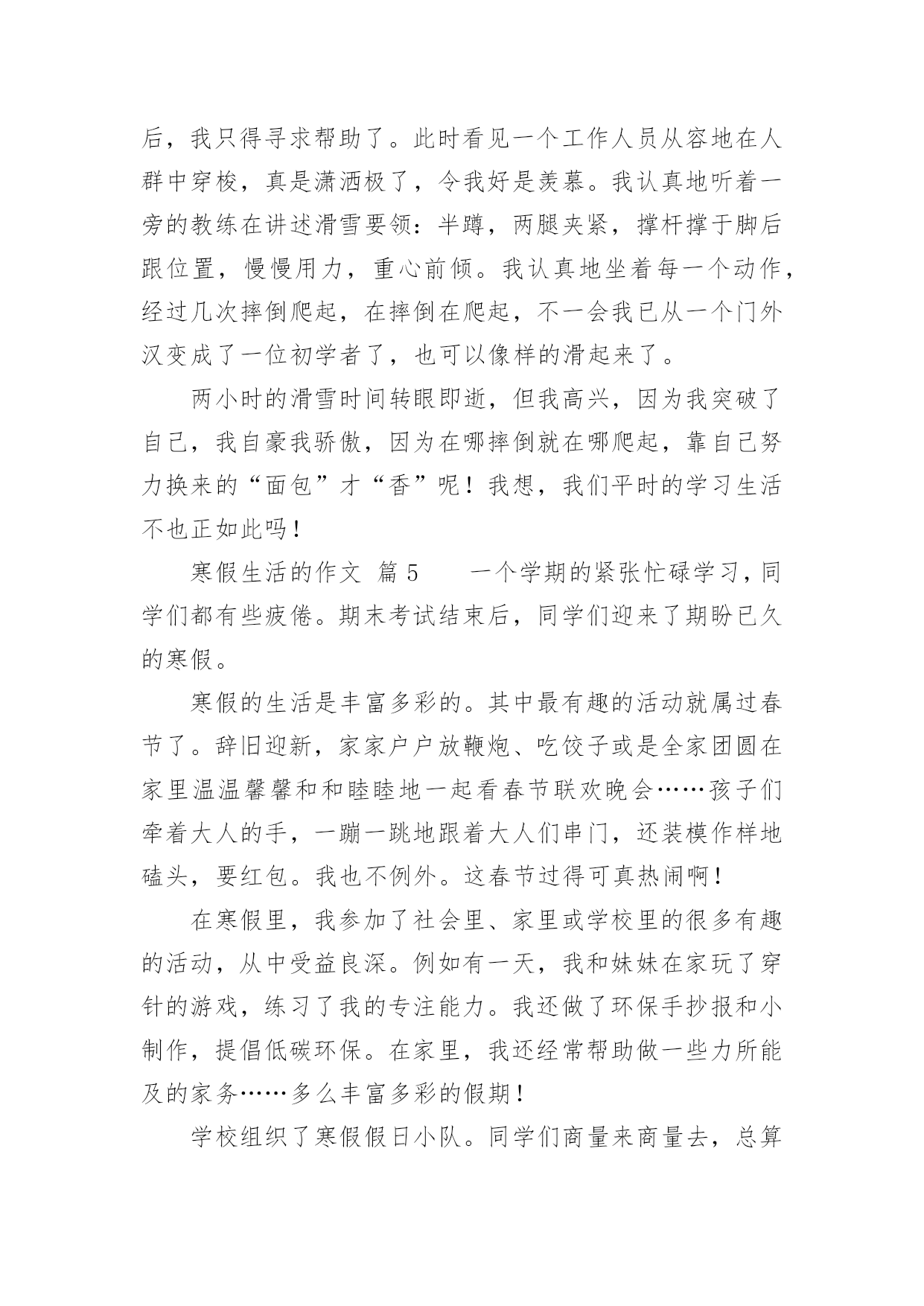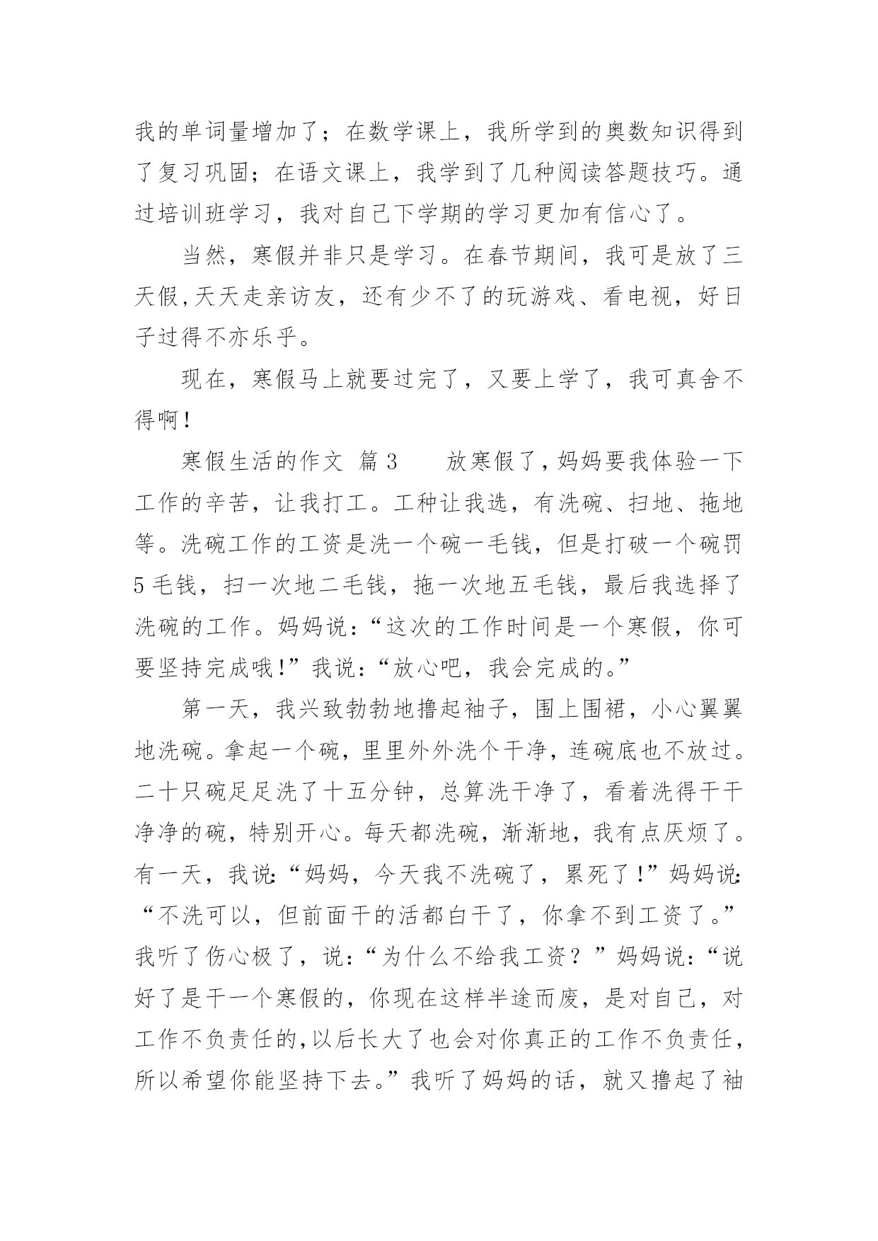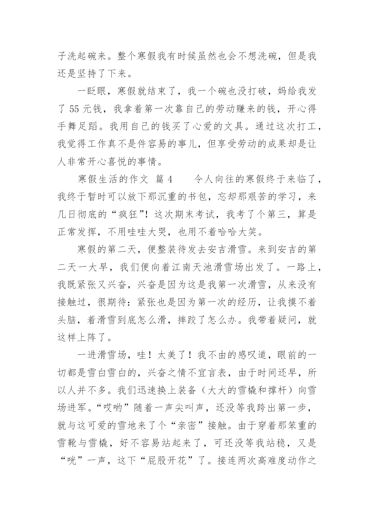 寒假生活的作文关于寒假生活的作文(通用34篇)在平平淡淡的日常中,大家都不可避免地要接触到作文吧,借助作文可以宣泄心中的情感,调节自己的心情。作文的注意事项有许多,你确定会写吗?下面是小编整理的关于寒假生活的作文,仅供参考,希望能够帮助到大家。寒假生活的作文篇1在愉快的寒假中,我经历过了很多有趣的事。但在我的记忆中,下雪是我印象最深的一个。那天上午,满天都是白色的:白房子、白树、白屋顶......白色的雪覆盖着大地。这时,我听见伙伴们的叫喊声,不由自主的下了楼。啊,雪真大呀!我是第一次看见这么大的雪,于是蹦蹦跳跳地在雪地上玩了起来,过了很久,我才想到要和伙伴们集合,我东张西望,终于找到伙伴们。突然,一个雪球向我砸来,我来不及躲闪只好乖乖被砸到了。"哈哈",这时传来了神秘的笑声,"是谁这么缺德,谁?"我生气的问道。张泽过来了,原来是伙伴们在玩打雪仗。郑恒达想让张泽受一下苦头,可这么一砸,张泽机灵的躲开了,可我却成了受害者。我明白了,原来这是一场小误会。看来是我错怪他们了。我和伙伴们重新商量了一下打雪仗的规则。于是分成两组,每组四个人,刚好一方在上,一方在下。也不能靠近对方的活动区。有了这规则,大家玩的更开心了。突然,我看见张泽拿起一块冰砸向了何弘昌,何弘昌没注意被砸到了肩,十分痛苦,而张泽却说,"谁让他先砸的我",何弘昌说,"我没有砸他"。说着就哭了起来。张泽见状,不但不到歉,还气冲冲的走了。"太过分了"。大家都说。这件事过后大家都瞧不起张泽了。虽然因为那件事有点不愉快,但我还是度过了很开心的一天。寒假生活的作文篇2寒假这两个字,对于我们小学生来说,实在是太期盼了。在我的想象中,寒假便是没有补习班,没有作业,成天可以和同学打游戏、看电视、和爸爸妈妈去旅行、在家陪着奶奶去亲戚家串门,一直玩到嗨,那才爽啊!可是,毕竟理想是美好的,现实是残酷的。我理想中寒假只是个白日梦!期末考试结束了,我可算是松了一口气,可是没过几天,我又开始了新的战斗——上培训班。刚开始我很不情愿,心想:“这是什么假期啊!天天有培训班,还不如上学呢!”可是我又一想:“上培训班的也不是只有我一人,别的同学也在上啊,他们也在努力拼搏。再说,爸爸妈妈花了钱也花了精力,希望通过培训班能帮助我提高学习成绩。我必须的努力学习,否则对不起爸爸妈妈呀!”我振作起来,开始认真上好每一堂培训班课程。在英语班上,我的单词量增加了;在数学课上,我所学到的奥数知识得到了复习巩固;在语文课上,我学到了几种阅读答题技巧。通过培训班学习,我对自己下学期的学习更加有信心了。当然,寒假并非只是学习。在春节期间,我可是放了三天假,天天走亲访友,还有少不了的玩游戏、看电视,好日子过得不亦乐乎。现在,寒假马上就要过完了,又要上学了,我可真舍不得啊!寒假生活的作文篇3放寒假了,妈妈要我体验一下工作的辛苦,让我打工。工种让我选,有洗碗、扫地、拖地等。洗碗工作的工资是洗一个碗一毛钱,但是打破一个碗罚5毛钱,扫一次地二毛钱,拖一次地五毛钱,最后我选择了洗碗的工作。妈妈说:“这次的工作时间是一个寒假,你可要坚持完成哦!”我说:“放心吧,我会完成的。”第一天,我兴致勃勃地撸起袖子,围上围裙,小心翼翼地洗碗。拿起一个碗,里里外外洗个干净,连碗底也不放过。二十只碗足足洗了十五分钟,总算洗干净了,看着洗得干干净净的碗,特别开心。每天都洗碗,渐渐地,我有点厌烦了。有一天,我说:“妈妈,今天我不洗碗了,累死了!”妈妈说:“不洗可以,但前面干的活都白干了,你拿不到工资了。”我听了伤心极了,说:“为什么不给我工资?”妈妈说:“说好了是干一个寒假的,你现在这样半途而废,是对自己,对工作不负责任的,以后长大了也会对你真正的工作不负责任,所以希望你能坚持下去。”我听了妈妈的话,就又撸起了袖子洗起碗来。整个寒假我有时候虽然也会不想洗碗,但是我还是坚持了下来。一眨眼,寒假就结束了,我一个碗也没打破,妈给我发了55元钱,我拿着第一次靠自己的劳动赚来的钱,开心得手舞足蹈。我用自己的钱买了心爱的文具。通过这次打工,我觉得工作真不是件容易的事儿,但享受劳动的成果却是让人非常开心喜悦的事情。寒假生活的作文篇4令人向往的寒假终于来临了,我终于暂时可以放下那沉重的书包,忘却那艰苦的学习,来几日彻底的“疯狂”!这次期末考试,我考了个第三,算是正常发挥,不用哇哇大哭,也用不着哈哈大笑。寒假的第二天,便整装待发去安吉滑雪。来到安吉的第二天一大早,我们便向着江南天池滑雪场出发了。一路上,我既紧张又兴奋,兴奋是因为这是我第一次滑雪,从来没有接触过,很期待:紧张也是因为第一次的经历,让我摸不着头脑,着滑雪到底怎么滑,摔跤了怎么办。我带着疑问,就这样上阵了。一进滑雪