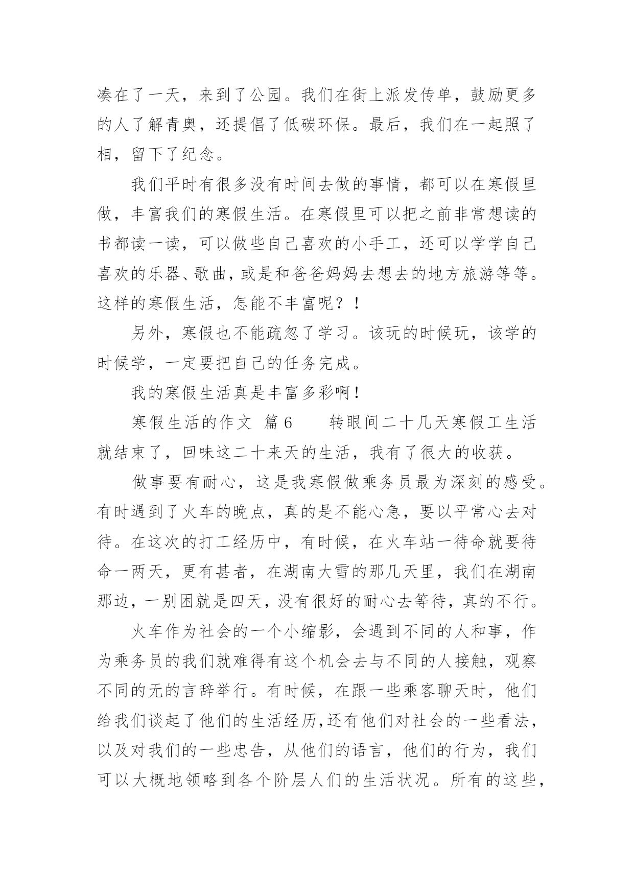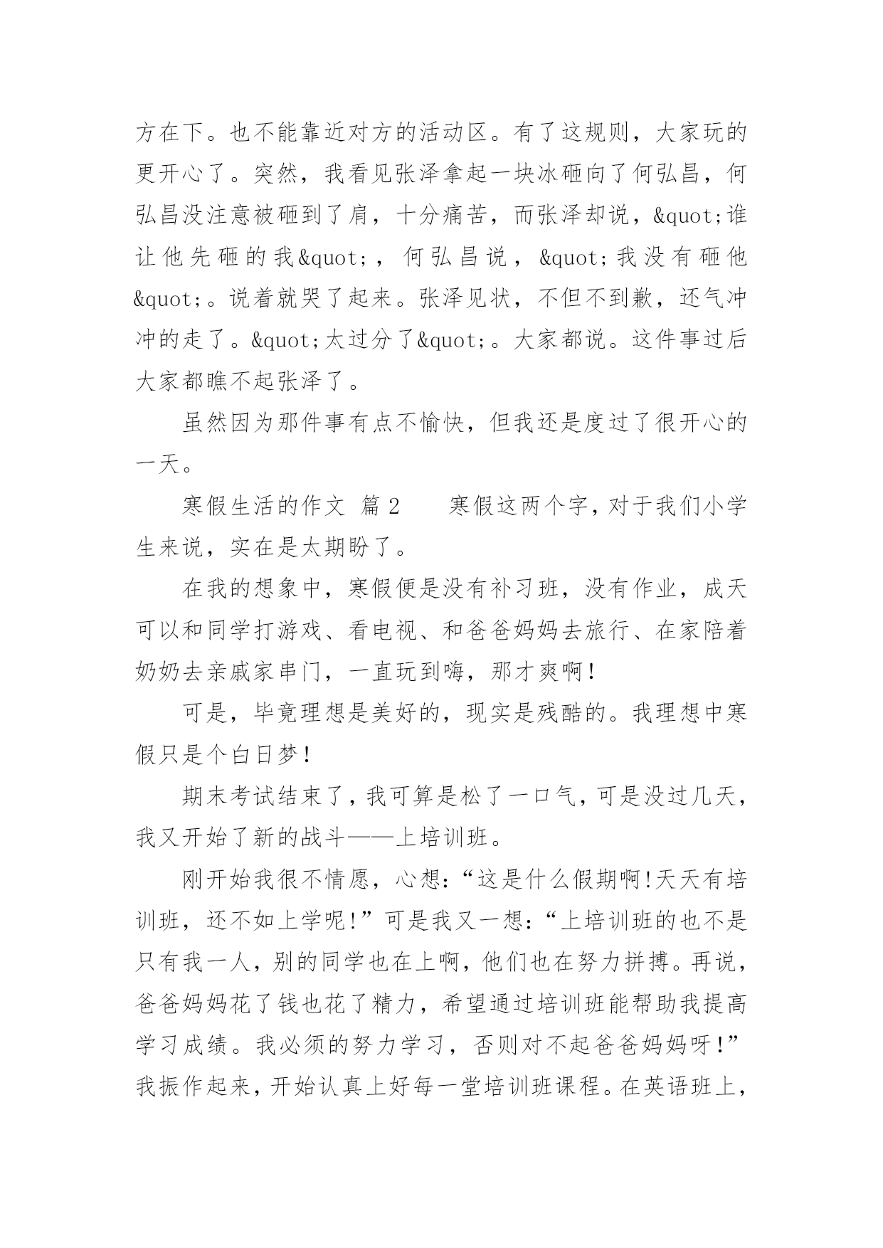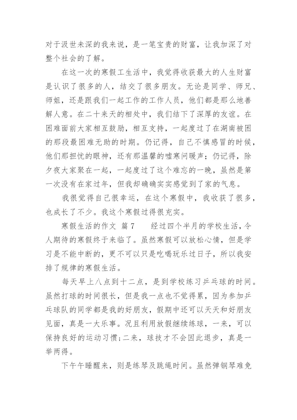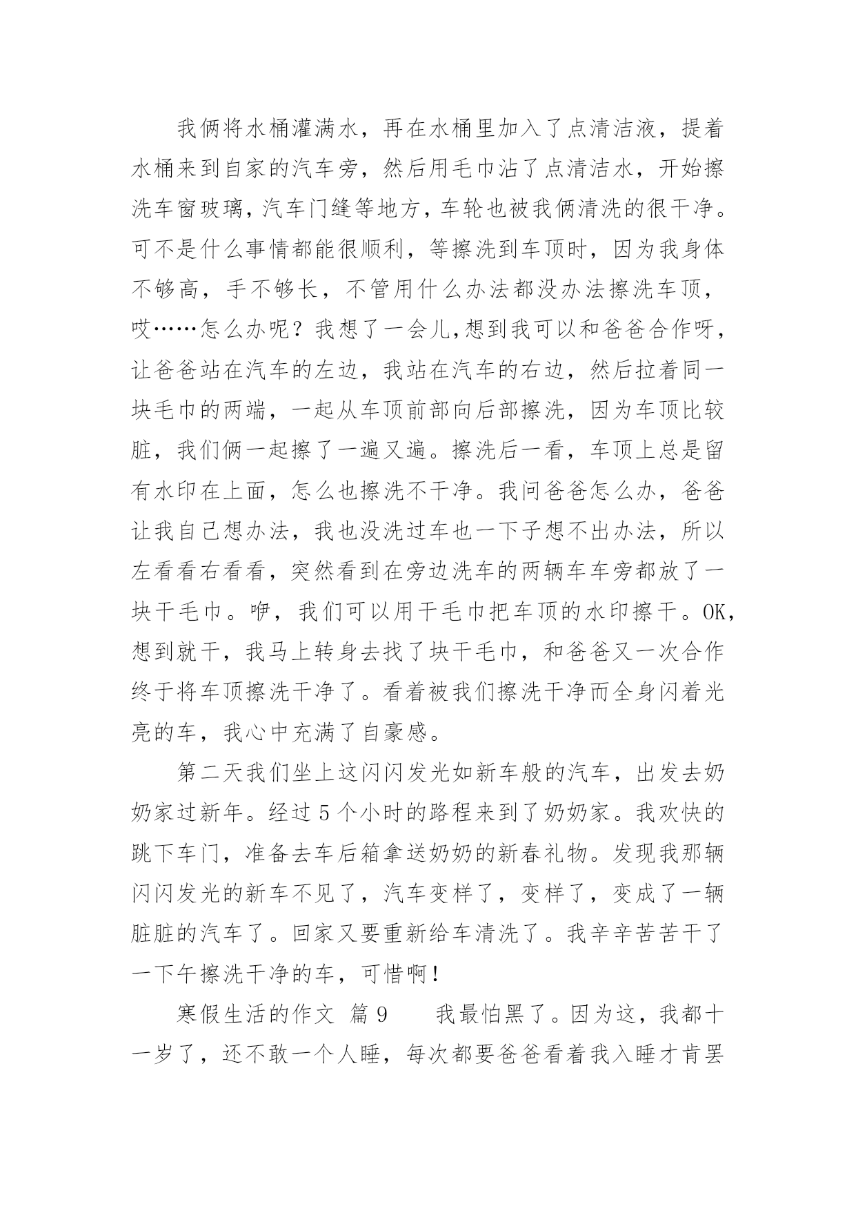 寒假生活的作文关于寒假生活的作文(通用34篇)在平平淡淡的日常中,大家都不可避免地要接触到作文吧,借助作文可以宣泄心中的情感,调节自己的心情。作文的注意事项有许多,你确定会写吗?下面是小编整理的关于寒假生活的作文,仅供参考,希望能够帮助到大家。寒假生活的作文篇1在愉快的寒假中,我经历过了很多有趣的事。但在我的记忆中,下雪是我印象最深的一个。那天上午,满天都是白色的:白房子、白树、白屋顶......白色的雪覆盖着大地。这时,我听见伙伴们的叫喊声,不由自主的下了楼。啊,雪真大呀!我是第一次看见这么大的雪,于是蹦蹦跳跳地在雪地上玩了起来,过了很久,我才想到要和伙伴们集合,我东张西望,终于找到伙伴们。突然,一个雪球向我砸来,我来不及躲闪只好乖乖被砸到了。"哈哈",这时传来了神秘的笑声,"是谁这么缺德,谁?"我生气的问道。张泽过来了,原来是伙伴们在玩打雪仗。郑恒达想让张泽受一下苦头,可这么一砸,张泽机灵的躲开了,可我却成了受害者。我明白了,原来这是一场小误会。看来是我错怪他们了。我和伙伴们重新商量了一下打雪仗的规则。于是分成两组,每组四个人,刚好一方在上,一方在下。也不能靠近对方的活动区。有了这规则,大家玩的更开心了。突然,我看见张泽拿起一块冰砸向了何弘昌,何弘昌没注意被砸到了肩,十分痛苦,而张泽却说,"谁让他先砸的我",何弘昌说,"我没有砸他"。说着就哭了起来。张泽见状,不但不到歉,还气冲冲的走了。"太过分了"。大家都说。这件事过后大家都瞧不起张泽了。虽然因为那件事有点不愉快,但我还是度过了很开心的一天。寒假生活的作文篇2寒假这两个字,对于我们小学生来说,实在是太期盼了。在我的想象中,寒假便是没有补习班,没有作业,成天可以和同学打游戏、看电视、和爸爸妈妈去旅行、在家陪着奶奶去亲戚家串门,一直玩到嗨,那才爽啊!可是,毕竟理想是美好的,现实是残酷的。我理想中寒假只是个白日梦!期末考试结束了,我可算是松了一口气,可是没过几天,我又开始了新的战斗——上培训班。刚开始我很不情愿,心想:“这是什么假期啊!天天有培训班,还不如上学呢!”可是我又一想:“上培训班的也不是只有我一人,别的同学也在上啊,他们也在努力拼搏。再说,爸爸妈妈花了钱也花了精力,希望通过培训班能帮助我提高学习成绩。我必须的努力学习,否则对不起爸爸妈妈呀!”我振作起来,开始认真上好每一堂培训班课程。在英语班上,我的单词量增加了;在数学课上,我所学到的奥数知识得到了复习巩固;在语文课上,我学到了几种阅读答题技巧。通过培训班学习,我对自己下学期的学习更加有信心了。当然,寒假并非只是学习。在春节期间,我可是放了三天假,天天走亲访友,还有少不了的玩游戏、看电视,好日子过得不亦乐乎。现在,寒假马上就要过完了,又要上学了,我可真舍不得啊!寒假生活的作文篇3放寒假了,妈妈要我体验一下工作的辛苦,让我打工。工种让我选,有洗碗、扫地、拖地等。洗碗工作的工资是洗一个碗一毛钱,但是打破一个碗罚5毛钱,扫一次地二毛钱,拖一次地五毛钱,最后我选择了洗碗的工作。妈妈说:“这次的工作时间是一个寒假,你可要坚持完成哦!”我说:“放心吧,我会完成的。”第一天,我兴致勃勃地撸起袖子,围上围裙,小心翼翼地洗碗。拿起一个碗,里里外外洗个干净,连碗底也不放过。二十只碗足足洗了十五分钟,总算洗干净了,看着洗得干干净净的碗,特别开心。每天都洗碗,渐渐地,我有点厌烦了。有一天,我说:“妈妈,今天我不洗碗了,累死了!”妈妈说:“不洗可以,但前面干的活都白干了,你拿不到工资了。”我听了伤心极了,说:“为什么不给我工资?”妈妈说:“说好了是干一个寒假的,你现在这样半途而废,是对自己,对工作不负责任的,以后长大了也会对你真正的工作不负责任,所以希望你能坚持下去。”我听了妈妈的话,就又撸起了袖子洗起碗来。整个寒假我有时候虽然也会不想洗碗,但是我还是坚持了下来。一眨眼,寒假就结束了,我一个碗也没打破,妈给我发了55元钱,我拿着第一次靠自己的劳动赚来的钱,开心得手舞足蹈。我用自己的钱买了心爱的文具。通过这次打工,我觉得工作真不是件容易的事儿,但享受劳动的成果却是让人非常开心喜悦的事情。寒假生活的作文篇4令人向往的寒假终于来临了,我终于暂时可以放下那沉重的书包,忘却那艰苦的学习,来几日彻底的“疯狂”!这次期末考试,我考了个第三,算是正常发挥,不用哇哇大哭,也用不着哈哈大笑。寒假的第二天,便整装待发去安吉滑雪。来到安吉的第二天一大早,我们便向着江南天池滑雪场出发了。一路上,我既紧张又兴奋,兴奋是因为这是我第一次滑雪,从来没有接触过,很期待:紧张也是因为第一次的经历,让我摸不着头脑,着滑雪到底怎么滑,摔跤了怎么办。我带着疑问,就这样上阵了。一进滑雪