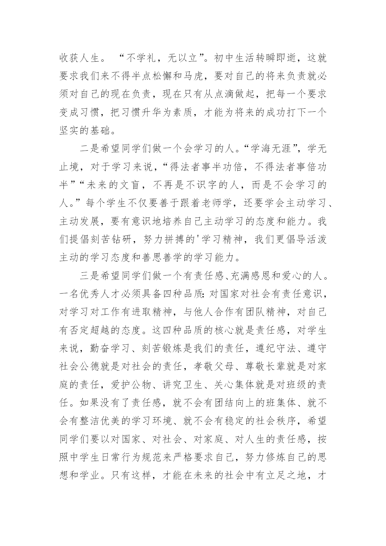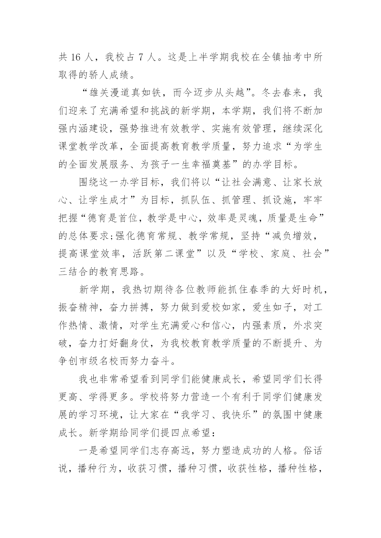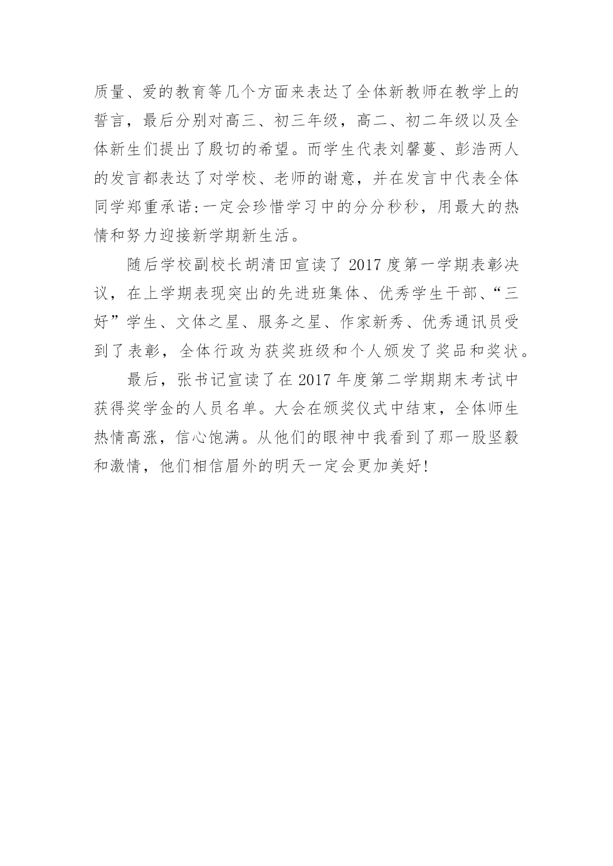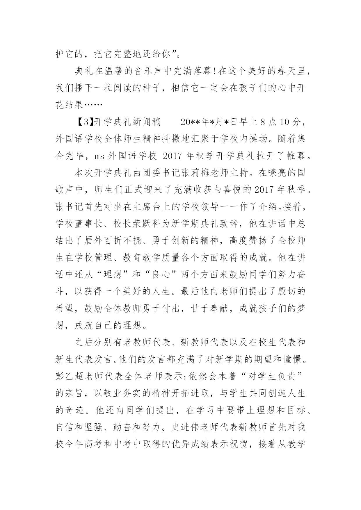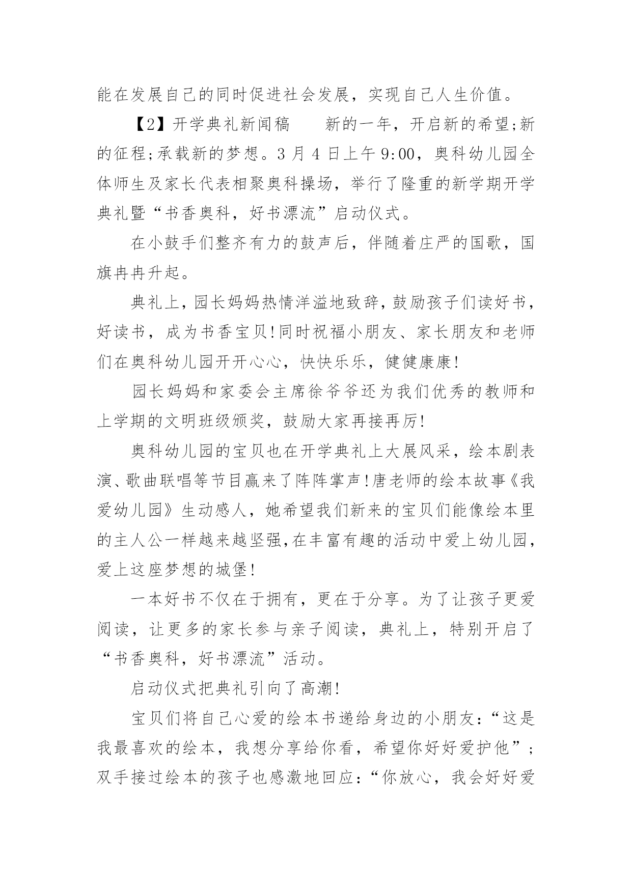 开学典礼新闻稿2017年开学典礼新闻稿良好的开端是成功的一半,开学典礼的举行预示着全校师生将站在新的起点,迎接新的挑战,升起新的希望,收获新的成果。下面是小编整理的关于开学典礼新闻稿的范文,欢迎参考!【1】开学典礼新闻稿老师们、同学们:新春伊始,万象更新。踏着春天的脚步,我们又回到了美丽的校园,步入了新学期,开始了新一年的播种与耕耘。首先,我代表校委会向全校师生致以最诚挚的新春祝福!祝同学们学习进步、快乐成长,祝各位教师事业有成,生活幸福,祝我们的学校各项工作百尺竿头更进一步!刚刚过去的一年,在上级的正确领导下,经过全体师生的共同努力,我校各项工作都取得了显著的成绩。20xx年11月,我校成功创建了xx市标准化学校;12月份,我校又被市教育局评为“语言文字规范化学校”和“依法治校示范校”;在全镇抽考中,我校三四五年级总平均分位居全镇第一,其中三年级语文包揽前三名,前10名我校占5人,数学包揽前两名,前10名共26人,我校占11人,四年级语文包揽前两名,前10名我校占5人,数学包揽前两名,前10名共13人,我校占10人,五年级语文我校屈居第二和第三,前10名共13人,我校占7人,数学包揽前两名,前10名共16人,我校占7人。这是上半学期我校在全镇抽考中所取得的骄人成绩。“雄关漫道真如铁,而今迈步从头越”。冬去春来,我们迎来了充满希望和挑战的新学期,本学期,我们将不断加强内涵建设,强势推进有效教学、实施有效管理,继续深化课堂教学改革,全面提高教育教学质量,努力追求“为学生的全面发展服务、为孩子一生幸福奠基”的办学目标。围绕这一办学目标,我们将以“让社会满意、让家长放心、让学生成才”为目标,抓队伍、抓管理、抓设施,牢牢把握“德育是首位,教学是中心,效率是灵魂,质量是生命”的总体要求;强化德育常规、教学常规,坚持“减负增效,提高课堂效率,活跃第二课堂”以及“学校、家庭、社会”三结合的教育思路。新学期,我热切期待各位教师能抓住春季的大好时机,振奋精神,奋力拼搏,努力做到爱校如家,爱生如子,对工作热情、激情,对学生充满爱心和信心,内强素质,外求突破,奋力打好翻身仗,为我校教育教学质量的不断提升、为争创市级名校而努力奋斗。我也非常希望看到同学们能健康成长,希望同学们长得更高、学得更多。学校将努力营造一个有利于同学们健康发展的学习环境,让大家在“我学习、我快乐”的氛围中健康成长。新学期给同学们提四点希望:一是希望同学们志存高远,努力塑造成功的人格。俗话说,播种行为,收获习惯,播种习惯,收获性格,播种性格,收获人生。“不学礼,无以立”。初中生活转瞬即逝,这就要求我们来不得半点松懈和马虎,要对自己的将来负责就必须对自己的现在负责,现在只有从点滴做起,把每一个要求变成习惯,把习惯升华为素质,才能为将来的成功打下一个坚实的基础。二是希望同学们做一个会学习的人。“学海无涯”,学无止境,对于学习来说,“得法者事半功倍,不得法者事倍功半”“未来的文盲,不再是不识字的人,而是不会学习的人。”每个学生不仅要善于跟着老师学,还要学会主动学习、主动发展,要有意识地培养自己主动学习的态度和能力。我们提倡刻苦钻研,努力拼搏的'学习精神,我们更倡导活泼主动的学习态度和善思善学的学习能力。三是希望同学们做一个有责任感、充满感恩和爱心的人。一名优秀人才必须具备四种品质:对国家对社会有责任意识,对学习对工作有进取精神,与他人合作有团队精神,对自己有否定超越的态度。这四种品质的核心就是责任感,对学生来说,勤奋学习、刻苦锻炼是我们的责任,遵纪守法、遵守社会公德就是对社会的责任,孝敬父母、尊敬长辈就是对家庭的责任,爱护公物、讲究卫生、关心集体就是对班级的责任。如果没有了责任感,就不会有团结向上的班集体、就不会有整洁优美的学习环境、就不会有稳定的社会秩序,希望同学们要以对国家、对社会、对家庭、对人生的责任感,按照中学生日常行为规范来严格要求自己,努力修炼自己的思想和学业。只有这样,才能在未来的社会中有立足之地,才能在发展自己的同时促进社会发展,实现自己人生价值。【2】开学典礼新闻稿新的一年,开启新的希望;新的征程;承载新的梦想。3月4日上午9:00,奥科幼儿园全体师生及家长代表相聚奥科操场,举行了隆重的新学期开学典礼暨“书香奥科,好书漂流”启动仪式。在小鼓手们整齐有力的鼓声后,伴随着庄严的国歌,国旗冉冉升起。典礼上,园长妈妈热情洋溢地致辞,鼓励孩子们读好书,好读书,成为书香宝贝!同时祝福小朋友、家长朋友和老师们在奥科幼儿园开开心心,快快乐乐,健健康康!园长妈妈和家委会主席徐爷爷还为我们优秀的教师和上学期的文明班级颁奖,鼓励大家再接再厉!奥科幼儿园的宝贝也在开学典礼上大展风采,绘本剧表演、歌曲联唱等节目赢来了阵阵掌声!唐老师的绘本故事《我爱幼儿园》生动感人,她希望我们新来的宝贝们能