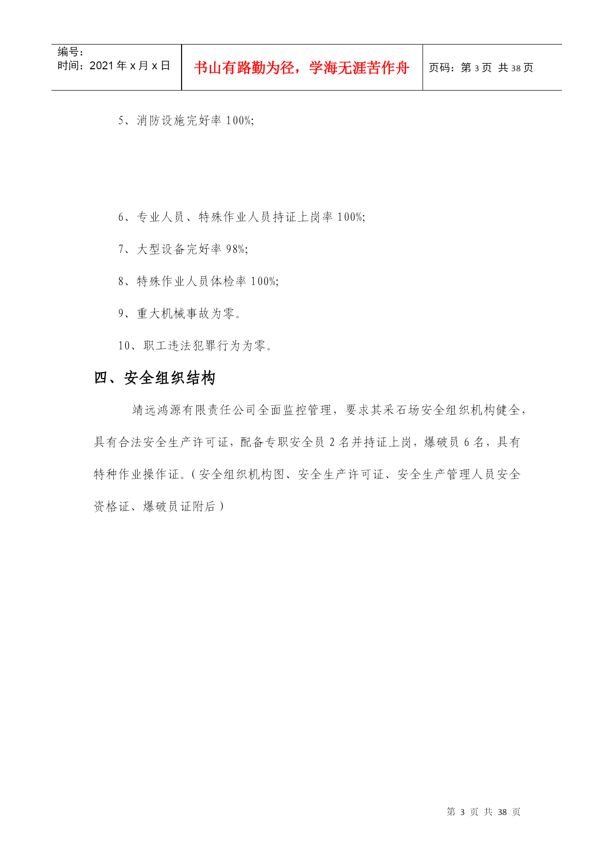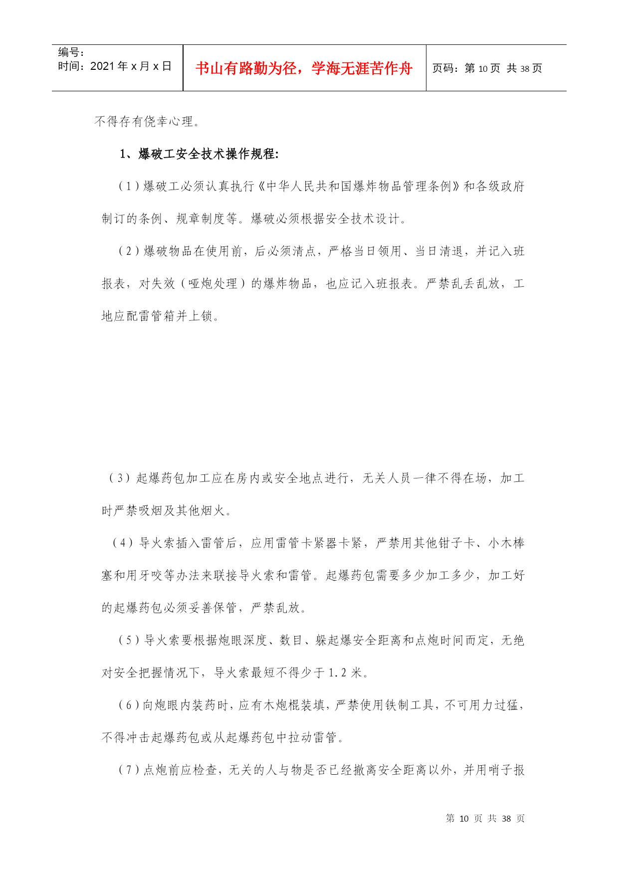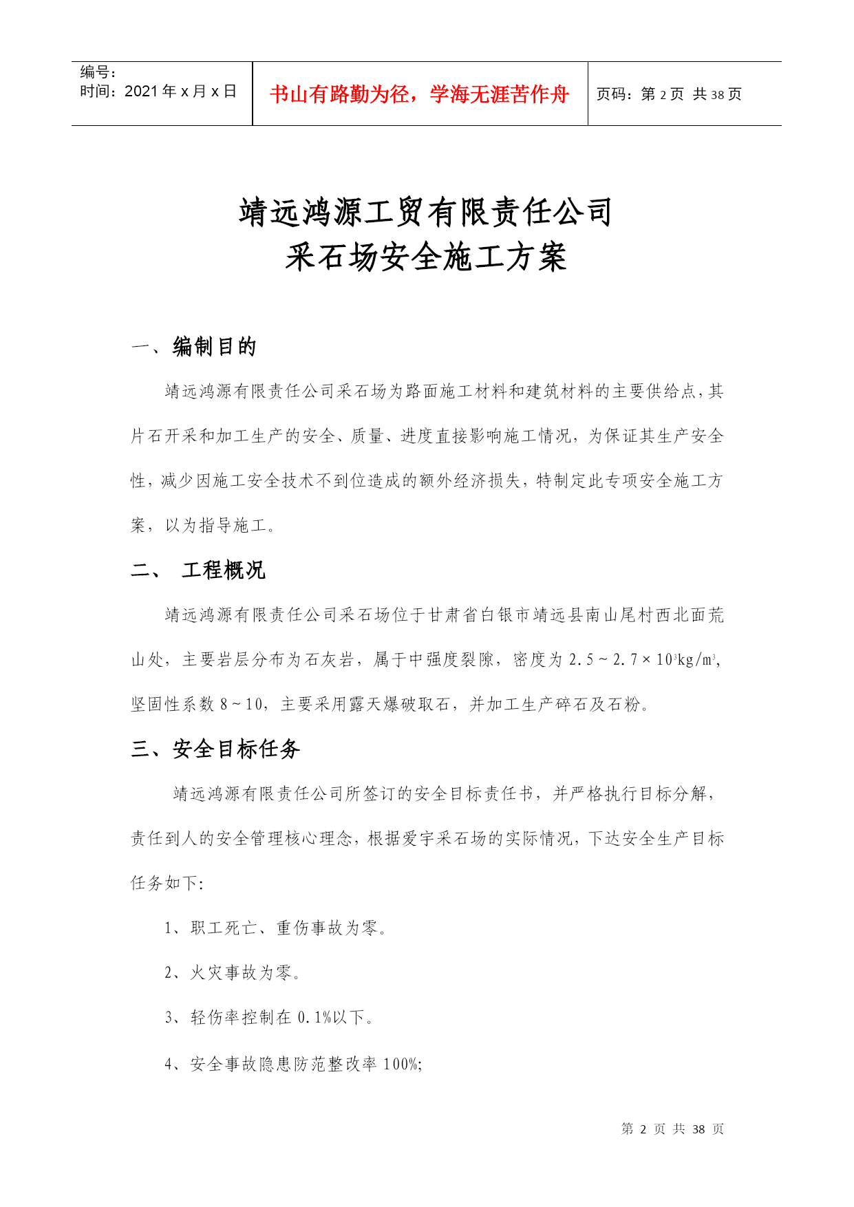 编号:时间:2021年x月x日书山有路勤为径,学海无涯苦作舟页码:第PAGE38页共NUMPAGES38页第PAGE\*MERGEFORMAT38页共NUMPAGES\*MERGEFORMAT38页采石场安全施工方案靖远鸿源工贸有限责任公司靖远鸿源工贸有限责任公司采石场安全施工方案一、编制目的靖远鸿源有限责任公司采石场为路面施工材料和建筑材料的主要供给点,其片石开采和加工生产的安全、质量、进度直接影响施工情况,为保证其生产安全性,减少因施工安全技术不到位造成的额外经济损失,特制定此专项安全施工方案,以为指导施工。工程概况靖远鸿源有限责任公司采石场位于甘肃省白银市靖远县南山尾村西北面荒山处,主要岩层分布为石灰岩,属于中强度裂隙,密度为2.5~2.7×103kg/m3,坚固性系数8~10,主要采用露天爆破取石,并加工生产碎石及石粉。三、安全目标任务靖远鸿源有限责任公司所签订的安全目标责任书,并严格执行目标分解,责任到人的安全管理核心理念,根据爱宇采石场的实际情况,下达安全生产目标任务如下:1、职工死亡、重伤事故为零。2、火灾事故为零。3、轻伤率控制在0.1%以下。4、安全事故隐患防范整改率100%;5、消防设施完好率100%;6、专业人员、特殊作业人员持证上岗率100%;7、大型设备完好率98%;8、特殊作业人员体检率100%;9、重大机械事故为零。10、职工违法犯罪行为为零。四、安全组织结构靖远鸿源有限责任公司全面监控管理,要求其采石场安全组织机构健全,具有合法安全生产许可证,配备专职安全员2名并持证上岗,爆破员6名,具有特种作业操作证。(安全组织机构图、安全生产许可证、安全生产管理人员安全资格证、爆破员证附后)五、施工现场安全管理(一)现场管理为保证鸿源采石场日常安全生产,靖远鸿源有限责任公司委派专职安全员全天候监督现场安全工作,对违规违章行为立即进行现场纠正,场内作业人员及作业机械必须无条件服从管理,并积极配合、参加现场组织的安全生产学习,掌握相应的安全生产技术,提高自身安全意识。(二)技术管理鸿源采石场场内人员及机械均为特种作业,安全风险系数高,在投入生产生产之前,特种作业人员及特种机械操作人员必须经过严格的入场“三级“安全教育,并通过项目部安全科对其作业内容进行有针对性的安全技术交底,生产期间必须严格遵守各岗位操作规程,正确佩戴安全防护用品,特别是在爆破断面临近位置作业,必须随时观察岩面变化情况,不得大意、怠慢,不得抱有麻痹思想,不得存有侥幸心理。1、爆破工安全技术操作规程:(1)爆破工必须认真执行《中华人民共和国爆炸物品管理条例》和各级政府制订的条例、规章制度等。爆破必须根据HYPERLINK""\t"_blank"安全技术设计。(2)爆破物品在使用前,后必须清点,严格当日领用、当日清退,并记入班报表,对失效(哑炮处理)的爆炸物品,也应记入班报表。严禁乱丢乱放,工地应配雷管箱并上锁。(3)起爆药包加工应在房内或安全地点进行,无关人员一律不得在场,加工时严禁吸烟及其他烟火。(4)导火索插入雷管后,应用雷管卡紧器卡紧,严禁用其他钳子卡、小木棒塞和用牙咬等办法来联接导火索和雷管。起爆药包需要多少加工多少,加工好的起爆药包必须妥善保管,严禁乱放。(5)导火索要根据炮眼深度、数目、躲起爆安全距离和点炮时间而定,无绝对安全把握情况下,导火索最短不得少于1.2米。(6)向炮眼内装药时,应有木炮棍装填,严禁使用铁制工具,不可用力过猛,不得冲击起爆药包或从起爆药包中拉动雷管。(7)点炮前应检查,无关的人与物是否已经撤离安全距离以外,并用哨子报警。确认安全后才能点炮。(8)点炮时必须有专人指挥,点炮数目在两个以上时,禁止使用火柴、香烟等点火、应使导火索点。(9)点炮后爆破手必须仔细听清炮响数目,如炮响数目与点炮数目不符或不清时,应根据导火索燃速,确定进入爆破区检查时间,但最少应等到最后一个炮响后30分钟。(10)放炮后,不管有无哑炮,爆破员必须对爆破现场进行仔细检查,确认安全后,才能吹哨子解除警报。2、电工安全操作规程(1)所有绝缘、检验工具,应妥善保管,严禁他用,并应定期检查、校验。(2)现场施工用高低压设备及线路,应按施工设计及有关电气安全技术规程安装和架设。(3)线路上禁止带负荷接电或断电,并禁止带电操作。(4)有人触电,立即切断电源,进