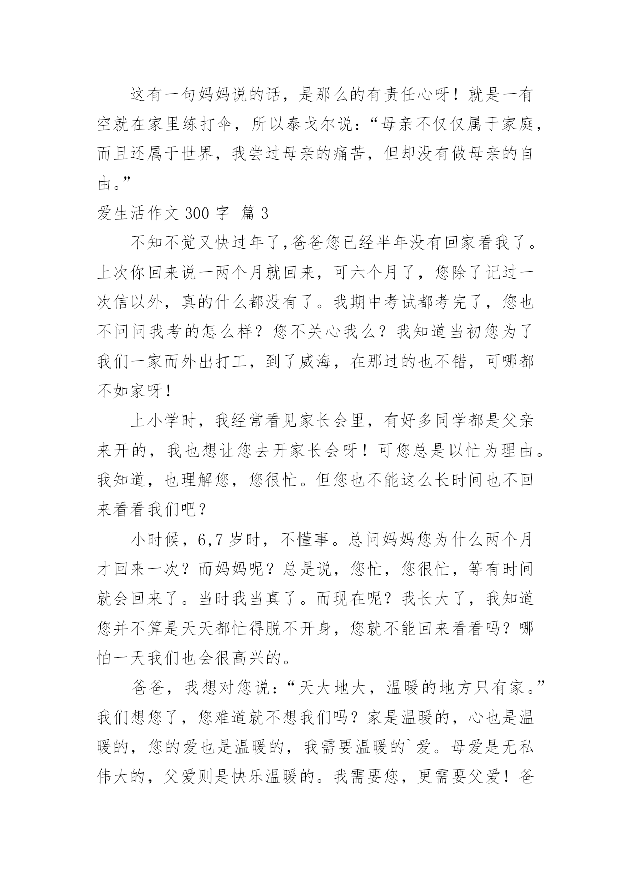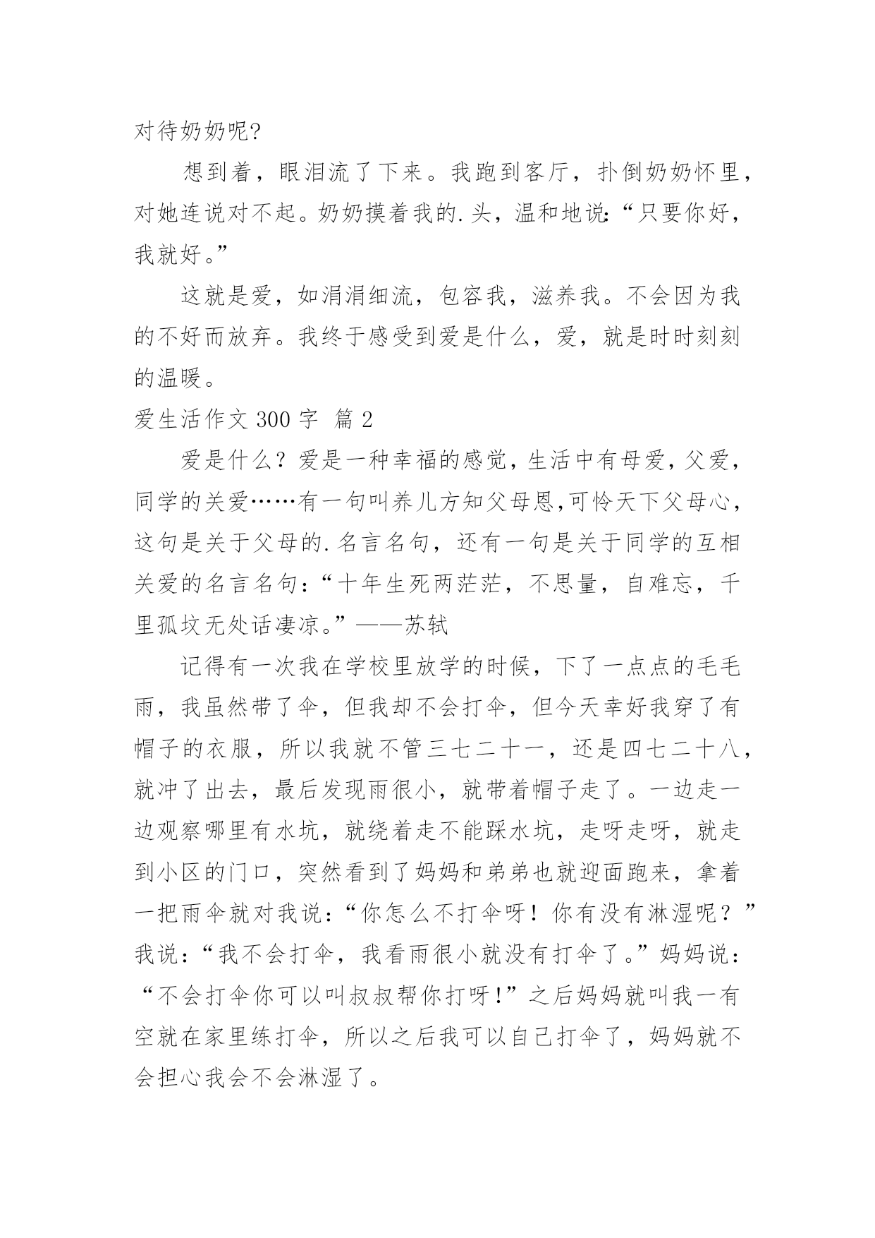 爱生活作文300字爱生活作文300字在平平淡淡的日常中,大家对作文都再熟悉不过了吧,借助作文人们可以实现文化交流的目的。那么,怎么去写作文呢?以下是小编为大家收集的爱生活作文300字3篇,希望能够帮助到大家。爱生活作文300字篇1一花一世界,一叶一追寻。一曲一声叹,一生为一人。爱,是多么的伟大,不畏生死,不惧岁月;爱,是多么的美好,从清晨到黄昏,从年幼到青春。爱,是那么的美妙,让生活更加美好。记得有一次,阳光是令人无比的舒适,小草被风轻飘飘吹动,好像在为谁舞蹈。走进家门,奶奶正在给我洗衣服,脸上不时落下汗珠。之后,我和奶奶吵了一架,为一些鸡毛蒜皮的小事。我回到自己的房间,不停地抱怨。而奶奶坐在沙发上看电视,可是,电视的内容是什么仿佛已经与奶奶无关,她只想把我引出来。我没有动,奶奶等了一会,看我还是不出屋,就走进我得房间里,哄我。我还是板着脸无动于衷,不理她。奶奶只好垂着头叹了一口气,出去了。门轻轻地关上,我有点后悔了。我是不是太过分了呢?奶奶这么爱我疼我,所有好东西都留给我,无微不至地照顾我。就算我发脾气,她还是一如既往地哄我。我怎么能这样对待奶奶呢?想到着,眼泪流了下来。我跑到客厅,扑倒奶奶怀里,对她连说对不起。奶奶摸着我的.头,温和地说:“只要你好,我就好。”这就是爱,如涓涓细流,包容我,滋养我。不会因为我的不好而放弃。我终于感受到爱是什么,爱,就是时时刻刻的温暖。爱生活作文300字篇2爱是什么?爱是一种幸福的感觉,生活中有母爱,父爱,同学的关爱……有一句叫养儿方知父母恩,可怜天下父母心,这句是关于父母的.名言名句,还有一句是关于同学的互相关爱的名言名句:“十年生死两茫茫,不思量,自难忘,千里孤坟无处话凄凉。”——苏轼记得有一次我在学校里放学的时候,下了一点点的毛毛雨,我虽然带了伞,但我却不会打伞,但今天幸好我穿了有帽子的衣服,所以我就不管三七二十一,还是四七二十八,就冲了出去,最后发现雨很小,就带着帽子走了。一边走一边观察哪里有水坑,就绕着走不能踩水坑,走呀走呀,就走到小区的门口,突然看到了妈妈和弟弟也就迎面跑来,拿着一把雨伞就对我说:“你怎么不打伞呀!你有没有淋湿呢?”我说:“我不会打伞,我看雨很小就没有打伞了。”妈妈说:“不会打伞你可以叫叔叔帮你打呀!”之后妈妈就叫我一有空就在家里练打伞,所以之后我可以自己打伞了,妈妈就不会担心我会不会淋湿了。这有一句妈妈说的话,是那么的有责任心呀!就是一有空就在家里练打伞,所以泰戈尔说:“母亲不仅仅属于家庭,而且还属于世界,我尝过母亲的痛苦,但却没有做母亲的自由。”爱生活作文300字篇3不知不觉又快过年了,爸爸您已经半年没有回家看我了。上次你回来说一两个月就回来,可六个月了,您除了记过一次信以外,真的什么都没有了。我期中考试都考完了,您也不问问我考的怎么样?您不关心我么?我知道当初您为了我们一家而外出打工,到了威海,在那过的也不错,可哪都不如家呀!上小学时,我经常看见家长会里,有好多同学都是父亲来开的,我也想让您去开家长会呀!可您总是以忙为理由。我知道,也理解您,您很忙。但您也不能这么长时间也不回来看看我们吧?小时候,6,7岁时,不懂事。总问妈妈您为什么两个月才回来一次?而妈妈呢?总是说,您忙,您很忙,等有时间就会回来了。当时我当真了。而现在呢?我长大了,我知道您并不算是天天都忙得脱不开身,您就不能回来看看吗?哪怕一天我们也会很高兴的。爸爸,我想对您说:“天大地大,温暖的地方只有家。”我们想您了,您难道就不想我们吗?家是温暖的,心也是温暖的,您的爱也是温暖的,我需要温暖的`爱。母爱是无私伟大的,父爱则是快乐温暖的。我需要您,更需要父爱!爸爸您忙吧!我能理解您!我愿意等您回来,亲耳听到我对您说:“我爱您。”