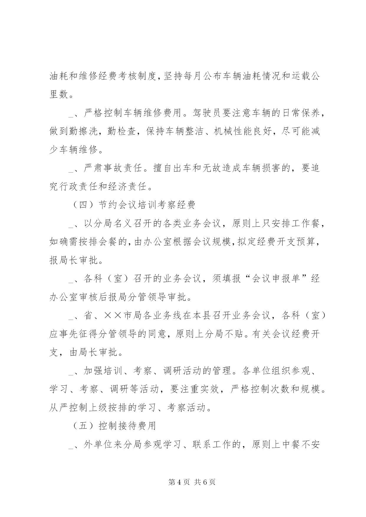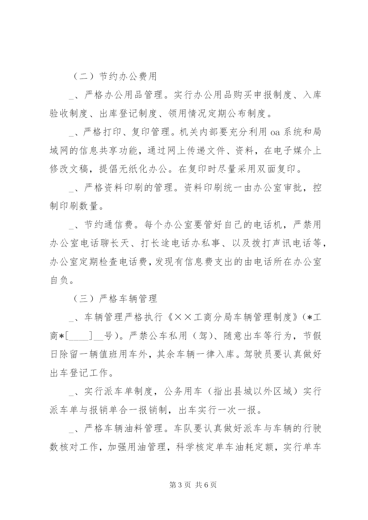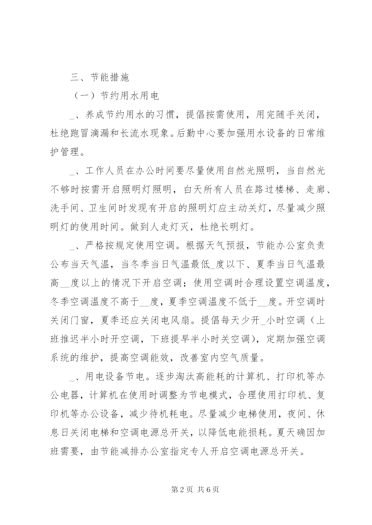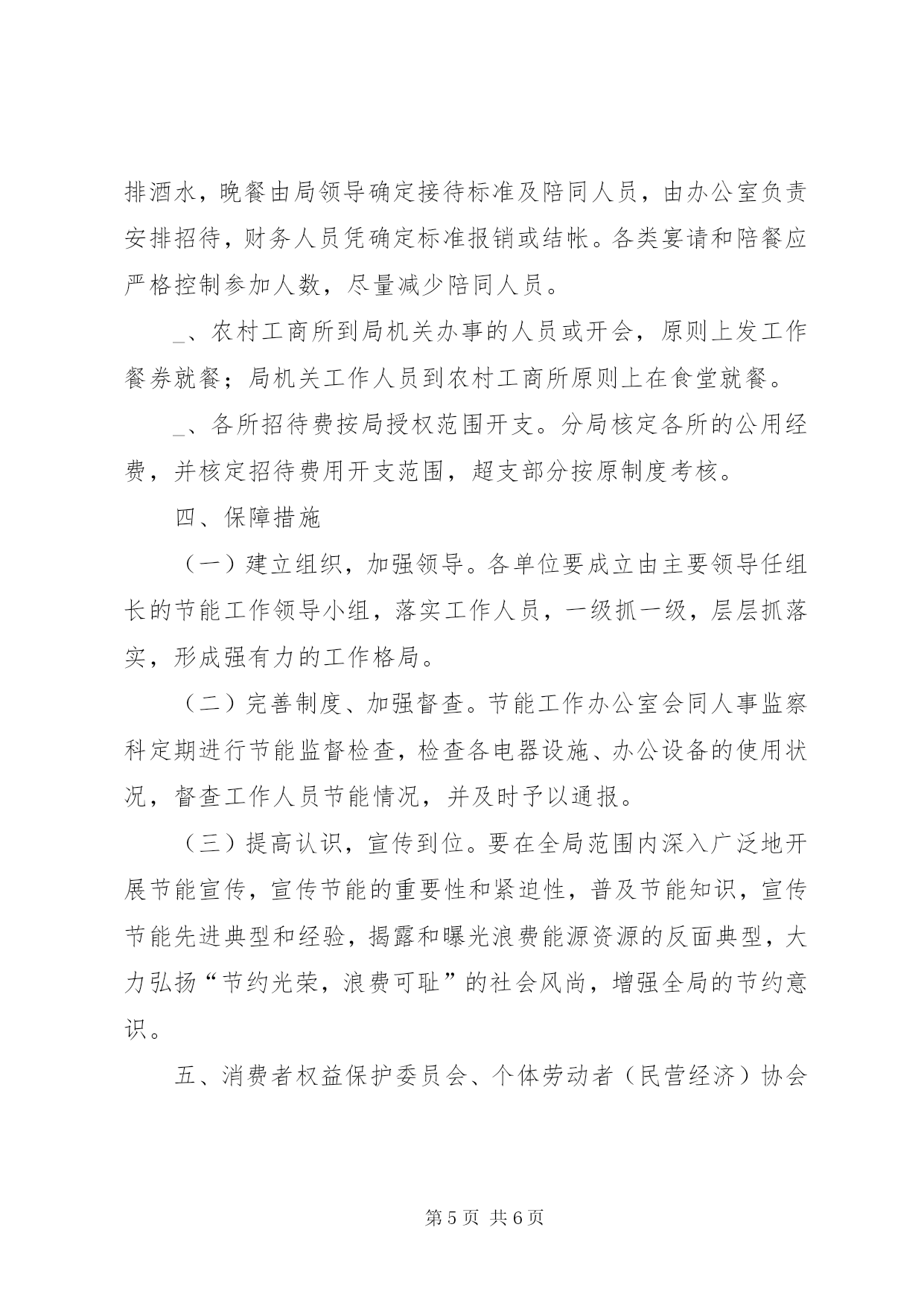 第PAGE\*Arabic\*MERGEFORMAT6页共NUMPAGES\*MERGEFORMAT6页工商分局节能减排实施方案局属各单位:为进一步推进分局节能减排工作,在全系统形成“厉行节约,杜绝浪费”的良好风气,根据《××县二__九年节能工作实施方案的通知》(*政发〔____〕__号)精神,结合分局实际,特制定本工作方案。一、指导思想以十七大精神和××在全国节能减排工作电视电话会议上的重要讲话为指针,以《节约能源法》为依据,以科学发展观为指导,深入贯彻落实科学发展观,把建设资源节约型、环境友好型机关放在突出位置,落实责任、加强监管、强化考核,确保完成分局节能降耗约束性指标任务,实现“_个零增长”,即:水电费、办公费、公务用车车均费用、会议费、接待费用零增长。二、组织领导为切实加强对节能减排工作的组织领导,成立分局节能减排工作领导小组,负责全局节能减排工作的部署、开展、检查落实工作。领导小组由××任组长,××、××、××任副组长,××、××、××、××、××、××、××为成员。领导小组下设办公室,具体负责节能工作的计划安排、统计分析、组织落实等日常工作,××兼任办公室主任,××、××、××、××、××、××为办公室工作人员。三、节能措施(一)节约用水用电_、养成节约用水的习惯,提倡按需使用,用完随手关闭,杜绝跑冒滴漏和长流水现象。后勤中心要加强用水设备的日常维护管理。_、工作人员在办公时间要尽量使用自然光照明,当自然光不够时按需开启照明灯照明,白天所有人员在路过楼梯、走廊、洗手间、卫生间时发现有开启的照明灯应主动关灯,尽量减少照明灯的使用时间。做到人走灯灭,杜绝长明灯。_、严格按规定使用空调。根据天气预报,节能办公室负责公布当天气温,当冬季当日气温最低_度以下、夏季当日气温最高__度以上的情况下开启空调;使用空调时合理设置空调温度,冬季空调温度不高于__度,夏季空调温度不低于__度。开空调时关闭门窗,夏季还应关闭电风扇。提倡每天少开_小时空调(上班推迟半小时开空调,下班提早半小时关空调),定期加强空调系统的维护,提高空调能效,改善室内空气质量。_、用电设备节电。逐步淘汰高能耗的计算机、打印机等办公电器,计算机在使用时调整为节电模式,合理使用打印机、复印机等办公设备,减少待机耗电。尽量减少电梯使用,夜间、休息日关闭电梯和空调电源总开关,以降低电能损耗。夏天确因加班需要,由节能减排办公室指定专人开启空调电源总开关。(二)节约办公费用_、严格办公用品管理。实行办公用品购买申报制度、入库验收制度、出库登记制度、领用情况定期公布制度。_、严格打印、复印管理。机关内部要充分利用oa系统和局域网的信息共享功能,通过网上传递文件、资料,在电子媒介上修改文稿,提倡无纸化办公。在复印时尽量采用双面复印。_、严格资料印刷的管理。资料印刷统一由办公室审批,控制印刷数量。_、节约通信费。每个办公室要管好自己的电话机,严禁用办公室电话聊长天、打长途电话办私事、以及拨打声讯电话等,办公室定期检查电话费,发现有信息费支出的由电话所在办公室自负。(三)严格车辆管理_、车辆管理严格执行《××工商分局车辆管理制度》(*工商*[____]__号)。严禁公车私用(驾)、随意出车等行为,节假日除留一辆值班用车外,其余车辆一律入库。驾驶员要认真做好出车登记工作。_、实行派车单制度,公务用车(指出县城以外区域)实行派车单与报销单合一报销制,出车实行一次一报。_、严格车辆油料管理。车队要认真做好派车与车辆的行驶数核对工作,加强用油管理,科学核定单车油耗定额,实行单车油耗和维修经费考核制度,坚持每月公布车辆油耗情况和运载公里数。_、严格控制车辆维修费用。驾驶员要注意车辆的日常保养,做到勤擦洗,勤检查,保持车辆整洁、机械性能良好,尽可能减少车辆维修。_、严肃事故责任。擅自出车和无故造成车辆损害的,要追究行政责任和经济责任。(四)节约会议培训考察经费_、以分局名义召开的各类业务会议,原则上只安排工作餐,如确需按排会餐的,由办公室根据会议规模,拟定经费开支预算,报局长审批。_、各科(室)召开的业务会议,须填报“会议申报单”经办公室审核后报局分管领导审批。_、省、××市局各业务线在本县召开业务会议,各科(室)应事先征得分管领导的同意,原则上分局不贴。有关会议经费开支,由局长审批。_、加强培训、考察、调研活动的管理。各单位组织参观、学习、考察、调研等活动,要注重实效,严格控制次数和规模。从严控制上级按排的学习、考察活动。(五)控制接待费用_、外单位来分局参观学习、联系工作的,原则上中餐不安排酒水,晚餐由局领导确定接待标准及陪同人员,由办公室负责安排招待,财务人员凭确定标准报销或结帐。各类宴请和陪餐应严格控制参加人数,尽量减少陪同人员。_、农村工商所到局机关办事