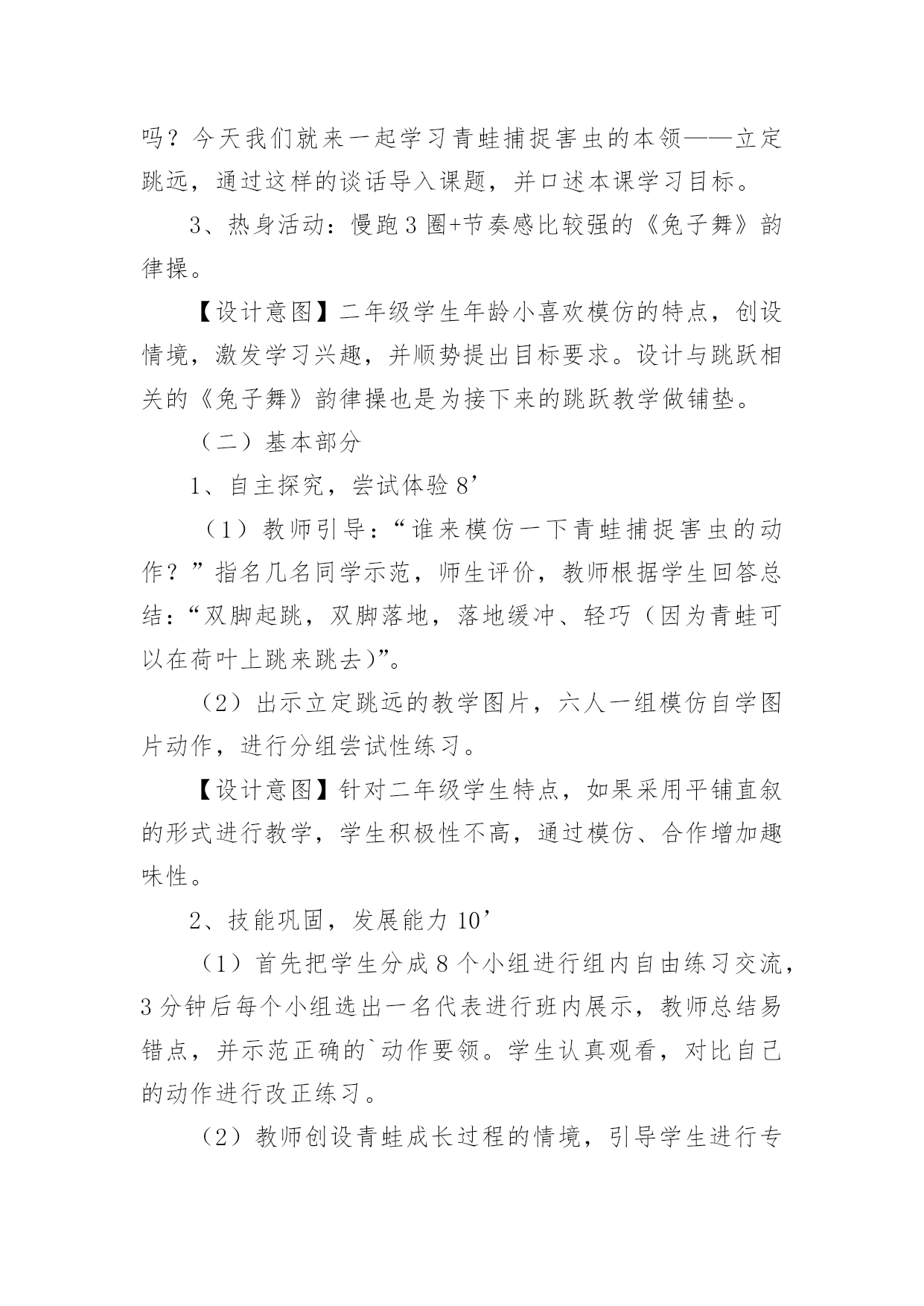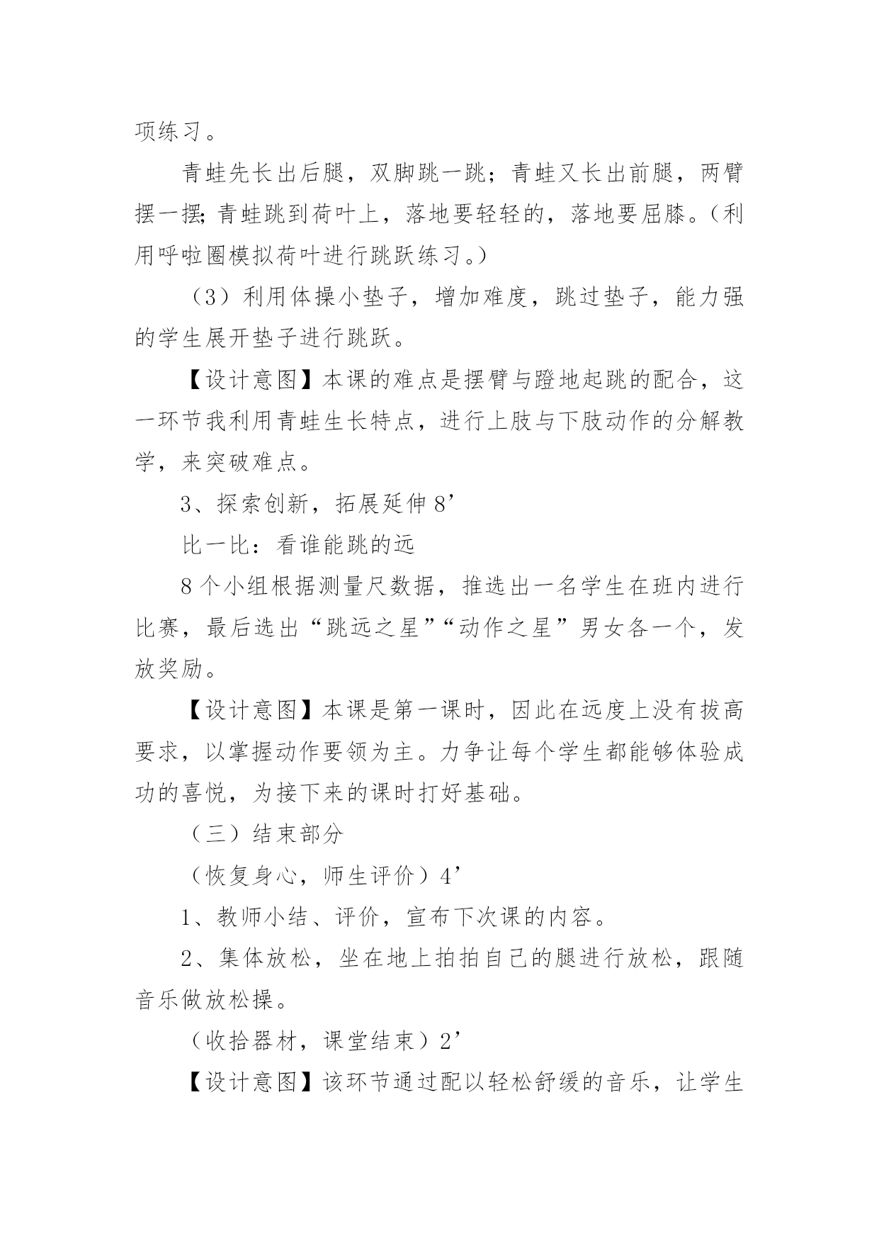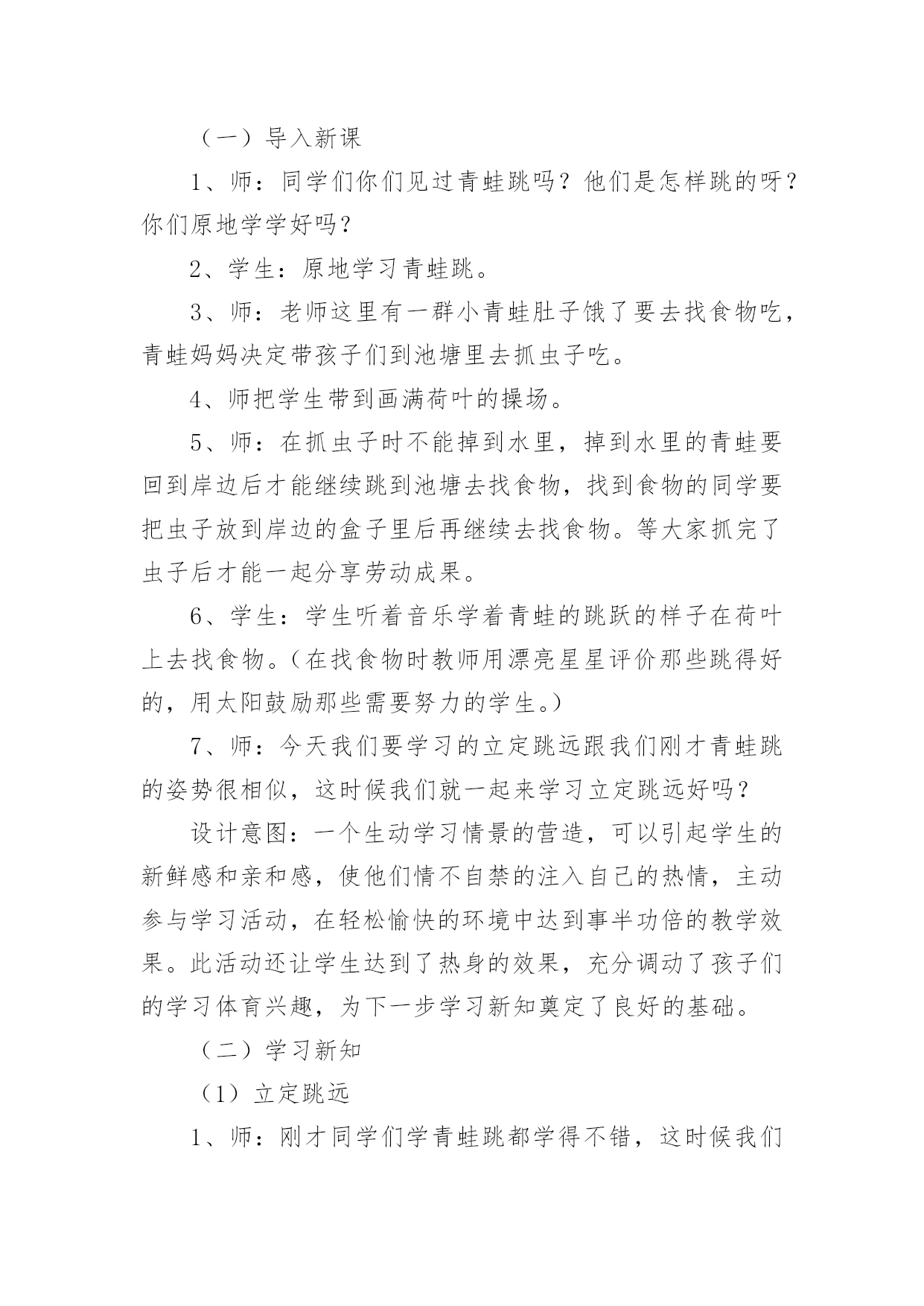 《立定跳远》教学设计作为一名默默奉献的教育工作者,往往需要进行教学设计编写工作,教学设计把教学各要素看成一个系统,分析教学问题和需求,确立解决的程序纲要,使教学效果最优化。教学设计应该怎么写才好呢?下面是小编整理的《立定跳远》教学设计,仅供参考,大家一起来看看吧。《立定跳远》教学设计1一、学习目标1、认知目标:进一步学习立定跳远的动作方法,改进摆臂与蹬地协调配合的动作。2、技能目标:通过创设情境、游戏等形式让学生在愉快的氛围中掌握技术动作。3、情感目标:在小组合作中培养学生团结协作、合作探究的意识。二、教学重点与难点:教学重点:双脚起跳,双脚落地,落地有缓冲。教学难点:摆臂与蹬地起跳的配合。三、教学过程(一)准备部分(快乐热身,激发兴趣)8’1、课堂常规(体委整队、报告人数、检查服装、安排见习生。)2、教师创设情境:同学们知道青蛙是怎么捕捉害虫的吗?今天我们就来一起学习青蛙捕捉害虫的本领——立定跳远,通过这样的谈话导入课题,并口述本课学习目标。3、热身活动:慢跑3圈+节奏感比较强的《兔子舞》韵律操。【设计意图】二年级学生年龄小喜欢模仿的特点,创设情境,激发学习兴趣,并顺势提出目标要求。设计与跳跃相关的《兔子舞》韵律操也是为接下来的跳跃教学做铺垫。(二)基本部分1、自主探究,尝试体验8’(1)教师引导:“谁来模仿一下青蛙捕捉害虫的动作?”指名几名同学示范,师生评价,教师根据学生回答总结:“双脚起跳,双脚落地,落地缓冲、轻巧(因为青蛙可以在荷叶上跳来跳去)”。(2)出示立定跳远的教学图片,六人一组模仿自学图片动作,进行分组尝试性练习。【设计意图】针对二年级学生特点,如果采用平铺直叙的形式进行教学,学生积极性不高,通过模仿、合作增加趣味性。2、技能巩固,发展能力10’(1)首先把学生分成8个小组进行组内自由练习交流,3分钟后每个小组选出一名代表进行班内展示,教师总结易错点,并示范正确的`动作要领。学生认真观看,对比自己的动作进行改正练习。(2)教师创设青蛙成长过程的情境,引导学生进行专项练习。青蛙先长出后腿,双脚跳一跳;青蛙又长出前腿,两臂摆一摆;青蛙跳到荷叶上,落地要轻轻的,落地要屈膝。(利用呼啦圈模拟荷叶进行跳跃练习。)(3)利用体操小垫子,增加难度,跳过垫子,能力强的学生展开垫子进行跳跃。【设计意图】本课的难点是摆臂与蹬地起跳的配合,这一环节我利用青蛙生长特点,进行上肢与下肢动作的分解教学,来突破难点。3、探索创新,拓展延伸8’比一比:看谁能跳的远8个小组根据测量尺数据,推选出一名学生在班内进行比赛,最后选出“跳远之星”“动作之星”男女各一个,发放奖励。【设计意图】本课是第一课时,因此在远度上没有拔高要求,以掌握动作要领为主。力争让每个学生都能够体验成功的喜悦,为接下来的课时打好基础。(三)结束部分(恢复身心,师生评价)4’1、教师小结、评价,宣布下次课的内容。2、集体放松,坐在地上拍拍自己的腿进行放松,跟随音乐做放松操。(收拾器材,课堂结束)2’【设计意图】该环节通过配以轻松舒缓的音乐,让学生的身心得到放松,最后教师发挥评价的作用,及时对本节课学生知识技能掌握、情感态度价值表现进行点评。《立定跳远》教学设计2一、教材分析:立定跳远是小学体育与健康的教学内容,这是让学生初步接触双脚跳起的知识,为今后的助跑式跳远和三级跳远打好良好的基础。二、教学内容:1、立定跳远2、游戏:小青蛙学捕食。三、教学任务:1、通过本节课的学习,让每个学生在“玩中学,学中玩,玩中创”感受到愉悦。2、通过游戏发展学生的上肢力量,培养学生认真、负责的积极态度,团结协作的团队精神。3、让学生在特定的情境中通过观察、体验、掌握学习的方法,使学生热爱体育运动,并能够乐意接受教师的指导,从而体验成功。四、教学重、难点教学重点:双脚起跳,用力向前上方跃起,上下肢协调配合。教学难点:双脚轻巧落地。五、教具准备:画满荷叶的操场1个、录音机一台。六、教学程序:(一)导入新课1、师:同学们你们见过青蛙跳吗?他们是怎样跳的呀?你们原地学学好吗?2、学生:原地学习青蛙跳。3、师:老师这里有一群小青蛙肚子饿了要去找食物吃,青蛙妈妈决定带孩子们到池塘里去抓虫子吃。4、师把学生带到画满荷叶的操场。5、师:在抓虫子时不能掉到水里,掉到水里的青蛙要回到岸边后才能继续跳到池塘去找食物,找到食物的同学要把虫子放到岸边的盒子里后再继续去找食物。等大家抓完了虫子后才能一起分享劳动成果。6、学生:学生听着音乐学着青蛙的跳跃的样子在荷叶上去找食物。(在找食物时教师用漂亮星星评价那些跳得好的,用太阳鼓励那些需要努力的学生。)7、师:今天我们要学习的立定跳远跟我们刚才青蛙跳的姿势很相似,这时候我们就一起来学习立定跳远好吗?设计意图:一个生动学习情景的营造,可以引起学生的新鲜感和亲和感,使他们情不自禁