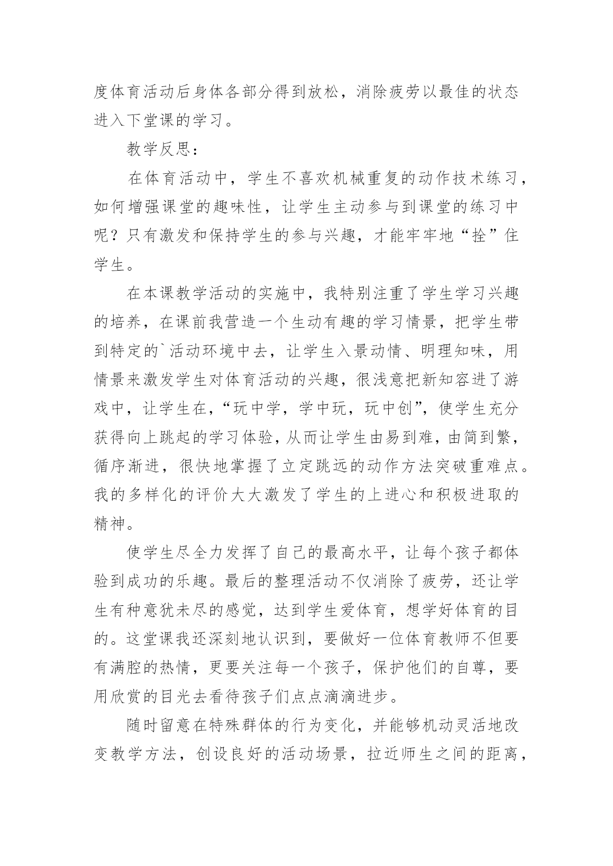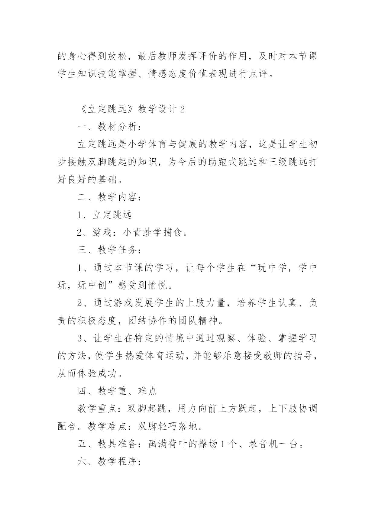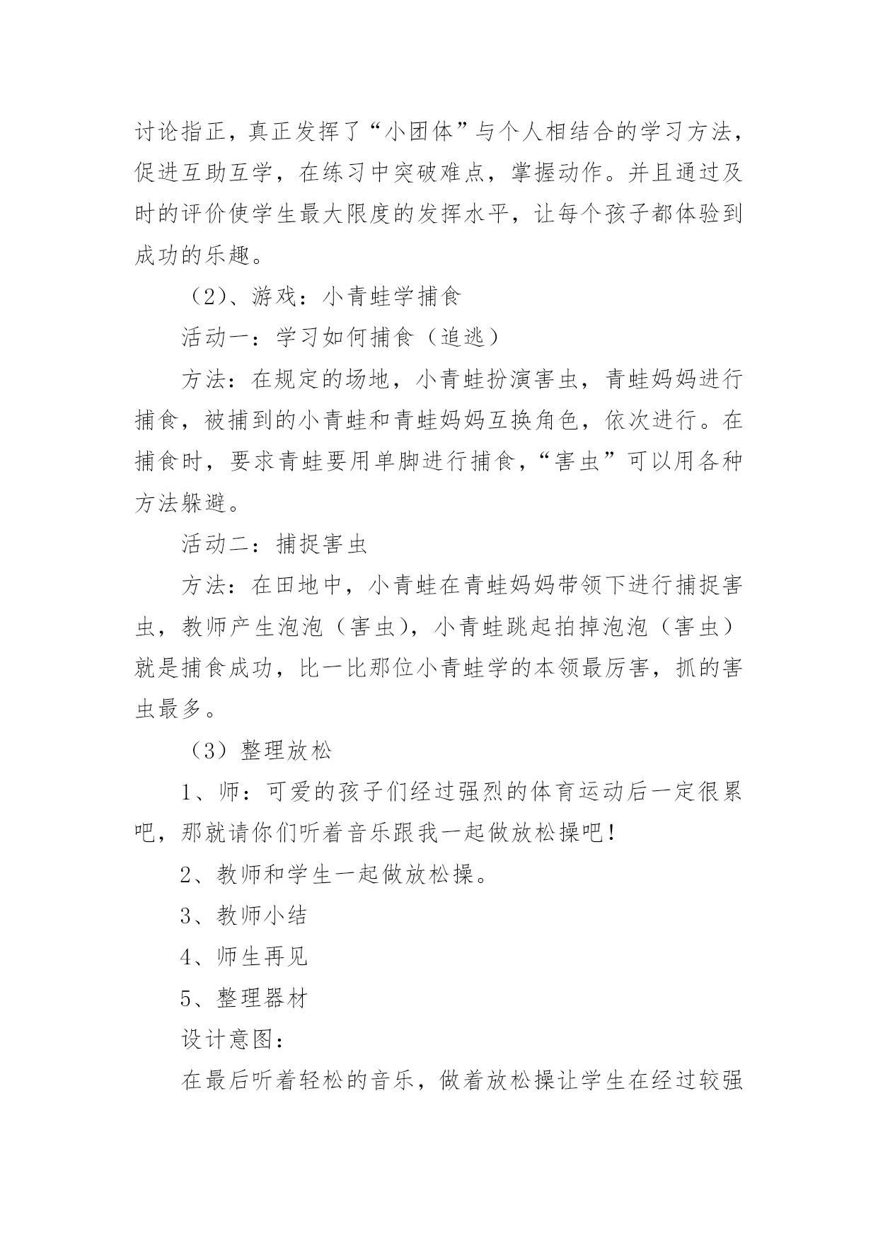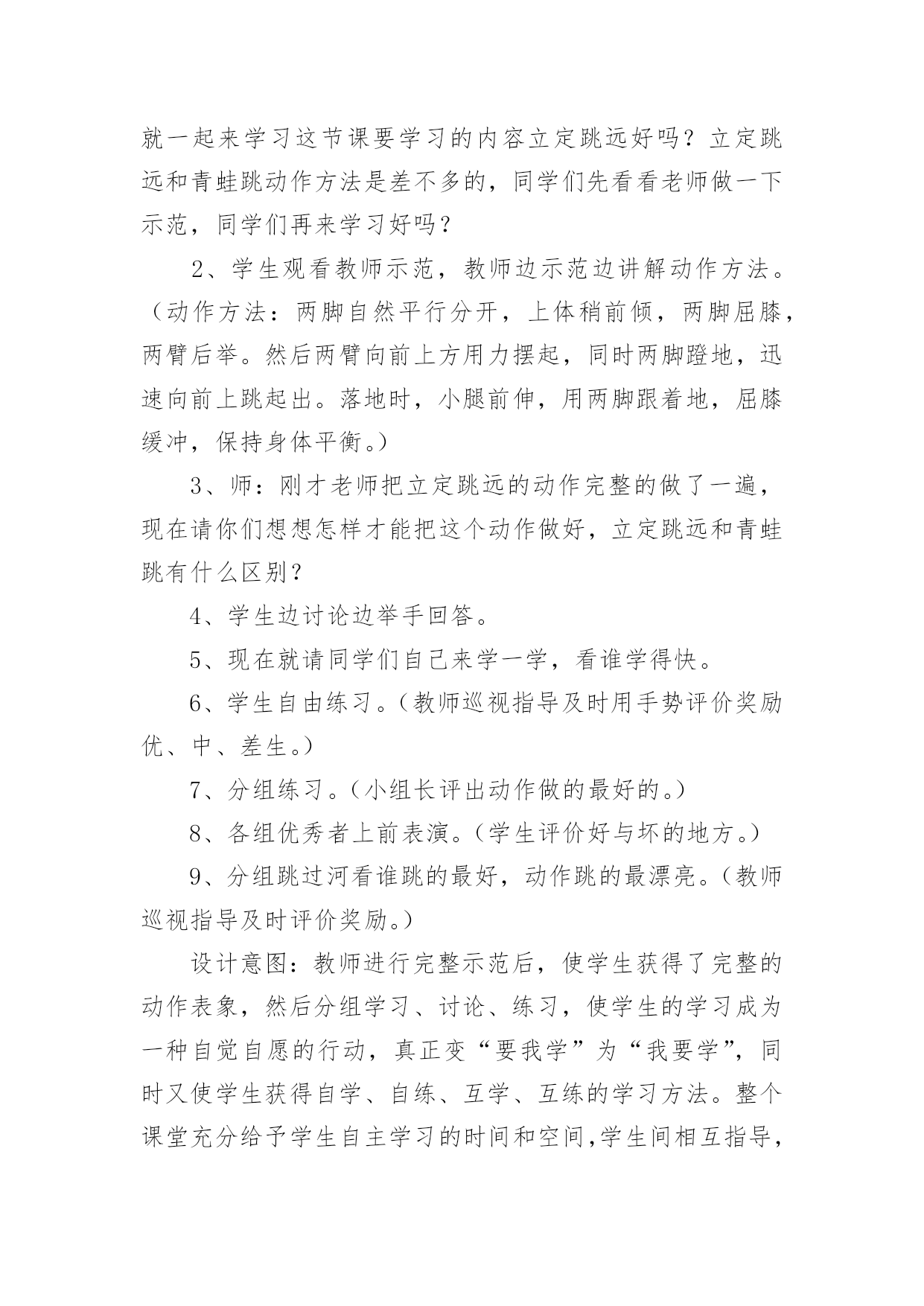 《立定跳远》教学设计作为一名默默奉献的教育工作者,往往需要进行教学设计编写工作,教学设计把教学各要素看成一个系统,分析教学问题和需求,确立解决的程序纲要,使教学效果最优化。教学设计应该怎么写才好呢?下面是小编整理的《立定跳远》教学设计,仅供参考,大家一起来看看吧。《立定跳远》教学设计1一、学习目标1、认知目标:进一步学习立定跳远的动作方法,改进摆臂与蹬地协调配合的动作。2、技能目标:通过创设情境、游戏等形式让学生在愉快的氛围中掌握技术动作。3、情感目标:在小组合作中培养学生团结协作、合作探究的意识。二、教学重点与难点:教学重点:双脚起跳,双脚落地,落地有缓冲。教学难点:摆臂与蹬地起跳的配合。三、教学过程(一)准备部分(快乐热身,激发兴趣)8’1、课堂常规(体委整队、报告人数、检查服装、安排见习生。)2、教师创设情境:同学们知道青蛙是怎么捕捉害虫的吗?今天我们就来一起学习青蛙捕捉害虫的本领——立定跳远,通过这样的谈话导入课题,并口述本课学习目标。3、热身活动:慢跑3圈+节奏感比较强的《兔子舞》韵律操。【设计意图】二年级学生年龄小喜欢模仿的特点,创设情境,激发学习兴趣,并顺势提出目标要求。设计与跳跃相关的《兔子舞》韵律操也是为接下来的跳跃教学做铺垫。(二)基本部分1、自主探究,尝试体验8’(1)教师引导:“谁来模仿一下青蛙捕捉害虫的动作?”指名几名同学示范,师生评价,教师根据学生回答总结:“双脚起跳,双脚落地,落地缓冲、轻巧(因为青蛙可以在荷叶上跳来跳去)”。(2)出示立定跳远的教学图片,六人一组模仿自学图片动作,进行分组尝试性练习。【设计意图】针对二年级学生特点,如果采用平铺直叙的形式进行教学,学生积极性不高,通过模仿、合作增加趣味性。2、技能巩固,发展能力10’(1)首先把学生分成8个小组进行组内自由练习交流,3分钟后每个小组选出一名代表进行班内展示,教师总结易错点,并示范正确的`动作要领。学生认真观看,对比自己的动作进行改正练习。(2)教师创设青蛙成长过程的情境,引导学生进行专项练习。青蛙先长出后腿,双脚跳一跳;青蛙又长出前腿,两臂摆一摆;青蛙跳到荷叶上,落地要轻轻的,落地要屈膝。(利用呼啦圈模拟荷叶进行跳跃练习。)(3)利用体操小垫子,增加难度,跳过垫子,能力强的学生展开垫子进行跳跃。【设计意图】本课的难点是摆臂与蹬地起跳的配合,这一环节我利用青蛙生长特点,进行上肢与下肢动作的分解教学,来突破难点。3、探索创新,拓展延伸8’比一比:看谁能跳的远8个小组根据测量尺数据,推选出一名学生在班内进行比赛,最后选出“跳远之星”“动作之星”男女各一个,发放奖励。【设计意图】本课是第一课时,因此在远度上没有拔高要求,以掌握动作要领为主。力争让每个学生都能够体验成功的喜悦,为接下来的课时打好基础。(三)结束部分(恢复身心,师生评价)4’1、教师小结、评价,宣布下次课的内容。2、集体放松,坐在地上拍拍自己的腿进行放松,跟随音乐做放松操。(收拾器材,课堂结束)2’【设计意图】该环节通过配以轻松舒缓的音乐,让学生的身心得到放松,最后教师发挥评价的作用,及时对本节课学生知识技能掌握、情感态度价值表现进行点评。《立定跳远》教学设计2一、教材分析:立定跳远是小学体育与健康的教学内容,这是让学生初步接触双脚跳起的知识,为今后的助跑式跳远和三级跳远打好良好的基础。二、教学内容:1、立定跳远2、游戏:小青蛙学捕食。三、教学任务:1、通过本节课的学习,让每个学生在“玩中学,学中玩,玩中创”感受到愉悦。2、通过游戏发展学生的上肢力量,培养学生认真、负责的积极态度,团结协作的团队精神。3、让学生在特定的情境中通过观察、体验、掌握学习的方法,使学生热爱体育运动,并能够乐意接受教师的指导,从而体验成功。四、教学重、难点教学重点:双脚起跳,用力向前上方跃起,上下肢协调配合。教学难点:双脚轻巧落地。五、教具准备:画满荷叶的操场1个、录音机一台。六、教学程序:(一)导入新课1、师:同学们你们见过青蛙跳吗?他们是怎样跳的呀?你们原地学学好吗?2、学生:原地学习青蛙跳。3、师:老师这里有一群小青蛙肚子饿了要去找食物吃,青蛙妈妈决定带孩子们到池塘里去抓虫子吃。4、师把学生带到画满荷叶的操场。5、师:在抓虫子时不能掉到水里,掉到水里的青蛙要回到岸边后才能继续跳到池塘去找食物,找到食物的同学要把虫子放到岸边的盒子里后再继续去找食物。等大家抓完了虫子后才能一起分享劳动成果。6、学生:学生听着音乐学着青蛙的跳跃的样子在荷叶上去找食物。(在找食物时教师用漂亮星星评价那些跳得好的,用太阳鼓励那些需要努力的学生。)7、师:今天我们要学习的立定跳远跟我们刚才青蛙跳的姿势很相似,这时候我们就一起来学习立定跳远好吗?设计意图:一个生动学习情景的营造,可以引起学生的新鲜感和亲和感,使他们情不自禁