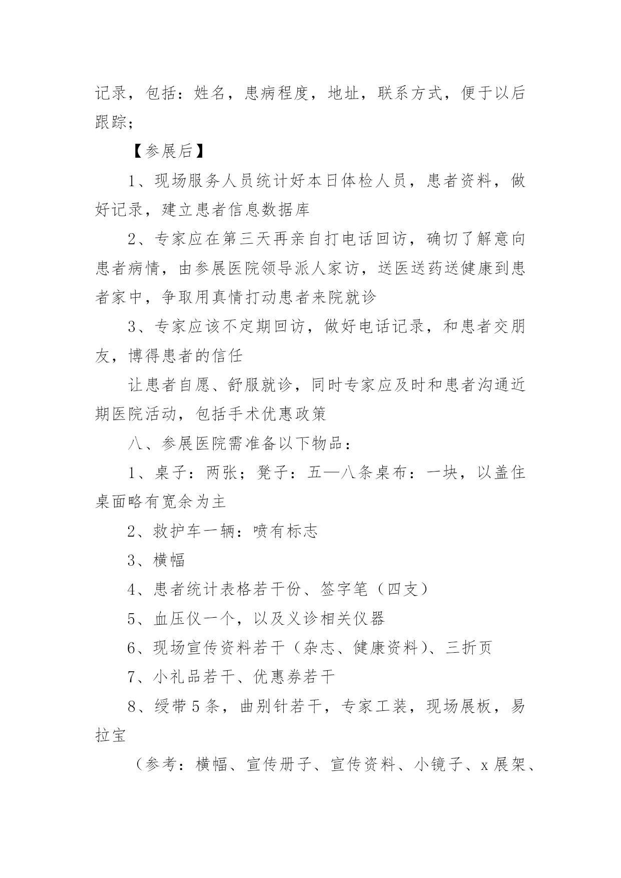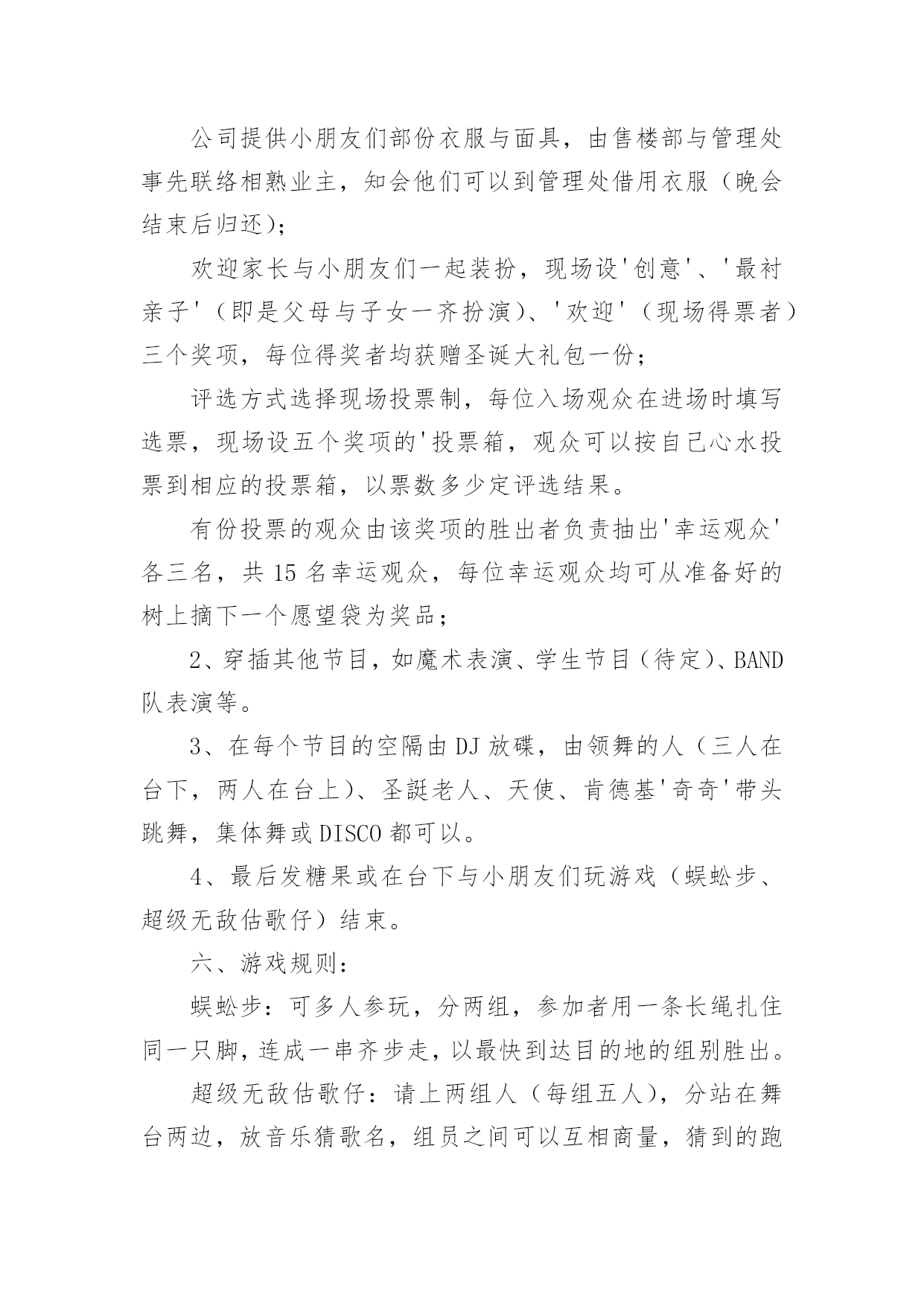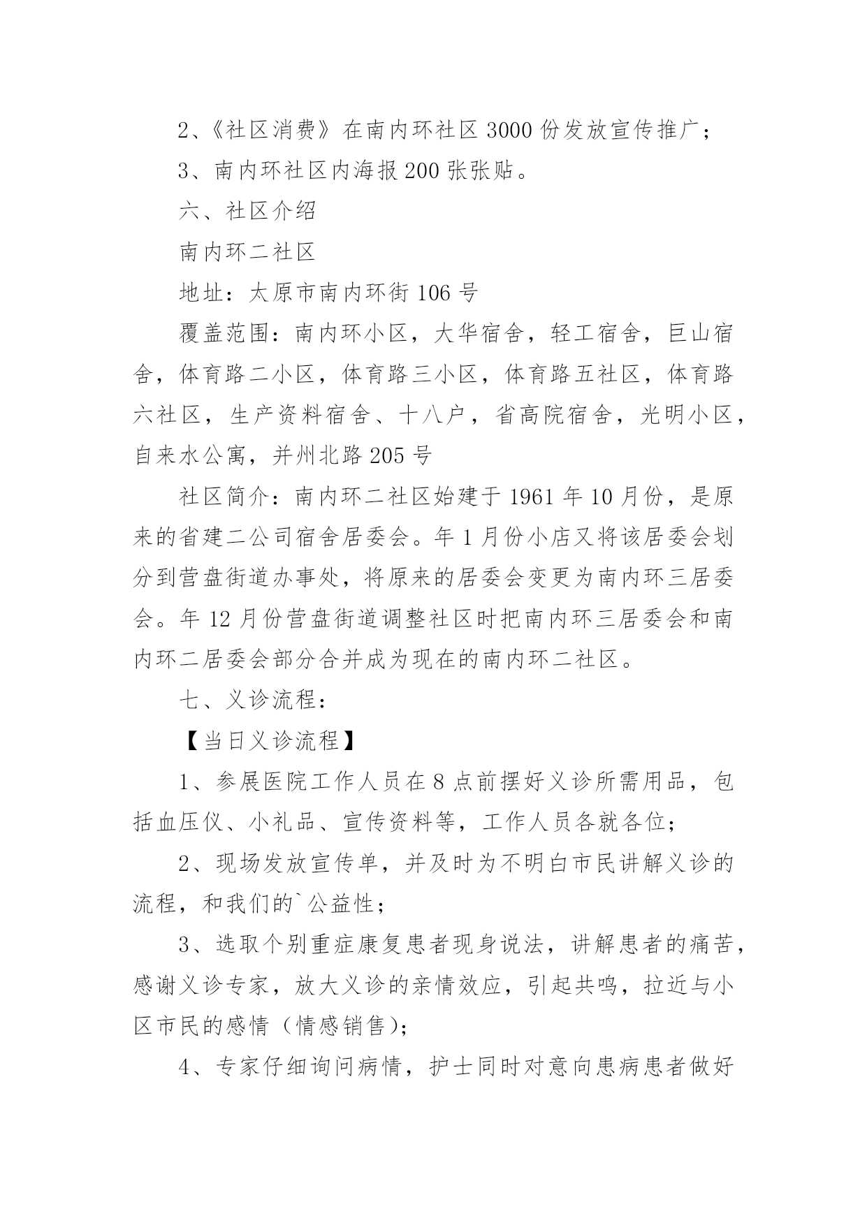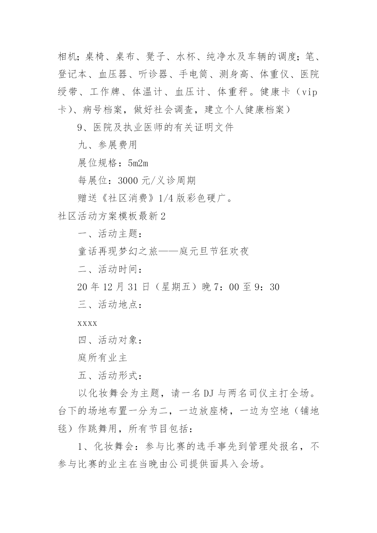 社区活动方案最新社区活动方案模板最新为确保事情或工作高质量高水平开展,常常需要预先准备方案,方案是书面计划,是具体行动实施办法细则,步骤等。那么应当如何制定方案呢?下面是小编帮大家整理的社区活动方案模板最新,欢迎阅读与收藏。社区活动方案模板最新1一、活动目的:地面营销,直接深入终端,通过义诊、宣传等活动,让参加义诊之医院的、实惠、公益观念深入人心。向社区要患者,向义诊要效益,提升人气,拉动参展医院效益增长。二、营销策略通过第三方以公益的名义进驻社区,这是我们组织者的优势,通过此次活动可以提升参展医院的品牌,提高参展医院的知名度。主打公益牌,走进每一个社区,针对医院的潜在病种患者进行终端地面营销尤为重要。三、义诊时间5月8日—9日(星期六、星期日)四、义诊地点(暂定)南内环二社区(太原市南内环街106号)五、宣传计划1、《社区消费》整版广告;2、《社区消费》在南内环社区3000份发放宣传推广;3、南内环社区内海报200张张贴。六、社区介绍南内环二社区地址:太原市南内环街106号覆盖范围:南内环小区,大华宿舍,轻工宿舍,巨山宿舍,体育路二小区,体育路三小区,体育路五社区,体育路六社区,生产资料宿舍、十八户,省高院宿舍,光明小区,自来水公寓,并州北路205号社区简介:南内环二社区始建于1961年10月份,是原来的省建二公司宿舍居委会。年1月份小店又将该居委会划分到营盘街道办事处,将原来的居委会变更为南内环三居委会。年12月份营盘街道调整社区时把南内环三居委会和南内环二居委会部分合并成为现在的南内环二社区。七、义诊流程:【当日义诊流程】1、参展医院工作人员在8点前摆好义诊所需用品,包括血压仪、小礼品、宣传资料等,工作人员各就各位;2、现场发放宣传单,并及时为不明白市民讲解义诊的流程,和我们的`公益性;3、选取个别重症康复患者现身说法,讲解患者的痛苦,感谢义诊专家,放大义诊的亲情效应,引起共鸣,拉近与小区市民的感情(情感销售);4、专家仔细询问病情,护士同时对意向患病患者做好记录,包括:姓名,患病程度,地址,联系方式,便于以后跟踪;【参展后】1、现场服务人员统计好本日体检人员,患者资料,做好记录,建立患者信息数据库2、专家应在第三天再亲自打电话回访,确切了解意向患者病情,由参展医院领导派人家访,送医送药送健康到患者家中,争取用真情打动患者来院就诊3、专家应该不定期回访,做好电话记录,和患者交朋友,博得患者的信任让患者自愿、舒服就诊,同时专家应及时和患者沟通近期医院活动,包括手术优惠政策八、参展医院需准备以下物品:1、桌子:两张;凳子:五—八条桌布:一块,以盖住桌面略有宽余为主2、救护车一辆:喷有标志3、横幅4、患者统计表格若干份、签字笔(四支)5、血压仪一个,以及义诊相关仪器6、现场宣传资料若干(杂志、健康资料)、三折页7、小礼品若干、优惠券若干8、绶带5条,曲别针若干,专家工装,现场展板,易拉宝(参考:横幅、宣传册子、宣传资料、小镜子、x展架、相机;桌椅、桌布、凳子、水杯、纯净水及车辆的调度;笔、登记本、血压器、听诊器、手电筒、测身高、体重仪、医院绶带、工作牌、体温计、血压计、体重秤。健康卡(vip卡)、病号档案,做好社会调查,建立个人健康档案)9、医院及执业医师的有关证明文件九、参展费用展位规格:5m2m每展位:3000元/义诊周期赠送《社区消费》1/4版彩色硬广。社区活动方案模板最新2一、活动主题:童话再现梦幻之旅——庭元旦节狂欢夜二、活动时间:20年12月31日(星期五)晚7:00至9:30三、活动地点:xxxx四、活动对象:庭所有业主五、活动形式:以化妆舞会为主题,请一名DJ与两名司仪主打全场。台下的场地布置一分为二,一边放座椅,一边为空地(铺地毯)作跳舞用,所有节目包括:1、化妆舞会:参与比赛的选手事先到管理处报名,不参与比赛的业主在当晚由公司提供面具入会场。公司提供小朋友们部份衣服与面具,由售楼部与管理处事先联络相熟业主,知会他们可以到管理处借用衣服(晚会结束后归还);欢迎家长与小朋友们一起装扮,现场设'创意'、'最衬亲子'(即是父母与子女一齐扮演)、'欢迎'(现场得票者)三个奖项,每位得奖者均获赠圣诞大礼包一份;评选方式选择现场投票制,每位入场观众在进场时填写选票,现场设五个奖项的'投票箱,观众可以按自己心水投票到相应的投票箱,以票数多少定评选结果。有份投票的观众由该奖项的胜出者负责抽出'幸运观众'各三名,共15名幸运观众,每位幸运观众均可从准备好的树上摘下一个愿望袋为奖品;2、穿插其他节目,如魔术表演、学生节目(待定)、BAND队表演等。3、在每个节目的空隔由DJ放碟,由领舞的人(三人在台下,两人在台上)、圣誔老人、天使、肯德基'奇奇'带头跳舞,集体舞或DISCO都可以。4、最后发糖果或在台下与小朋友们玩游戏(蜈蚣