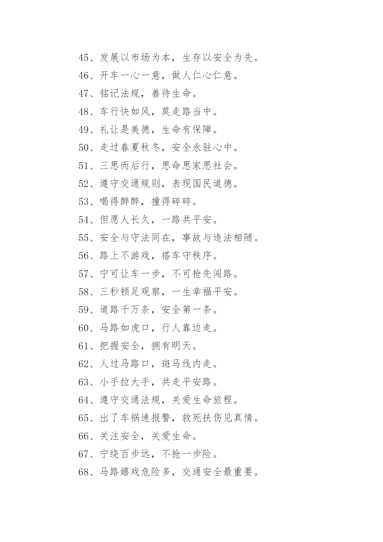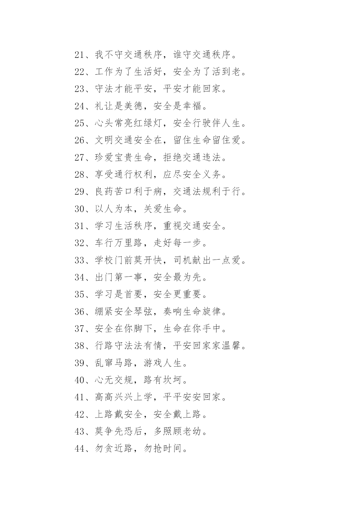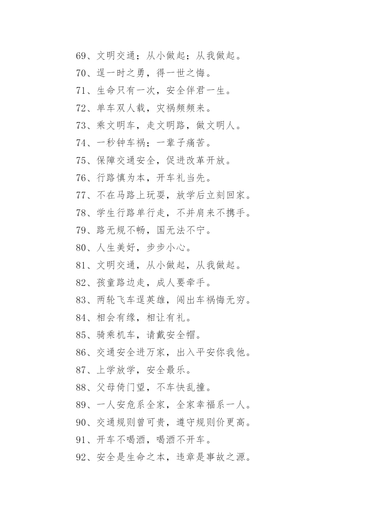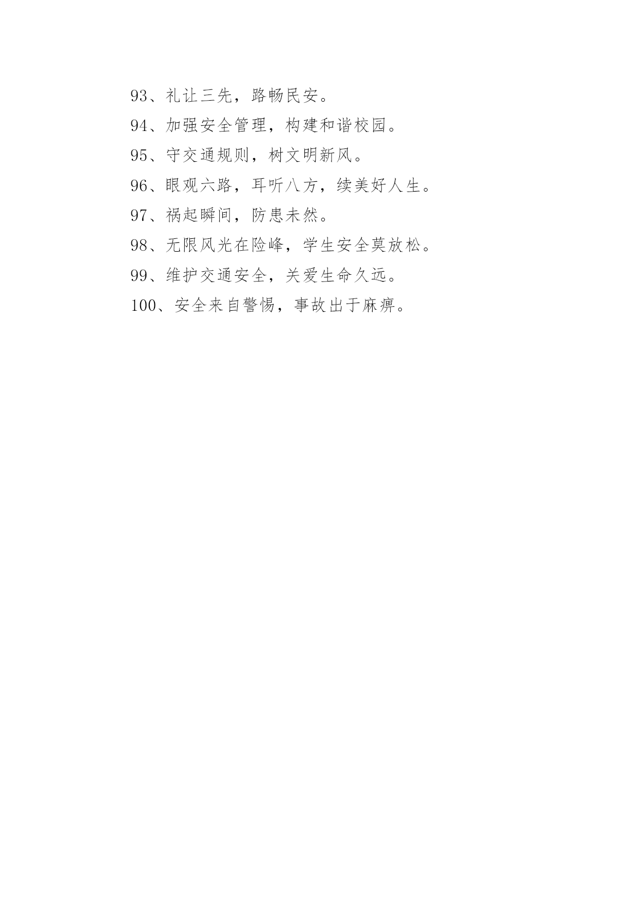 学生交通安全标语学生交通安全标语1、步行靠路边,乘车不争先。2、遵守交通法规,平安与你同在。3、彼此让一让,路宽心舒畅。4、红灯短暂,生命无限。5、遵守交通法规,关隘生命旅程。6、安全最佳效应,平安共同心声。7、人走人行道,安全又可靠。8、珍爱生命,安全出行。9、小小黄帽每天戴,出行安全总常在。10、一切为了孩子,一切想着孩子。11、道路通行见形象,红绿灯前看修养。12、一秒钟车祸,一辈子痛苦。13、安全乘车、安全骑车、安全走路。14、人在路中守交规,法在心中路畅通。15、维护交通秩序,争做文明公民。16、让道于人,安全于己。17、法规在心中,平安在手中。18、千里之行,慎于足下。19、安全在我心中,生命在我手中。20、走过春夏秋,冬安全永驻心中。21、我不守交通秩序,谁守交通秩序。22、工作为了生活好,安全为了活到老。23、守法才能平安,平安才能回家。24、礼让是美德,安全是幸福。25、心头常亮红绿灯,安全行驶伴人生。26、文明交通安全在,留住生命留住爱。27、珍爱宝贵生命,拒绝交通违法。28、享受通行权利,应尽安全义务。29、良药苦口利于病,交通法规利于行。30、以人为本,关爱生命。31、学习生活秩序,重视交通安全。32、车行万里路,走好每一步。33、学校门前莫开快,司机献出一点爱。34、出门第一事,安全最为先。35、学习是首要,安全更重要。36、绷紧安全琴弦,奏响生命旋律。37、安全在你脚下,生命在你手中。38、行路守法法有情,平安回家家温馨。39、乱窜马路,游戏人生。40、心无交规,路有坎坷。41、高高兴兴上学,平平安安回家。42、上路戴安全,安全戴上路。43、莫争先恐后,多照顾老幼。44、勿贪近路,勿抢时间。45、发展以市场为本,生存以安全为先。46、开车一心一意,做人仁心仁意。47、铭记法规,善待生命。48、车行快如风,莫走路当中。49、礼让是美德,生命有保障。50、走过春夏秋冬,安全永驻心中。51、三思而后行,思命思家思社会。52、遵守交通规则,表现国民道德。53、喝得醉醉,撞得碎碎。54、但愿人长久,一路共平安。55、安全与守法同在,事故与违法相随。56、路上不游戏,搭车守秩序。57、宁可让车一步,不可抢先闯路。58、三秒顿足观察,一生幸福平安。59、道路千万条,安全第一条。60、马路如虎口,行人靠边走。61、把握安全,拥有明天。62、人过马路口,斑马线内走。63、小手拉大手,共走平安路。64、遵守交通法规,关爱生命旅程。65、出了车祸速报警,救死扶伤见真情。66、关注安全,关爱生命。67、宁绕百步远,不抢一步险。68、马路嬉戏危险多,交通安全最重要。69、文明交通;从小做起;从我做起。70、逞一时之勇,得一世之悔。71、生命只有一次,安全伴君一生。72、单车双人载,灾祸频频来。73、乘文明车,走文明路,做文明人。74、一秒钟车祸;一辈子痛苦。75、保障交通安全,促进改革开放。76、行路慎为本,开车礼当先。77、不在马路上玩耍,放学后立刻回家。78、学生行路单行走,不并肩来不携手。79、路无规不畅,国无法不宁。80、人生美好,步步小心。81、文明交通,从小做起,从我做起。82、孩童路边走,成人要牵手。83、两轮飞车逞英雄,闯出车祸悔无穷。84、相会有缘,相让有礼。85、骑乘机车,请戴安全帽。86、交通安全进万家,出入平安你我他。87、上学放学,安全最乐。88、父母倚门望,不车快乱撞。89、一人安危系全家,全家幸福系一人。90、交通规则曾可贵,遵守规则价更高。91、开车不喝酒,喝酒不开车。92、安全是生命之本,违章是事故之源。93、礼让三先,路畅民安。94、加强安全管理,构建和谐校园。95、守交通规则,树文明新风。96、眼观六路,耳听八方,续美好人生。97、祸起瞬间,防患未然。98、无限风光在险峰,学生安全莫放松。99、维护交通安全,关爱生命久远。100、安全来自警惕,事故出于麻痹。