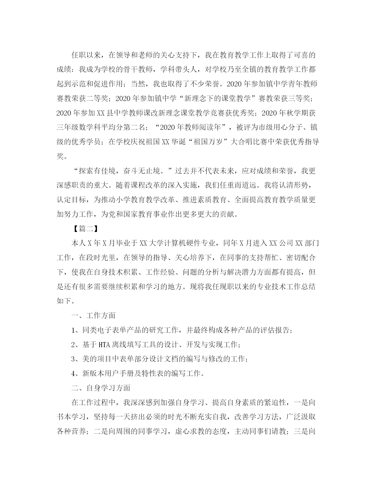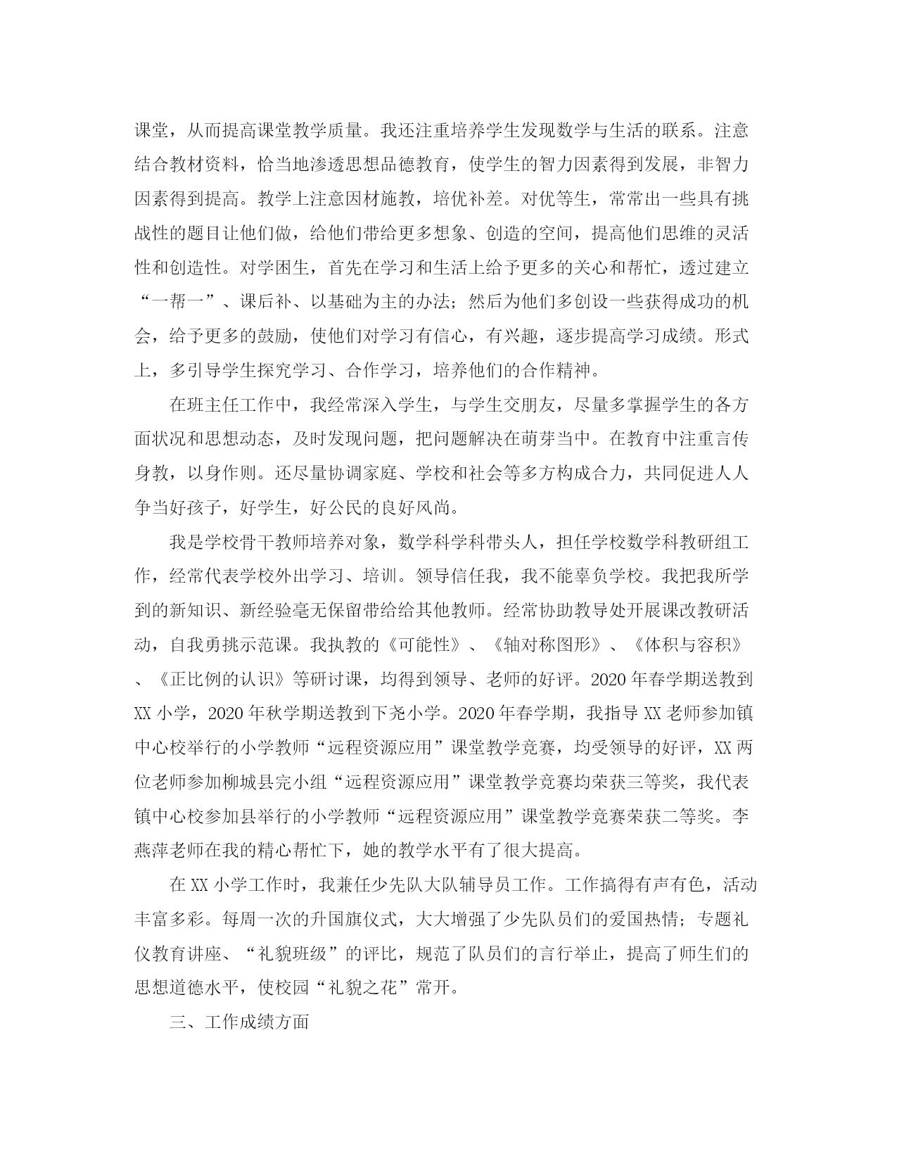 此资料由网络收集而来,如有侵权请告知上传者立即删除。资料共分享,我们负责传递知识。专业技术个人工作总结700字【篇一】我于XX年七月毕业于XX师范学校,分配到XX小学工作,当时因“普九”需要被借调到XX中学任教。XX年调回小学任教。十三年来,我遵纪守法,努力工作,用心完成了学校领导交给的各项任务,为党和国家的教育事业做出了应有的贡献。现将总结如下:一、政治思想方面我拥护中国共产党的领导,坚持四项基本原则,努力学习xx重要思想,认真贯彻XX大会议精神,树立社会主义科学发展观。忠诚党的教育事业,认真贯彻党和国家的教育方针政策。爱岗敬业,潜心教书育人,为人师表。用心参加政治和业务学习、培训、进修,不断丰富自我的理论知识,提高政治觉悟和业务潜力。在广大师生中起到表率模范作用。二、教育教学工作方面任现职以来,我主要担任小学中高年段语文或数学教学任务,兼班主任工作和中队辅导员工作,曾担任大队辅导员工作。我深知教师的工作是繁重的,职责是重大的。教师的使命就是教书育人。应对这一历史重任,我从不敢丝毫放松自我。我一边勤勤恳恳地工作,一边不断地学习教育教学理论,钻研教学大纲及新课程标准和教材教法。经常阅读有关教育教学的报刊论文;虚心向同事学习,不断吸收别人成功的教育教学经验和方法,并运用到自我的教学实践中。透过不断的学习,反思和应用,我总结出有自我特色的教育教学方法。如今我已是一名具有较强教学潜力的年轻骨干教师,曾多次承担学校举办的教研示范课执教任务,多次送教到村完小均得到领导和老师们的一致好评。用心参加中心校举办的赛教活动,并多次获得了荣誉。在课堂教学中,我善于根据学生的年龄特征和实际状况,结合教材资料特点,遵循教学原则,充分运用自我所掌握的教育教学理论,优化课堂教学。结合课改精神,认真贯彻教学新理念,充分调动学生的主动性和用心性,促进学生参与课堂,从而提高课堂教学质量。我还注重培养学生发现数学与生活的联系。注意结合教材资料,恰当地渗透思想品德教育,使学生的智力因素得到发展,非智力因素得到提高。教学上注意因材施教,培优补差。对优等生,常常出一些具有挑战性的题目让他们做,给他们带给更多想象、创造的空间,提高他们思维的灵活性和创造性。对学困生,首先在学习和生活上给予更多的关心和帮忙,透过建立“一帮一”、课后补、以基础为主的办法;然后为他们多创设一些获得成功的机会,给予更多的鼓励,使他们对学习有信心,有兴趣,逐步提高学习成绩。形式上,多引导学生探究学习、合作学习,培养他们的合作精神。在班主任工作中,我经常深入学生,与学生交朋友,尽量多掌握学生的各方面状况和思想动态,及时发现问题,把问题解决在萌芽当中。在教育中注重言传身教,以身作则。还尽量协调家庭、学校和社会等多方构成合力,共同促进人人争当好孩子,好学生,好公民的良好风尚。我是学校骨干教师培养对象,数学科学科带头人,担任学校数学科教研组工作,经常代表学校外出学习、培训。领导信任我,我不能辜负学校。我把我所学到的新知识、新经验毫无保留带给给其他教师。经常协助教导处开展课改教研活动,自我勇挑示范课。我执教的《可能性》、《轴对称图形》、《体积与容积》、《正比例的认识》等研讨课,均得到领导、老师的好评。2020年春学期送教到XX小学,2020年秋学期送教到下尧小学。2020年春学期,我指导XX老师参加镇中心校举行的小学教师“远程资源应用”课堂教学竞赛,均受领导的好评,XX两位老师参加柳城县完小组“远程资源应用”课堂教学竞赛均荣获三等奖,我代表镇中心校参加县举行的小学教师“远程资源应用”课堂教学竞赛荣获二等奖。李燕萍老师在我的精心帮忙下,她的教学水平有了很大提高。在XX小学工作时,我兼任少先队大队辅导员工作。工作搞得有声有色,活动丰富多彩。每周一次的升国旗仪式,大大增强了少先队员们的爱国热情;专题礼仪教育讲座、“礼貌班级”的评比,规范了队员们的言行举止,提高了师生们的思想道德水平,使校园“礼貌之花”常开。三、工作成绩方面任职以来,在领导和老师的关心支持下,我在教育教学工作上取得了可喜的成绩:我成为学校的骨干教师,学科带头人,对学校乃至全镇的教育教学工作都起到示范和促进作用;当然,我也取得了不少荣誉。2020年参加镇中学青年教师赛教荣获二等奖;2020年参加镇中学“新理念下的课堂教学”赛教荣获三等奖;2020年参加XX县中学教师课改新理念课堂教学竞赛获优秀奖;2020年秋学期获三年级数学科平均分第二名;“2020年教师阅读年”,被评为市级用心分子、镇级的优秀学员;在学校庆祝祖国XX华诞“祖国万岁”大合唱比赛中荣获优秀指导奖。“探索有佳境,奋斗无止境。”过去并不代表未来,应对成绩和荣誉,我更深感职责的重大。随着课程改革的深入实施,我们任重而道远。我将认清形势,认定目标,为推动小学教育教学