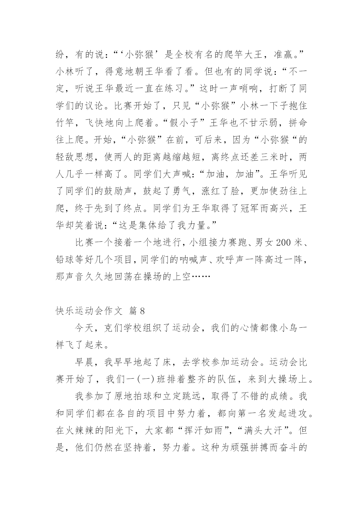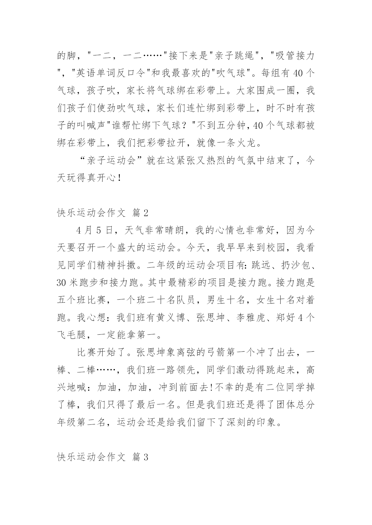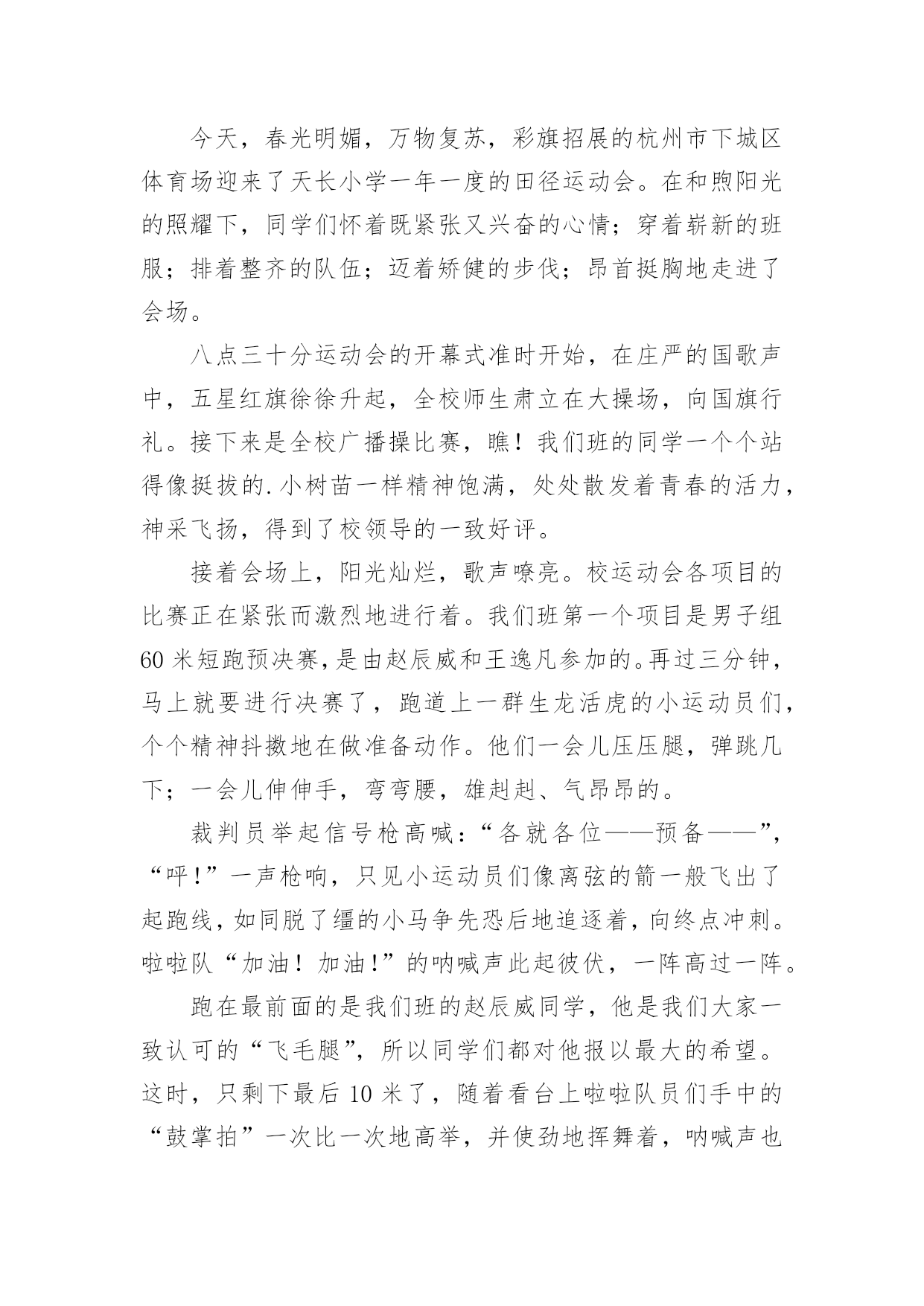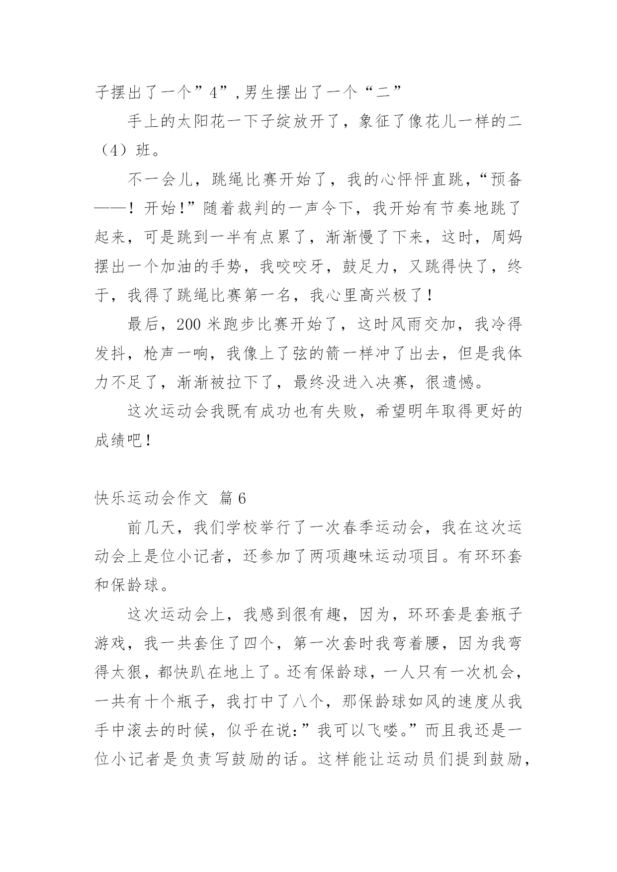 快乐运动会作文快乐运动会作文汇编10篇在日常学习、工作和生活中,大家都尝试过写作文吧,写作文是培养人们的观察力、联想力、想象力、思考力和记忆力的重要手段。那么问题来了,到底应如何写一篇优秀的作文呢?以下是小编为大家收集的快乐运动会作文10篇,希望能够帮助到大家。快乐运动会作文篇110月18日,第14届读者节活动又在美丽的白鹭洲公园举行。早上,我迷迷糊糊地张开沉睡的双眼,一想到今天早上8点半读者节活动就要开始了,我的心情马上激动起来。我跟妈妈匆匆赶到白鹭洲公园,舞台上已经响起了欢乐的歌声,许多演员已经开始表演了。我心想:“快来不及啦!快来不及啦!”我和妈妈冲到文明小博客签到处,急急忙忙地签了名。我和妮子都参加了由佳音英语训练中心组织的“趣味亲子运动会”。游戏马上要开始了,我和妮子被分到不同的队伍,我是红队,她是绿队的。运动会开始了。第一个环节是"两人三足接力"。组长用绳子把各位家长的一只脚和孩子的一只脚绑在一起,合二为一,形成三足,进行接力赛,我和妈妈奋力向目的地走去,先迈中间绑在一起的脚,再迈边上的脚,"一二,一二……"接下来是"亲子跳绳","吸管接力","英语单词反口令"和我最喜欢的"吹气球"。每组有40个气球,孩子吹,家长将气球绑在彩带上。大家围成一圈,我们孩子们使劲吹气球,家长们连忙绑到彩带上,时不时有孩子的叫喊声"谁帮忙绑下气球?"不到五分钟,40个气球都被绑在彩带上,我们把彩带拉开,就像一条火龙。“亲子运动会”就在这紧张又热烈的气氛中结束了,今天玩得真开心!快乐运动会作文篇24月5日,天气非常晴朗,我的心情也非常好,因为今天要召开一个盛大的运动会。今天,我早早来到校园,我看见同学们精神抖擞。二年级的运动会项目有:跳远、扔沙包、30米跑步和接力跑。其中最精彩的项目是接力跑。接力跑是五个班比赛,一个班二十名队员,男生十名,女生十名对着跑。我心想:我们班有黄义博、张思坤、李雅虎、郑好4个飞毛腿,一定能拿第一。比赛开始了。张思坤象离弦的弓箭第一个冲了出去,一棒、二棒……,我们班一路领先,同学们激动得跳起来,高兴地喊:加油,加油,冲到前面去!不幸的是有二位同学掉了棒,我们只得了最后一名。但是我们班还是得了团体总分年级第二名,运动会还是给我们留下了深刻的印象。快乐运动会作文篇3今天,春光明媚,万物复苏,彩旗招展的杭州市下城区体育场迎来了天长小学一年一度的田径运动会。在和煦阳光的照耀下,同学们怀着既紧张又兴奋的心情;穿着崭新的班服;排着整齐的队伍;迈着矫健的步伐;昂首挺胸地走进了会场。八点三十分运动会的开幕式准时开始,在庄严的国歌声中,五星红旗徐徐升起,全校师生肃立在大操场,向国旗行礼。接下来是全校广播操比赛,瞧!我们班的同学一个个站得像挺拔的.小树苗一样精神饱满,处处散发着青春的活力,神采飞扬,得到了校领导的一致好评。接着会场上,阳光灿烂,歌声嘹亮。校运动会各项目的比赛正在紧张而激烈地进行着。我们班第一个项目是男子组60米短跑预决赛,是由赵辰威和王逸凡参加的。再过三分钟,马上就要进行决赛了,跑道上一群生龙活虎的小运动员们,个个精神抖擞地在做准备动作。他们一会儿压压腿,弹跳几下;一会儿伸伸手,弯弯腰,雄赳赳、气昂昂的。裁判员举起信号枪高喊:“各就各位——预备——”,“呯!”一声枪响,只见小运动员们像离弦的箭一般飞出了起跑线,如同脱了缰的小马争先恐后地追逐着,向终点冲刺。啦啦队“加油!加油!”的呐喊声此起彼伏,一阵高过一阵。跑在最前面的是我们班的赵辰威同学,他是我们大家一致认可的“飞毛腿”,所以同学们都对他报以最大的希望。这时,只剩下最后10米了,随着看台上啦啦队员们手中的“鼓掌拍”一次比一次地高举,并使劲地挥舞着,呐喊声也紧跟着越来越响,大家把目光牢牢地锁定在他身上为他加油助威。而赵辰威的激情也燃烧到了极点,与后面的几位运动员的间距越拉越大,到了,快到了!同学们的心都提到了嗓子眼儿,“啊!赵辰威得了第一!”不知谁喊了一声,同学们顿时像煮沸的水一样翻腾起来。这时,赵辰威成了全班的焦点,同学们有的举起照相机对着他“喀嚓!喀嚓!”响个不停;有的忙着在宣传稿;还有的甚至上前拥抱他……下午,最紧张、最激动、最扣人心弦的还是20×60米各年级小组接力赛,我们班第一棒是孙纪如,只见他足下生风,手里紧紧地握住接力棒,拼命地向前跑,准确无误传给了下个选手邵舟羊,而他又稳稳地一把接住接力棒,奋力地向前冲,经过了一个、两个、三个……渐渐地,同学们以坚定、执着、耐力与希望在延伸的跑道上点点凝聚,把别的班级远远地甩在了后面。他们有的憋红了脸,有的急得直咬牙,还有的不停地喘着粗气。啦啦队们使劲地喊着:“加油!加油!”选手们听到了这些呐喊声,又以自己所剩下的全部力量冲过了终点,发挥出了超常的水平,夺得小组第一。“耶!耶!我们班赢了!”啦啦队们叫了起来。运动