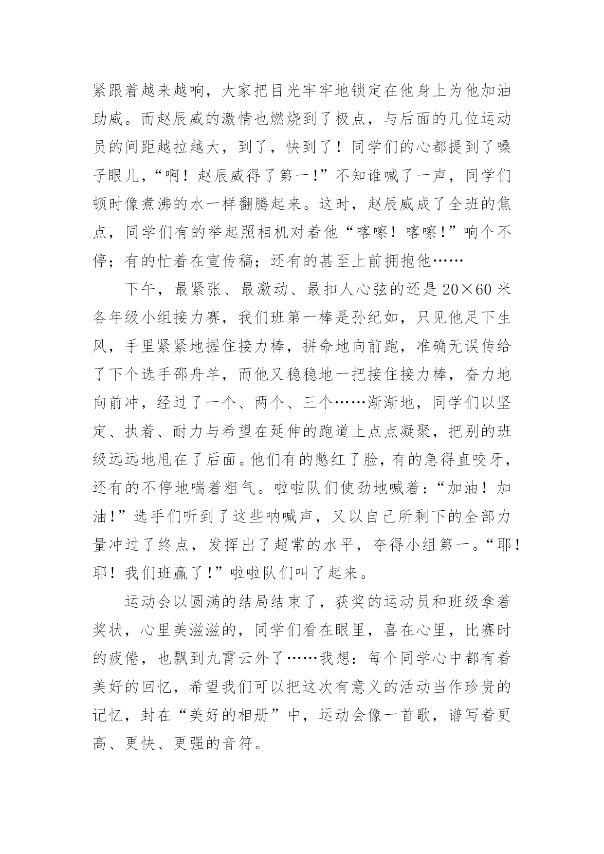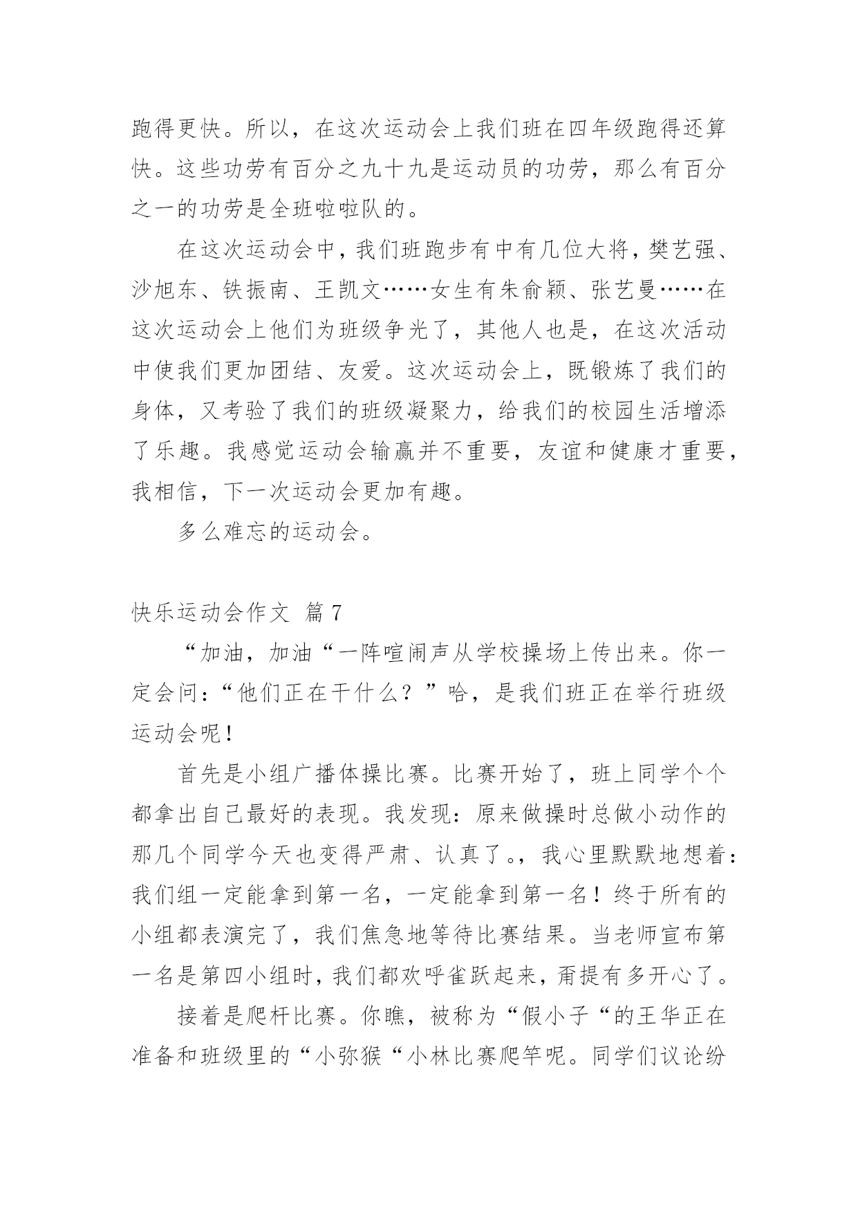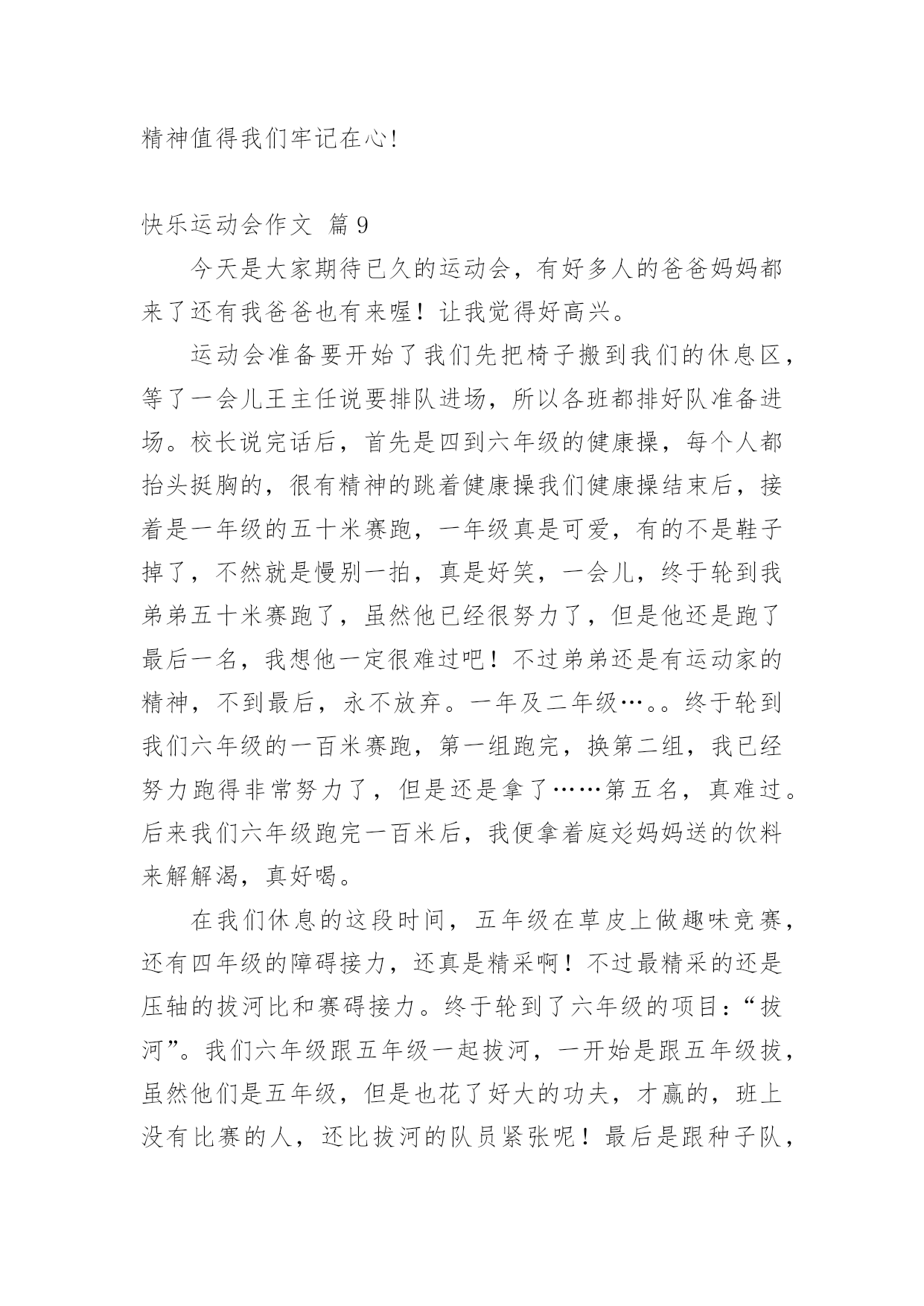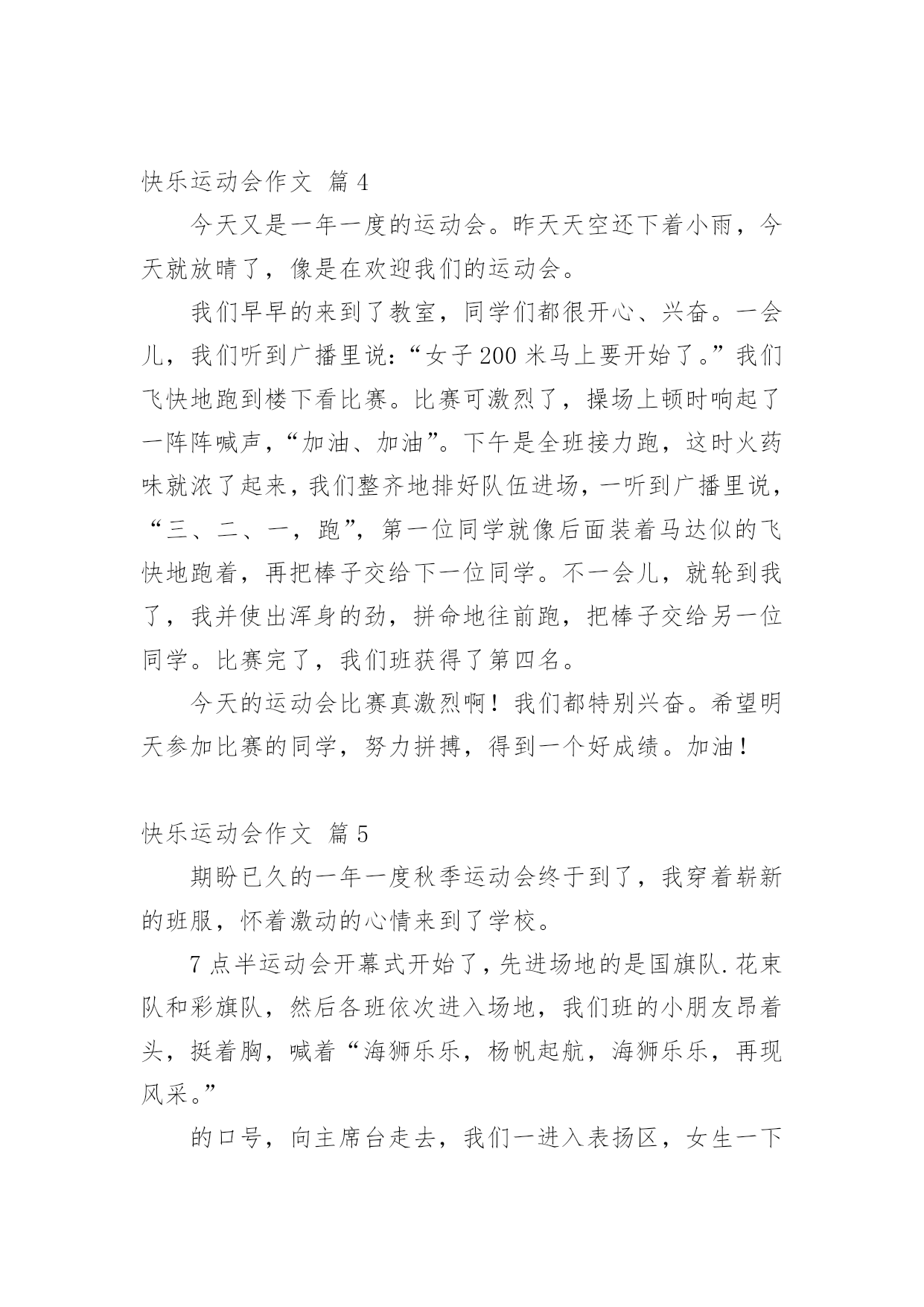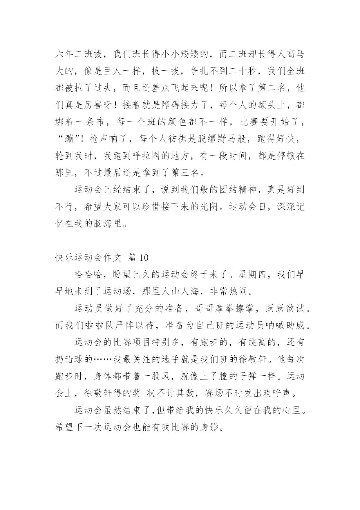 快乐运动会作文快乐运动会作文汇编10篇在日常学习、工作和生活中,大家都尝试过写作文吧,写作文是培养人们的观察力、联想力、想象力、思考力和记忆力的重要手段。那么问题来了,到底应如何写一篇优秀的作文呢?以下是小编为大家收集的快乐运动会作文10篇,希望能够帮助到大家。快乐运动会作文篇110月18日,第14届读者节活动又在美丽的白鹭洲公园举行。早上,我迷迷糊糊地张开沉睡的双眼,一想到今天早上8点半读者节活动就要开始了,我的心情马上激动起来。我跟妈妈匆匆赶到白鹭洲公园,舞台上已经响起了欢乐的歌声,许多演员已经开始表演了。我心想:“快来不及啦!快来不及啦!”我和妈妈冲到文明小博客签到处,急急忙忙地签了名。我和妮子都参加了由佳音英语训练中心组织的“趣味亲子运动会”。游戏马上要开始了,我和妮子被分到不同的队伍,我是红队,她是绿队的。运动会开始了。第一个环节是"两人三足接力"。组长用绳子把各位家长的一只脚和孩子的一只脚绑在一起,合二为一,形成三足,进行接力赛,我和妈妈奋力向目的地走去,先迈中间绑在一起的脚,再迈边上的脚,"一二,一二……"接下来是"亲子跳绳","吸管接力","英语单词反口令"和我最喜欢的"吹气球"。每组有40个气球,孩子吹,家长将气球绑在彩带上。大家围成一圈,我们孩子们使劲吹气球,家长们连忙绑到彩带上,时不时有孩子的叫喊声"谁帮忙绑下气球?"不到五分钟,40个气球都被绑在彩带上,我们把彩带拉开,就像一条火龙。“亲子运动会”就在这紧张又热烈的气氛中结束了,今天玩得真开心!快乐运动会作文篇24月5日,天气非常晴朗,我的心情也非常好,因为今天要召开一个盛大的运动会。今天,我早早来到校园,我看见同学们精神抖擞。二年级的运动会项目有:跳远、扔沙包、30米跑步和接力跑。其中最精彩的项目是接力跑。接力跑是五个班比赛,一个班二十名队员,男生十名,女生十名对着跑。我心想:我们班有黄义博、张思坤、李雅虎、郑好4个飞毛腿,一定能拿第一。比赛开始了。张思坤象离弦的弓箭第一个冲了出去,一棒、二棒……,我们班一路领先,同学们激动得跳起来,高兴地喊:加油,加油,冲到前面去!不幸的是有二位同学掉了棒,我们只得了最后一名。但是我们班还是得了团体总分年级第二名,运动会还是给我们留下了深刻的印象。快乐运动会作文篇3今天,春光明媚,万物复苏,彩旗招展的杭州市下城区体育场迎来了天长小学一年一度的田径运动会。在和煦阳光的照耀下,同学们怀着既紧张又兴奋的心情;穿着崭新的班服;排着整齐的队伍;迈着矫健的步伐;昂首挺胸地走进了会场。八点三十分运动会的开幕式准时开始,在庄严的国歌声中,五星红旗徐徐升起,全校师生肃立在大操场,向国旗行礼。接下来是全校广播操比赛,瞧!我们班的同学一个个站得像挺拔的.小树苗一样精神饱满,处处散发着青春的活力,神采飞扬,得到了校领导的一致好评。接着会场上,阳光灿烂,歌声嘹亮。校运动会各项目的比赛正在紧张而激烈地进行着。我们班第一个项目是男子组60米短跑预决赛,是由赵辰威和王逸凡参加的。再过三分钟,马上就要进行决赛了,跑道上一群生龙活虎的小运动员们,个个精神抖擞地在做准备动作。他们一会儿压压腿,弹跳几下;一会儿伸伸手,弯弯腰,雄赳赳、气昂昂的。裁判员举起信号枪高喊:“各就各位——预备——”,“呯!”一声枪响,只见小运动员们像离弦的箭一般飞出了起跑线,如同脱了缰的小马争先恐后地追逐着,向终点冲刺。啦啦队“加油!加油!”的呐喊声此起彼伏,一阵高过一阵。跑在最前面的是我们班的赵辰威同学,他是我们大家一致认可的“飞毛腿”,所以同学们都对他报以最大的希望。这时,只剩下最后10米了,随着看台上啦啦队员们手中的“鼓掌拍”一次比一次地高举,并使劲地挥舞着,呐喊声也紧跟着越来越响,大家把目光牢牢地锁定在他身上为他加油助威。而赵辰威的激情也燃烧到了极点,与后面的几位运动员的间距越拉越大,到了,快到了!同学们的心都提到了嗓子眼儿,“啊!赵辰威得了第一!”不知谁喊了一声,同学们顿时像煮沸的水一样翻腾起来。这时,赵辰威成了全班的焦点,同学们有的举起照相机对着他“喀嚓!喀嚓!”响个不停;有的忙着在宣传稿;还有的甚至上前拥抱他……下午,最紧张、最激动、最扣人心弦的还是20×60米各年级小组接力赛,我们班第一棒是孙纪如,只见他足下生风,手里紧紧地握住接力棒,拼命地向前跑,准确无误传给了下个选手邵舟羊,而他又稳稳地一把接住接力棒,奋力地向前冲,经过了一个、两个、三个……渐渐地,同学们以坚定、执着、耐力与希望在延伸的跑道上点点凝聚,把别的班级远远地甩在了后面。他们有的憋红了脸,有的急得直咬牙,还有的不停地喘着粗气。啦啦队们使劲地喊着:“加油!加油!”选手们听到了这些呐喊声,又以自己所剩下的全部力量冲过了终点,发挥出了超常的水平,夺得小组第一。“耶!耶!我们班赢了!”啦啦队们叫了起来。运动