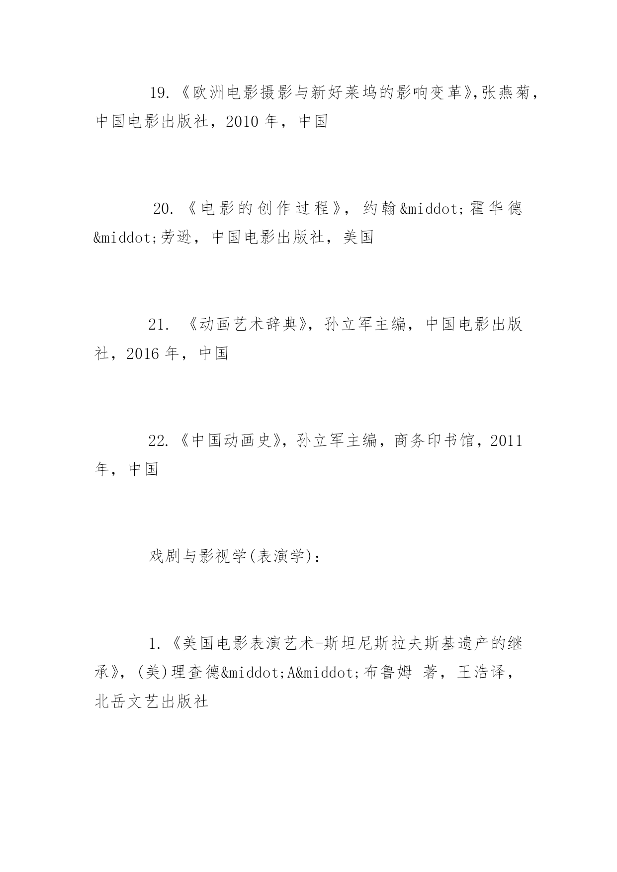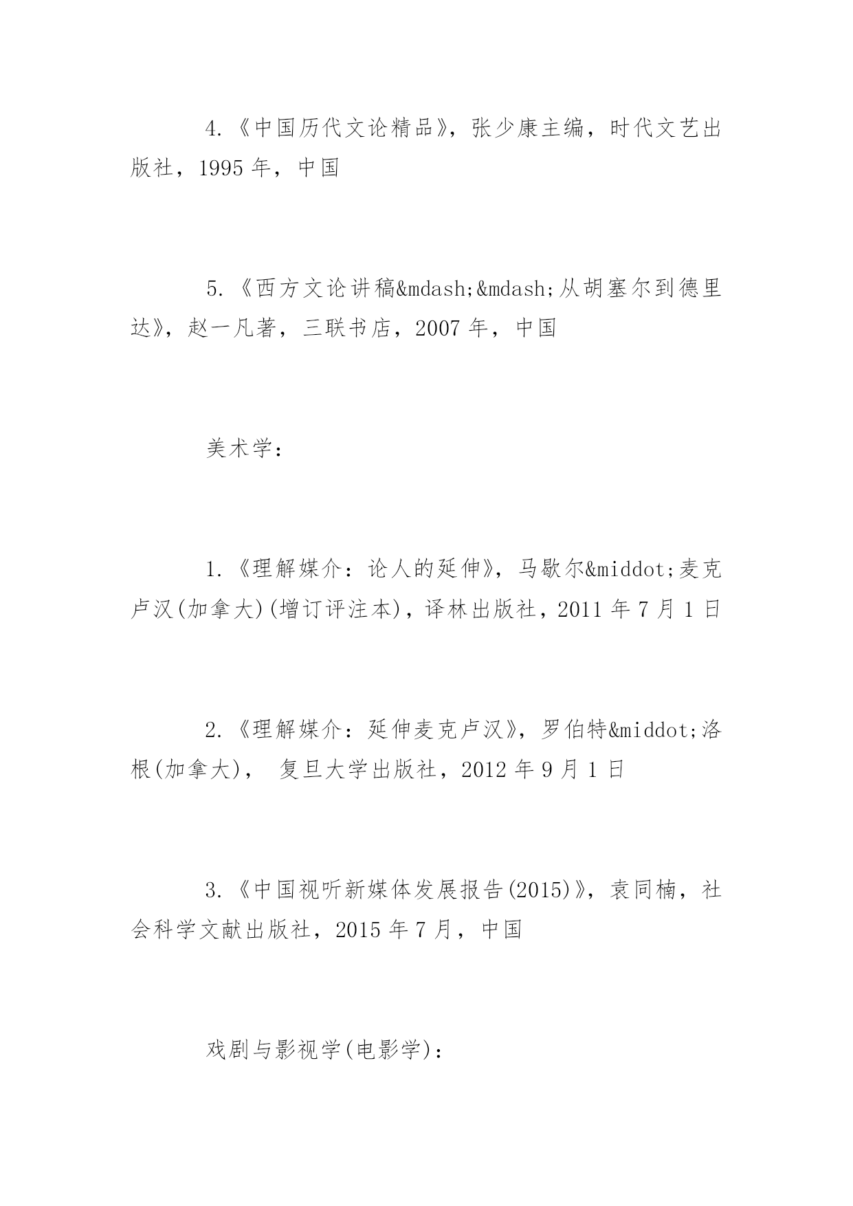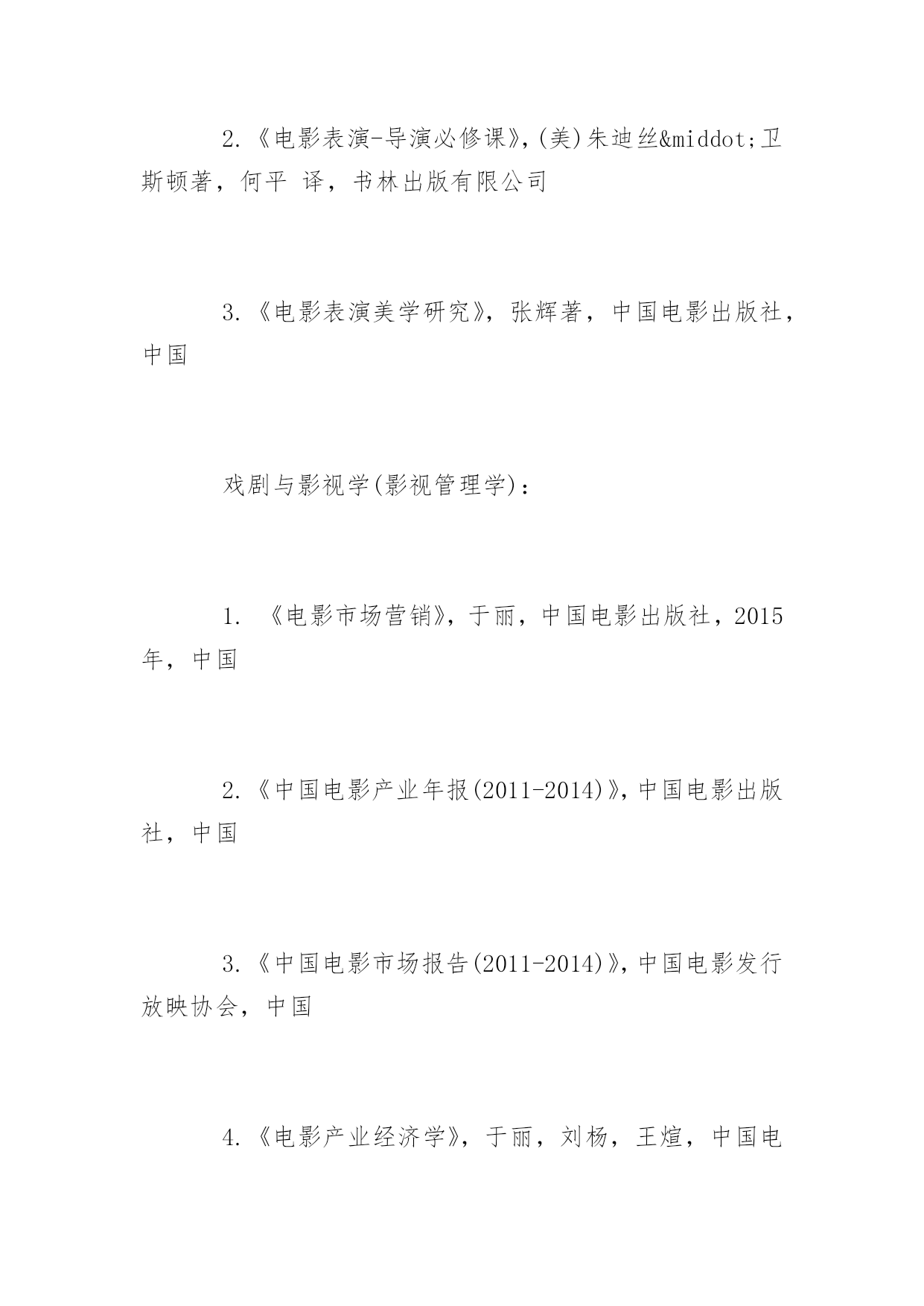 博士研究生入学考试书目2017年博士研究生入学考试推荐书目北京电影学院博士研究生考试需要什么书呢?下面yjbys小编为大家推荐如下:艺术学理论:1.《导演思维》,肯·丹西格,世界图书出版社,2014年,美国,2.《故事片电影摄影创作》穆德远,中国电影出版社,2010年,中国3.《中国电影理论文选》(上、下册),罗艺军主编,文化艺术出版社,1992年,中国4.《中国历代文论精品》,张少康主编,时代文艺出版社,1995年,中国5.《西方文论讲稿——从胡塞尔到德里达》,赵一凡著,三联书店,2007年,中国美术学:1.《理解媒介:论人的延伸》,马歇尔·麦克卢汉(加拿大)(增订评注本),译林出版社,2011年7月1日2.《理解媒介:延伸麦克卢汉》,罗伯特·洛根(加拿大),复旦大学出版社,2012年9月1日3.《中国视听新媒体发展报告(2015)》,袁同楠,社会科学文献出版社,2015年7月,中国戏剧与影视学(电影学):1.《认识电影》,路易斯·贾内梯,中国电影出版社,1997年,美国2.《电影剧本写作基础》,悉德·菲尔德,中国电影出版社,2002年,美国3.《荣誉》(修订版),苏牧,人民文学出版社,2006年,中国4.《电影的本性》,齐格弗里德·克拉考尔,2006年,德国5.《艺术创造与艺术教育》,布朗·科赞尼克,滕守尧主编,四川人民出版社,2005年,美国6.《百年中国电影理论文选》(上册、下册)丁亚平主编文化艺术出版社,2003年,中国7.《乡土中国》费孝通,三联书店,1948年,中国8.《江村经济》费孝通,商务印书馆,1985年,中国9.《中国电影发展史》,程季华,中国电影出版社,1963年,中国10.《世界电影史》,乔治·萨杜尔,中国电影出版社,1982年,?11.《电影是什么?》,巴赞,文化艺术出版社,2008年,法国12.《电影语言》,马赛尔·马尔丹,中国电影出版社,1980年,法国13.《20世纪中国电影理论文选》杨远婴,中国电影出版社,2003年版,中国14.《电影导演的艺术世界》,郑洞天,中国电影出版社,1993年版,中国15.《TheOxfordGuidetoFilmStudies》,JohnHill&PamelaChurchGibson,OxfordUniversityPress,1998,英国16.《CinemaStudiesTheKeyConcepts》,SusanHayward,Routledge,2000,美国17.《CulturalTheoryTheKeyConcepts》,AndrewEdgar&PeterSedgwick,Routledge,1999,美国18.《电影摄影师应用手册》,张会军,中国电影出版社,2015年,中国19.《欧洲电影摄影与新好莱坞的影响变革》,张燕菊,中国电影出版社,2010年,中国20.《电影的创作过程》,约翰·霍华德·劳逊,中国电影出版社,美国21.《动画艺术辞典》,孙立军主编,中国电影出版社,2016年,中国22.《中国动画史》,孙立军主编,商务印书馆,2011年,中国戏剧与影视学(表演学):1.《美国电影表演艺术-斯坦尼斯拉夫斯基遗产的继承》,(美)理查德·A·布鲁姆著,王浩译,北岳文艺出版社2.《电影表演-导演必修课》,(美)朱迪丝·卫斯顿著,何平译,书林出版有限公司3.《电影表演美学研究》,张辉著,中国电影出版社,中国戏剧与影视学(影视管理学):1.《电影市场营销》,于丽,中国电影出版社,2015年,中国2.《中国电影产业年报(2011-2014)》,中国电影出版社,中国3.《中国电影市场报告(2011-2014)》,中国电影发行放映协会,中国4.《电影产业经济学》,于丽,刘杨,王煊,中国电影出版,2011年,中国5.《媒介的政府规制》,吴曼芳,中国电影出版社,2008年,中国6.《媒介产业组织学》,吴曼芳,刘灏,中国电影出版社,2010年,中国7.《中国电影产业发展报道(2012-2013)》,侯光明,吴曼芳,中国电影出版社,中国8.《电影市场营销学》,俞剑红,翁炀,中国电影出版社,2008年,中国9.《中国电影企业运营模式研究》,俞剑红,中国电影出版社,2009年,中国10.《电影商业(第三版)》,俞剑红、李苒,中国电影出版社,2011年,中国